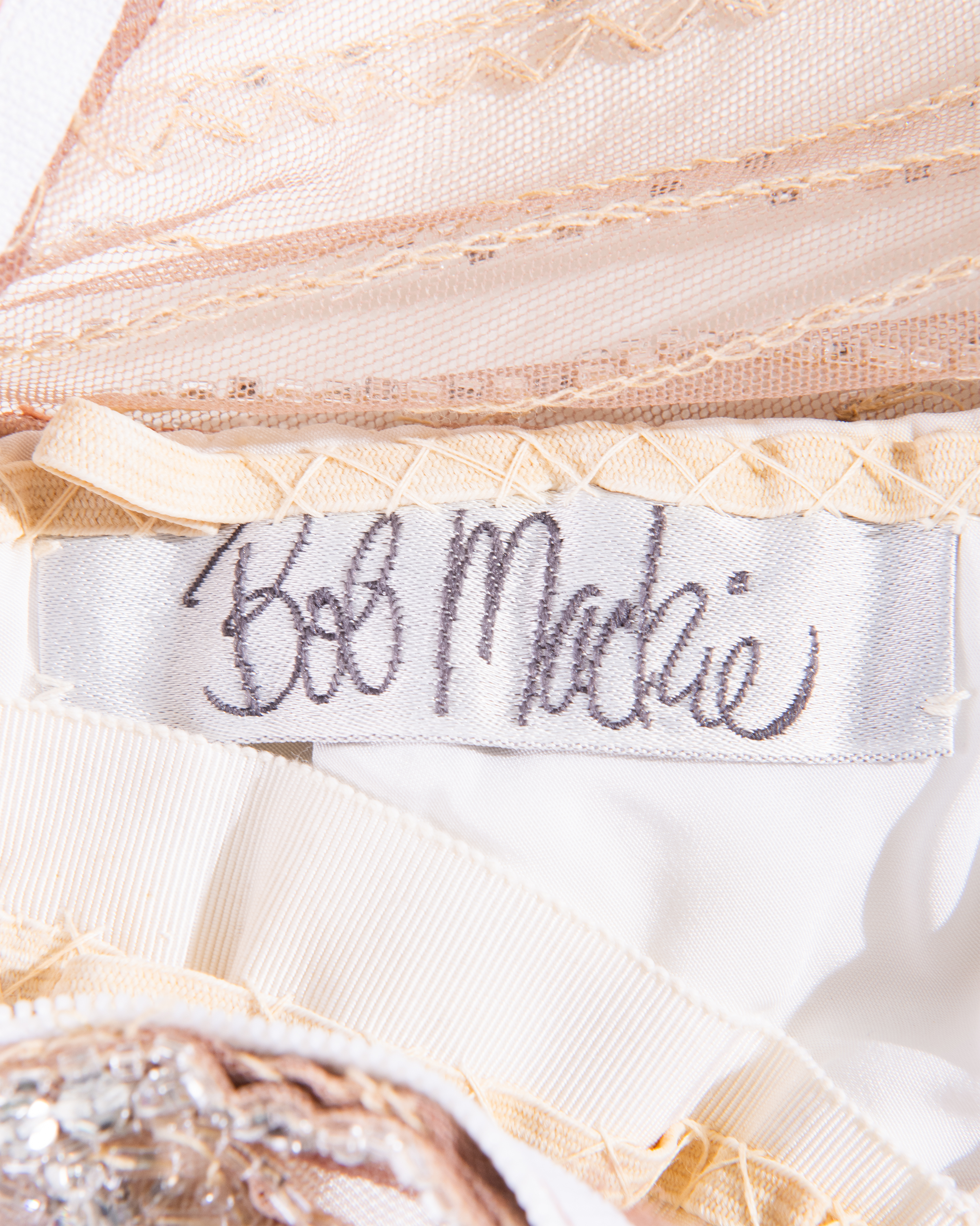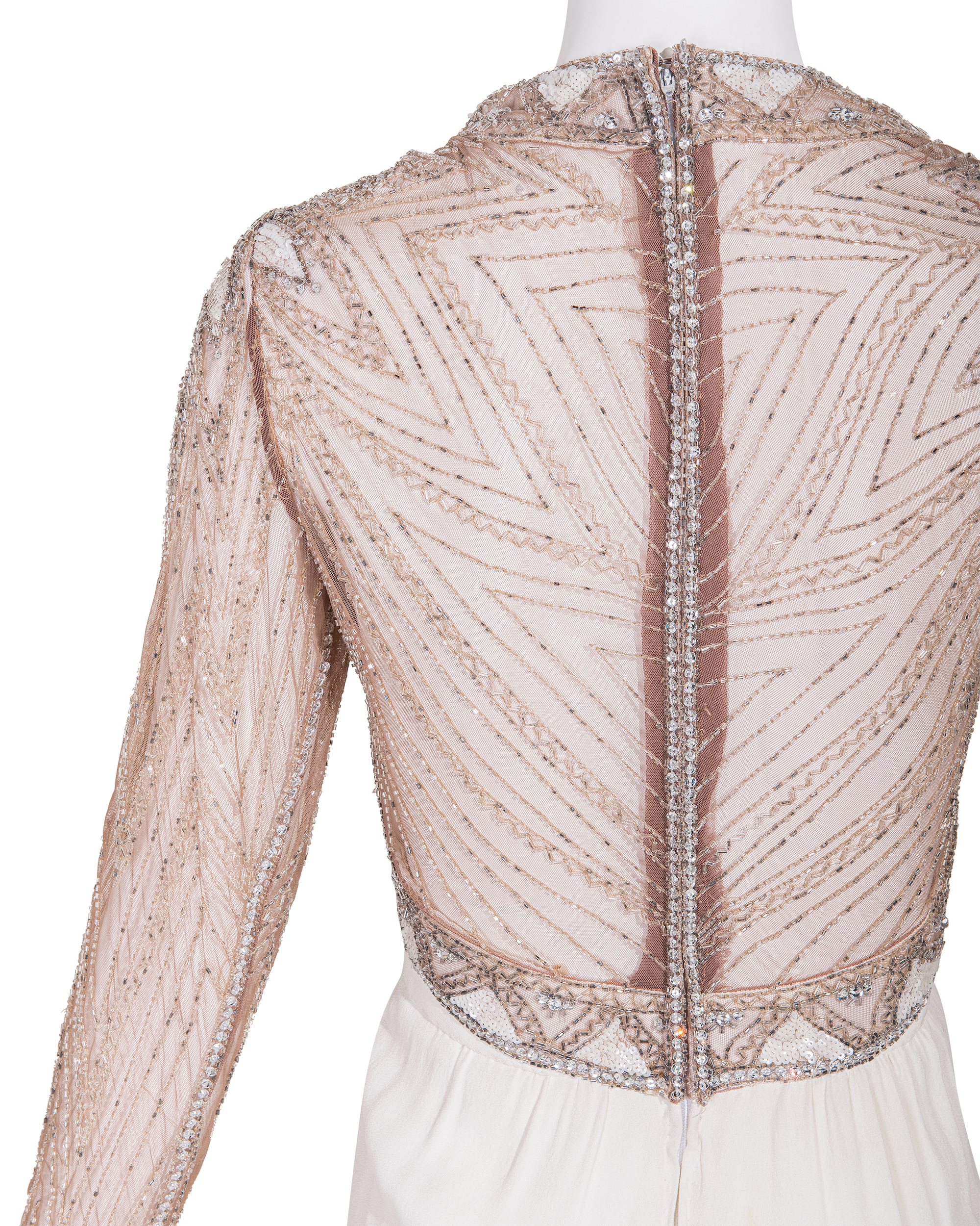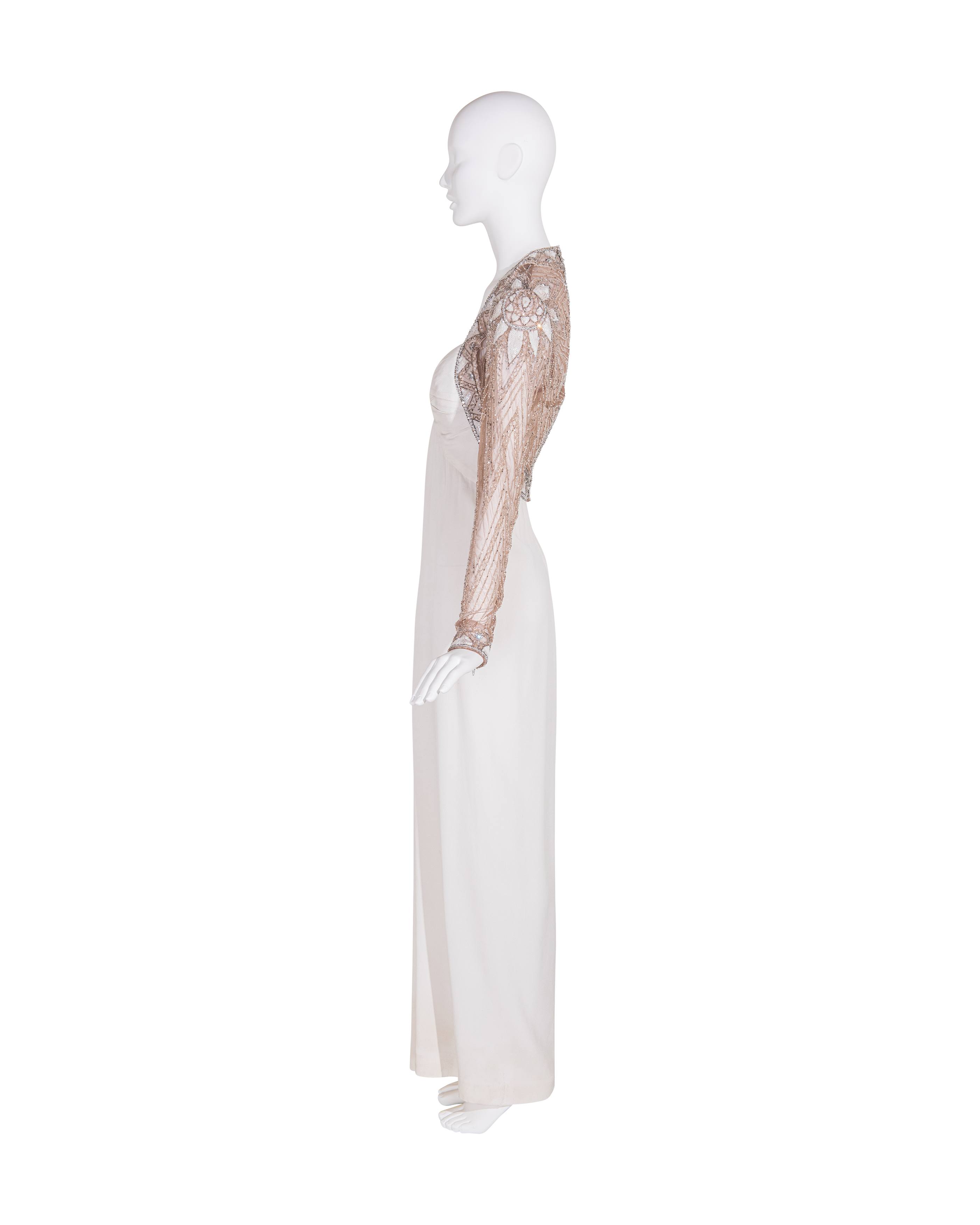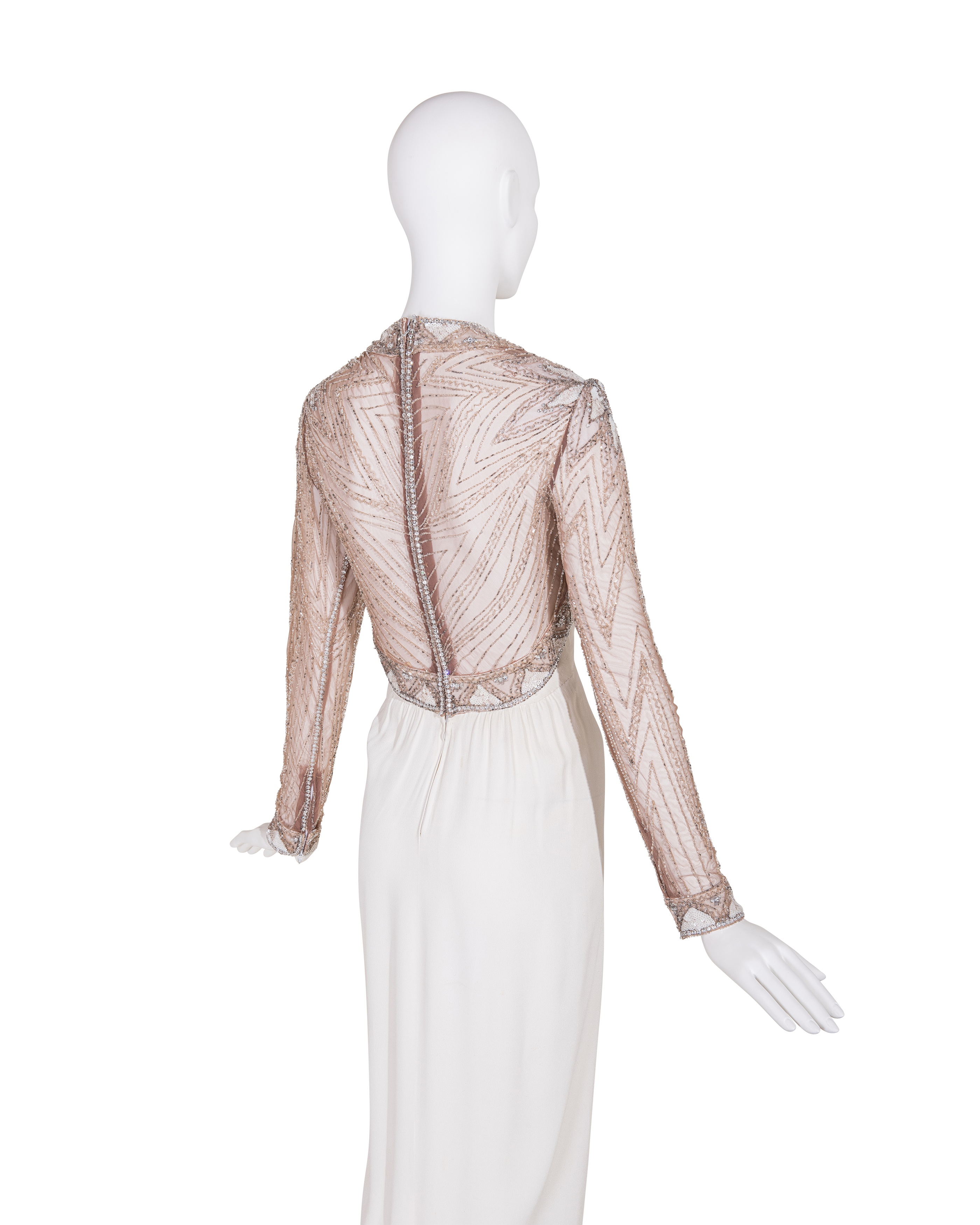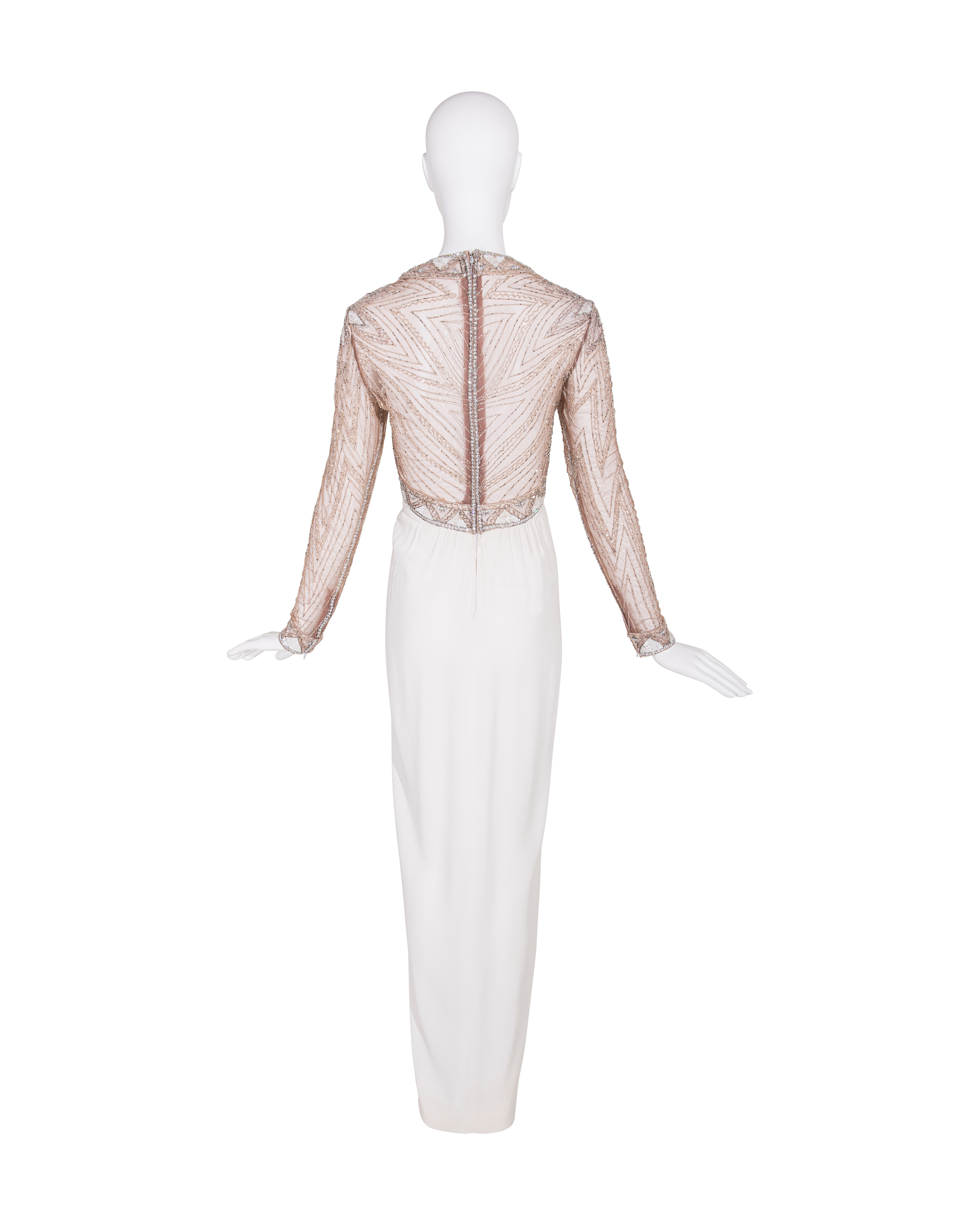 1980's Bob Mackie semi-sheer white embellished long sleeve gown. Upper features heavily embellished tan mesh, while lower is white silk skirt with slight drape throughout. Semi-sheer mesh creates appearance of open back. Concealed center back zip closure with rhinestone details surrounding zip. This piece has been taken to professional couture cleaner and arrives in very good vintage condition, with minor spots and wear throughout, including textured runs at lower right side.