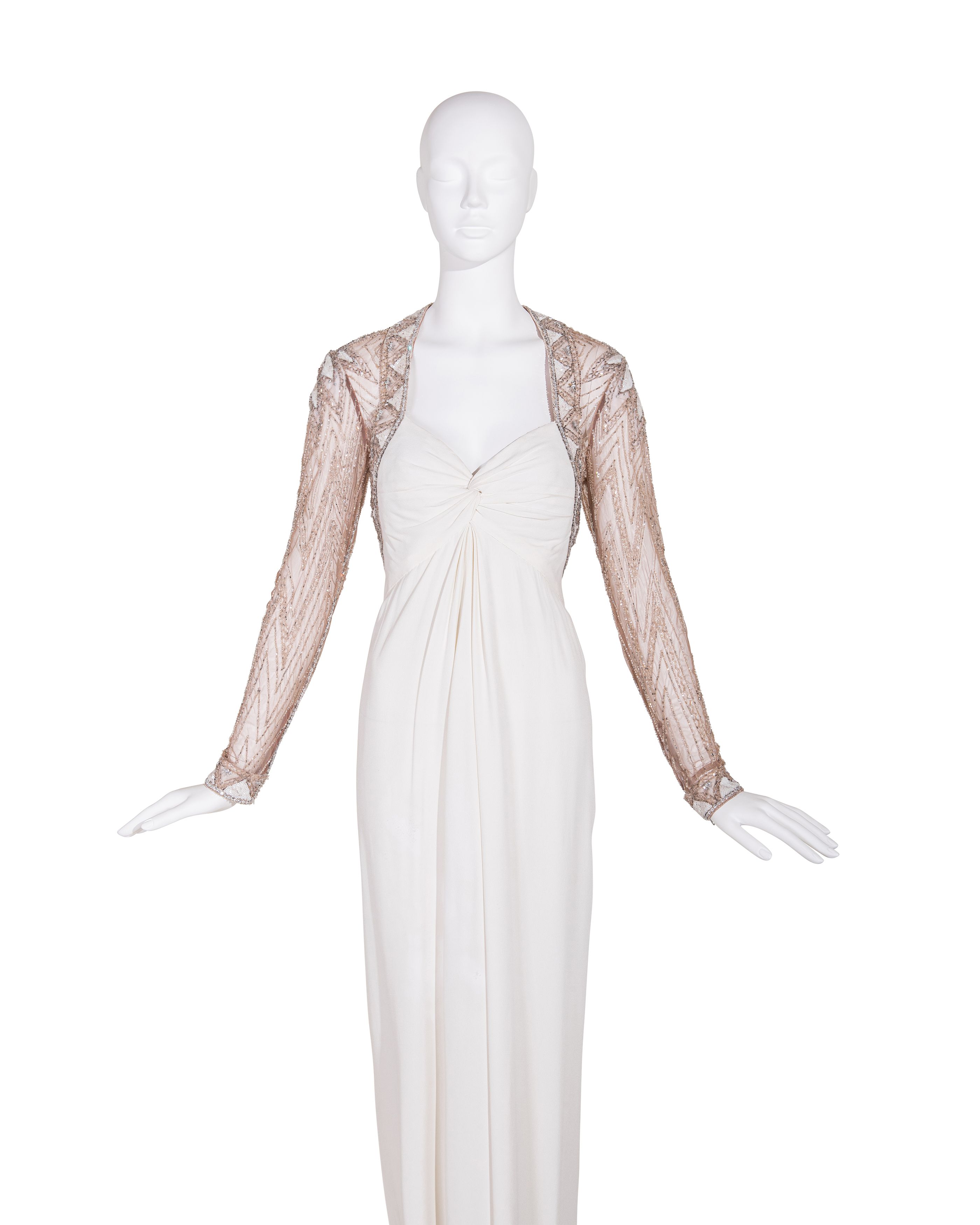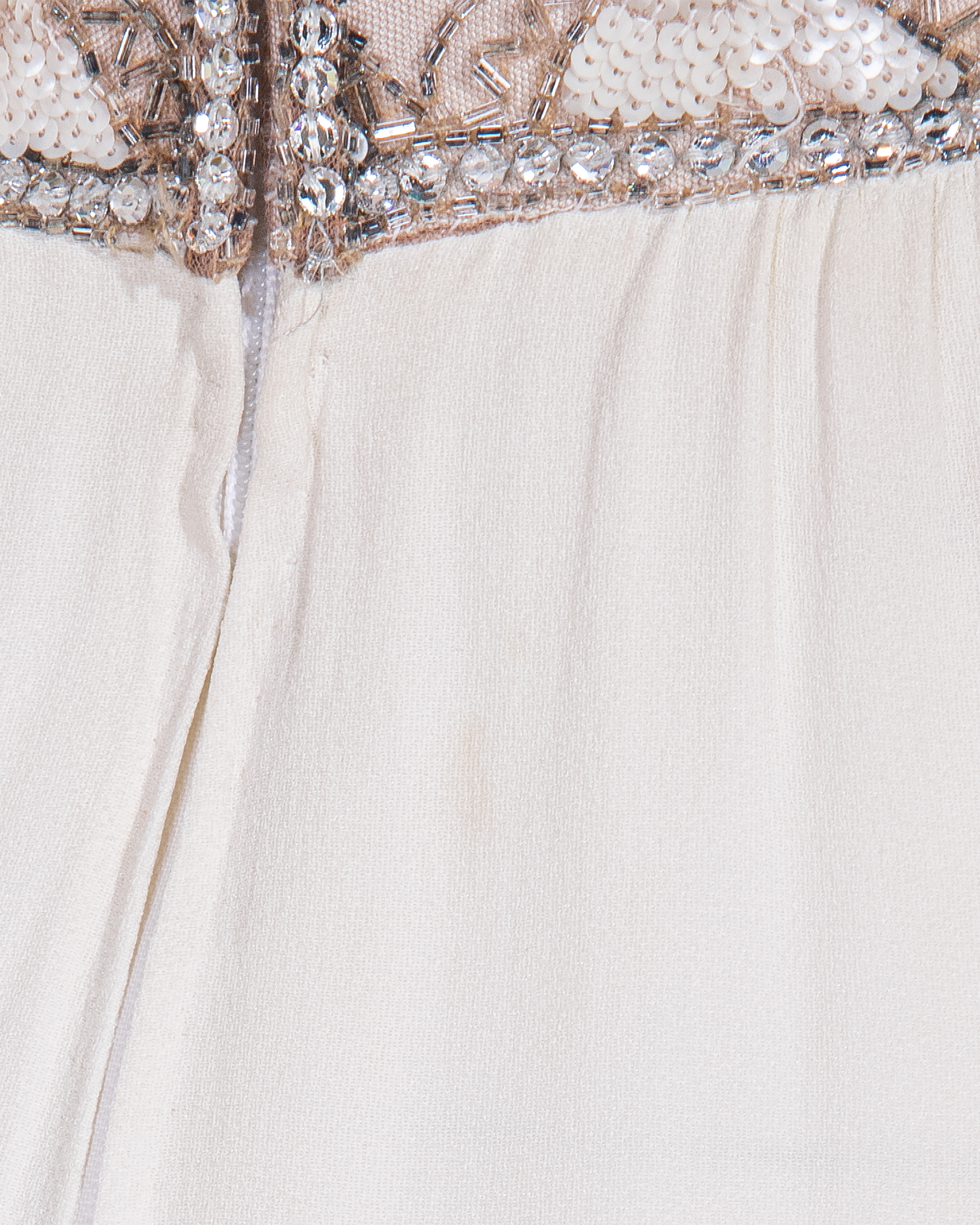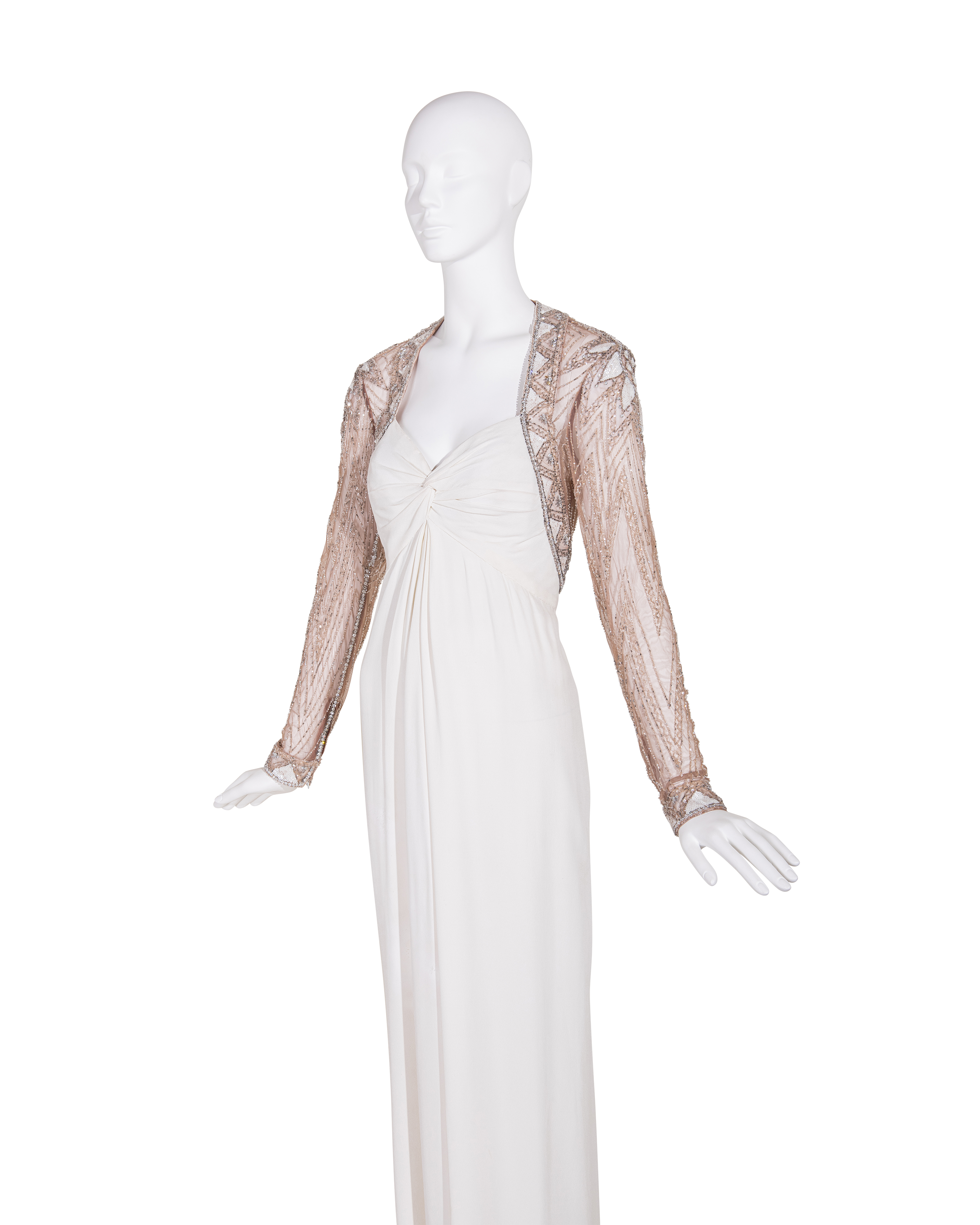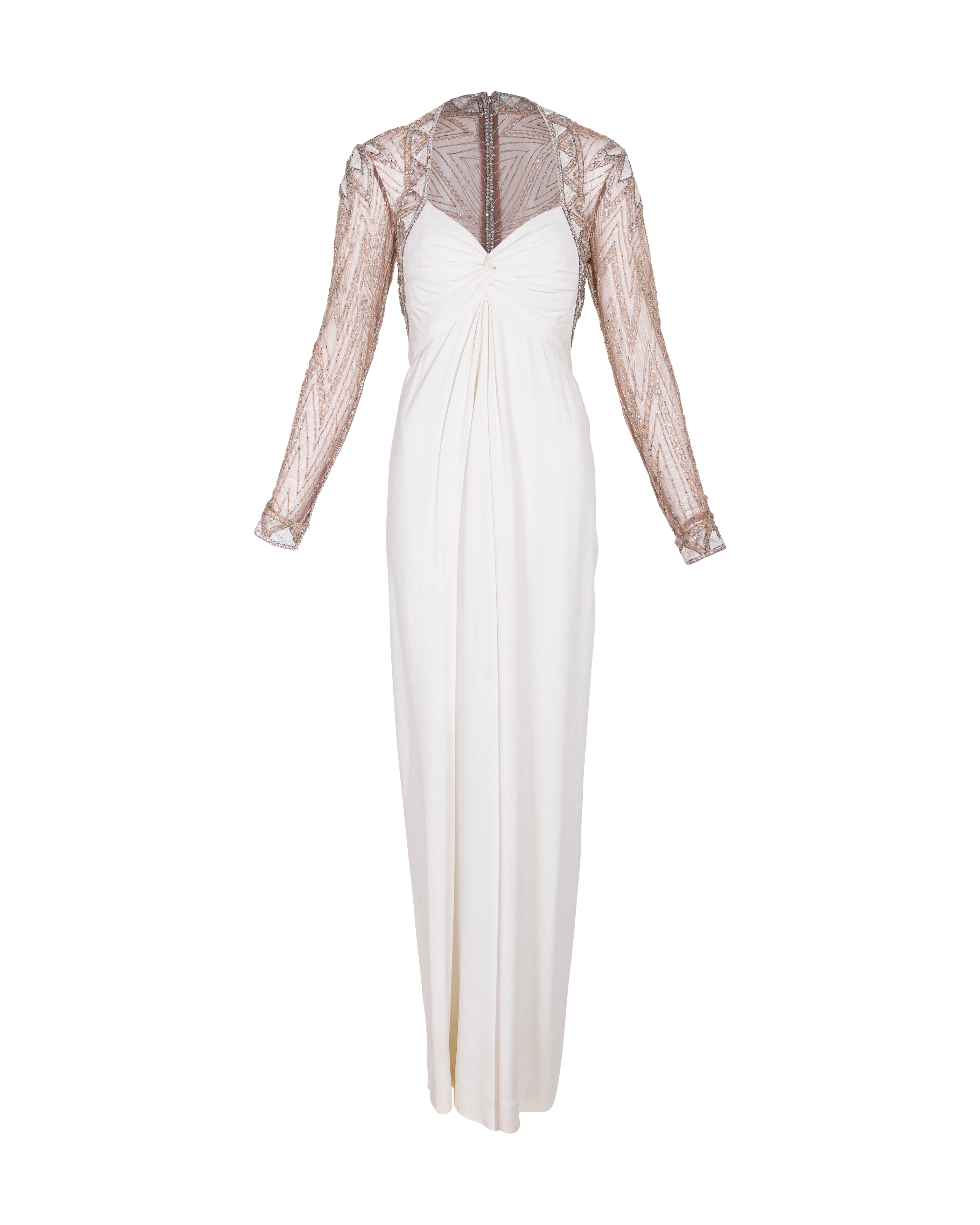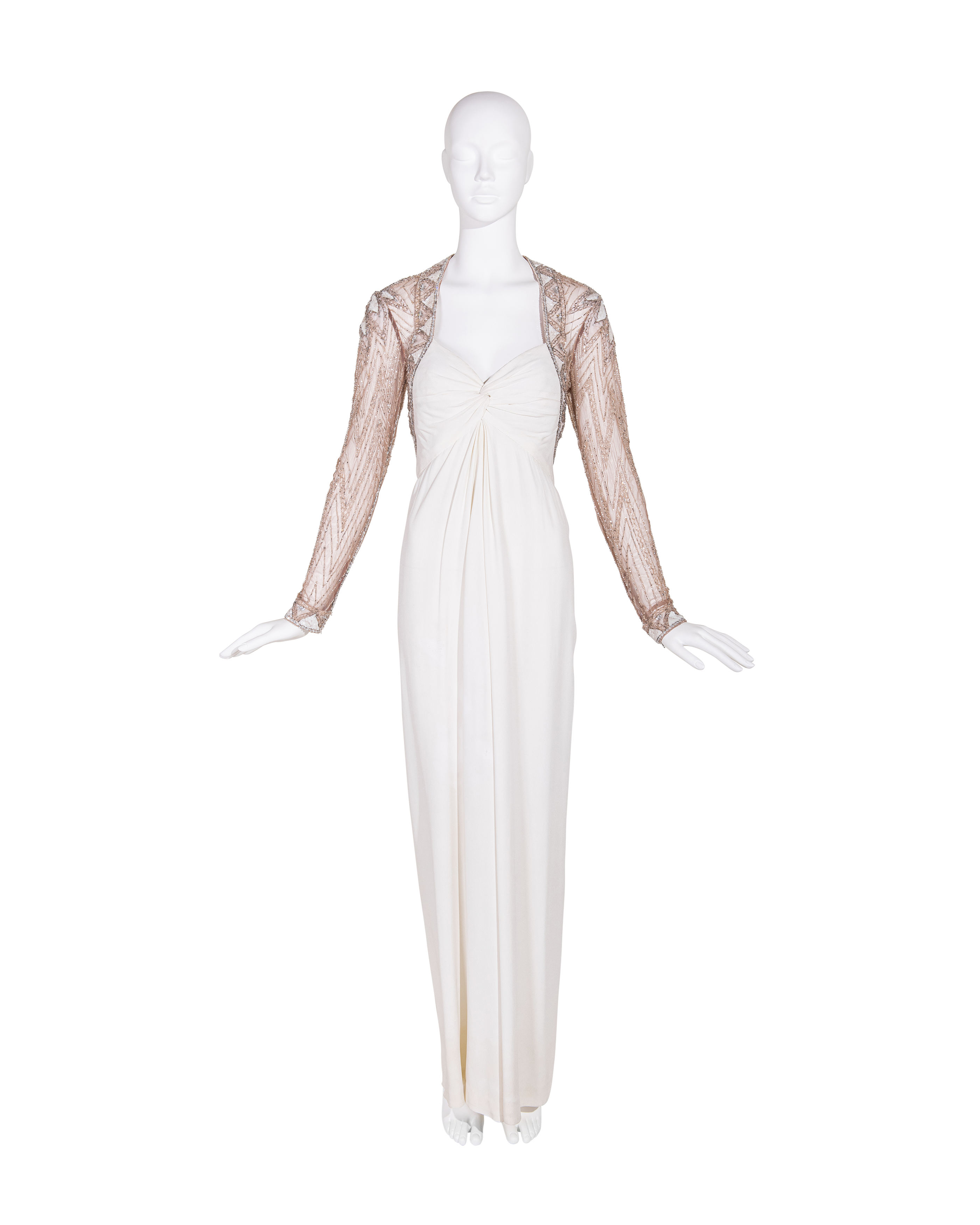 1980's Bob Mackie semi-sheer white embellished long sleeve gown. Upper features heavily embellished tan mesh, while lower is white silk skirt with slight drape throughout. Semi-sheer mesh creates appearance of open back. Concealed center back zip closure with rhinestone details surrounding zip. This piece has been taken to professional couture cleaner and arrives in very good vintage condition, with minor spots and wear throughout, including textured runs at lower right side.