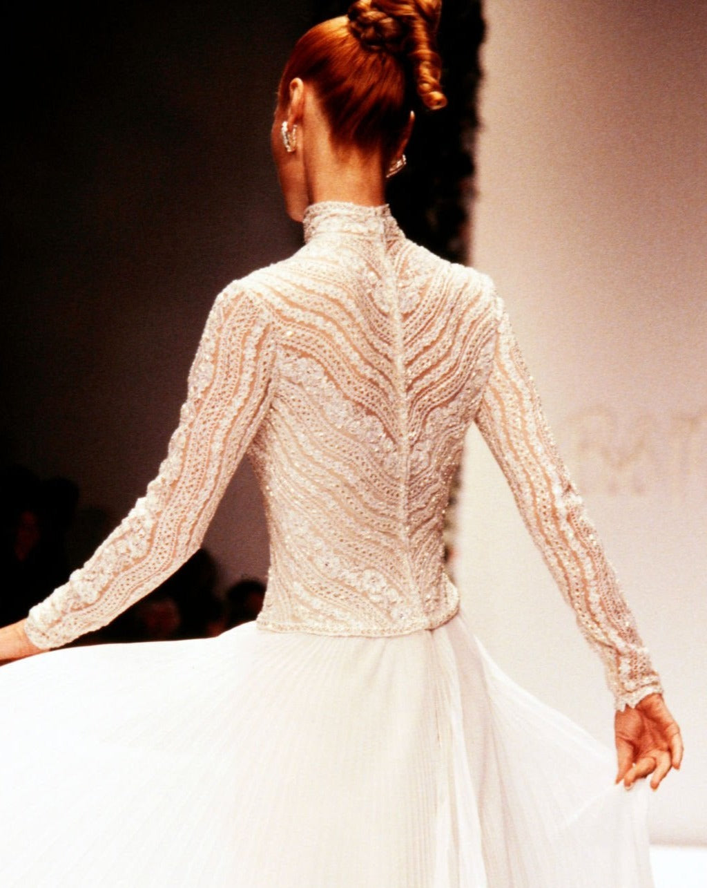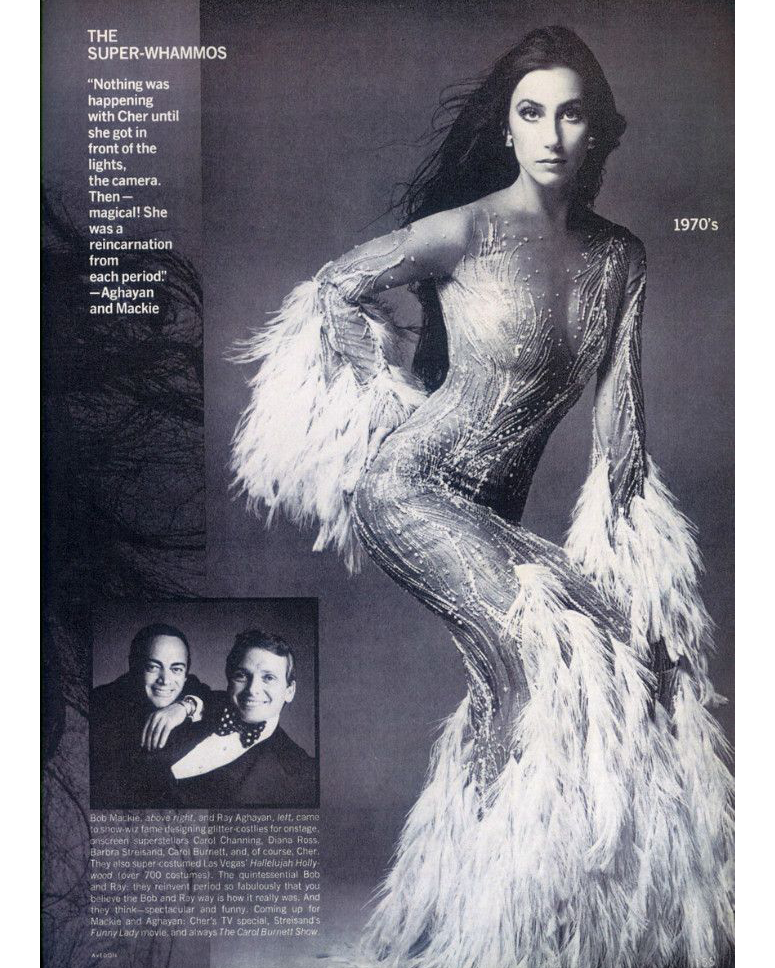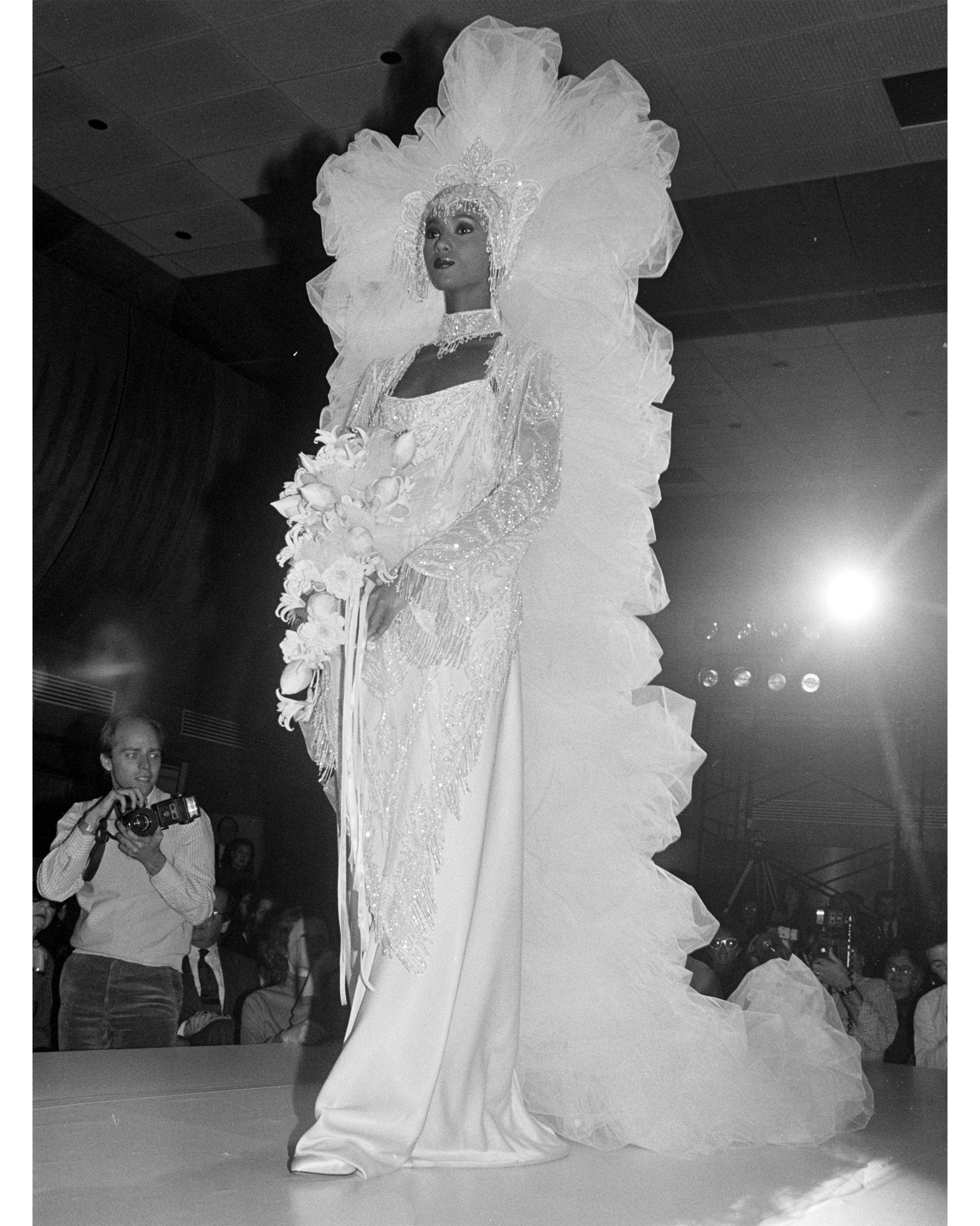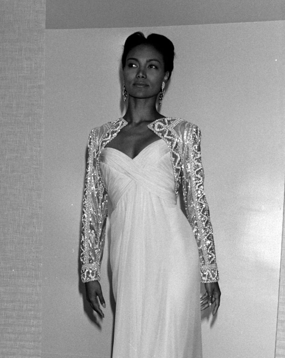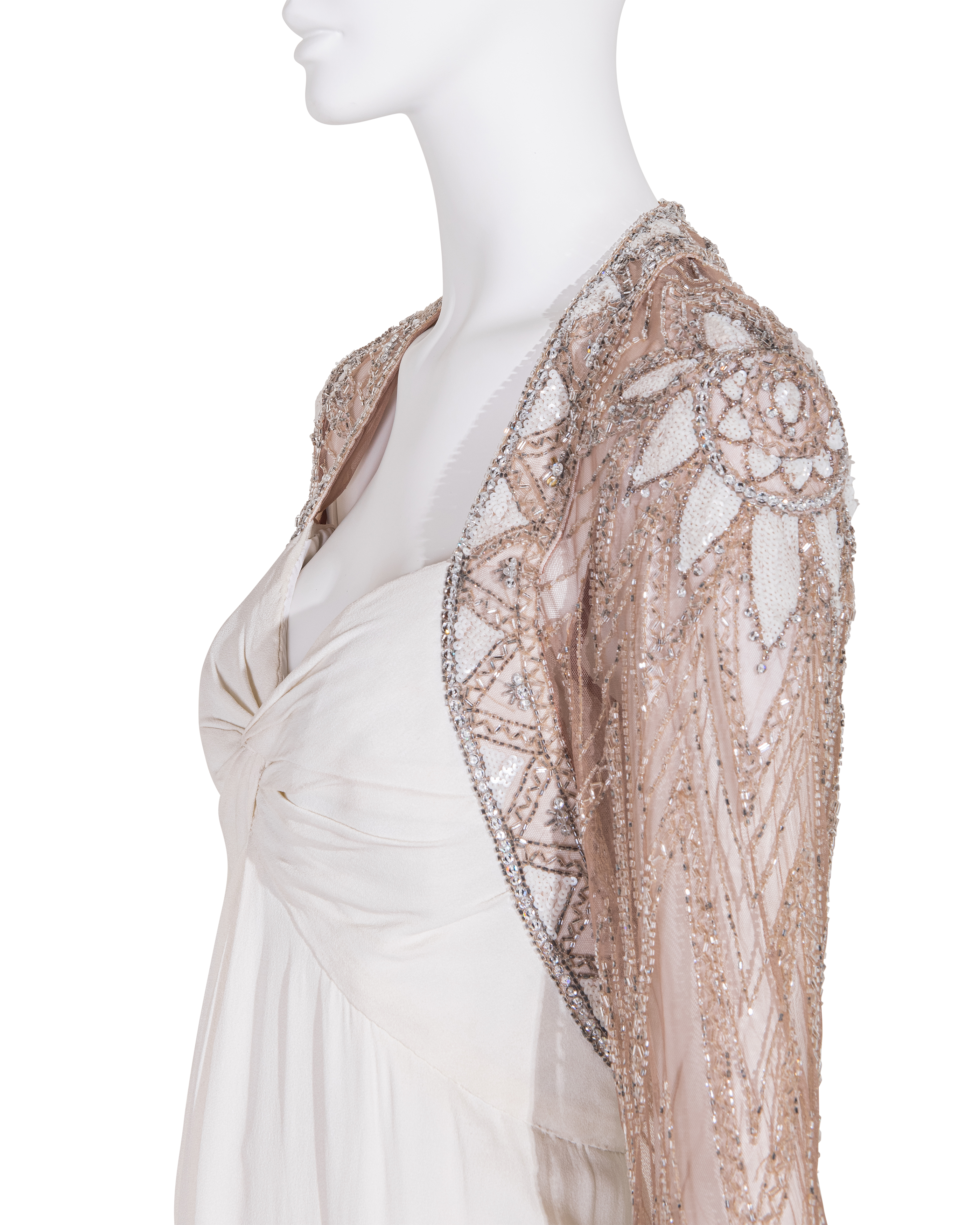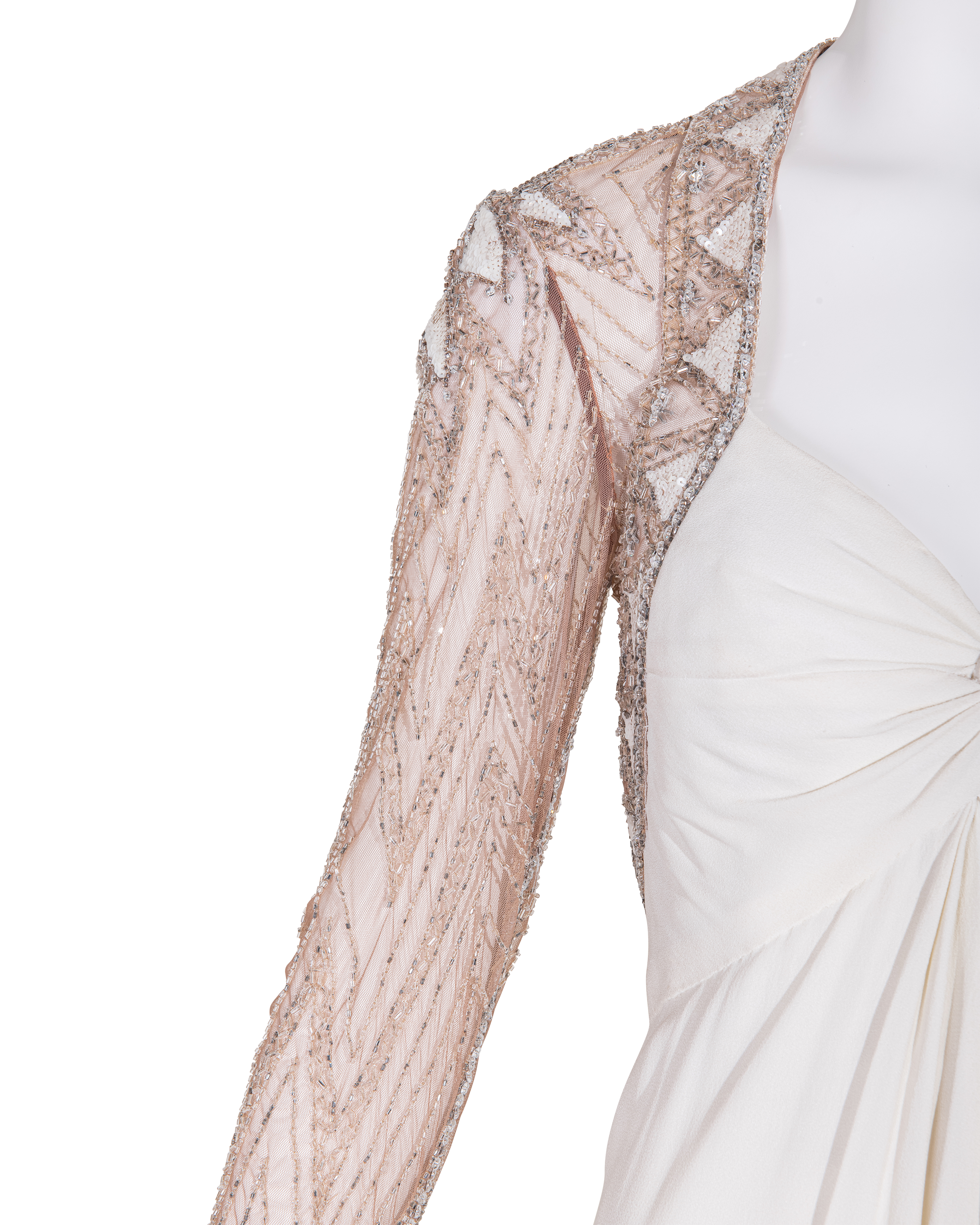 1980's Bob Mackie semi-sheer white embellished long sleeve gown. Upper features heavily embellished tan mesh, while lower is white silk skirt with slight drape throughout. Semi-sheer mesh creates appearance of open back. Concealed center back zip closure with rhinestone details surrounding zip. This piece has been taken to professional couture cleaner and arrives in very good vintage condition, with minor spots and wear throughout, including textured runs at lower right side.