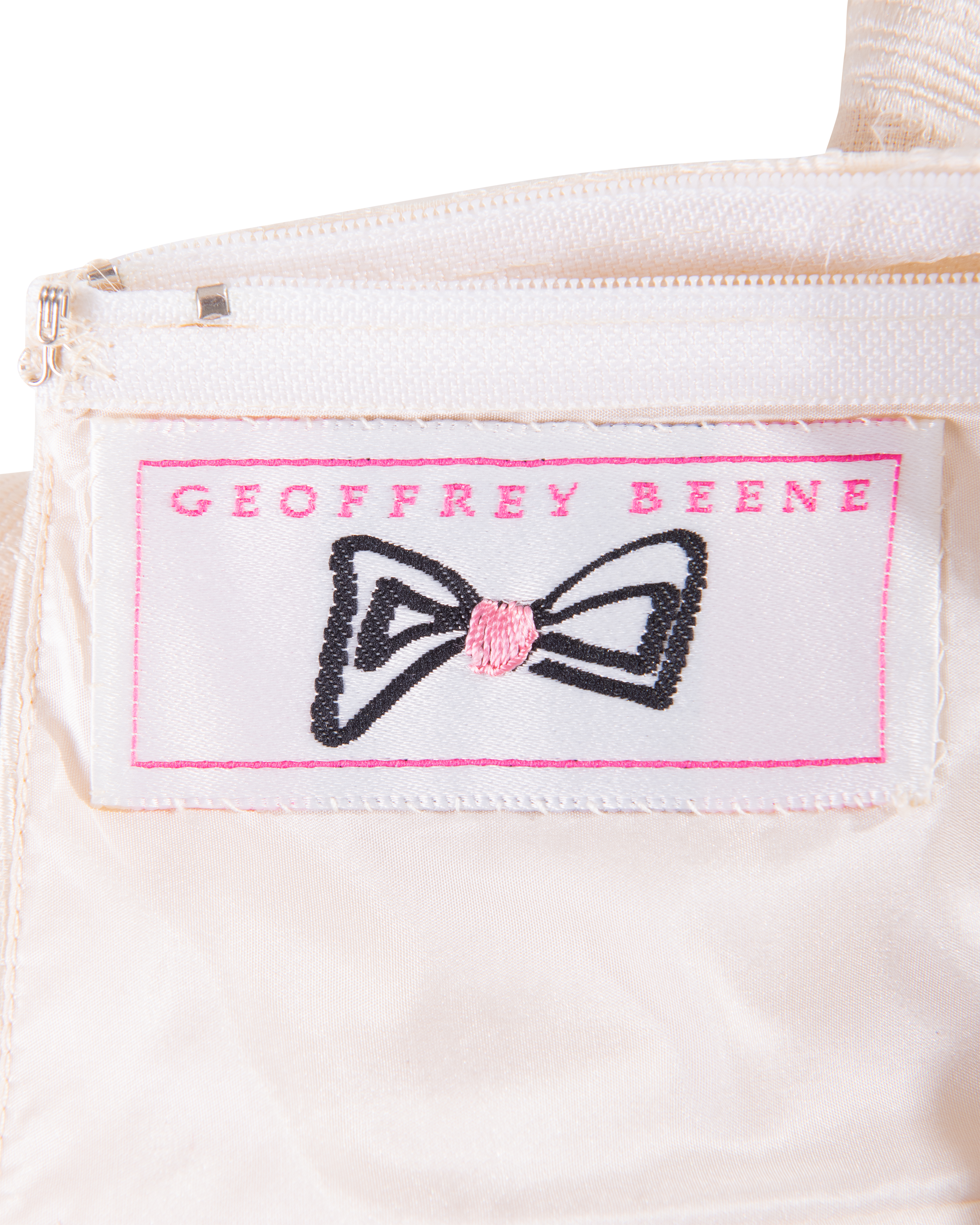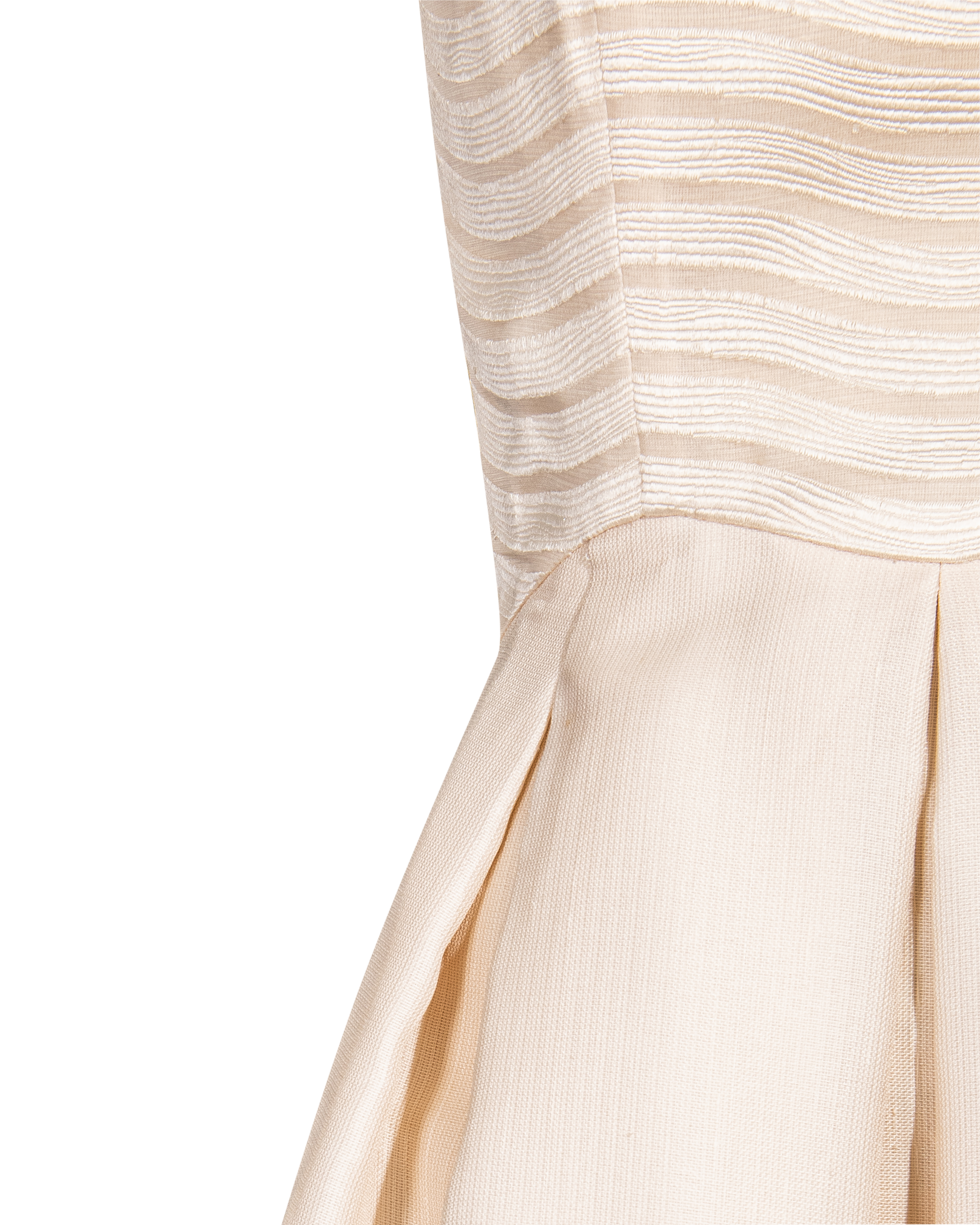 1990's Geoffrey Beene ecru striped corset strapless cocktail dress. Cream dress with full skirt, featuring large pleats. Can be styled with or without spaghetti straps depending on desired styling. Concealed back zip closure, and built-in corset with boning. Upper is lined with nude lining. This piece has been taken to professional couture cleaner and arrives ready-to-wear, in excellent vintage condition.