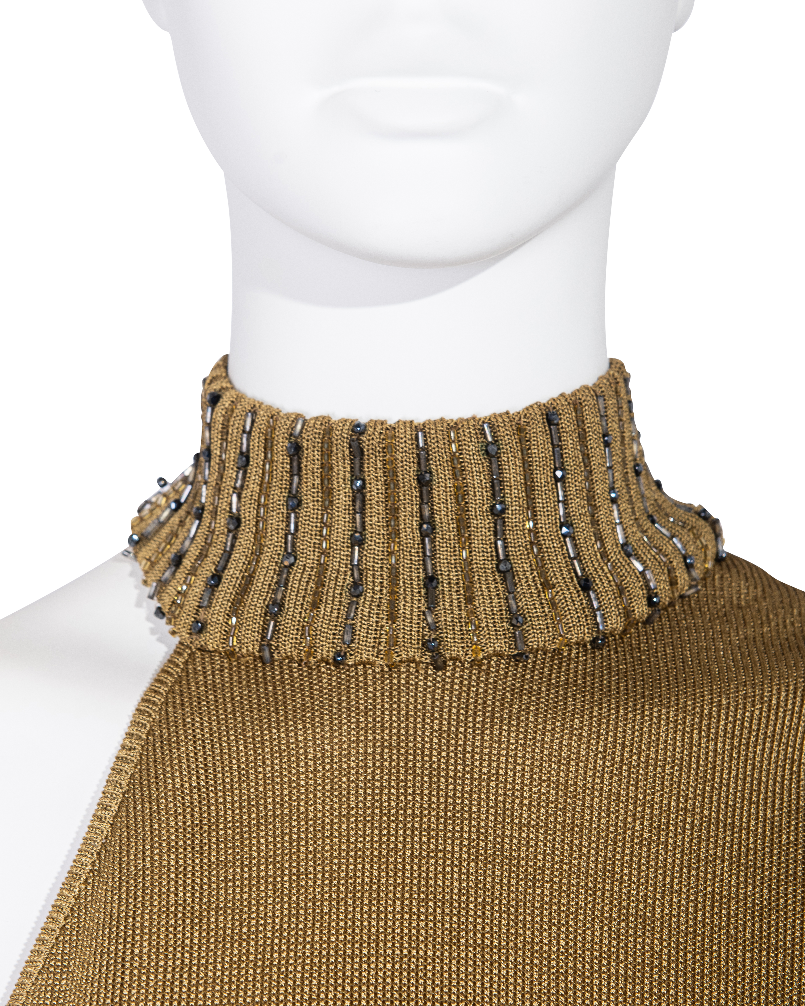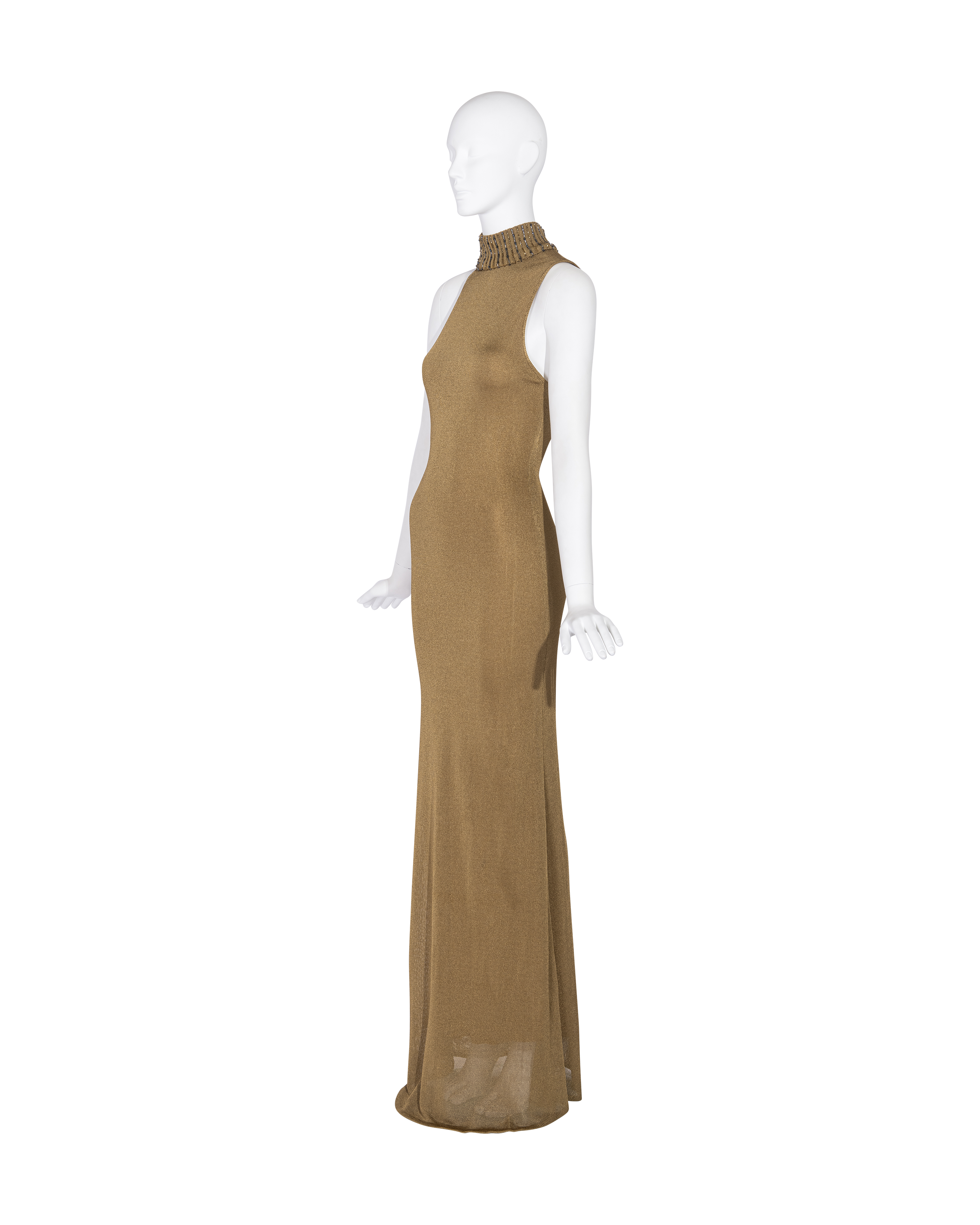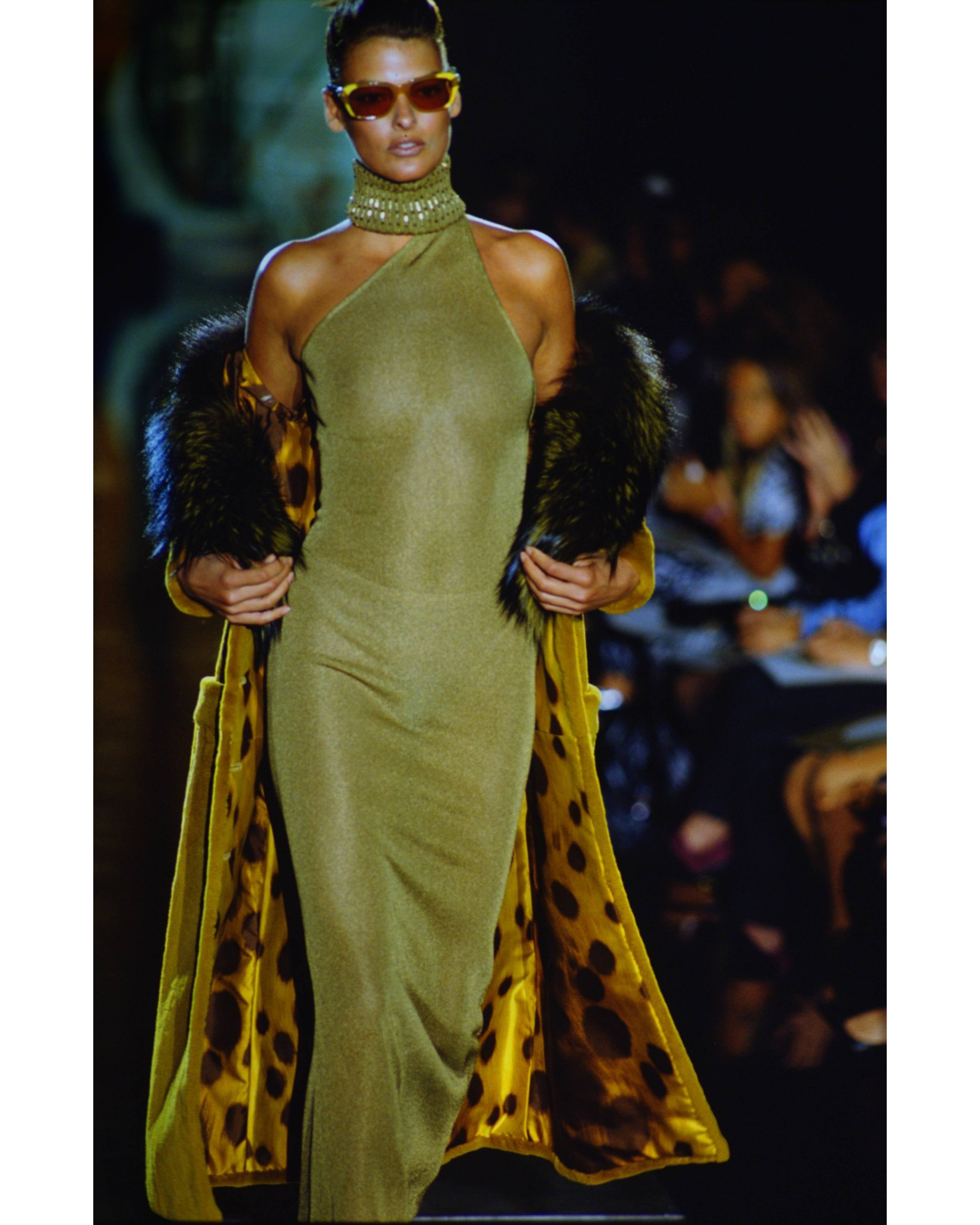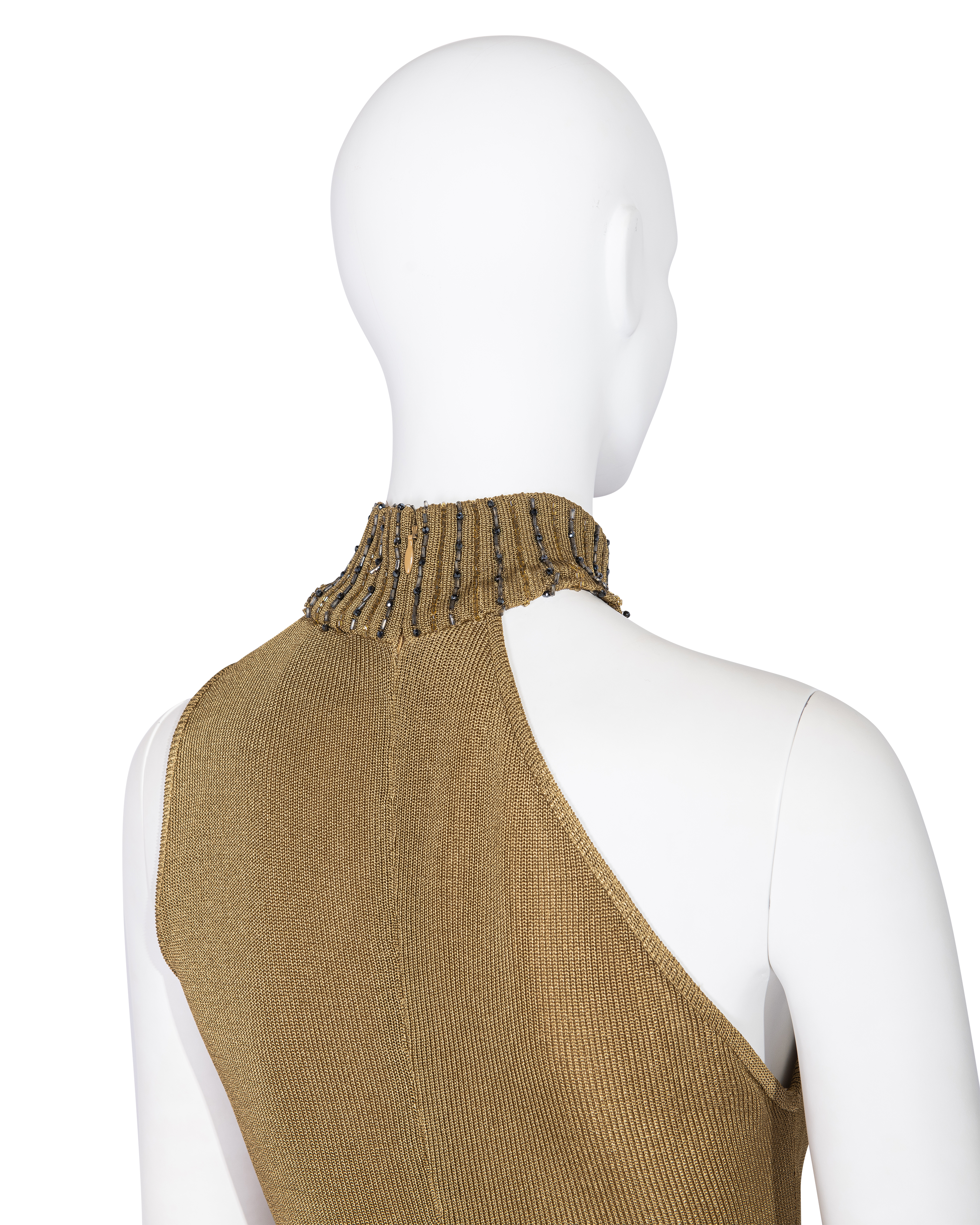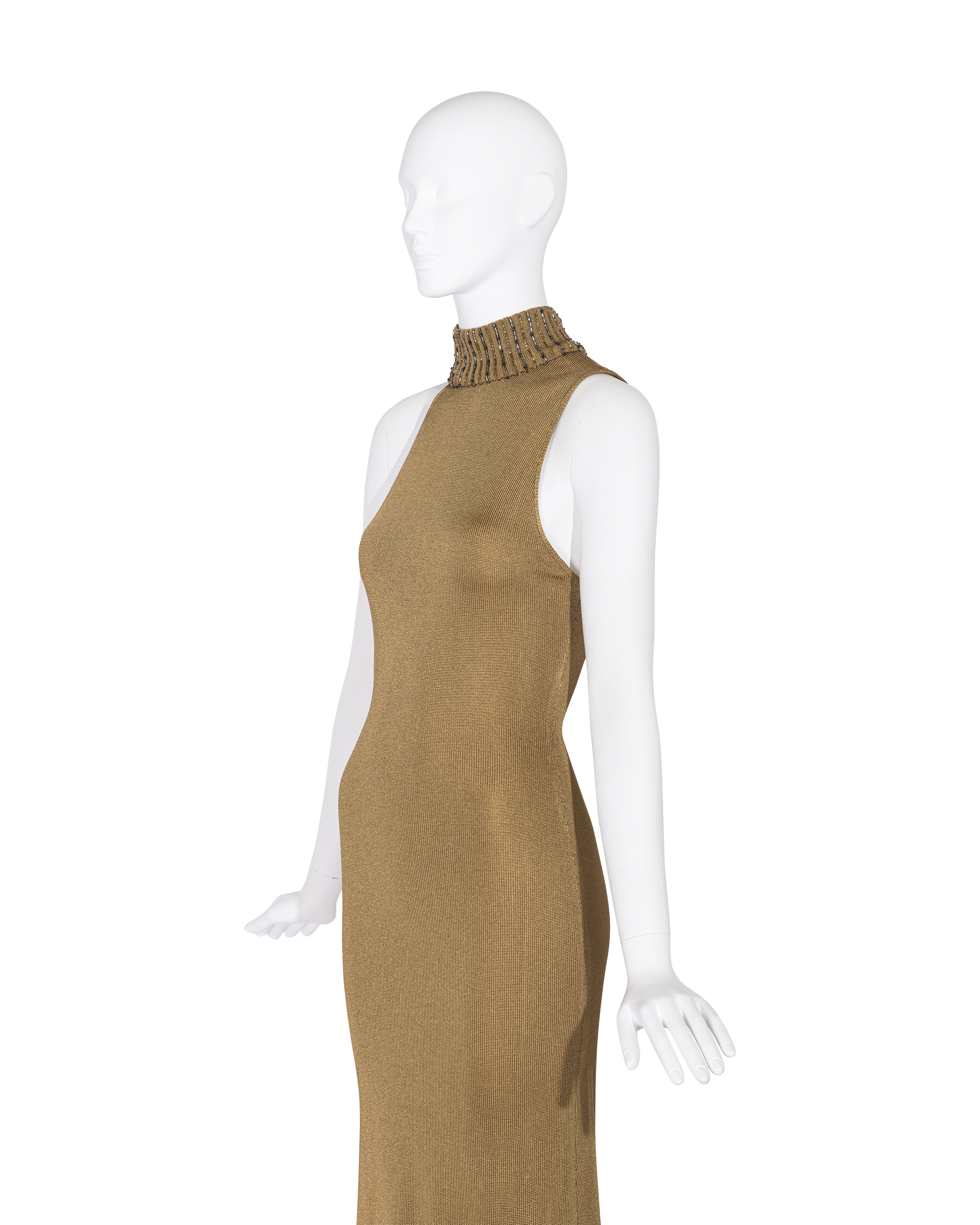 A/W 1996 Gianni Versace Couture olive knit mock neck gown. Sleeveless mock neck fitted gown with embellishments at turtleneck that create trompe l'oeil ribbed knit texture. Asymmetrical coverage at bust and semi-sheer mesh extending past interior slip create unique detailing. Concealed back zip closure. Fabric Contents: 71% Rayon, 15% Acetate and 14% Nylon blend. Rare dress as seen on the runway on supermodel Linda Evangelista, photographed on Lisa Marie Presley by Mario Testino, and seen on Celine Dion for the 7th Annual Billboard Music Awards. In very good vintage condition with minor runs / snags in fabric near hemline (unnoticeable when worn).