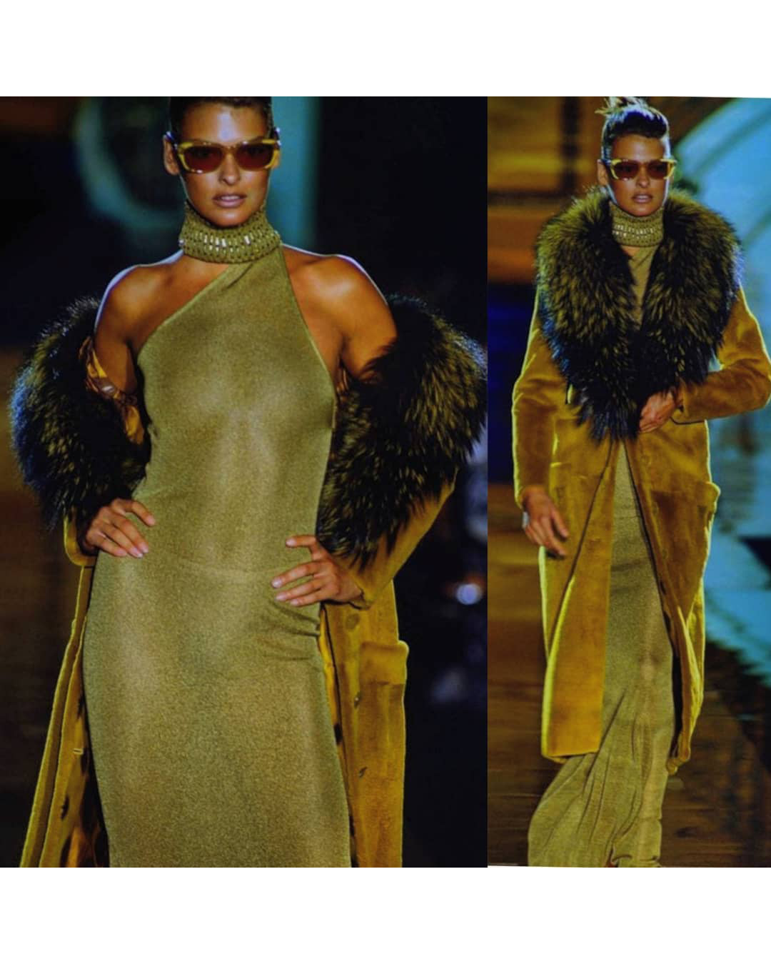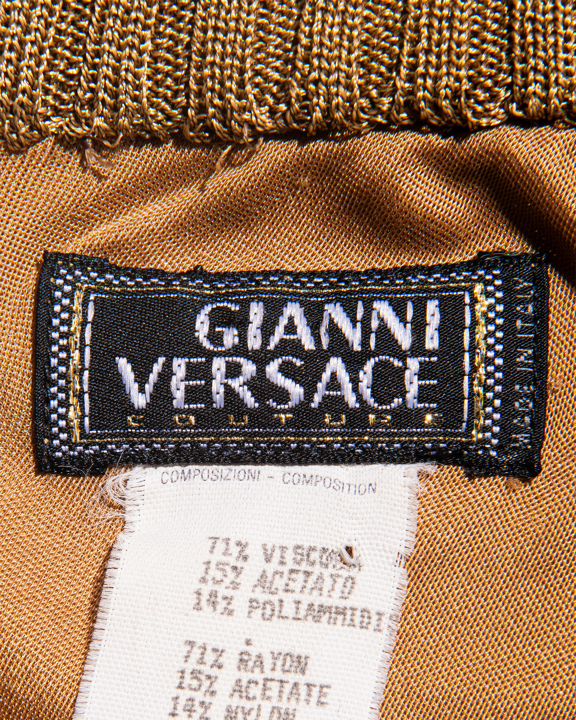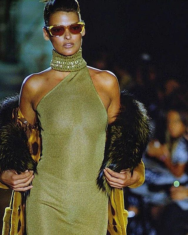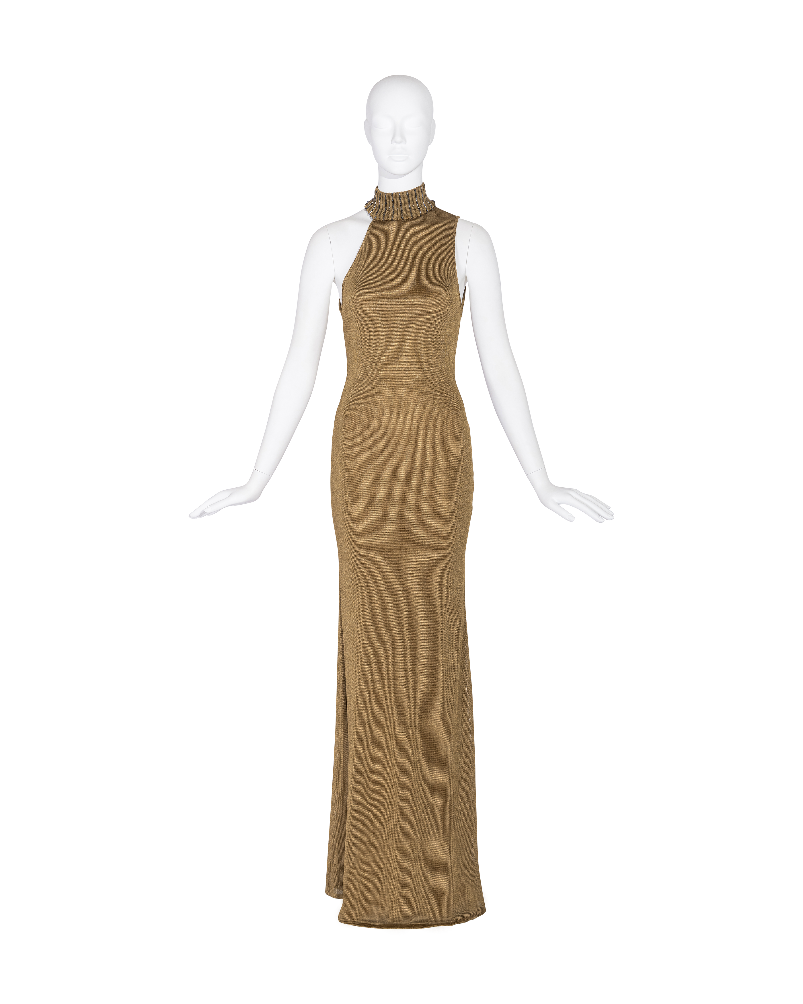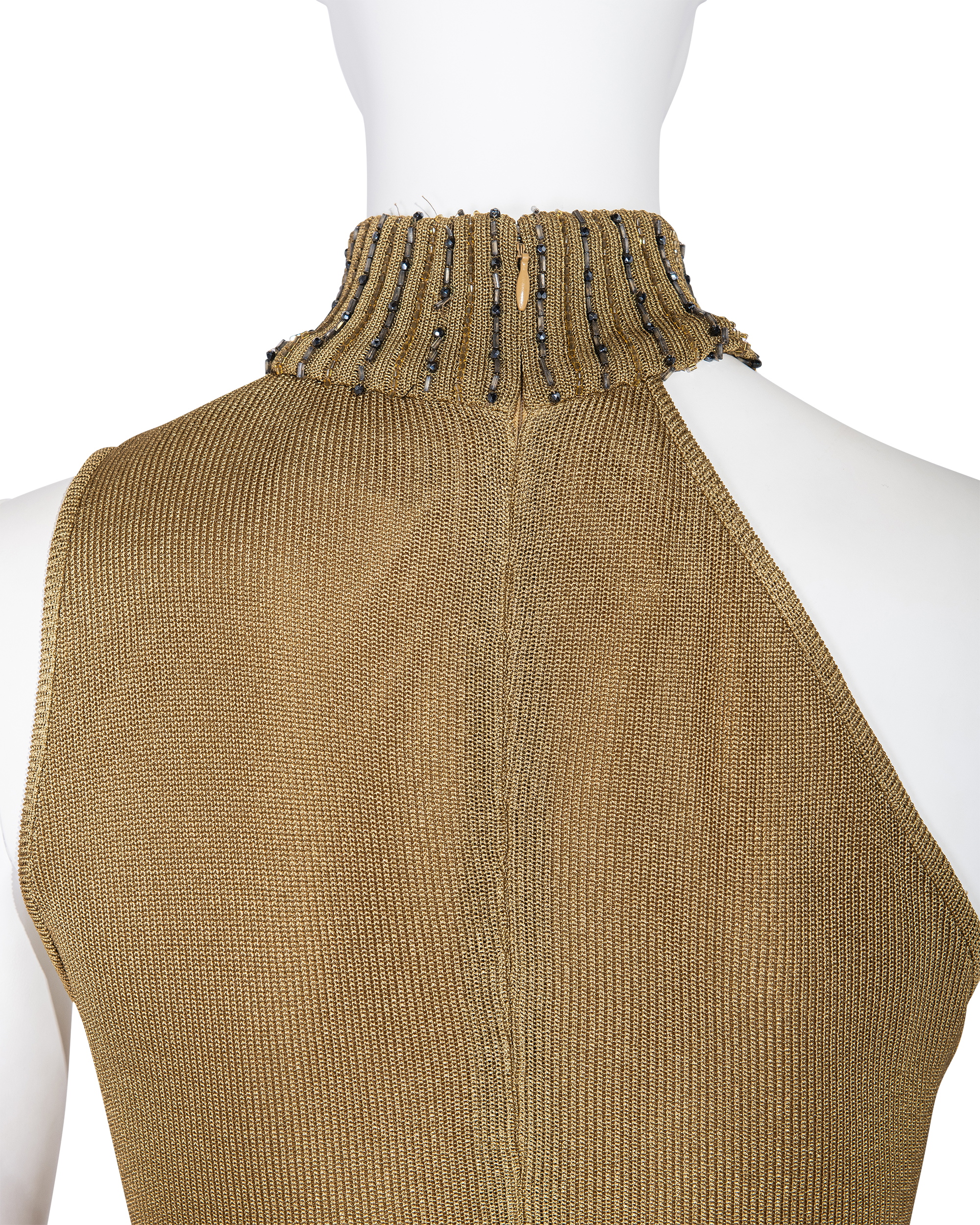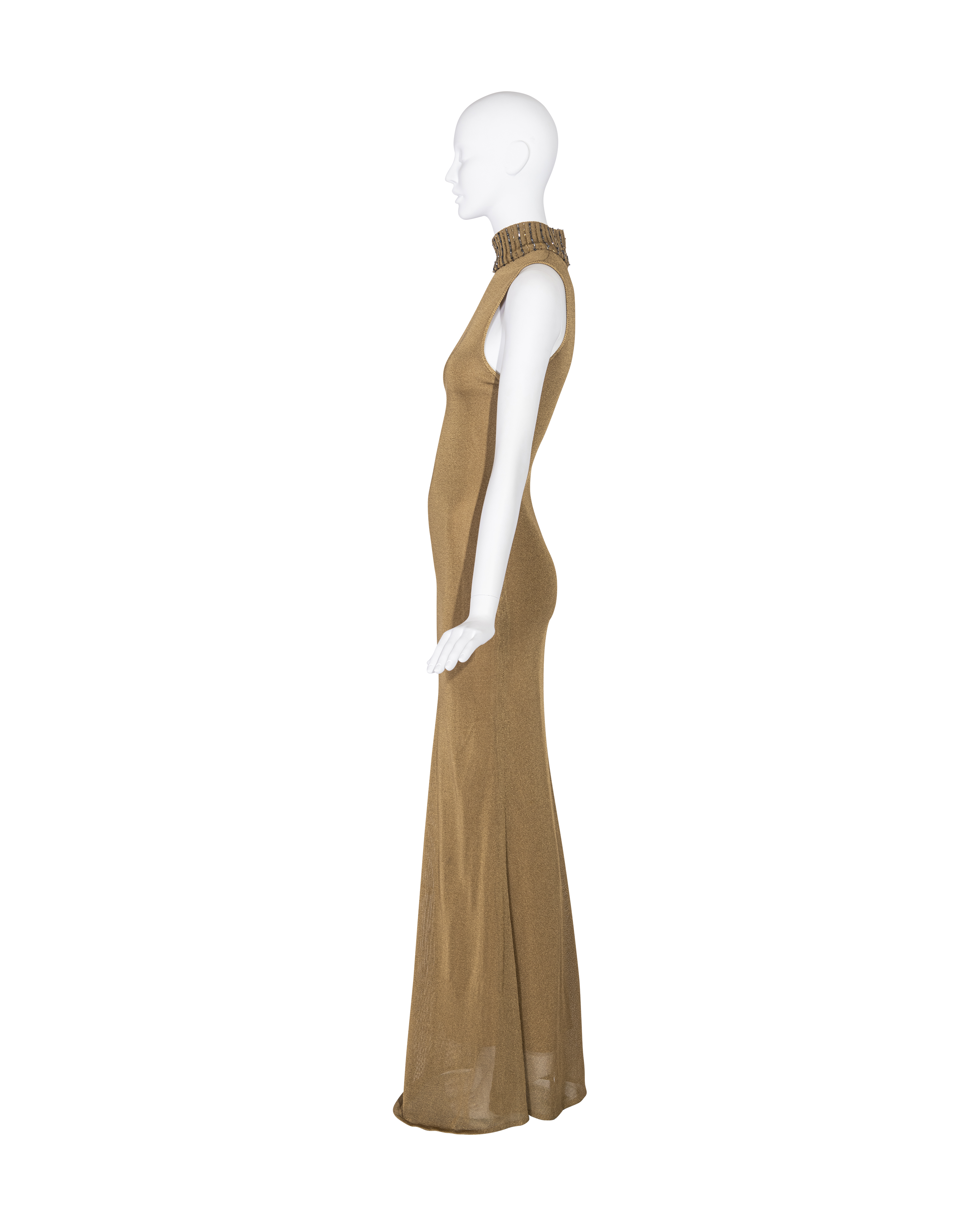 A/W 1996 Gianni Versace Couture olive knit mock neck gown. Sleeveless mock neck fitted gown with embellishments at turtleneck that create trompe l'oeil ribbed knit texture. Asymmetrical coverage at bust and semi-sheer mesh extending past interior slip create unique detailing. Concealed back zip closure. Fabric Contents: 71% Rayon, 15% Acetate and 14% Nylon blend. Rare dress as seen on the runway on supermodel Linda Evangelista, photographed on Lisa Marie Presley by Mario Testino, and seen on Celine Dion for the 7th Annual Billboard Music Awards. In very good vintage condition with minor runs / snags in fabric near hemline (unnoticeable when worn).