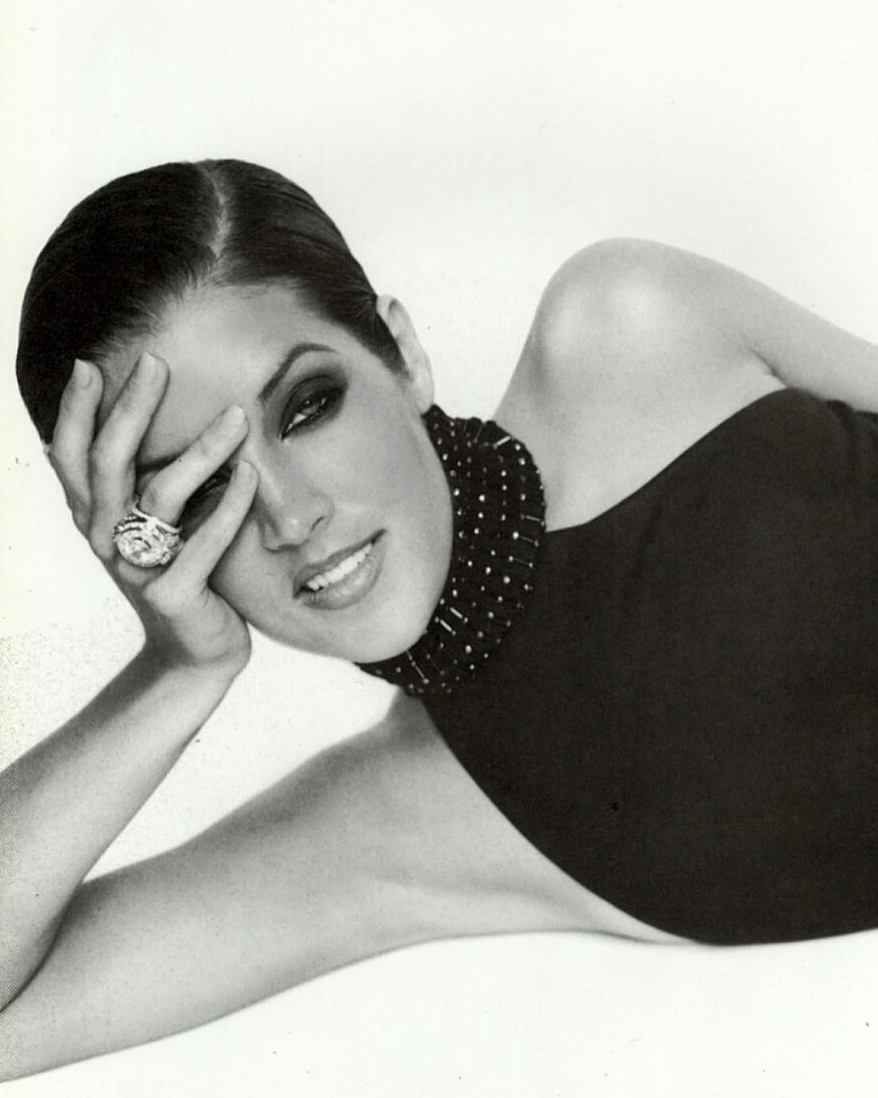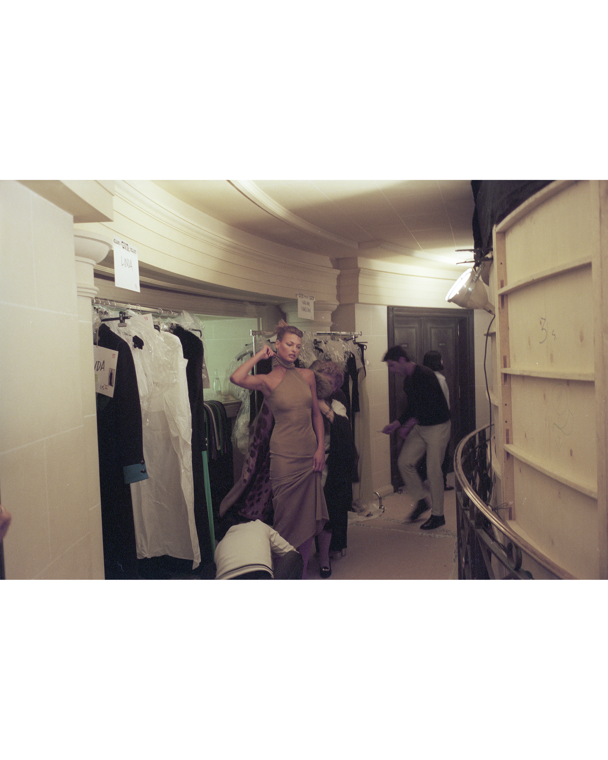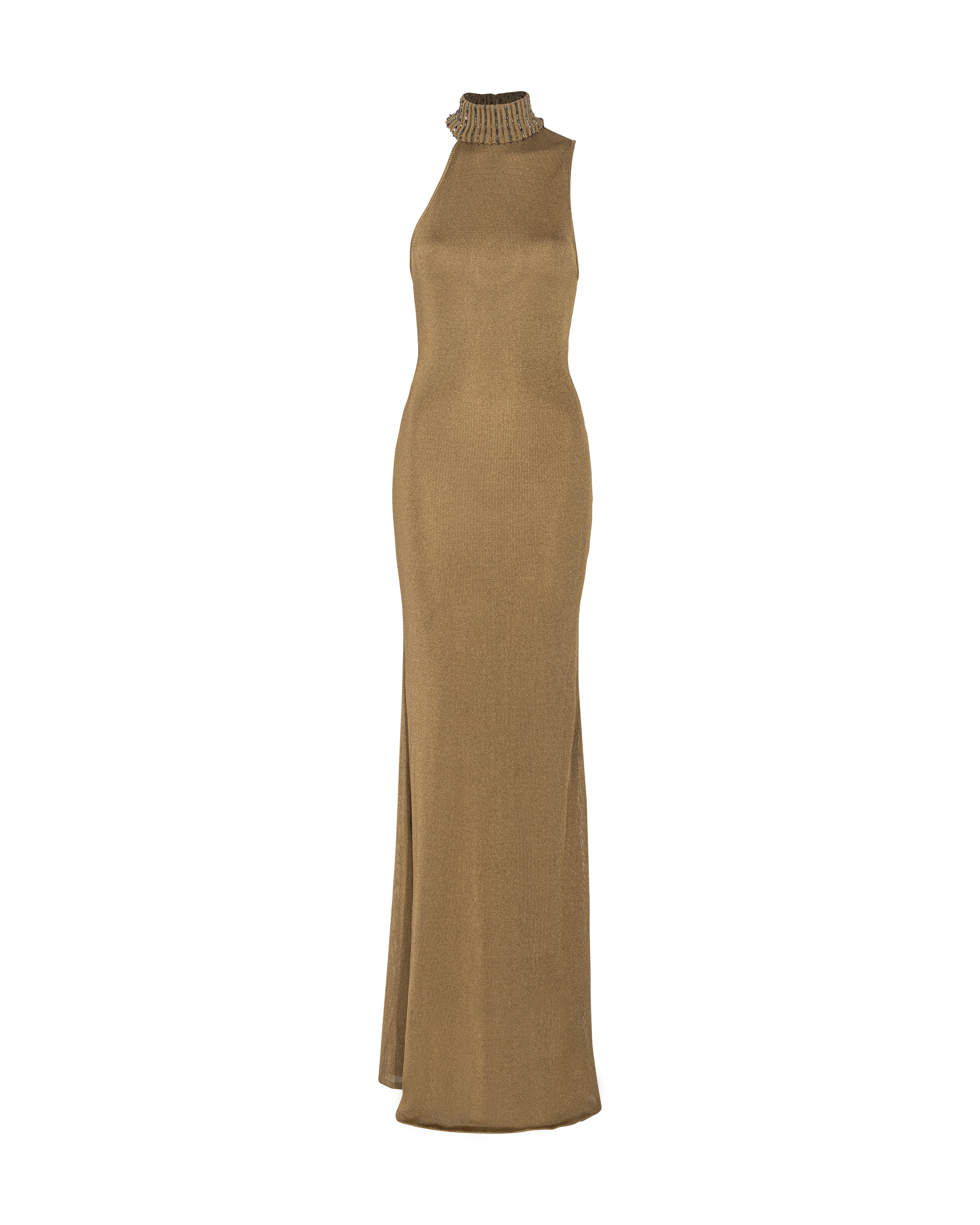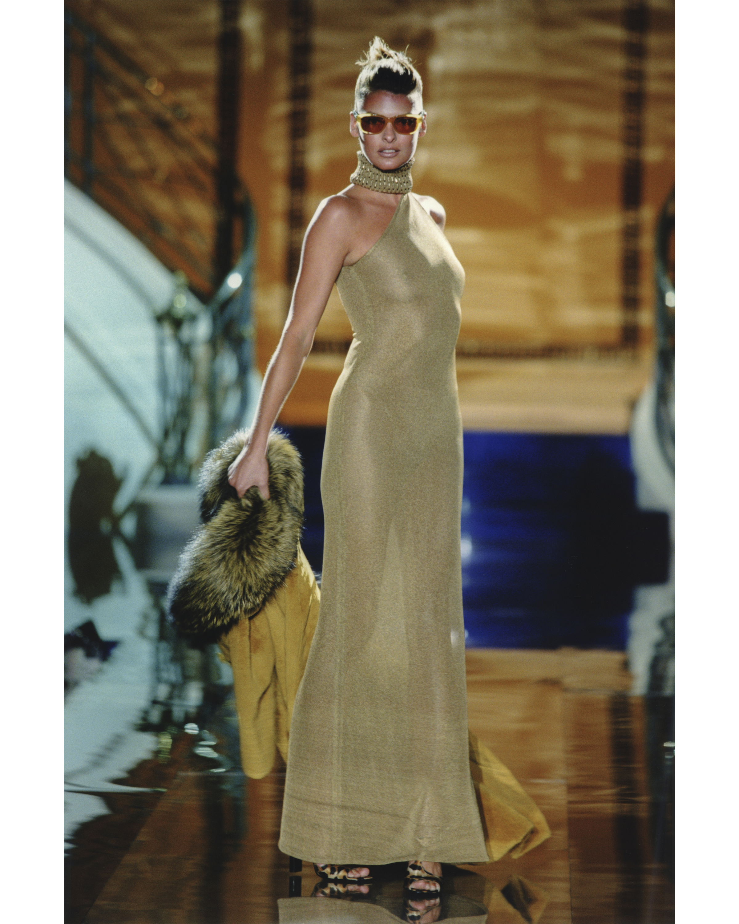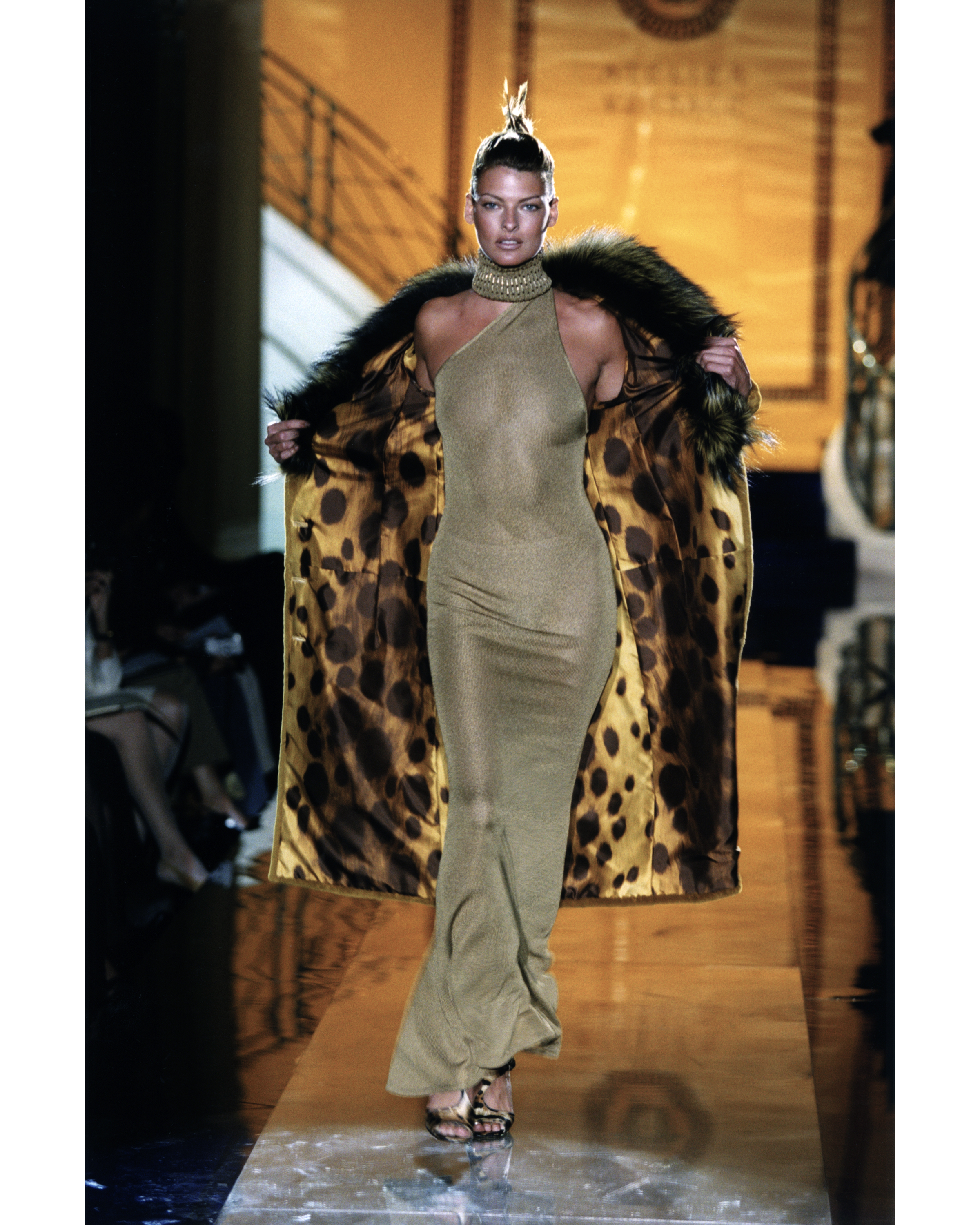 A/W 1996 Gianni Versace Couture olive knit mock neck gown. Sleeveless mock neck fitted gown with embellishments at turtleneck that create trompe l'oeil ribbed knit texture. Asymmetrical coverage at bust and semi-sheer mesh extending past interior slip create unique detailing. Concealed back zip closure. Fabric Contents: 71% Rayon, 15% Acetate and 14% Nylon blend. Rare dress as seen on the runway on supermodel Linda Evangelista, photographed on Lisa Marie Presley by Mario Testino, and seen on Celine Dion for the 7th Annual Billboard Music Awards. In very good vintage condition with minor runs / snags in fabric near hemline (unnoticeable when worn).