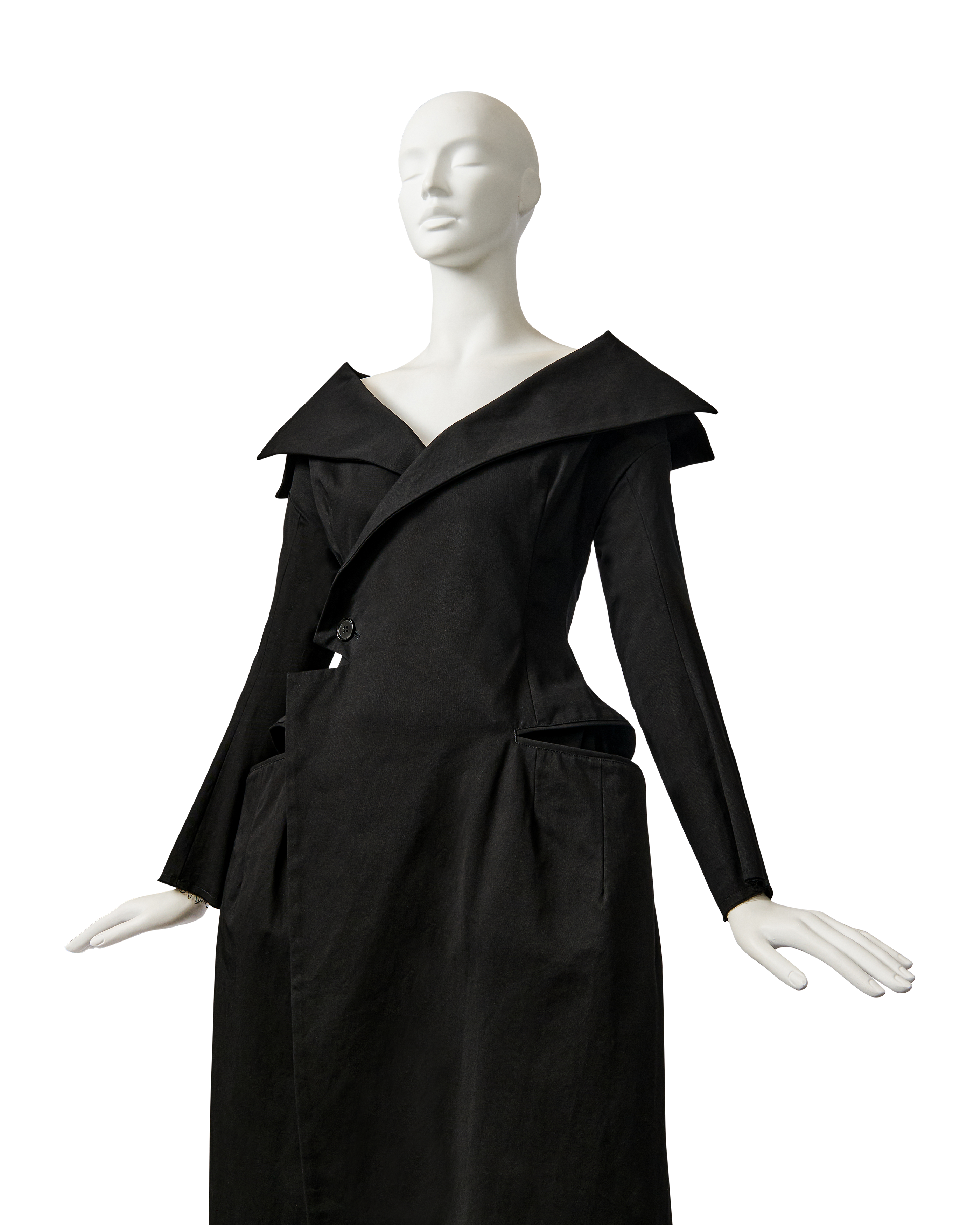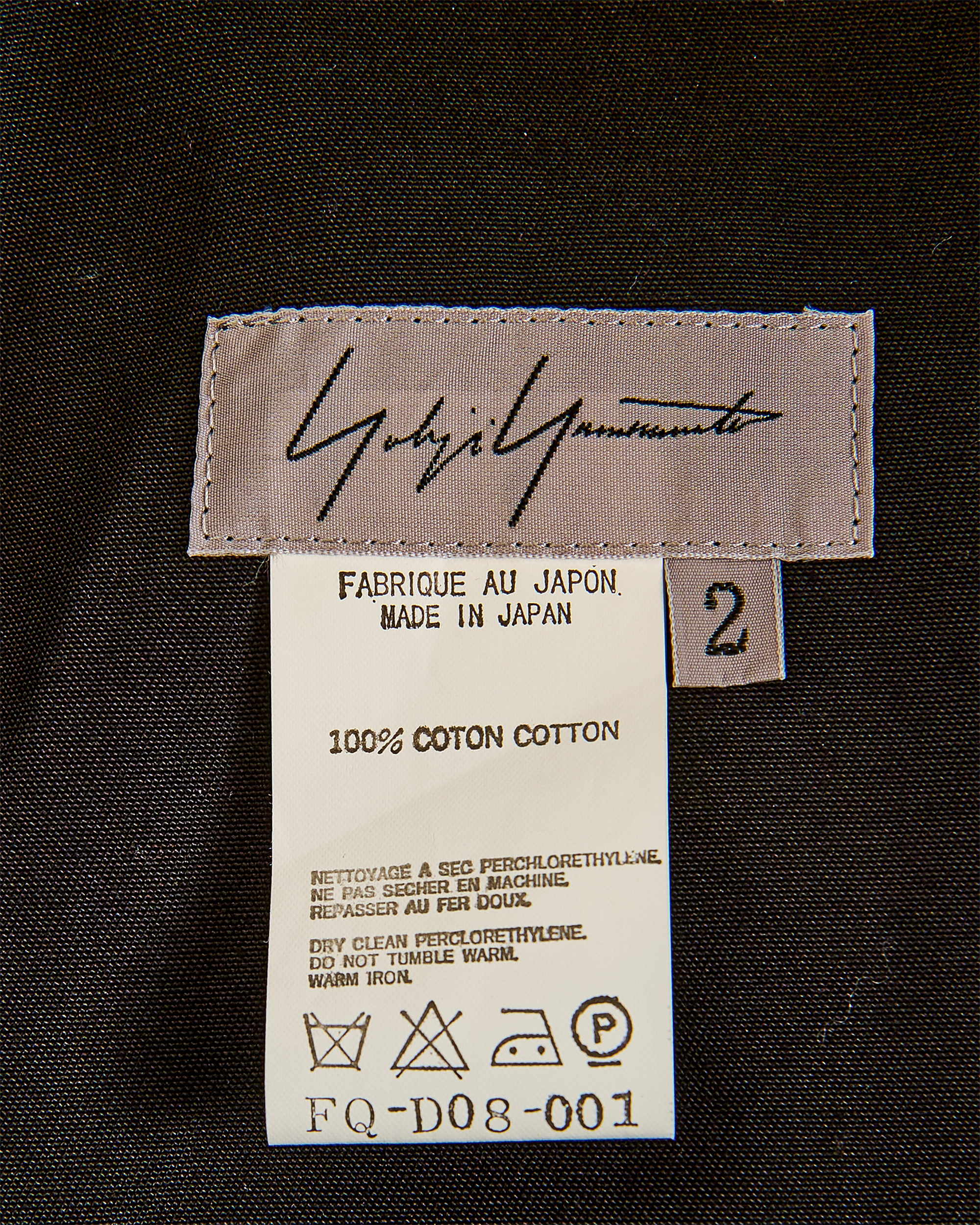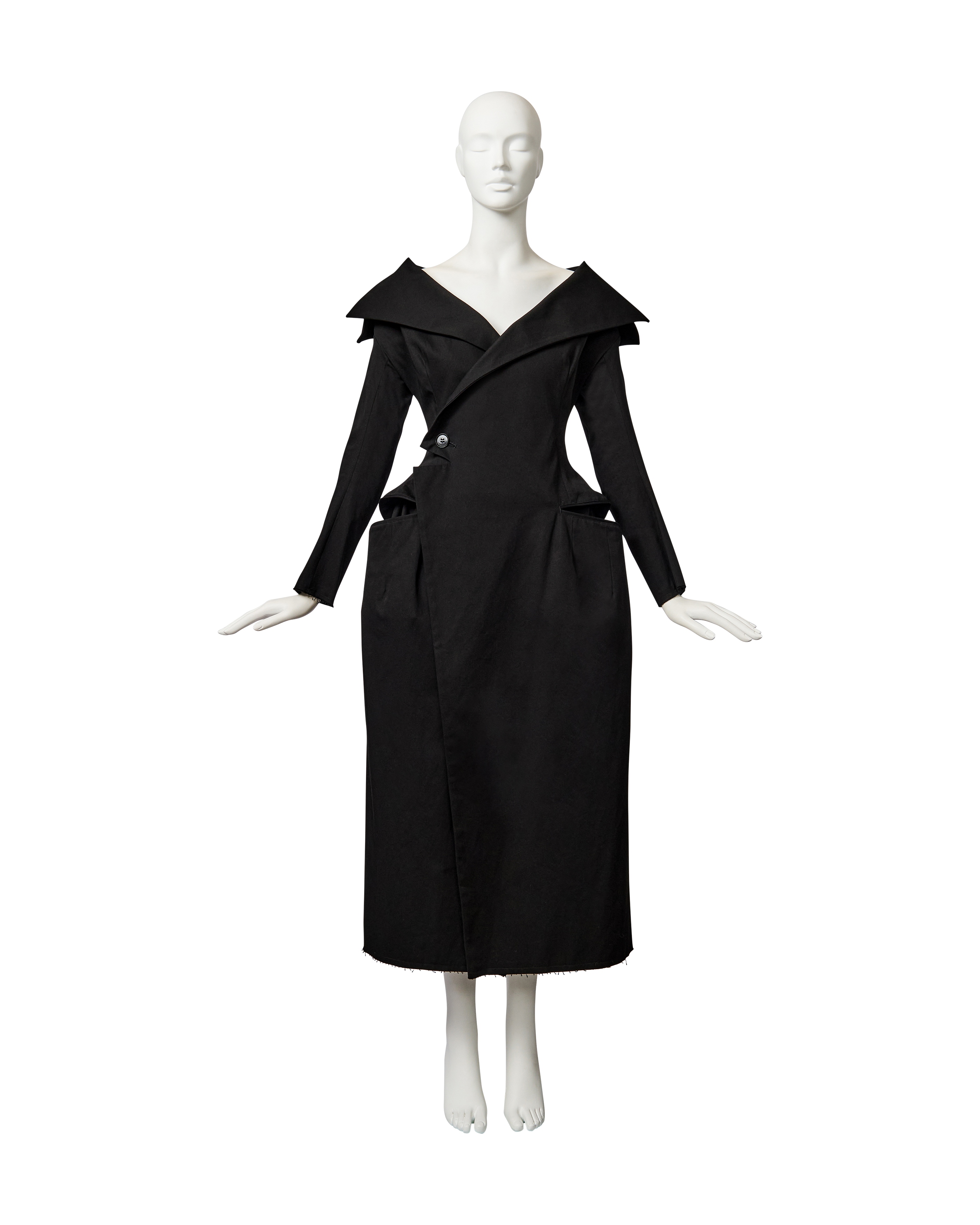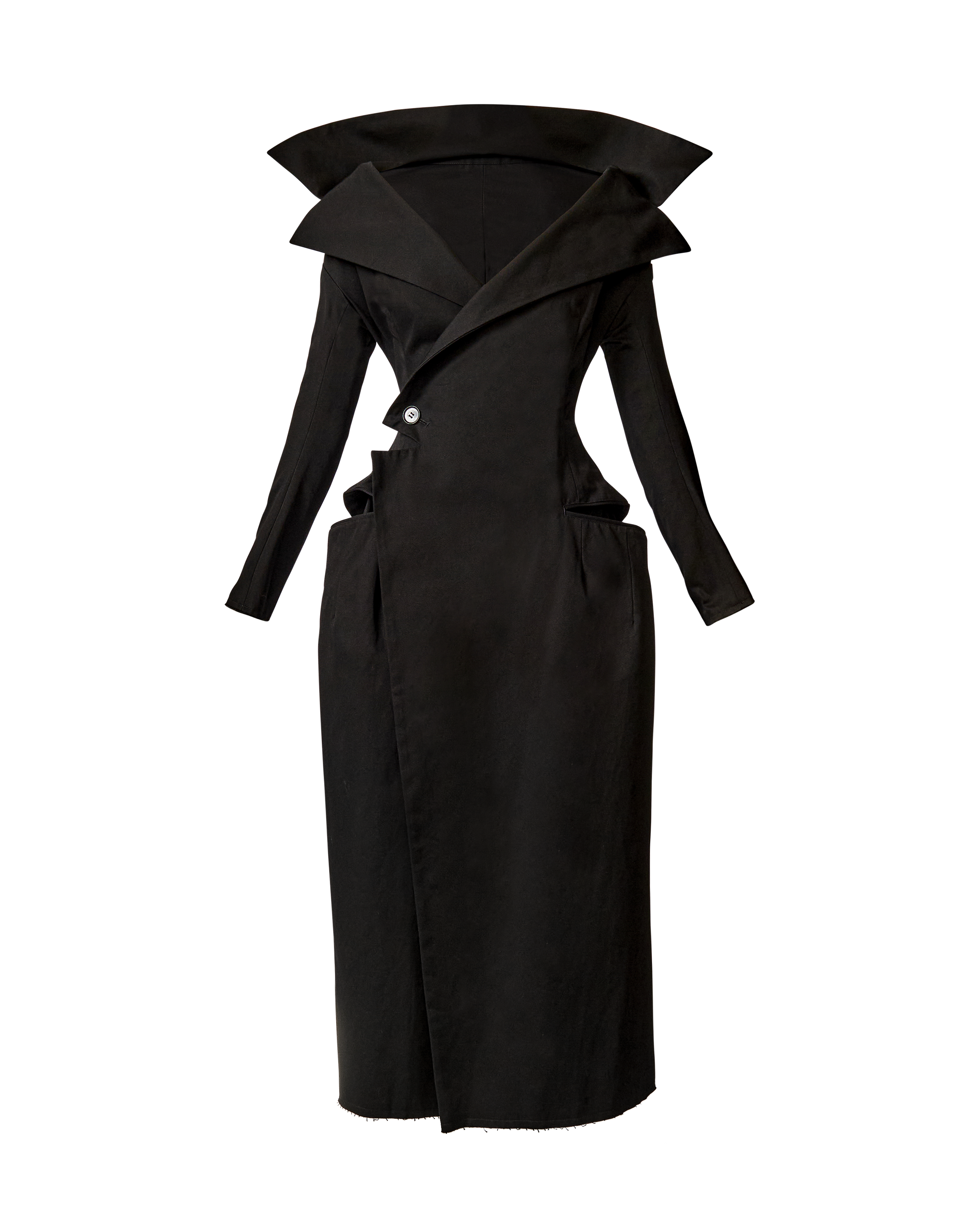 S/S 2003 Yohji Yamamoto black high-collar wrap dress / jacket. Long sleeve structured wrap dress / jacket with interior button closure and single exterior button closure, featuring slightly off-shoulder pointed lapels and wide back collar that can be raised as desired. Functional pockets at hips. Fabric Contents: 100% Cotton. As seen on the runway, photographed by David Sims for AnOther Magazine, and featured in the Gallery of Modern Art. In excellent vintage condition with no flaws to note.