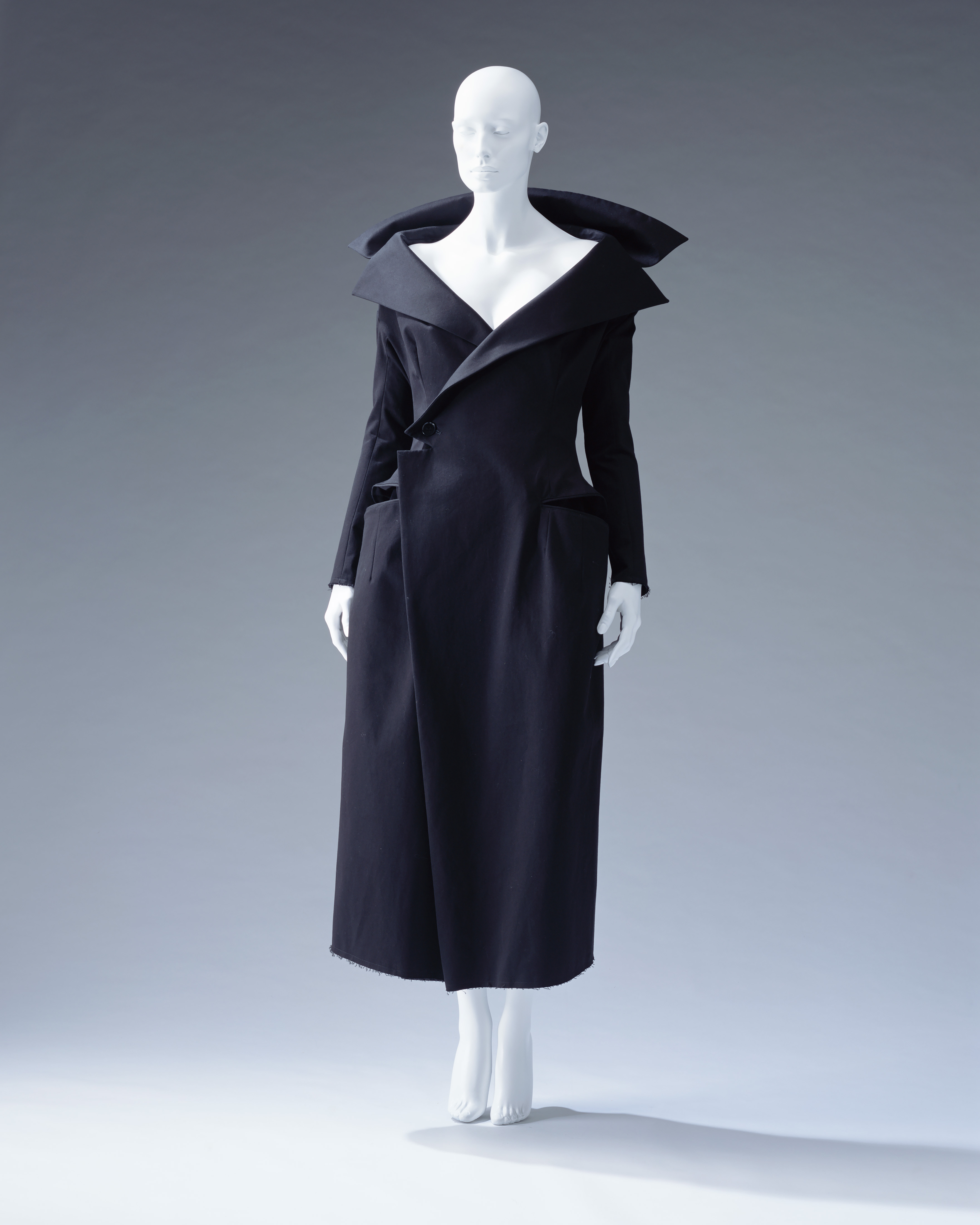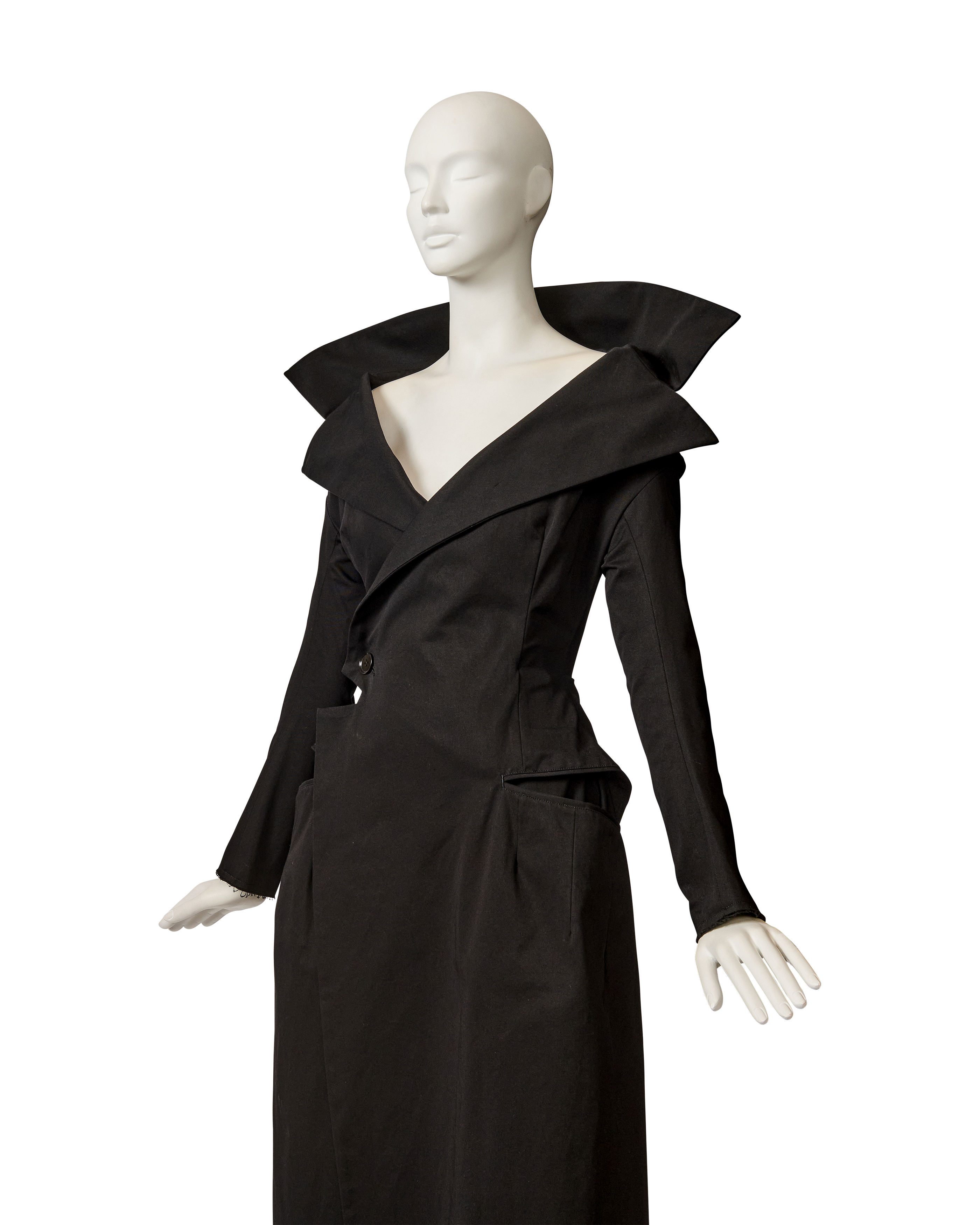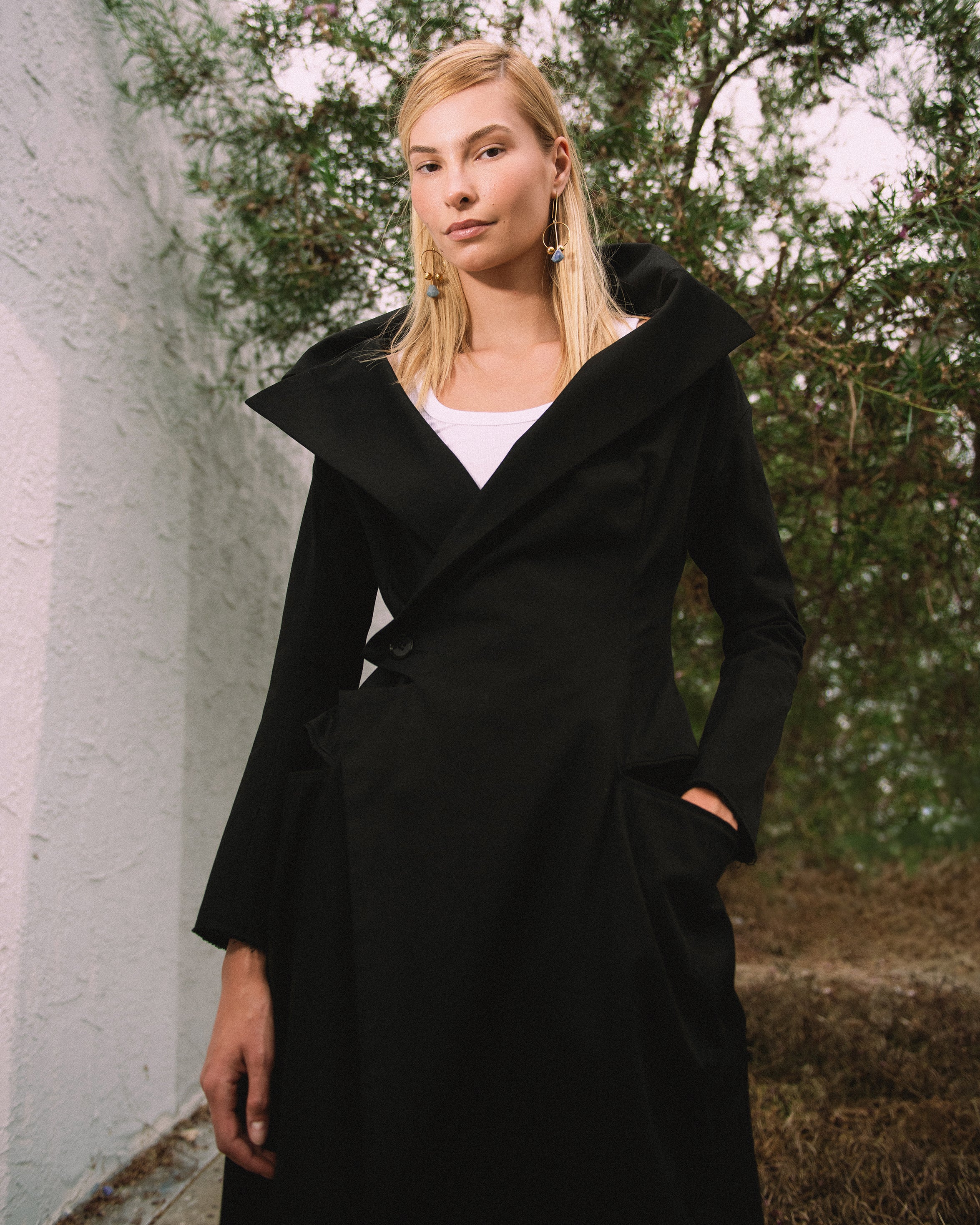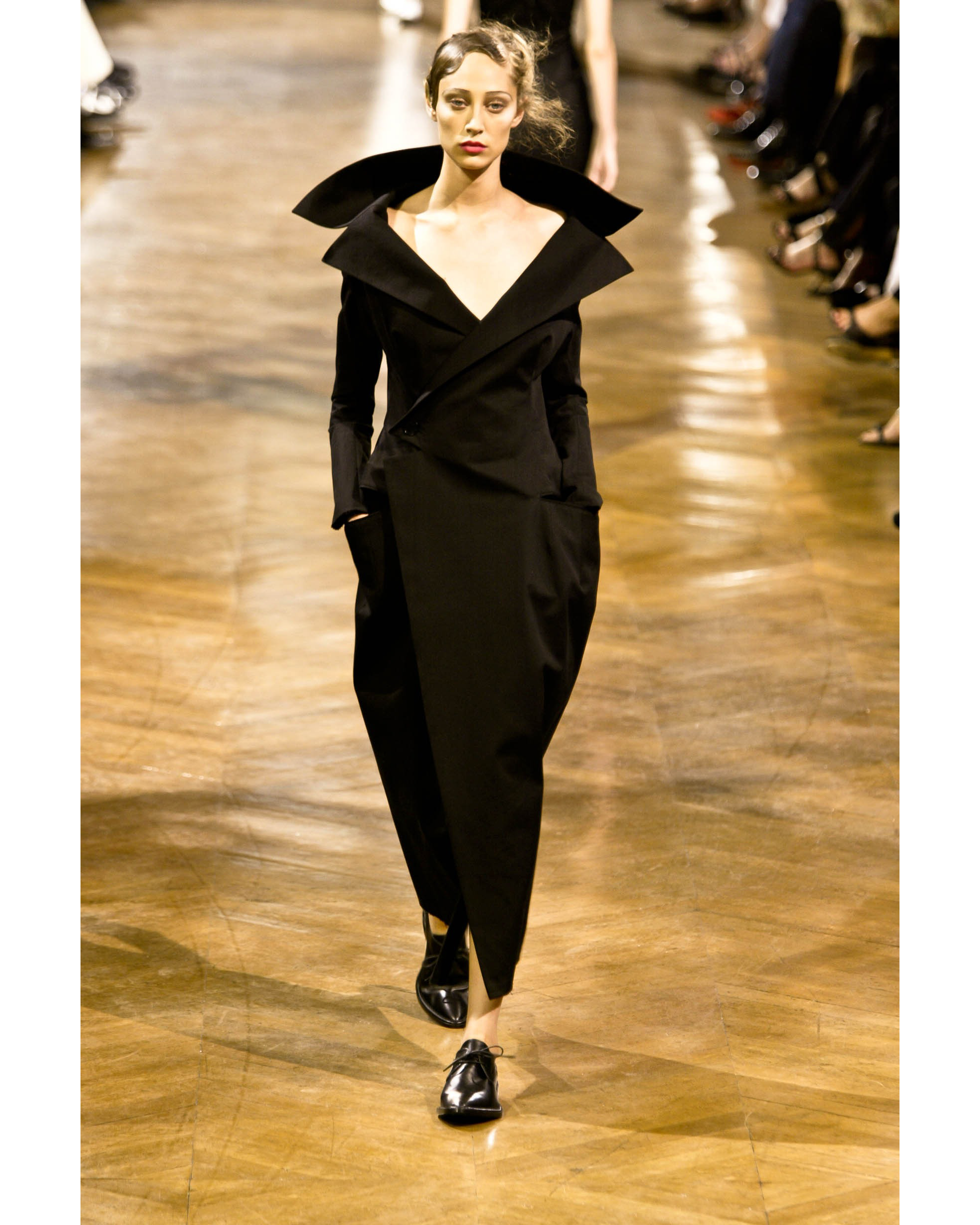 S/S 2003 Yohji Yamamoto black high-collar wrap dress / jacket. Long sleeve structured wrap dress / jacket with interior button closure and single exterior button closure, featuring slightly off-shoulder pointed lapels and wide back collar that can be raised as desired. Functional pockets at hips. Fabric Contents: 100% Cotton. As seen on the runway, photographed by David Sims for AnOther Magazine, and featured in the Gallery of Modern Art. In excellent vintage condition with no flaws to note.