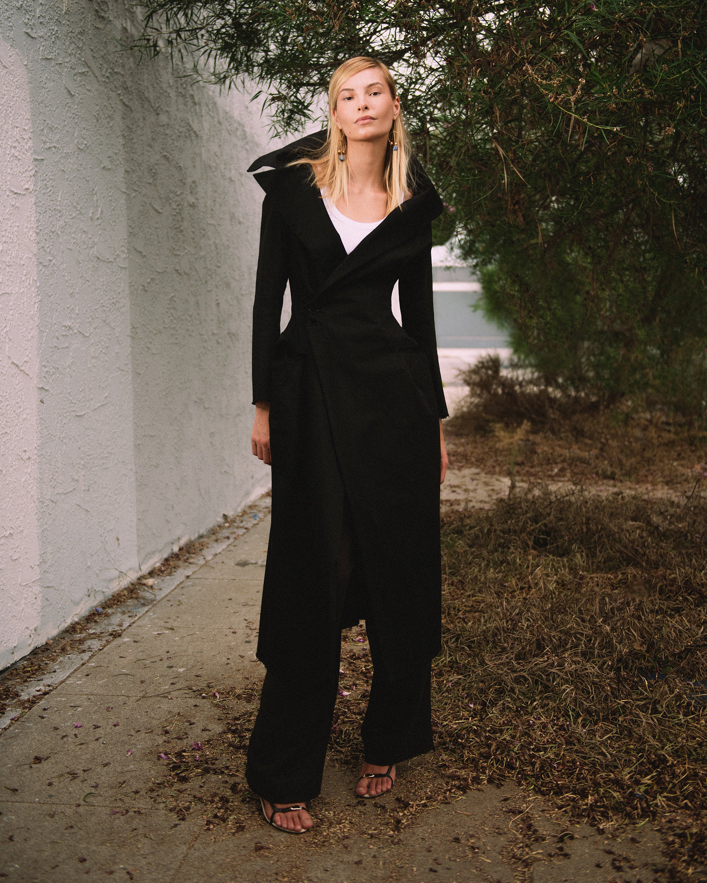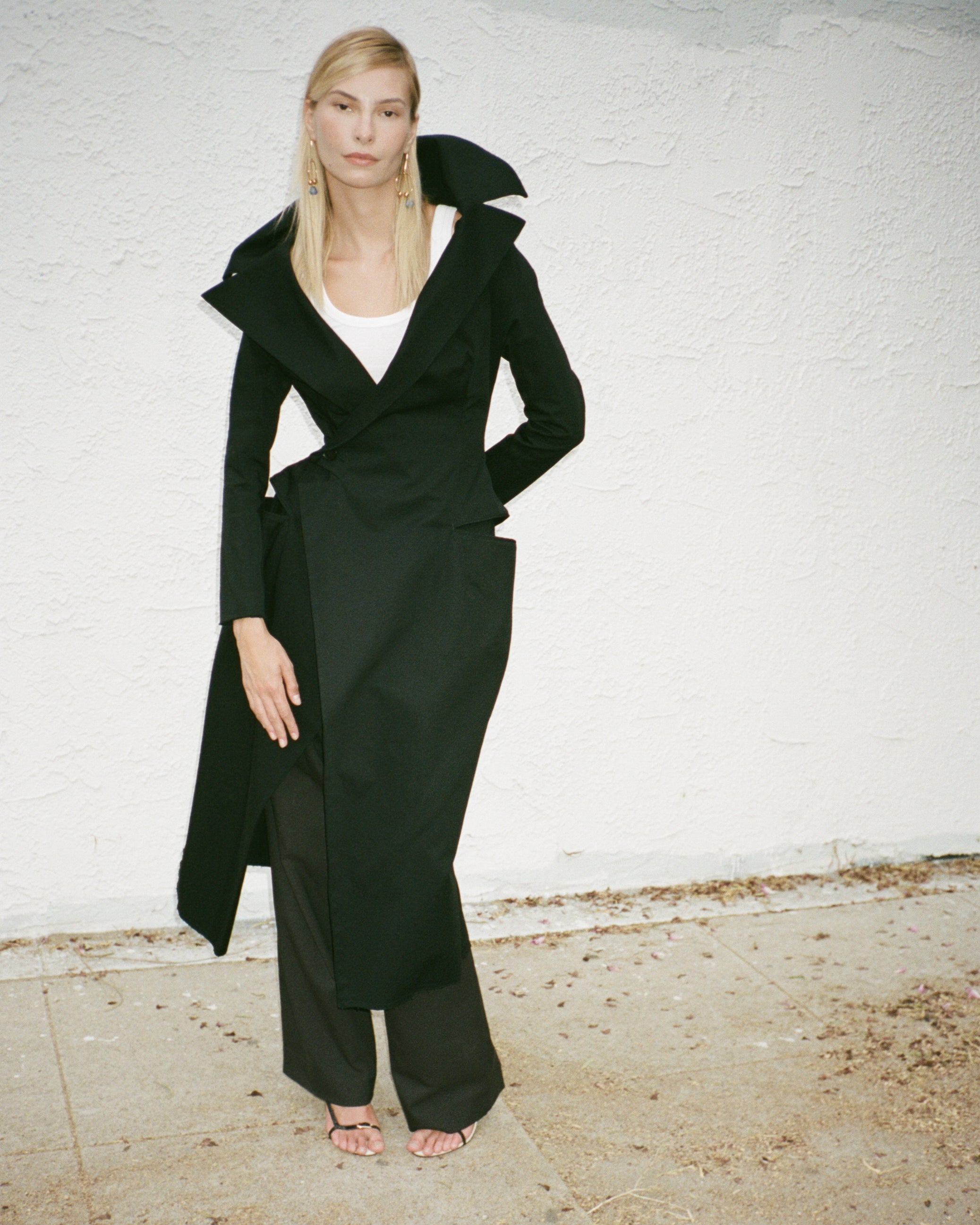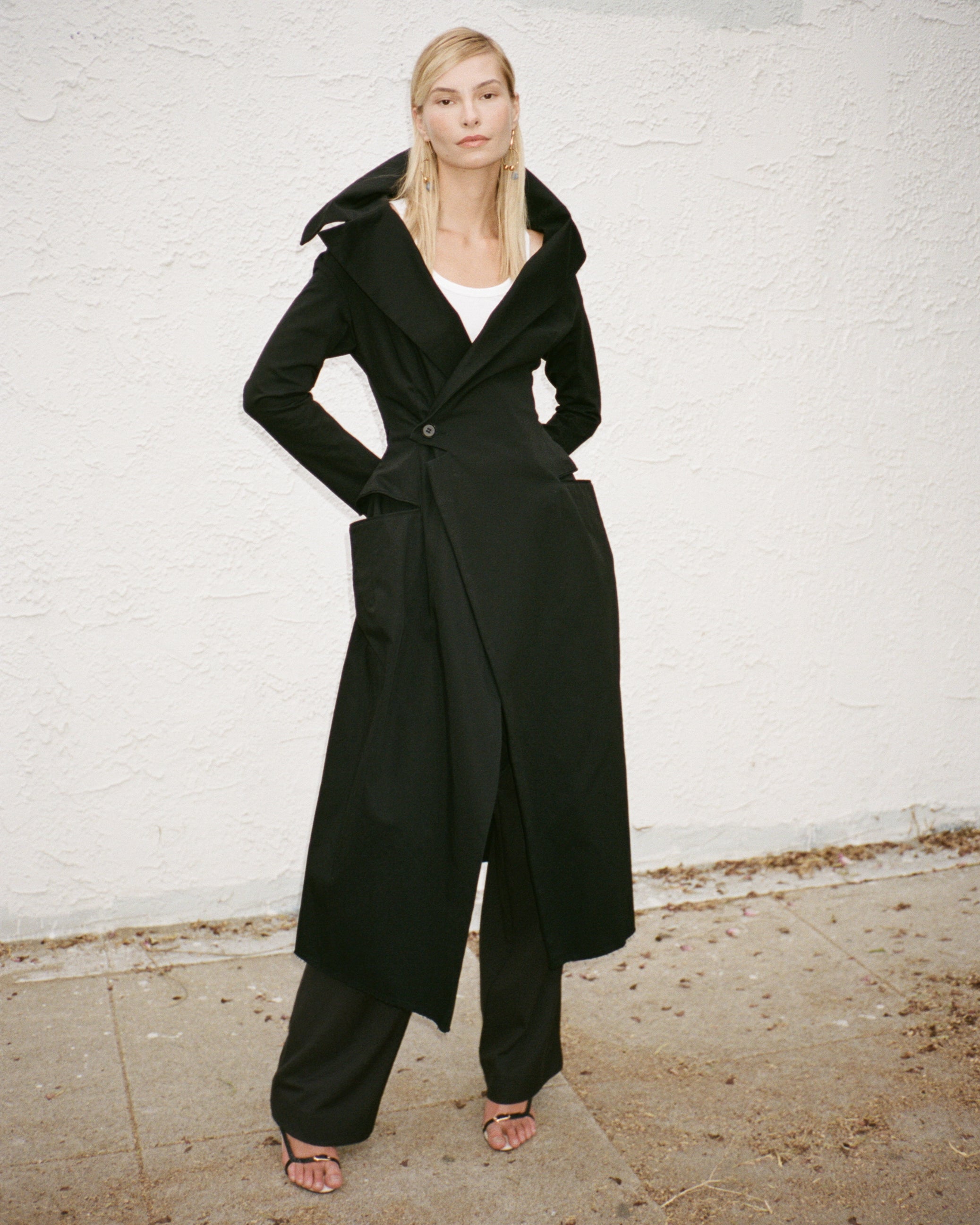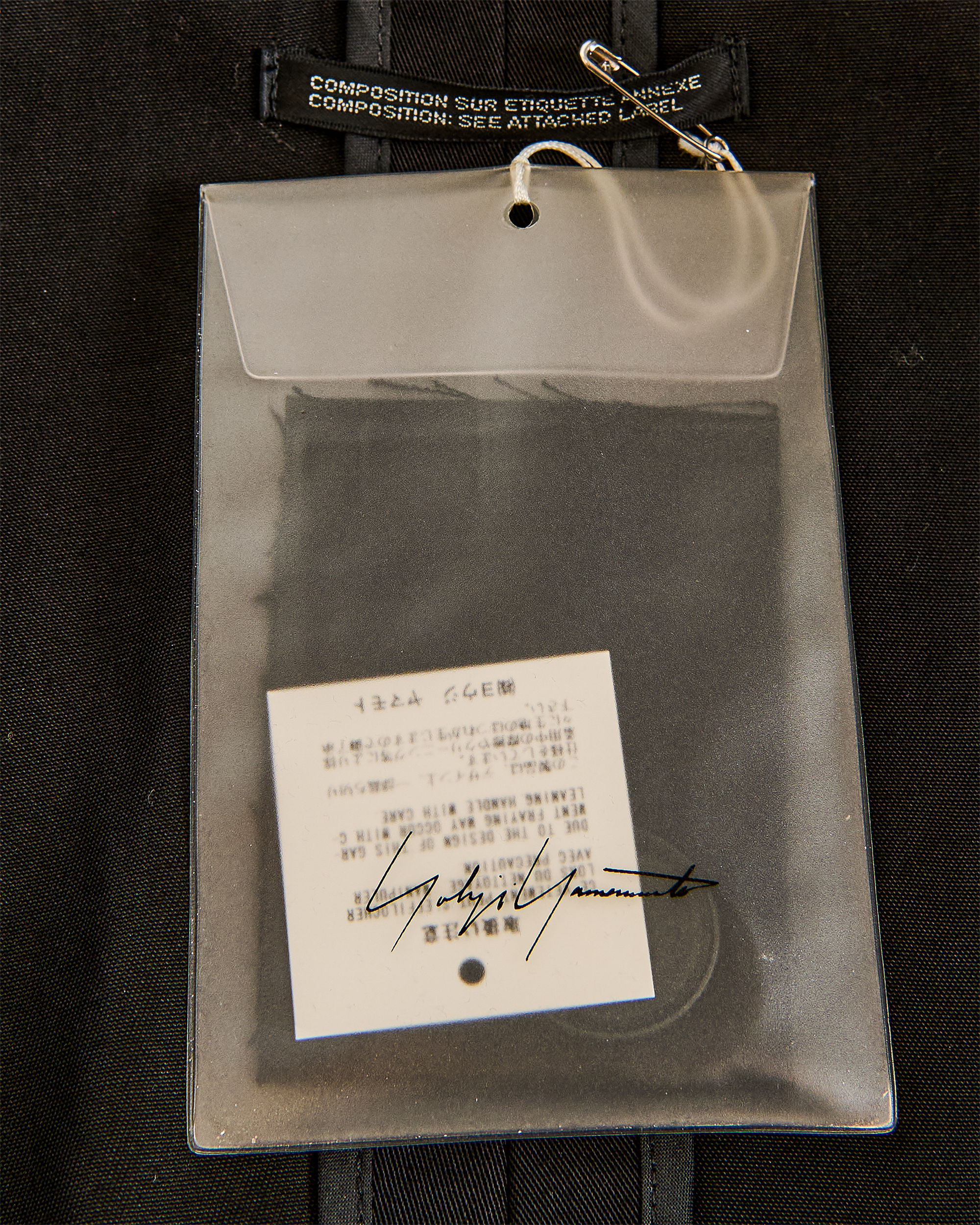 S/S 2003 Yohji Yamamoto black high-collar wrap dress / jacket. Long sleeve structured wrap dress / jacket with interior button closure and single exterior button closure, featuring slightly off-shoulder pointed lapels and wide back collar that can be raised as desired. Functional pockets at hips. Fabric Contents: 100% Cotton. As seen on the runway, photographed by David Sims for AnOther Magazine, and featured in the Gallery of Modern Art. In excellent vintage condition with no flaws to note.