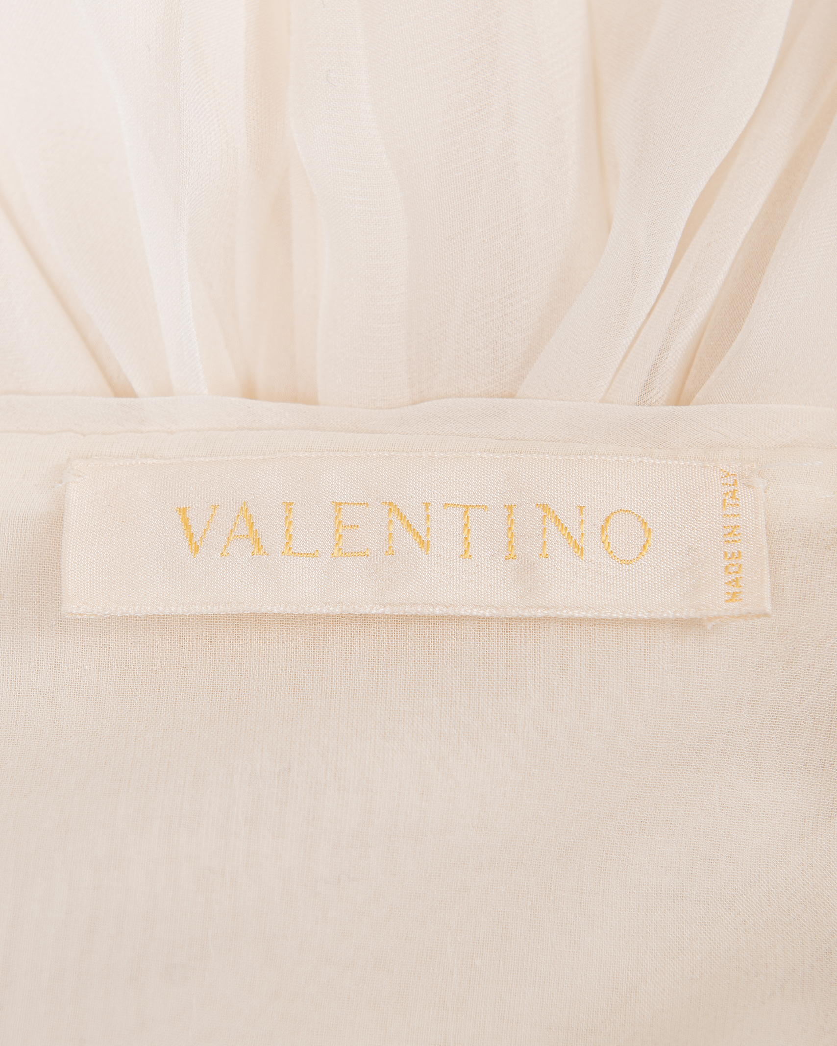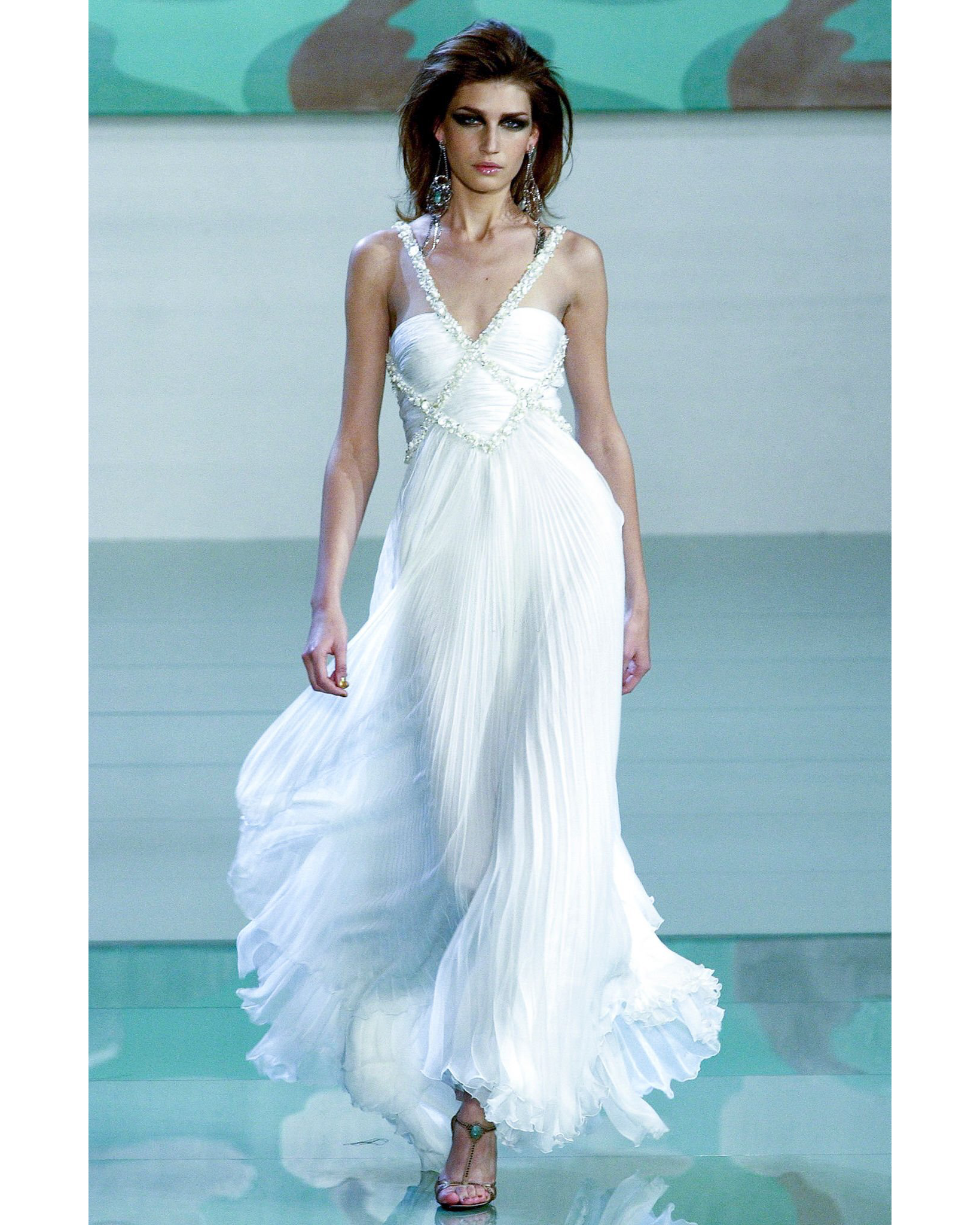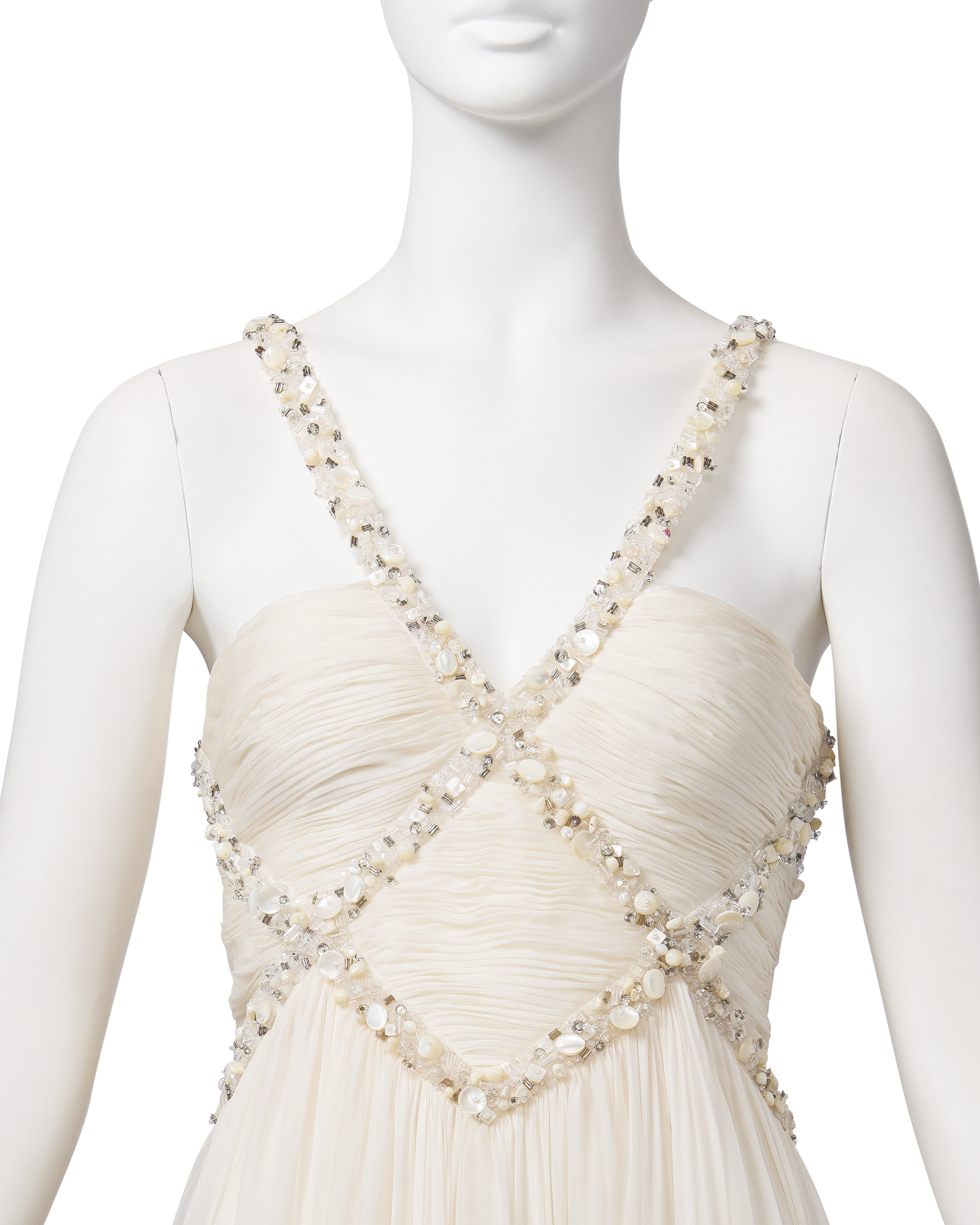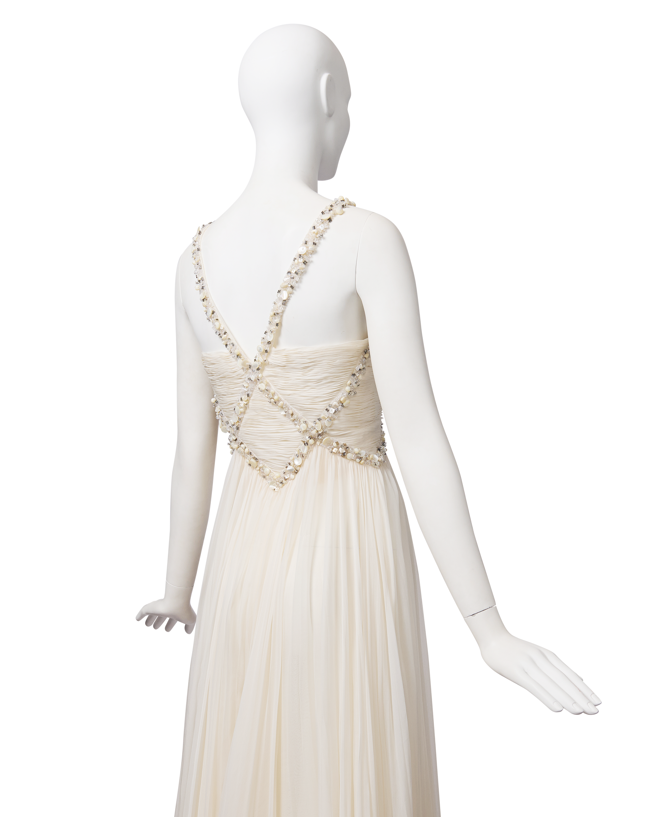 S/S 2003 Valentino ivory/white pleated gown with geometric embellished bust. Sleeveless gown with geometric bead and small shell embellished paneling and straps. Pleated bust and full, multi-layered pleated skirting that creates beautiful movement when worn: uneven length layers at hemline appear to 'float.' Concealed side zip closure. Lightweight, semi-sheer silk chiffon construction (many layers create opaque effect when worn). As seen on the runway (Look #74). In very good vintage condition with light wear throughout; small run at back and minor spots at hemline and throughout skirting (unnoticeable when worn).