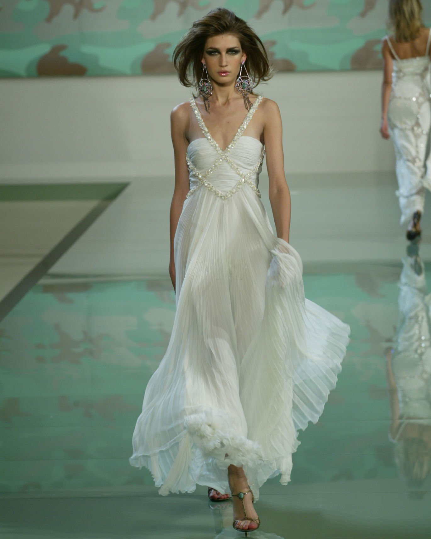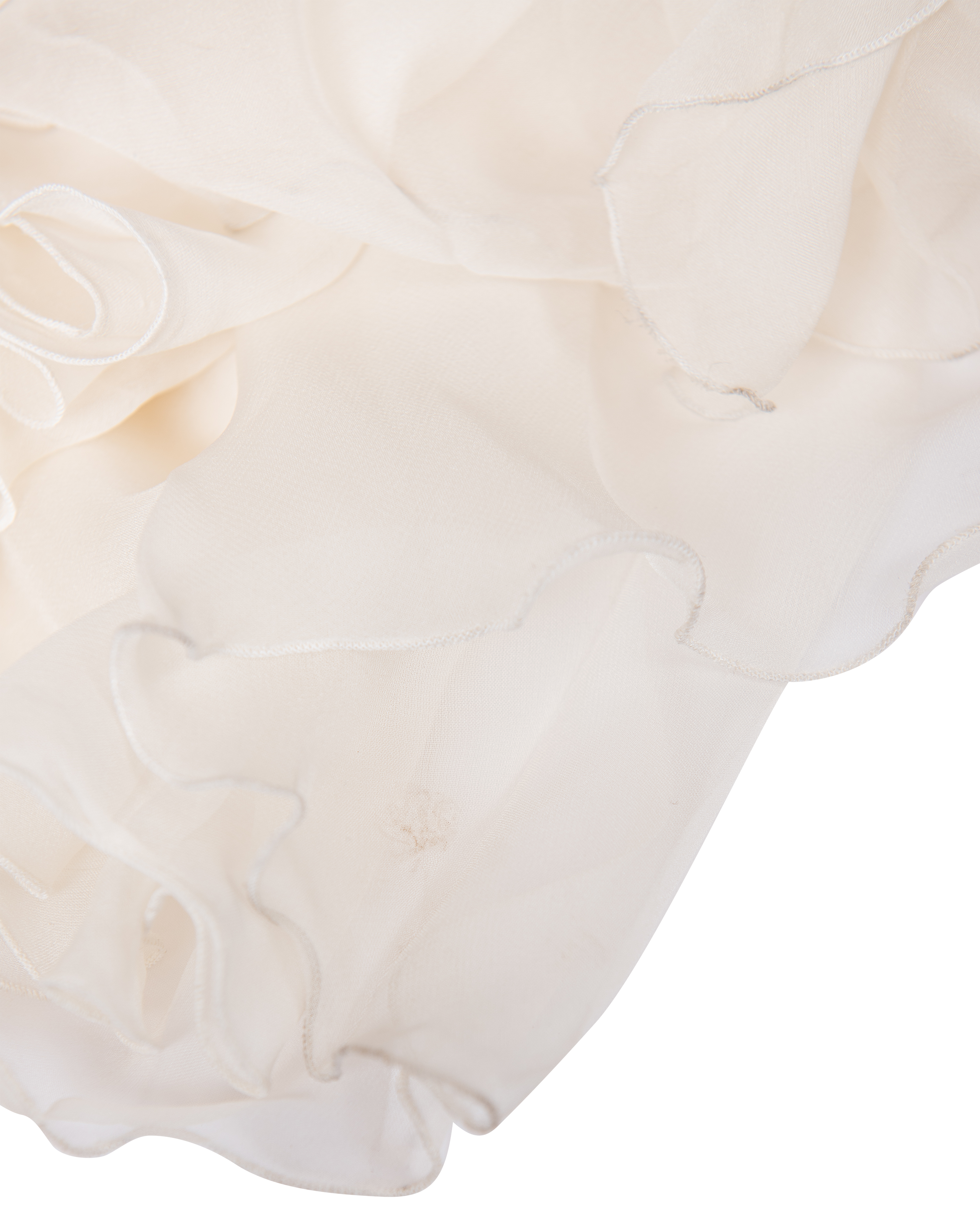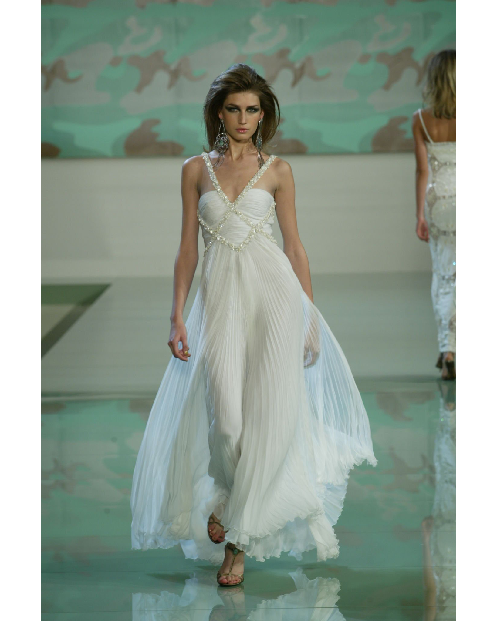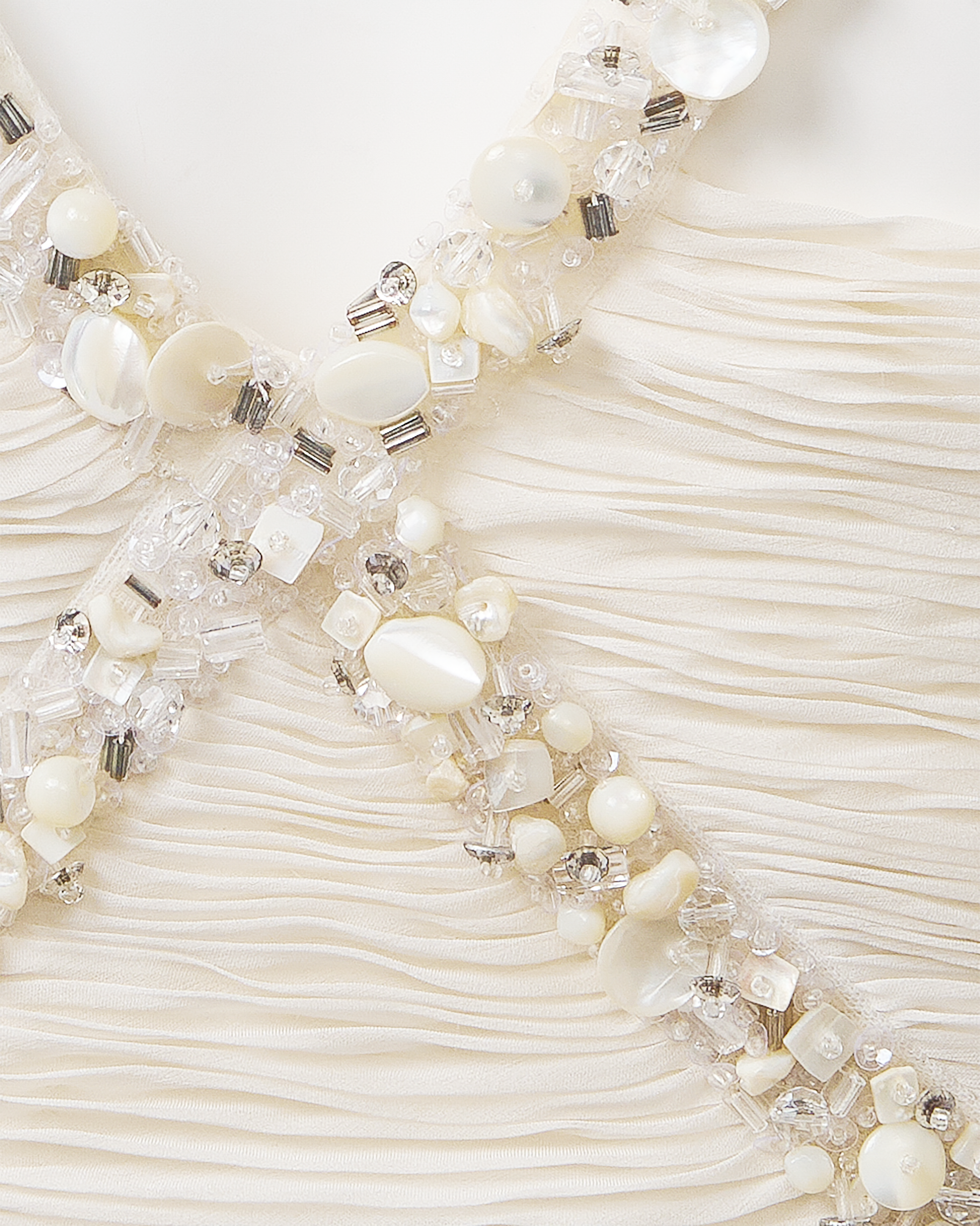 S/S 2003 Valentino ivory/white pleated gown with geometric embellished bust. Sleeveless gown with geometric bead and small shell embellished paneling and straps. Pleated bust and full, multi-layered pleated skirting that creates beautiful movement when worn: uneven length layers at hemline appear to 'float.' Concealed side zip closure. Lightweight, semi-sheer silk chiffon construction (many layers create opaque effect when worn). As seen on the runway (Look #74). In very good vintage condition with light wear throughout; small run at back and minor spots at hemline and throughout skirting (unnoticeable when worn).
