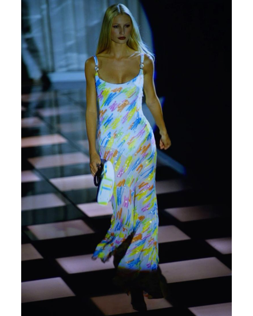 S/S 1996 Gianni Versace Couture white neon 'drawing' pattern gown with hand-beaded rhinestone embellishments. Sleeveless scoop neck dress with hand-embellished yellow, green, turquoise and orange pattern throughout. Rhinestone Medusa head detail at straps and semi-sheer construction throughout, with built-in bodysuit. Concealed side zip closure with small built-in corsetlet (additional zip closure at interior). Fabric Contents: 100% Silk - bias cut silk chiffon exterior with stretch bodysuit interior. Rare dress as seen on the runway (Look #67) on Kristy Hume. In very good vintage condition with minor missing embellishments throughout, including minor missing rhinestones at Medusa head closures (unnoticeable when worn unless upon close inspection). Slight color bleed throughout. Note that interior bodysuit has stretched with time and will likely require tailoring to best fit exact measurements.