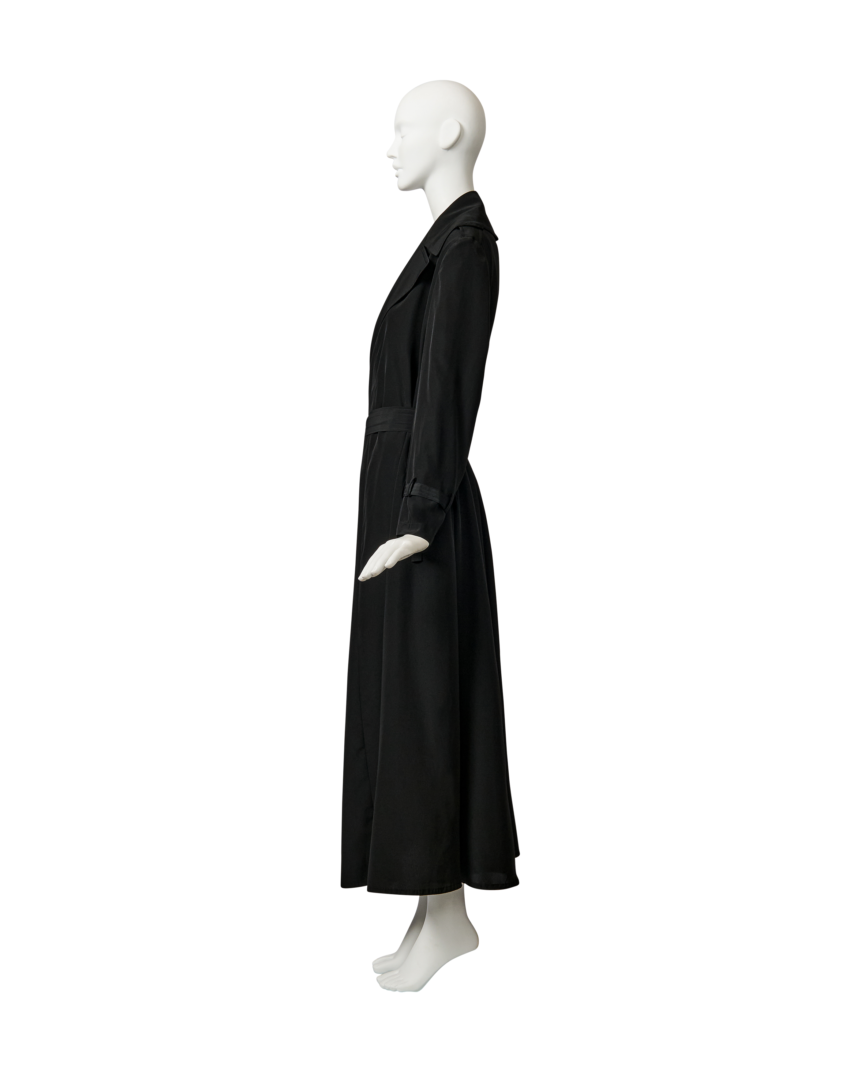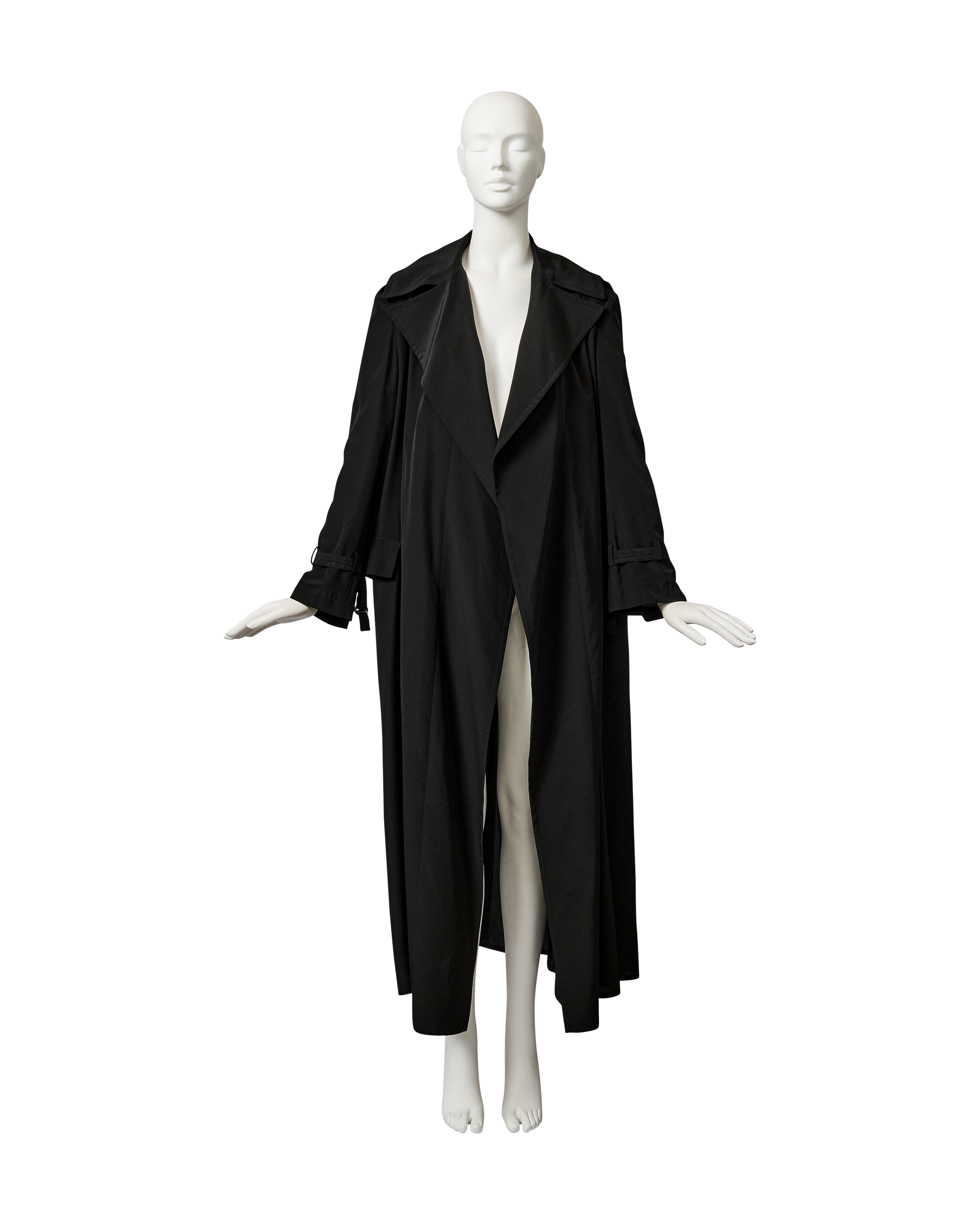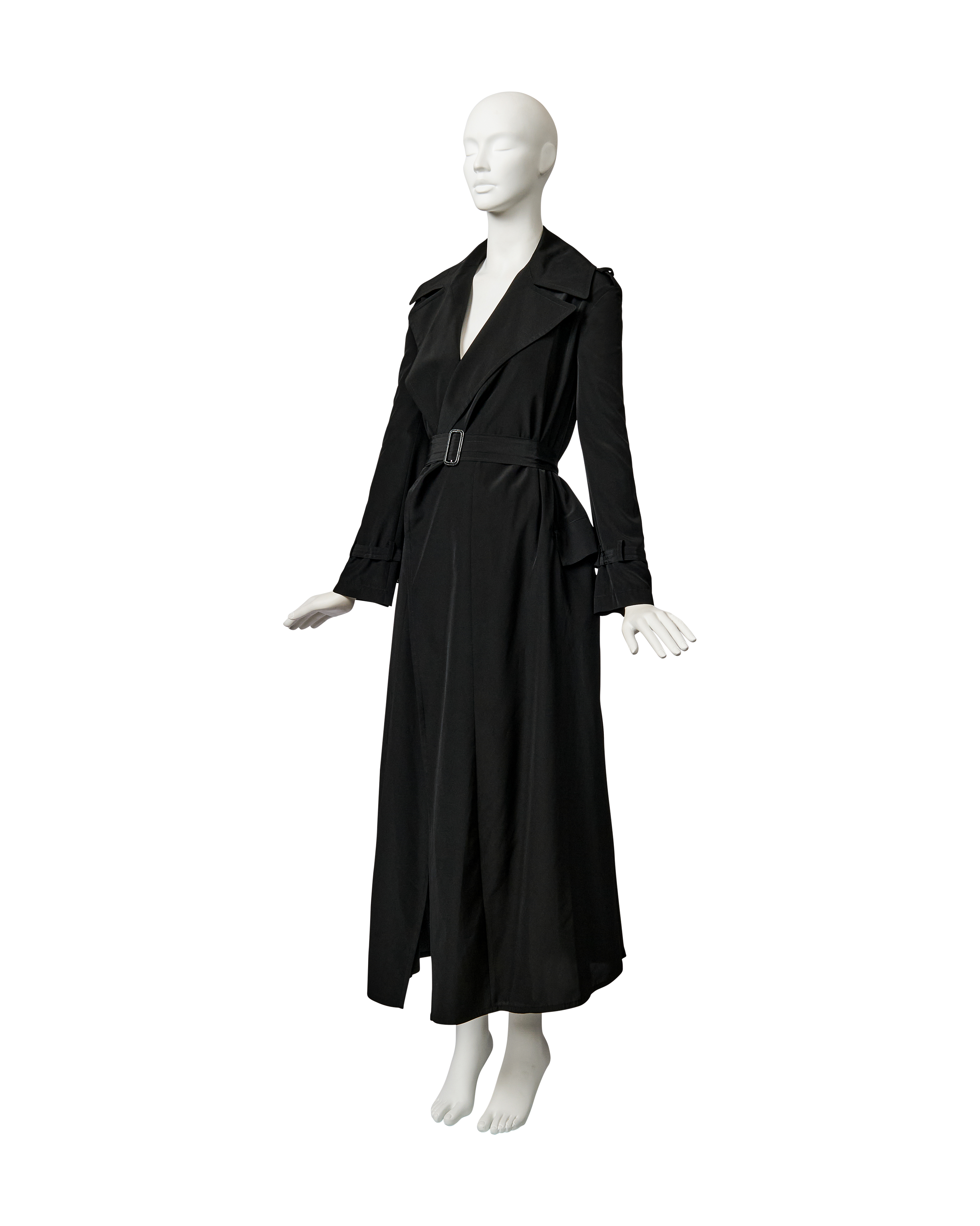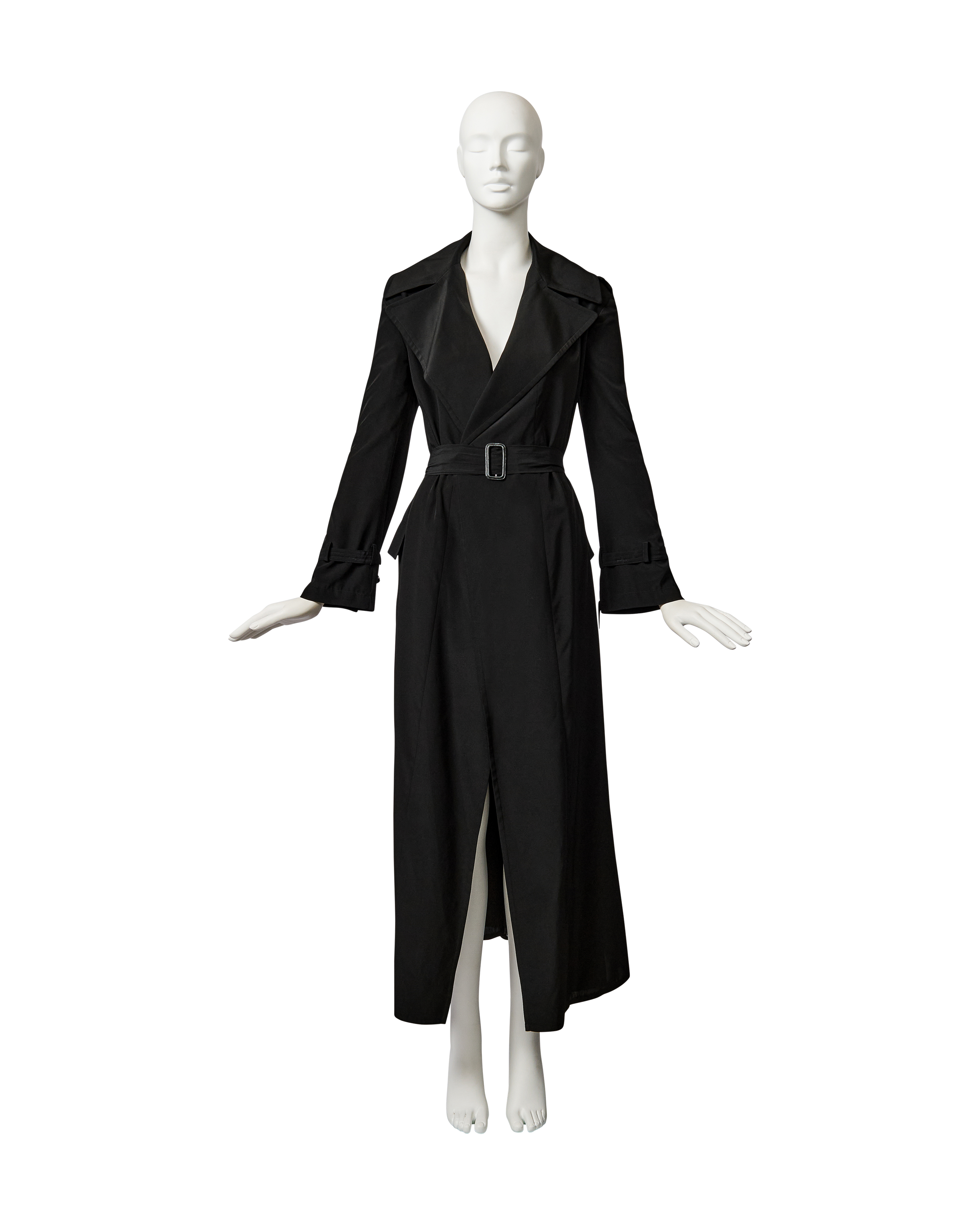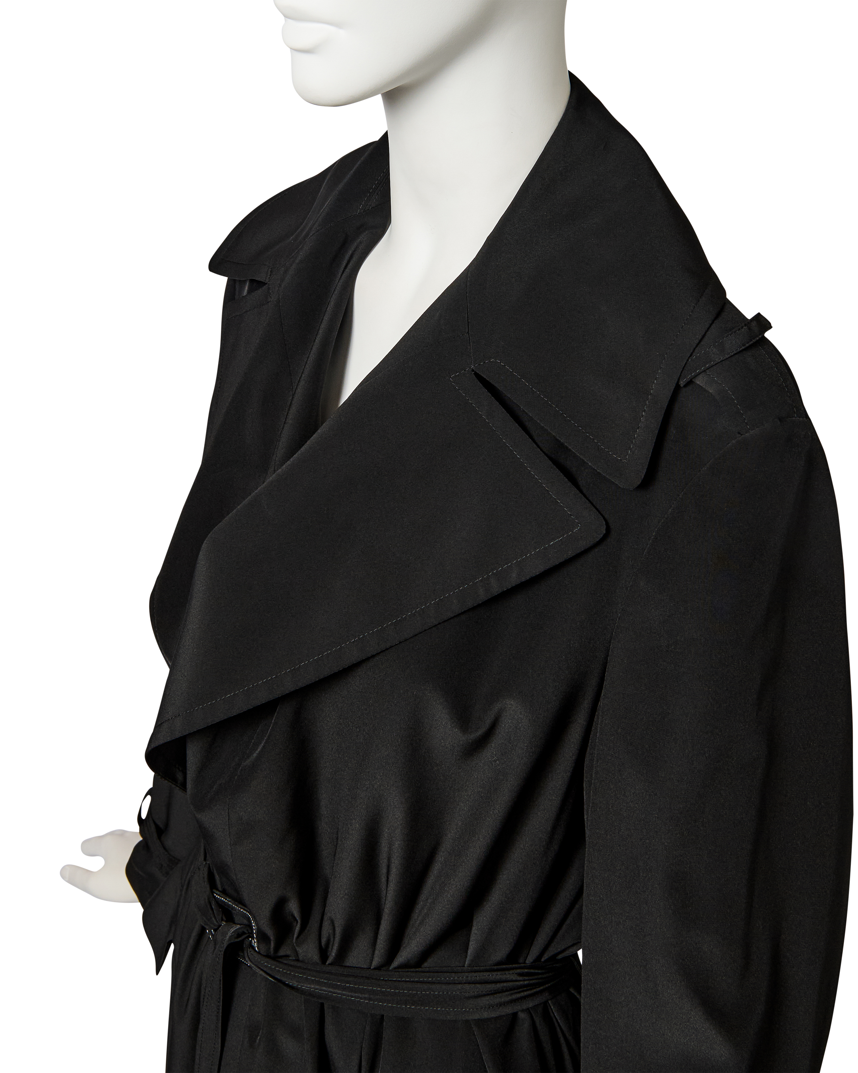 S/S 1996 Yohji Yamamoto black belted trench coat. Midi length oversized trench coat with removable belt, featuring curved center belt buckle that fits adjustable length sizing; adjustable silver-tone loops at wrist allow for adjustments in silhouette when worn. Functional side flap pockets. Fabric Contents: 100% Polyester (feels like Silk). As seen on the runway on Amber Valletta. In excellent vintage condition with no flaws to note.