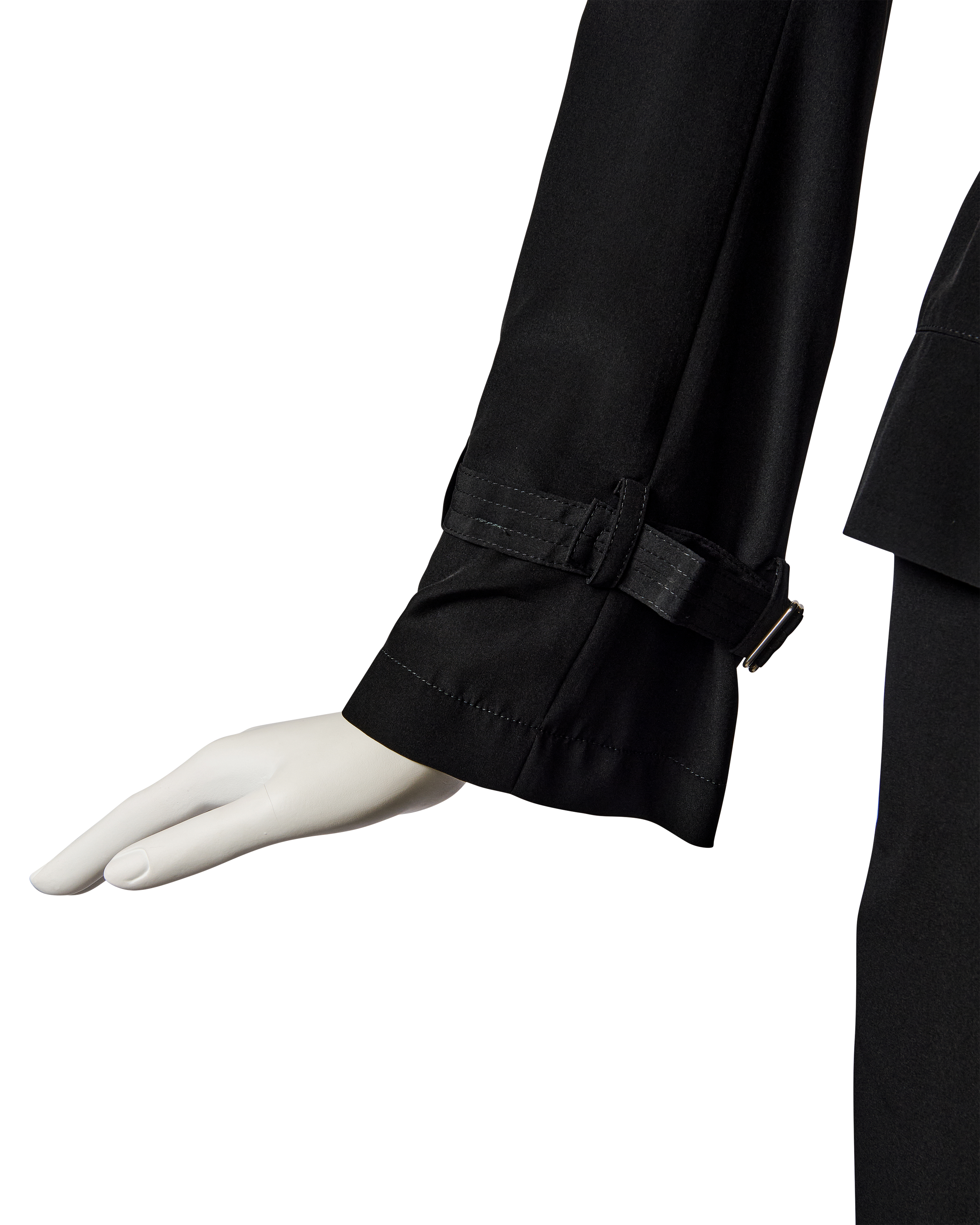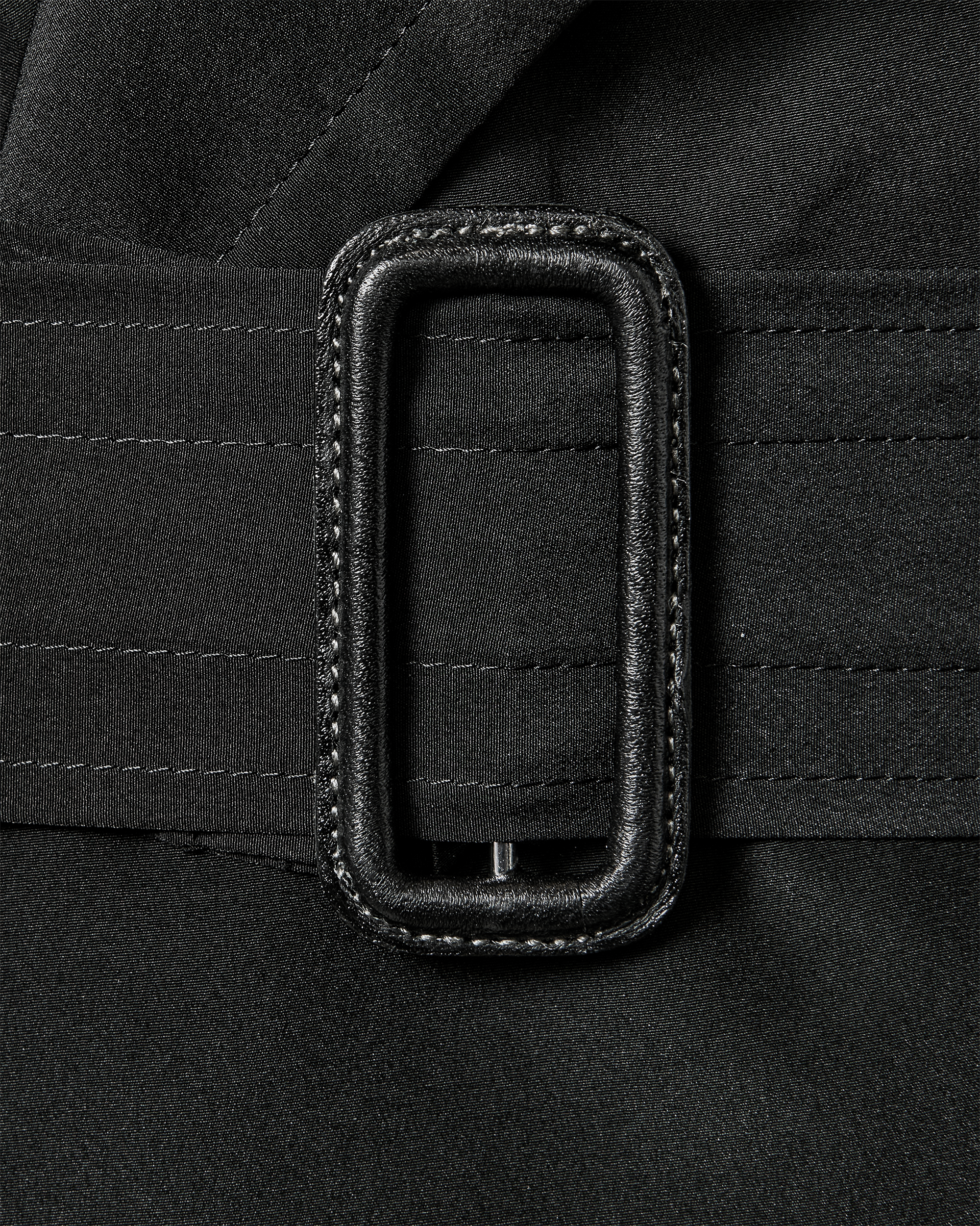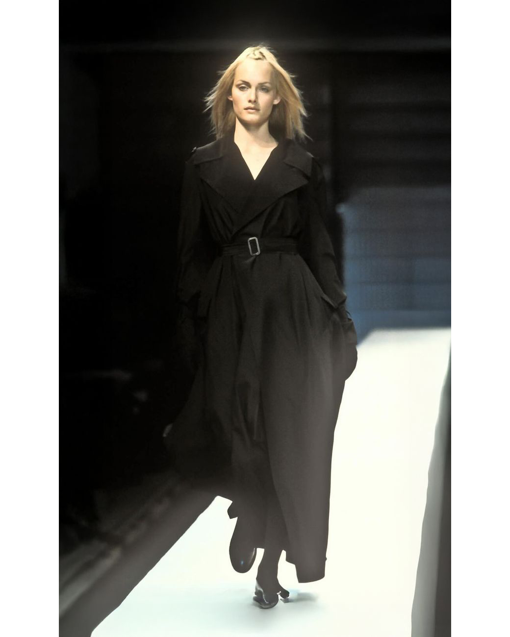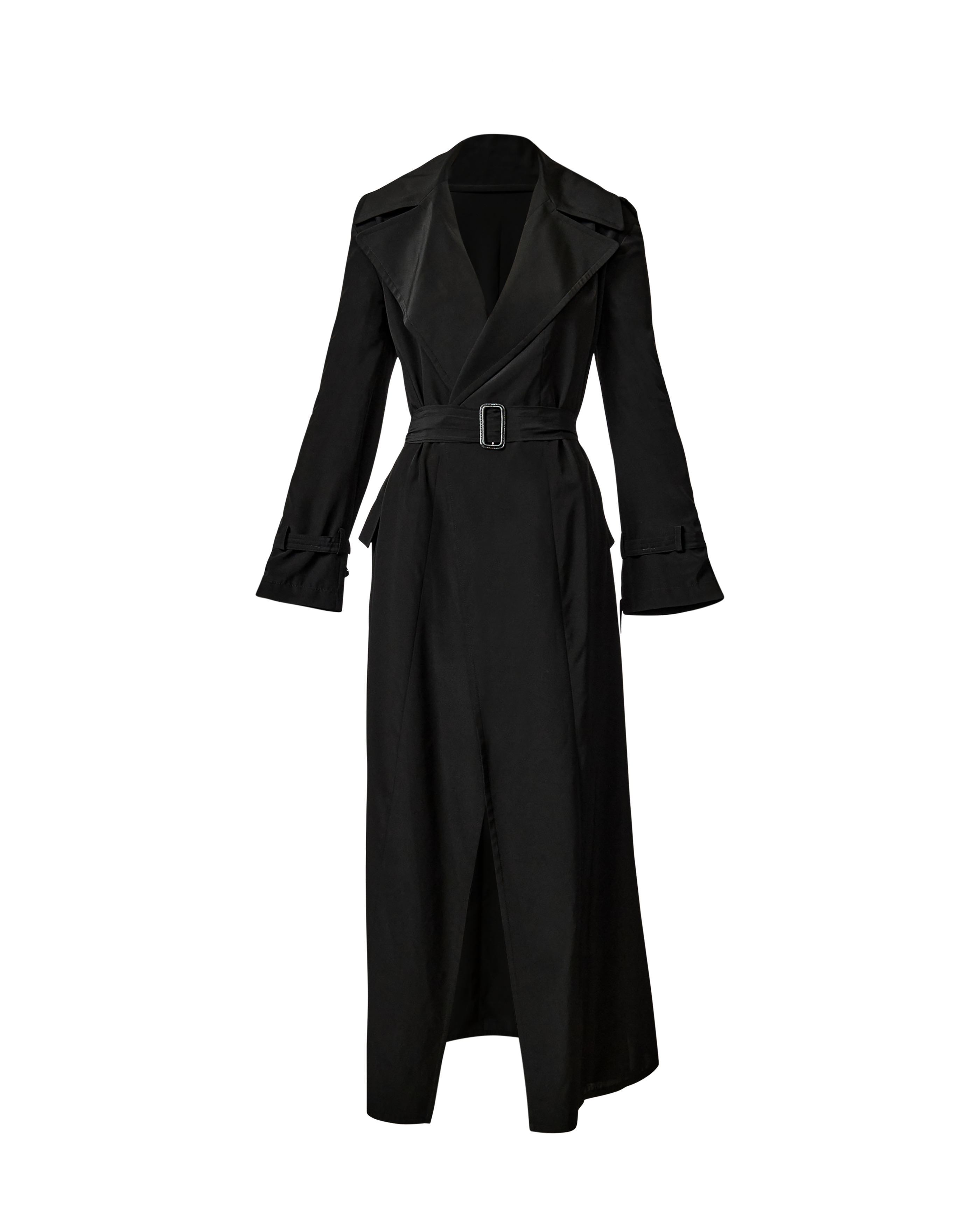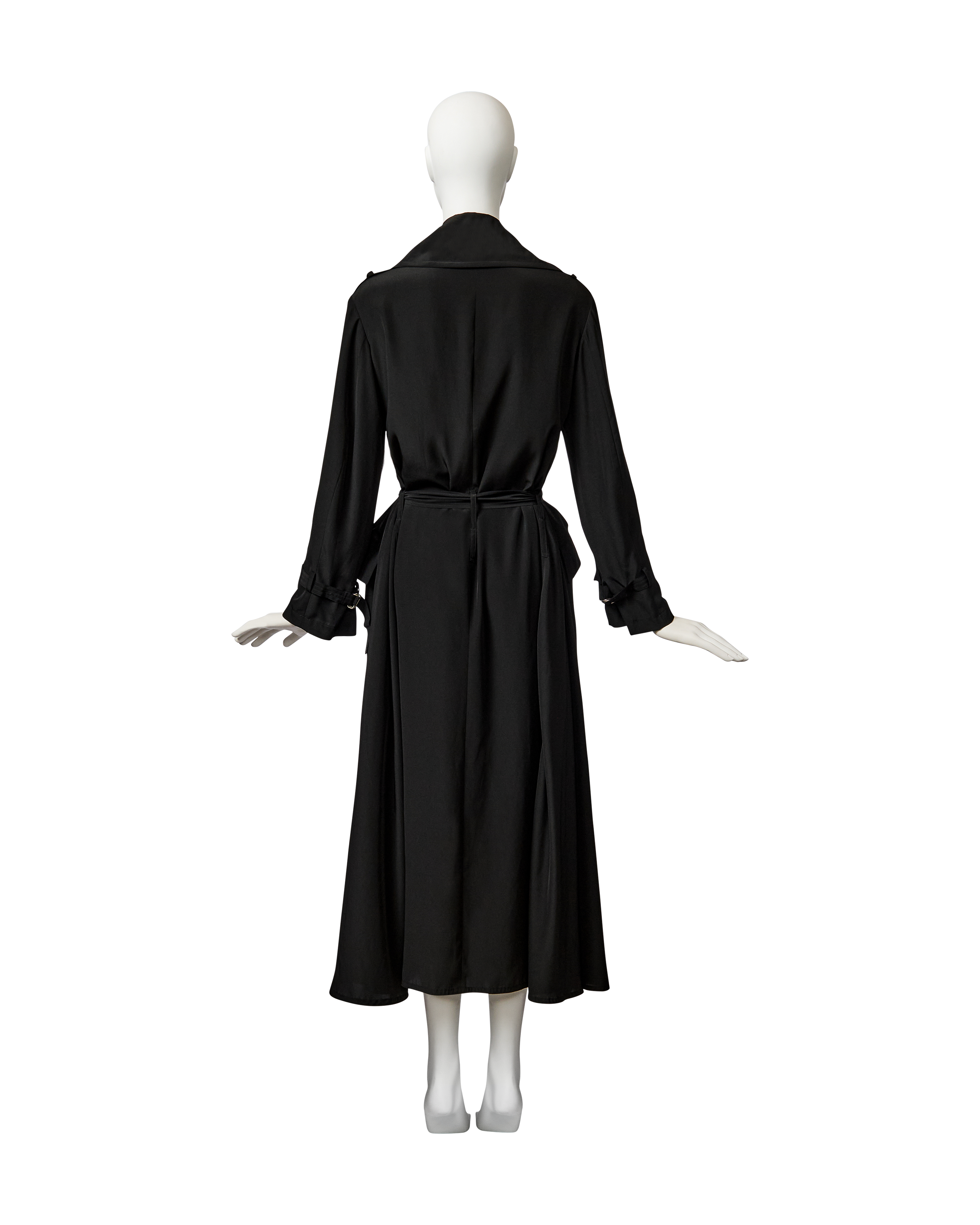 S/S 1996 Yohji Yamamoto black belted trench coat. Midi length oversized trench coat with removable belt, featuring curved center belt buckle that fits adjustable length sizing; adjustable silver-tone loops at wrist allow for adjustments in silhouette when worn. Functional side flap pockets. Fabric Contents: 100% Polyester (feels like Silk). As seen on the runway on Amber Valletta. In excellent vintage condition with no flaws to note.