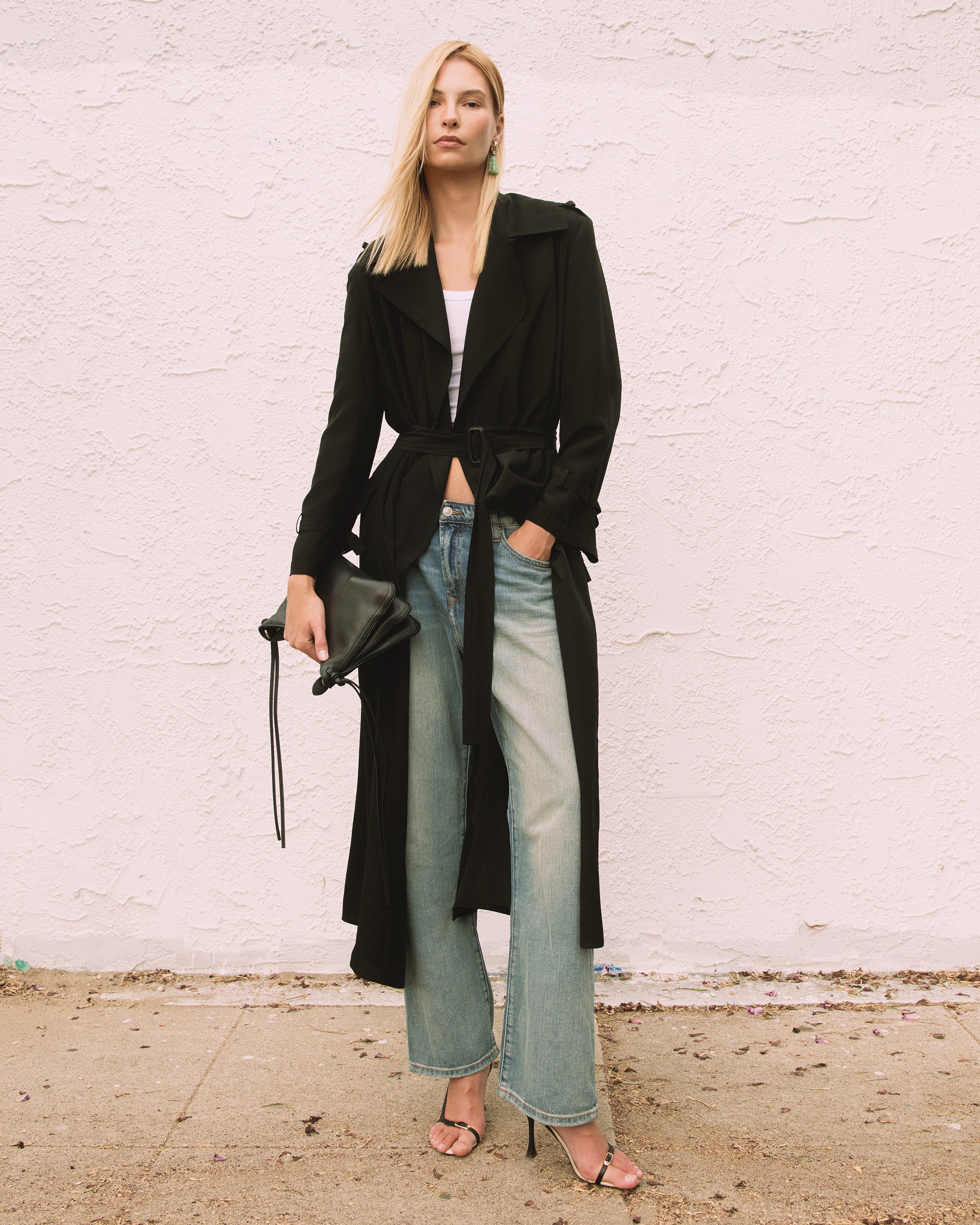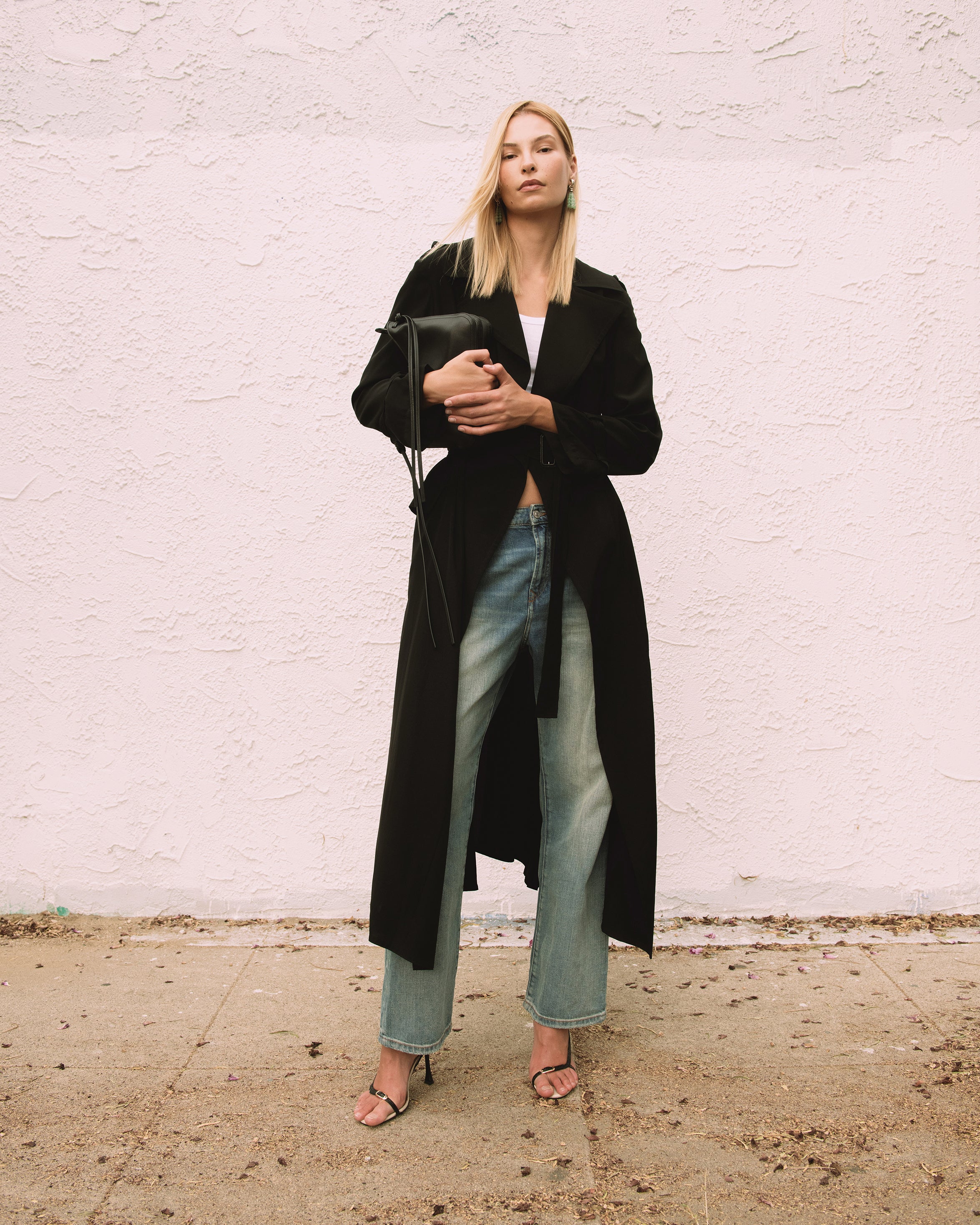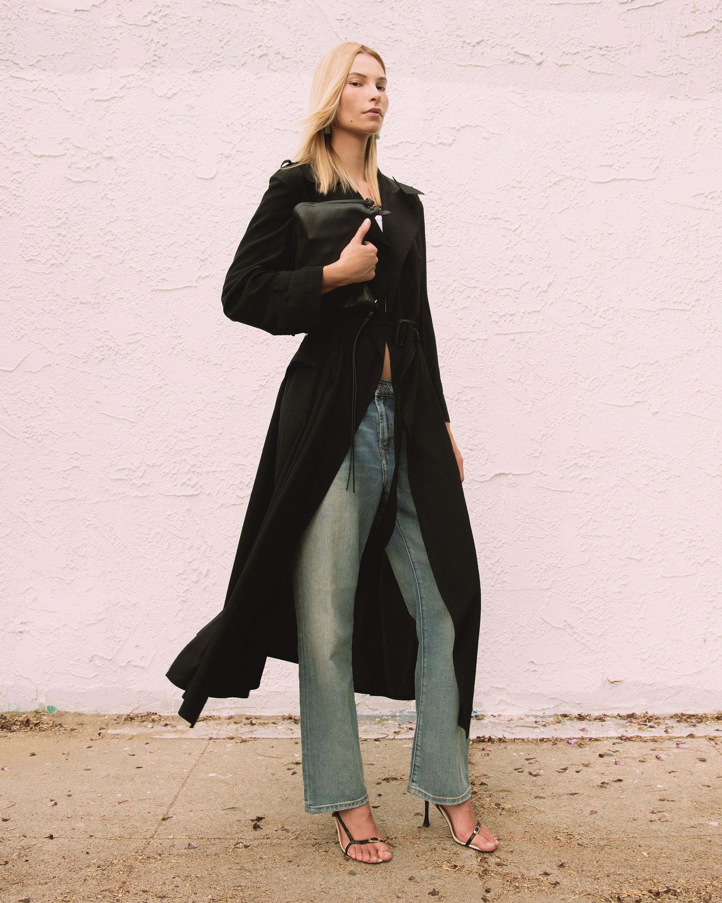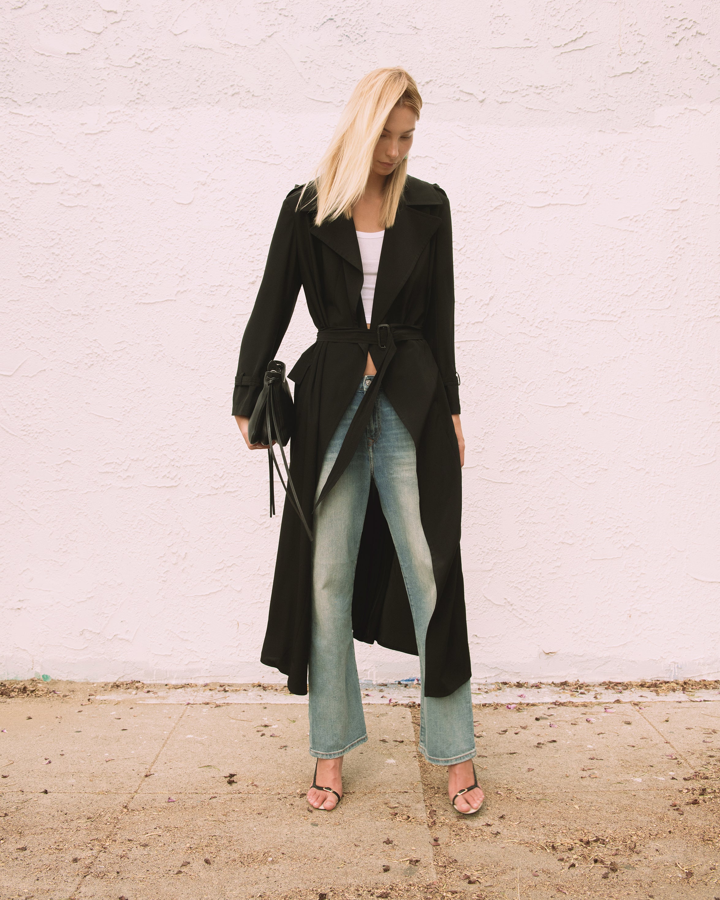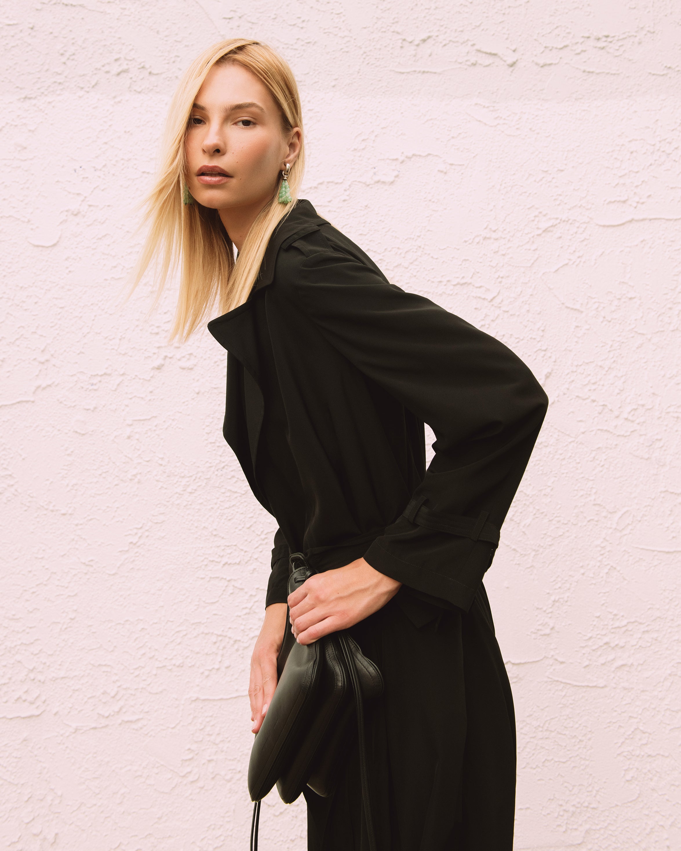 S/S 1996 Yohji Yamamoto black belted trench coat. Midi length oversized trench coat with removable belt, featuring curved center belt buckle that fits adjustable length sizing; adjustable silver-tone loops at wrist allow for adjustments in silhouette when worn. Functional side flap pockets. Fabric Contents: 100% Polyester (feels like Silk). As seen on the runway on Amber Valletta. In excellent vintage condition with no flaws to note.