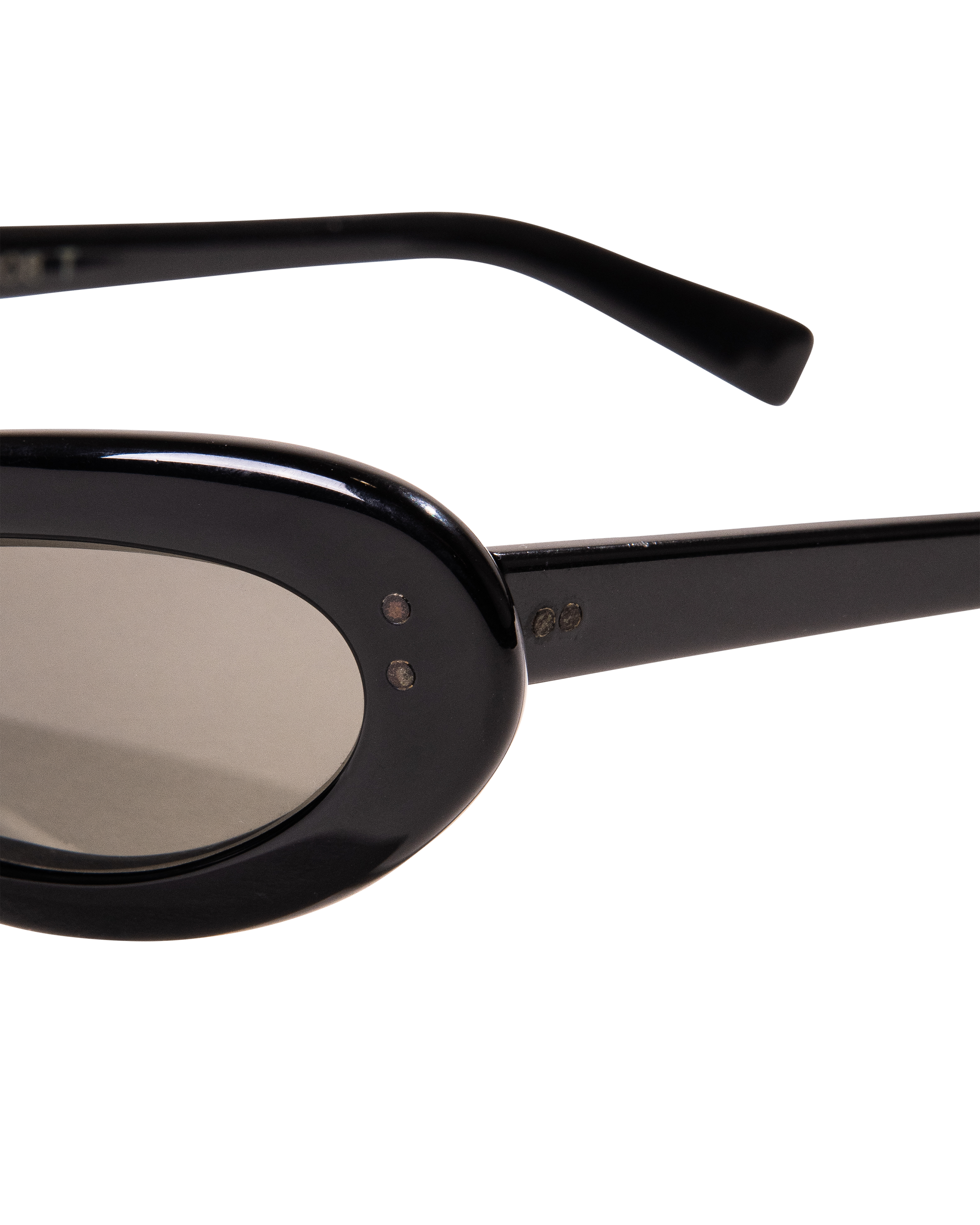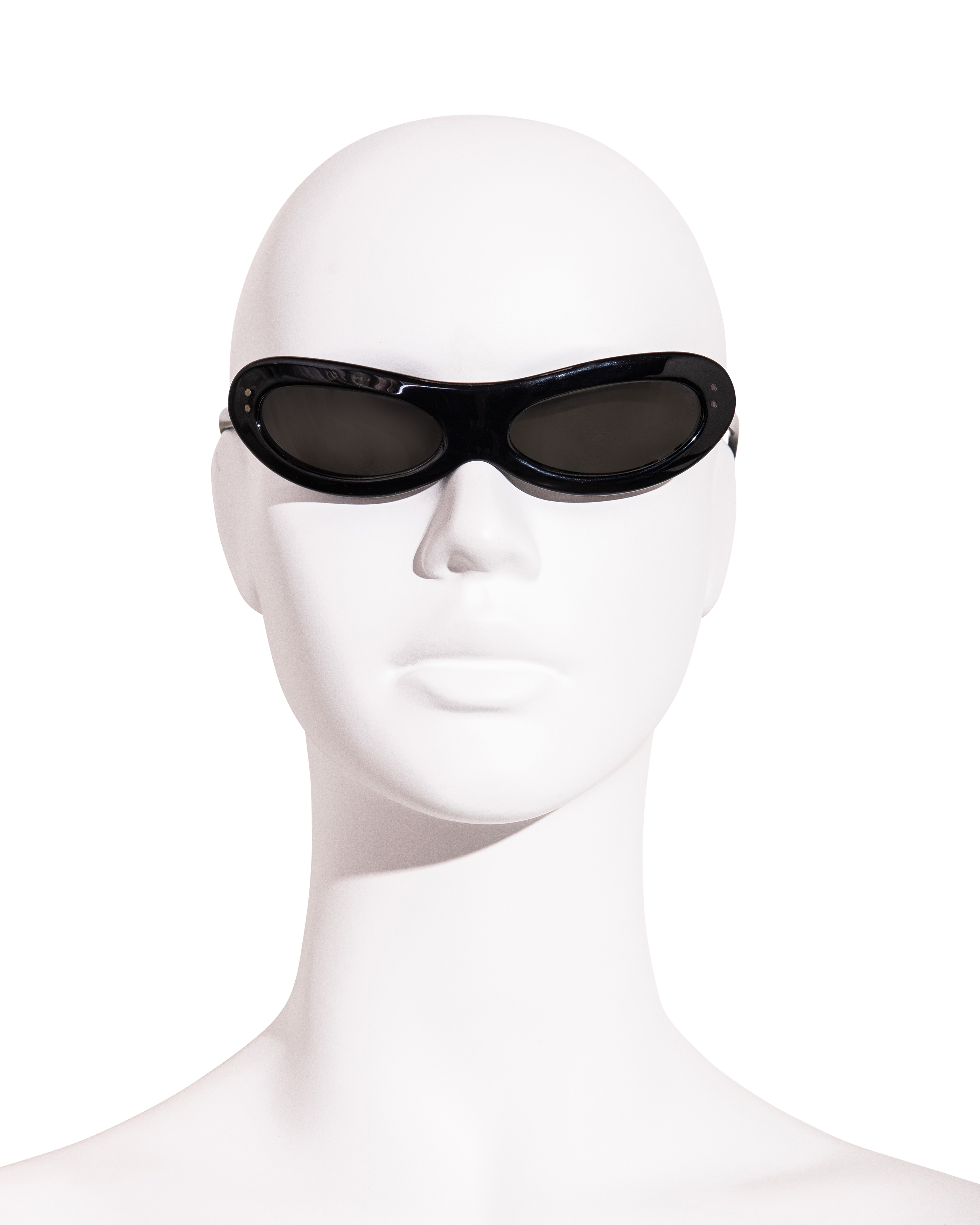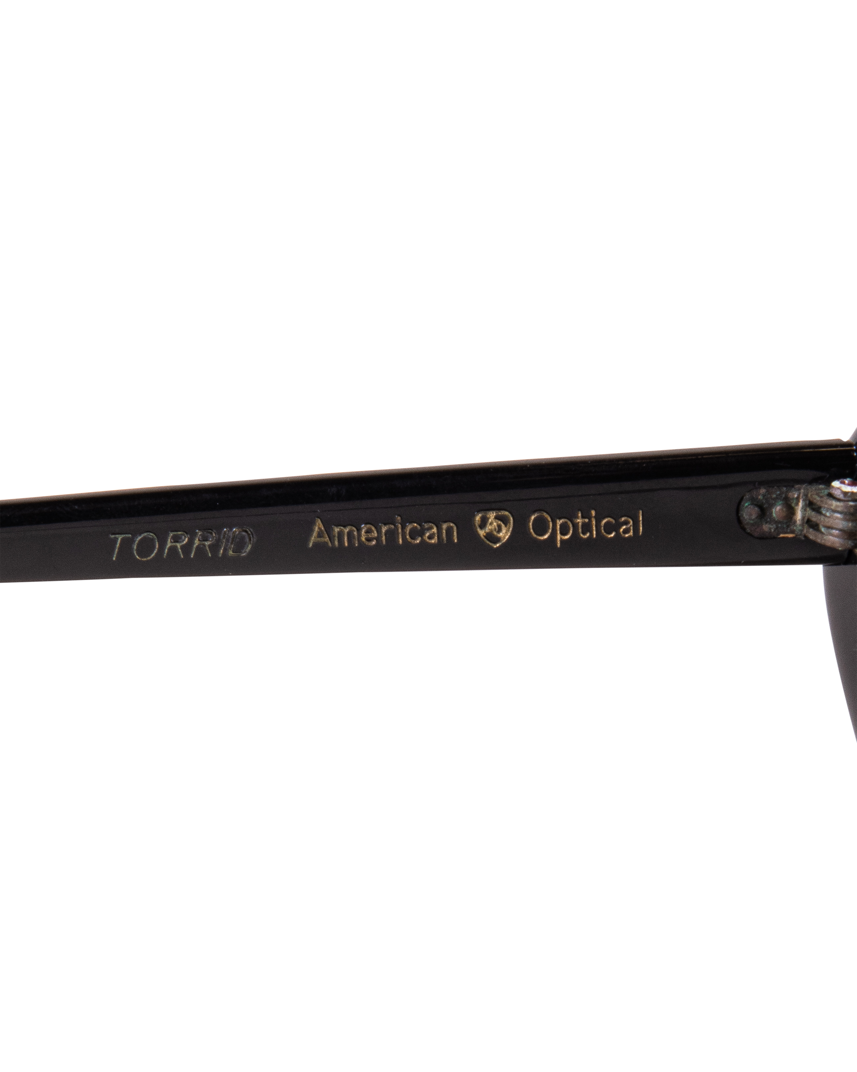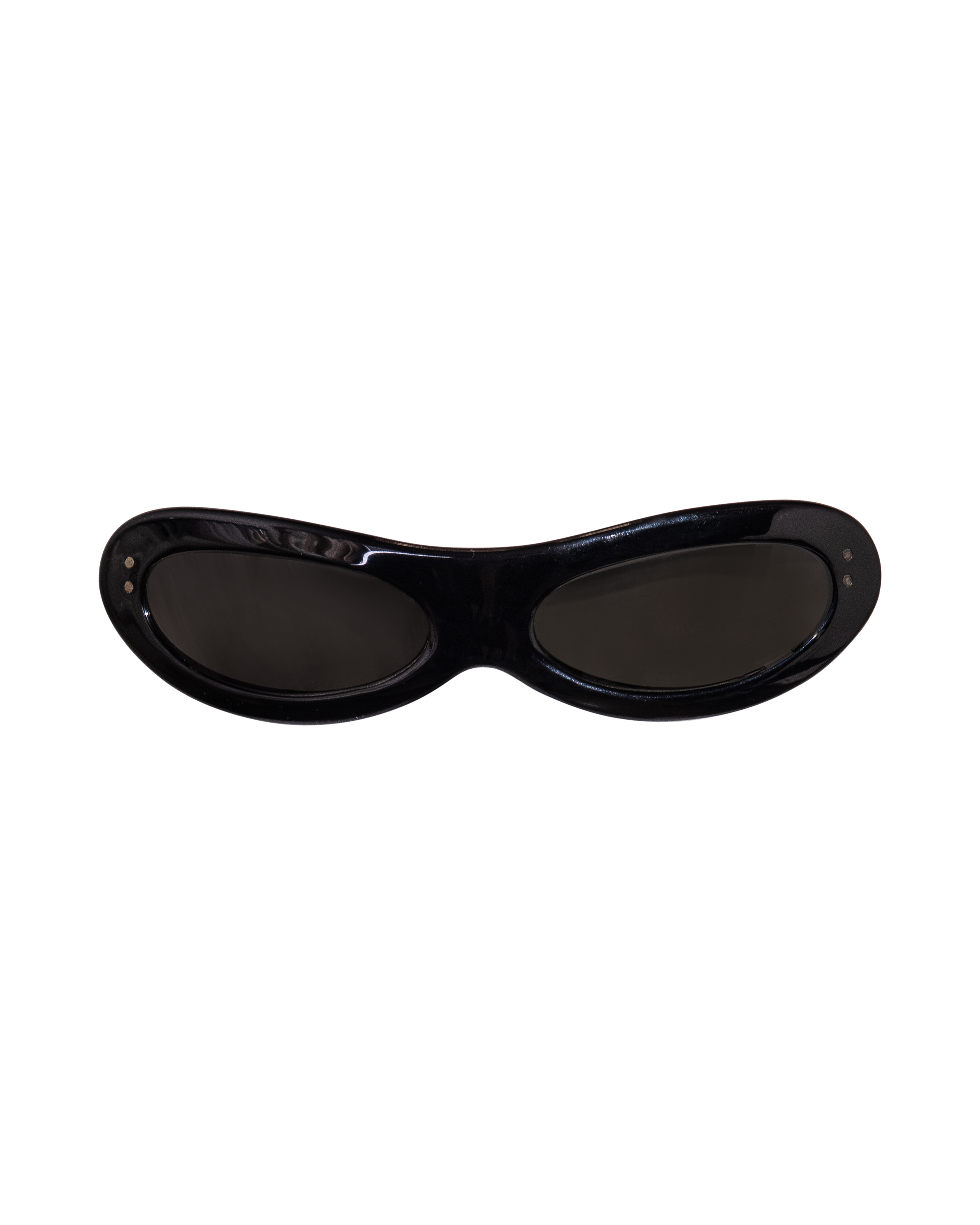 1960's Special Vintage American Optical Mid-Century black curved sunglasses. Narrow black sunglasses with two dot detail at side of lenses. In very good vintage condition with light wear throughout.