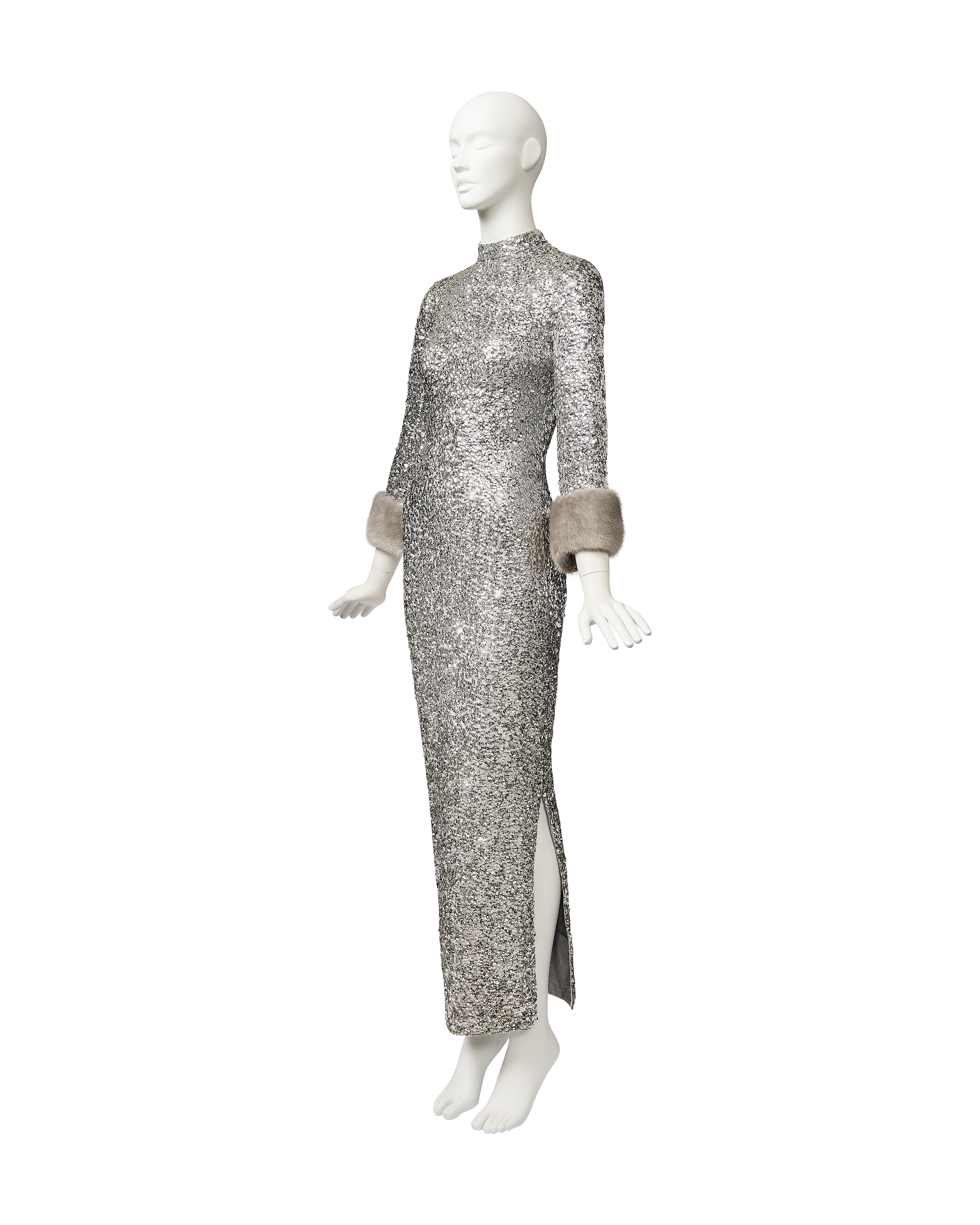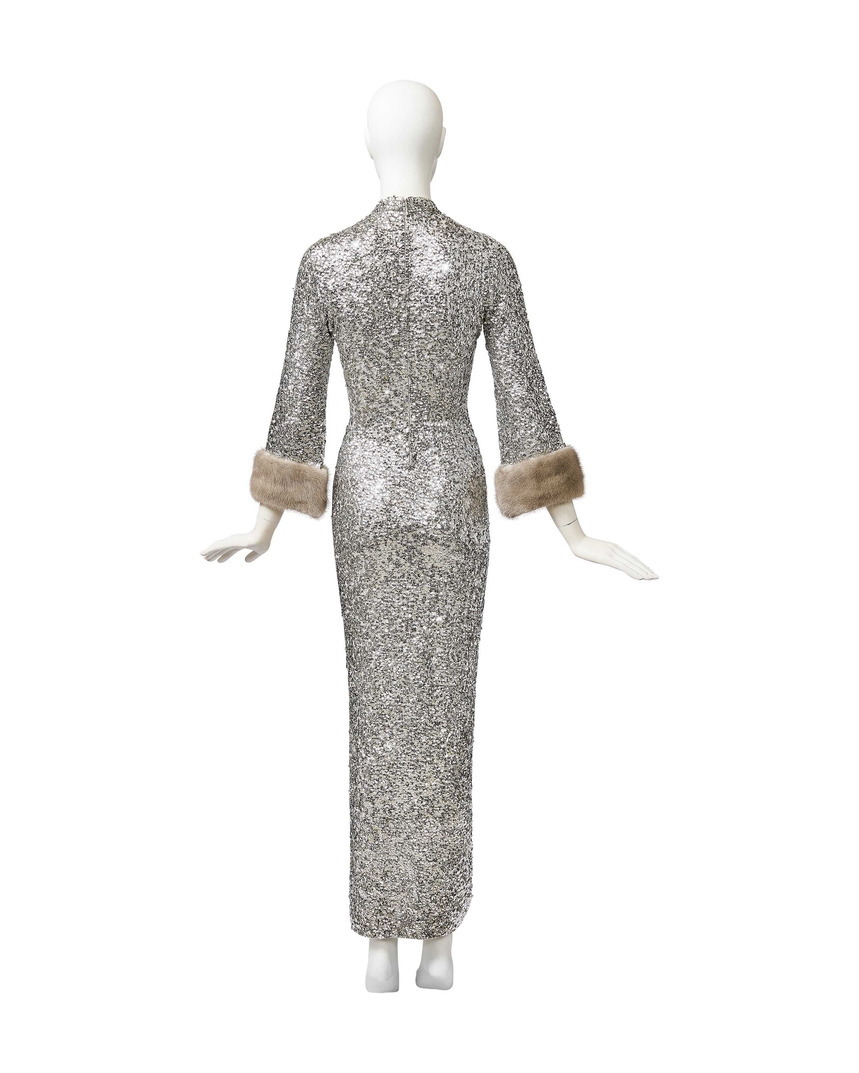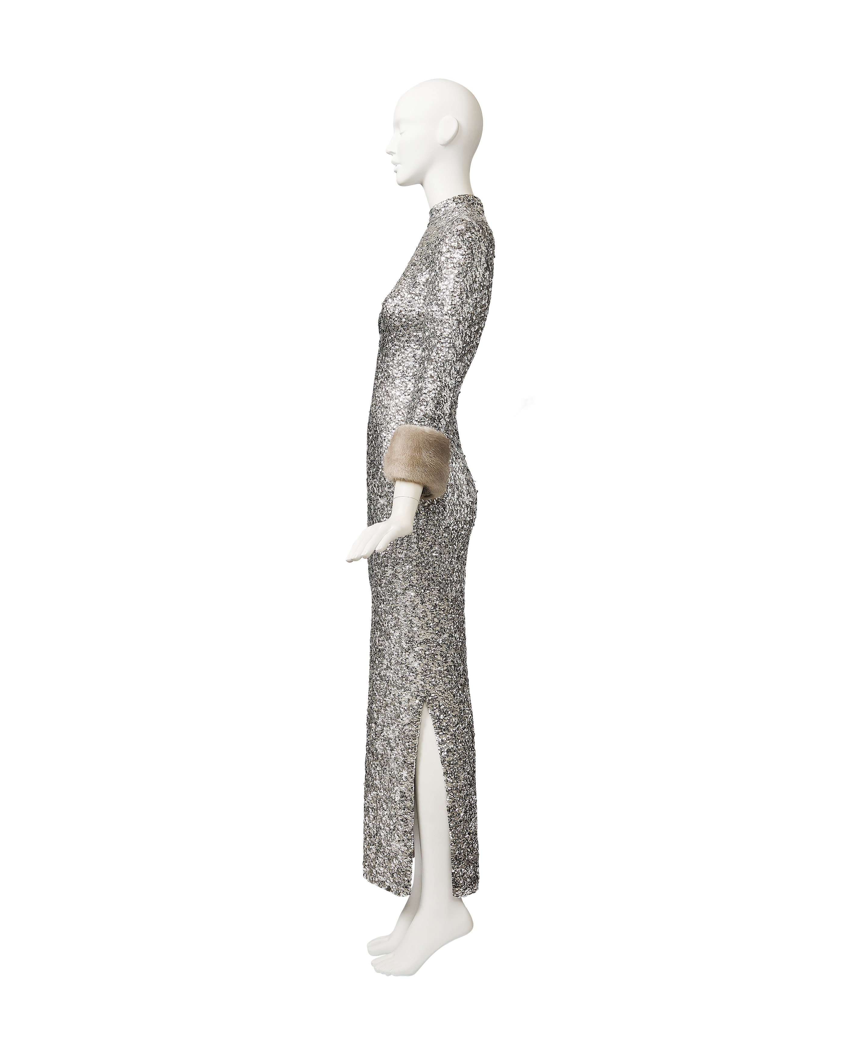 1960's Silver Sequin Knit Gown with Mink Cuffs