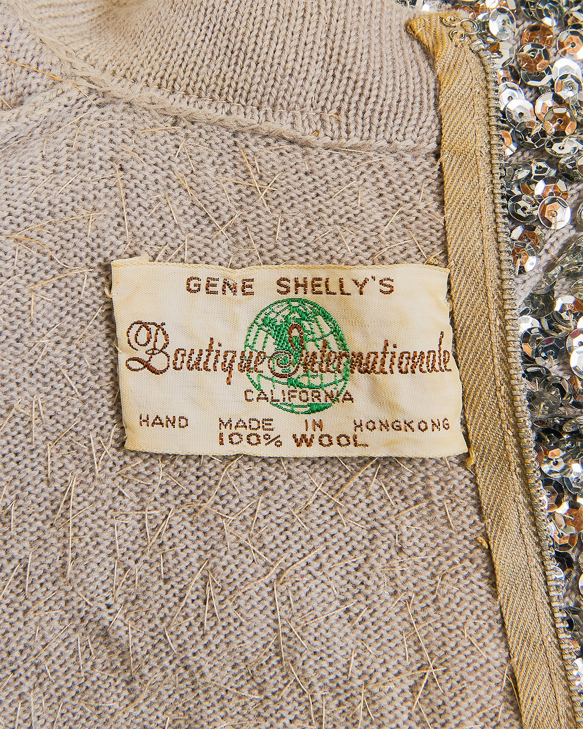 1960's Gene Shelly silver sequin knit gown with mink cuffs. Mock neck stretch knit three-quarter sleeve gown with silver-tone metallic sequin embellishments throughout, featuring brown mink fur cuffs. Fabric Contents: 100% Wool (stretch wool knit). Back zip closure and slight side slit. In excellent vintage condition with extremely light wear throughout (very faint spotting at interior; has been taken to couture cleaner and arrives ready to wear).