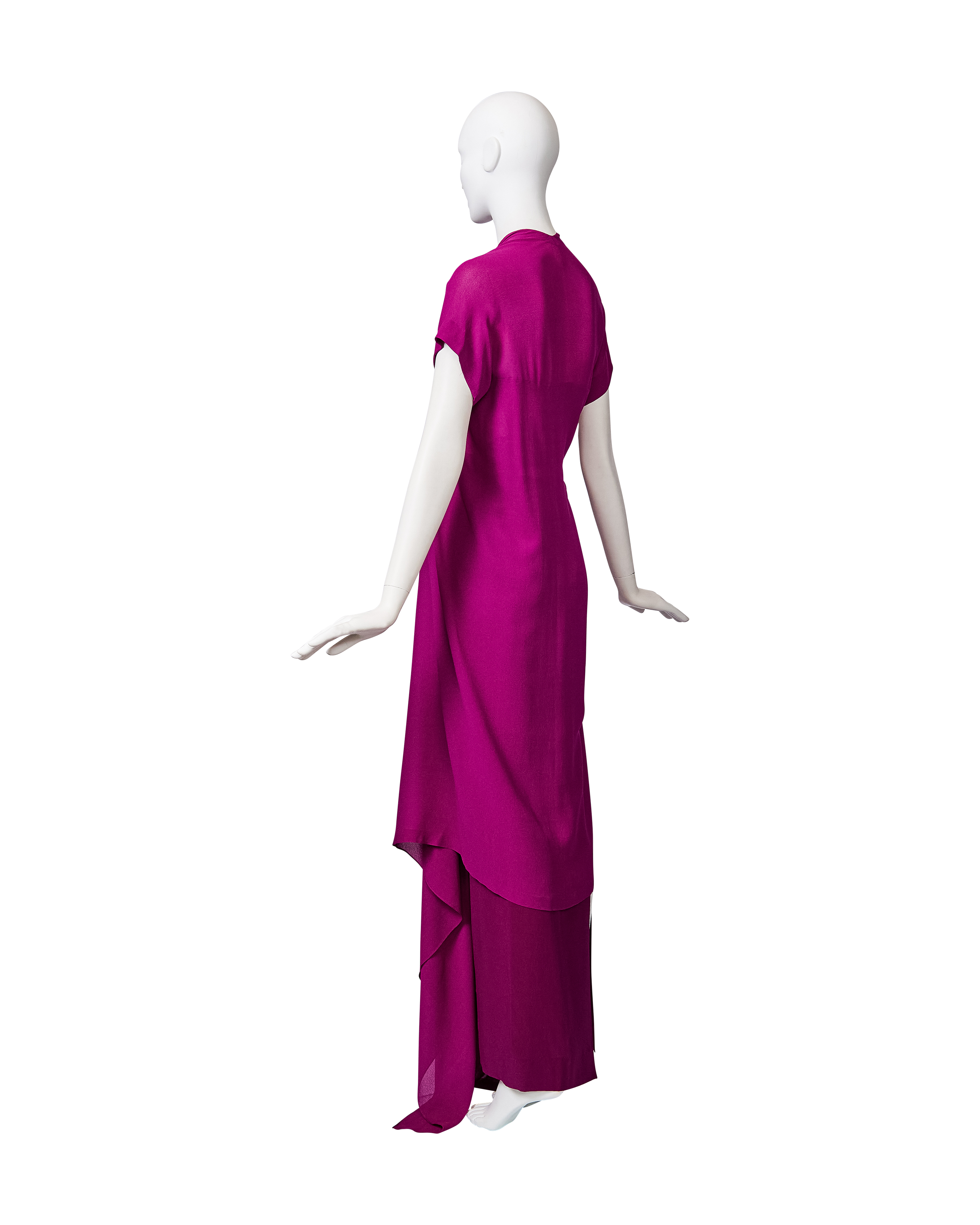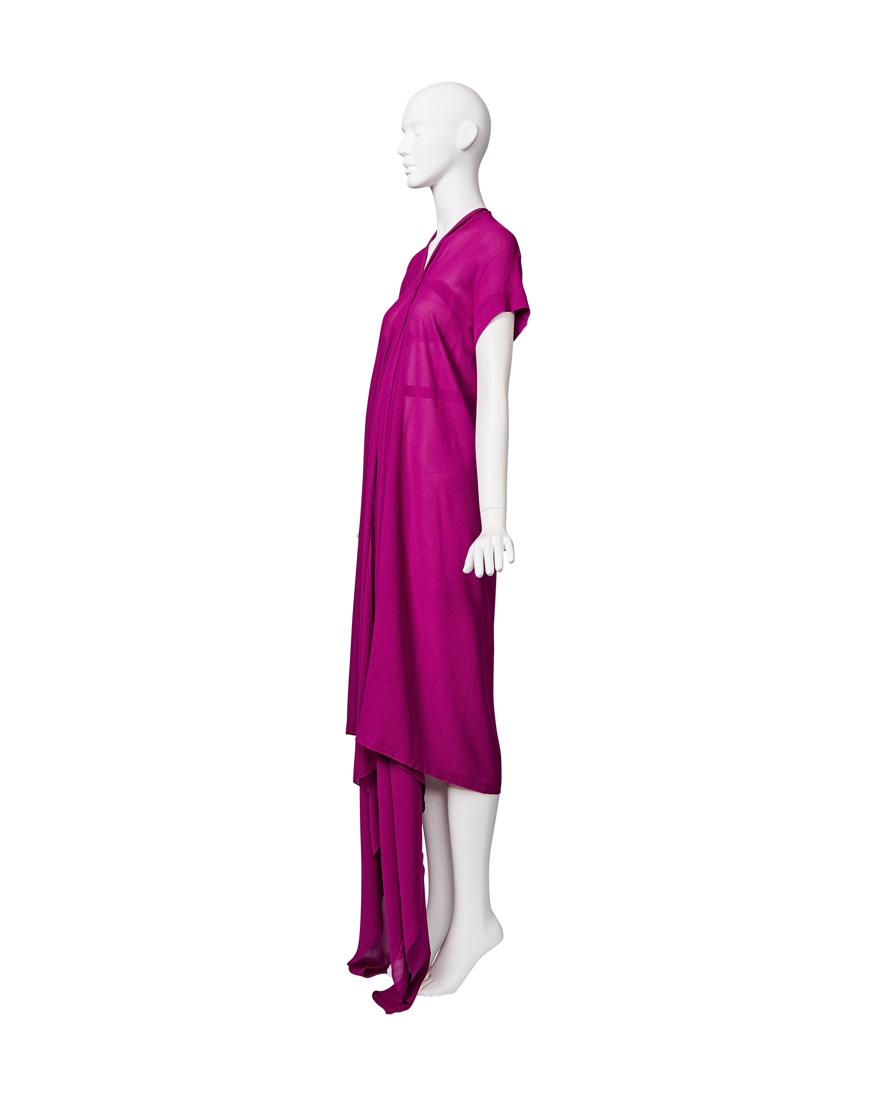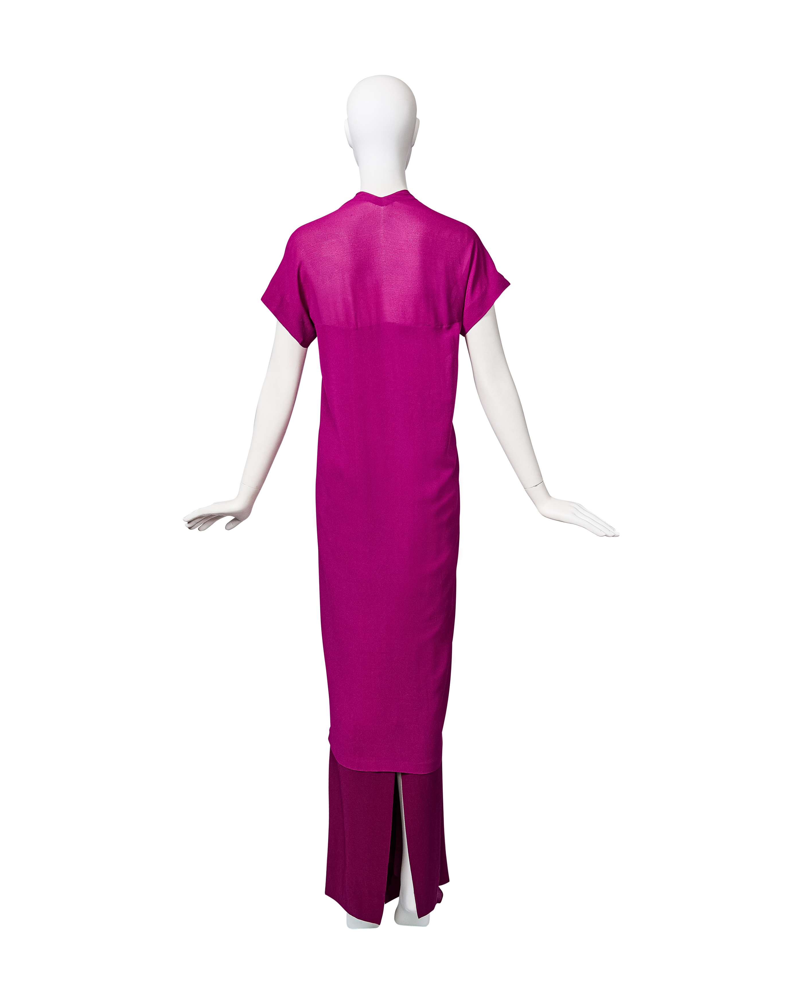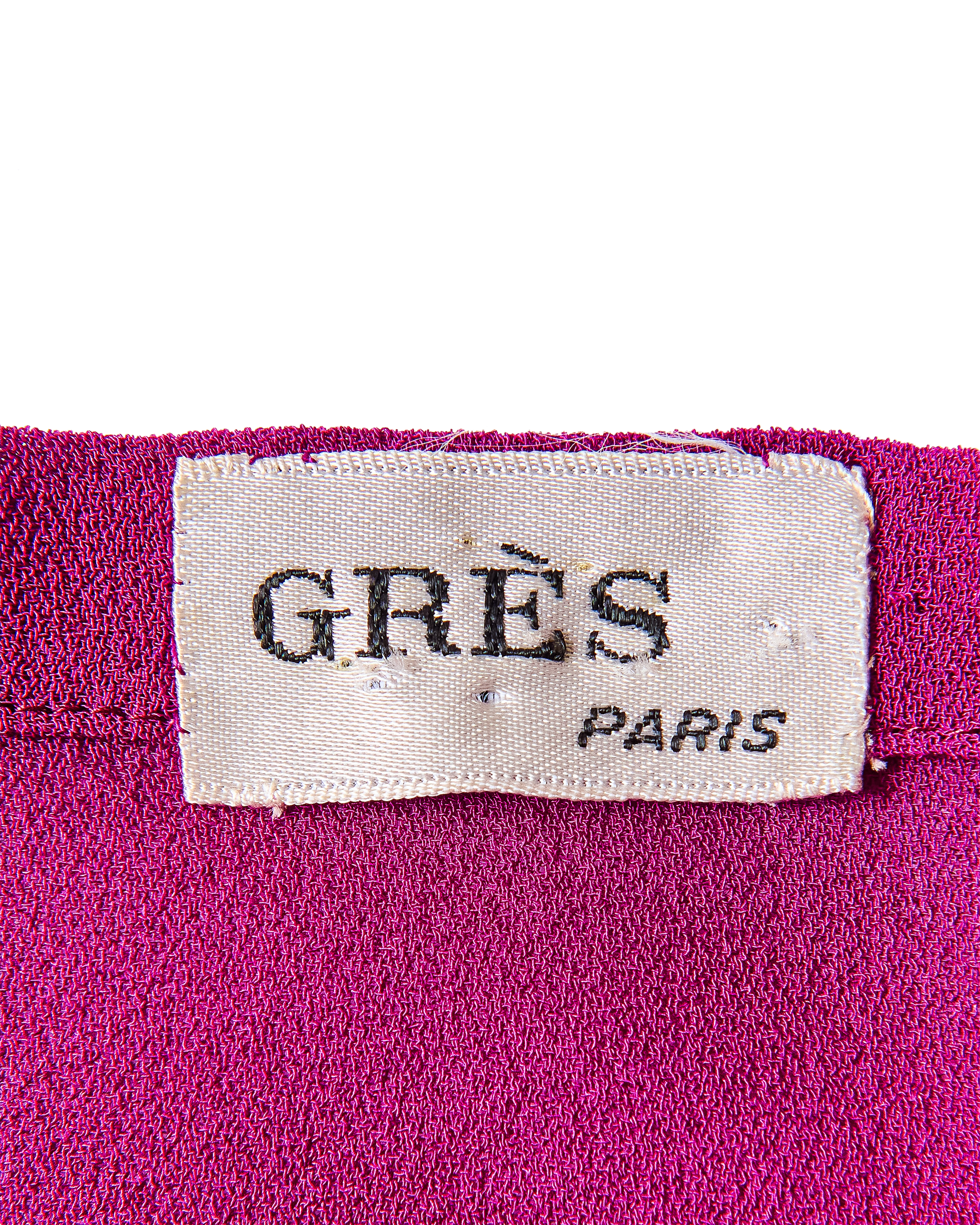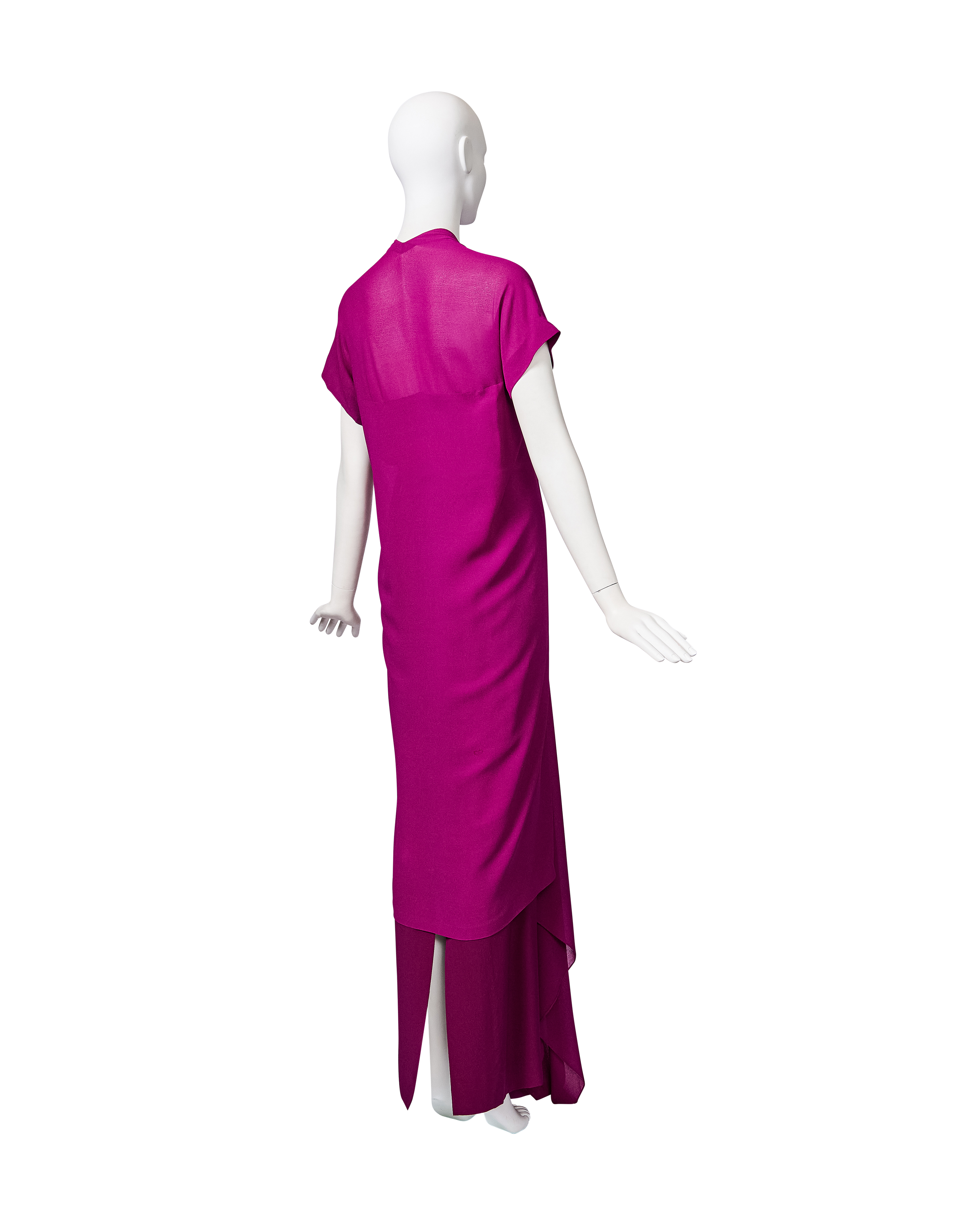 1970's Madame Grès magenta crepe draped top / dress and skirt ensemble. Two-piece ensemble - first piece is a short sleeve fuchsia/magenta purple semi-sheer v-neck wrap top / dress with center front drape in silk crepe. Features built-in waistbelt and single hook-and-eye closure at bust, creating semi-open long pointed front drape when worn. Second piece is maxi skirt of crepe de chine material with moderate back slit and darting at waist. Skirt is in slightly darker purple colorway, with center back zip closure. Set is overall in very good vintage condition with small spot at back right of dress (faintly visible when worn); has been sent to couture cleaner and arrives ready to wear.
