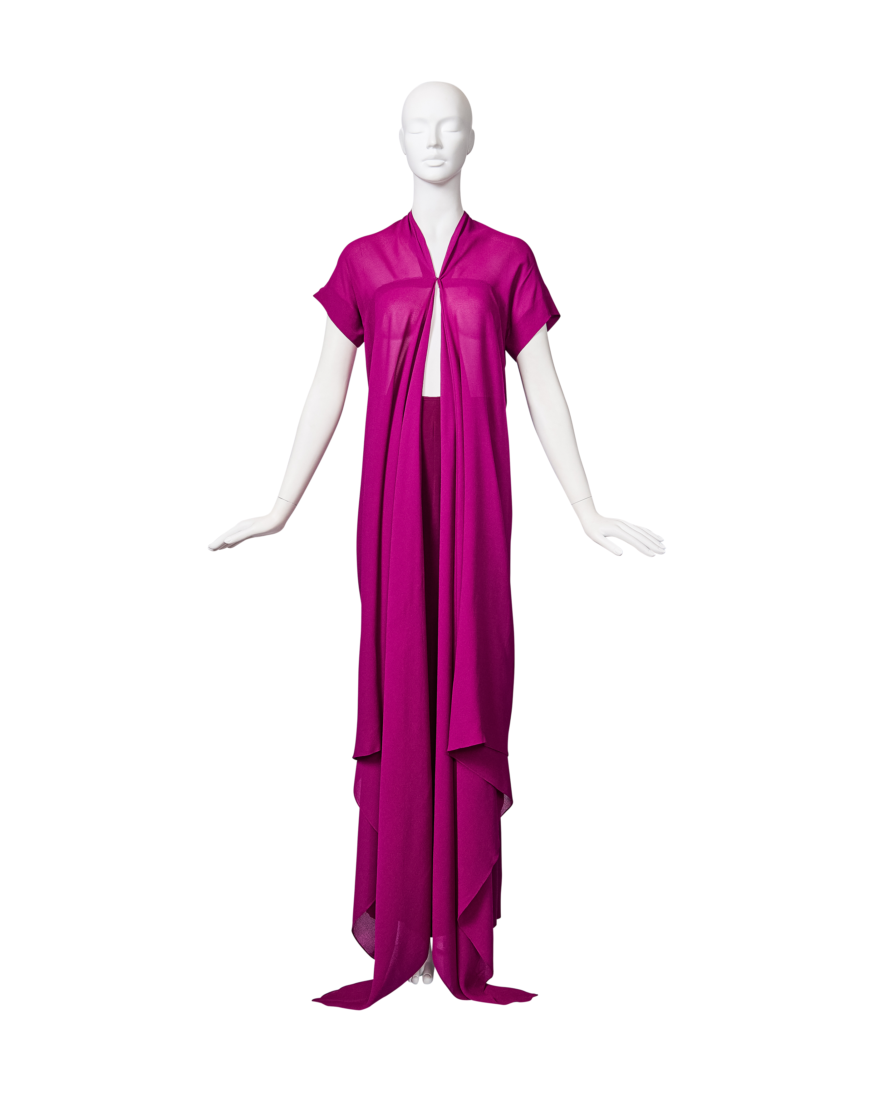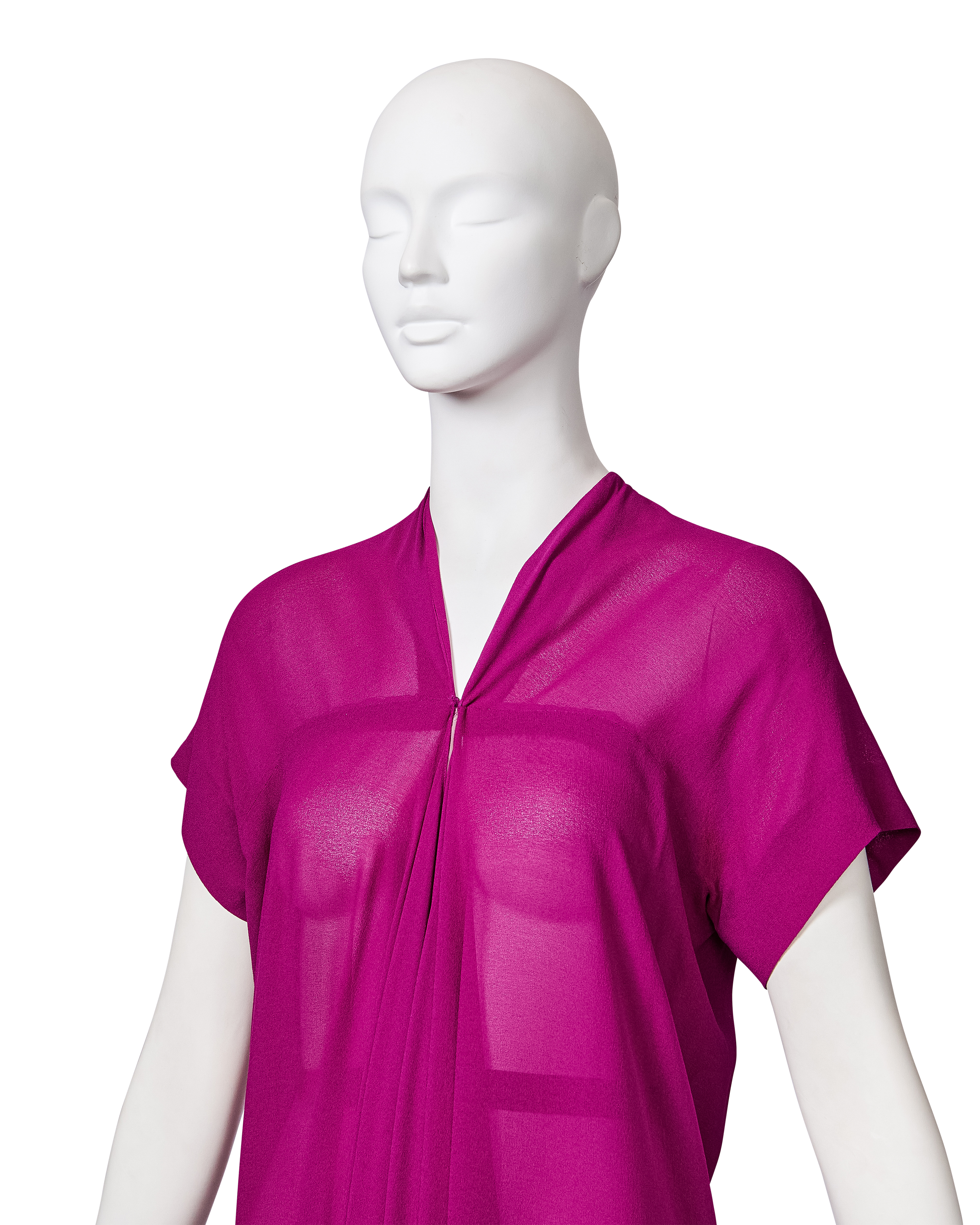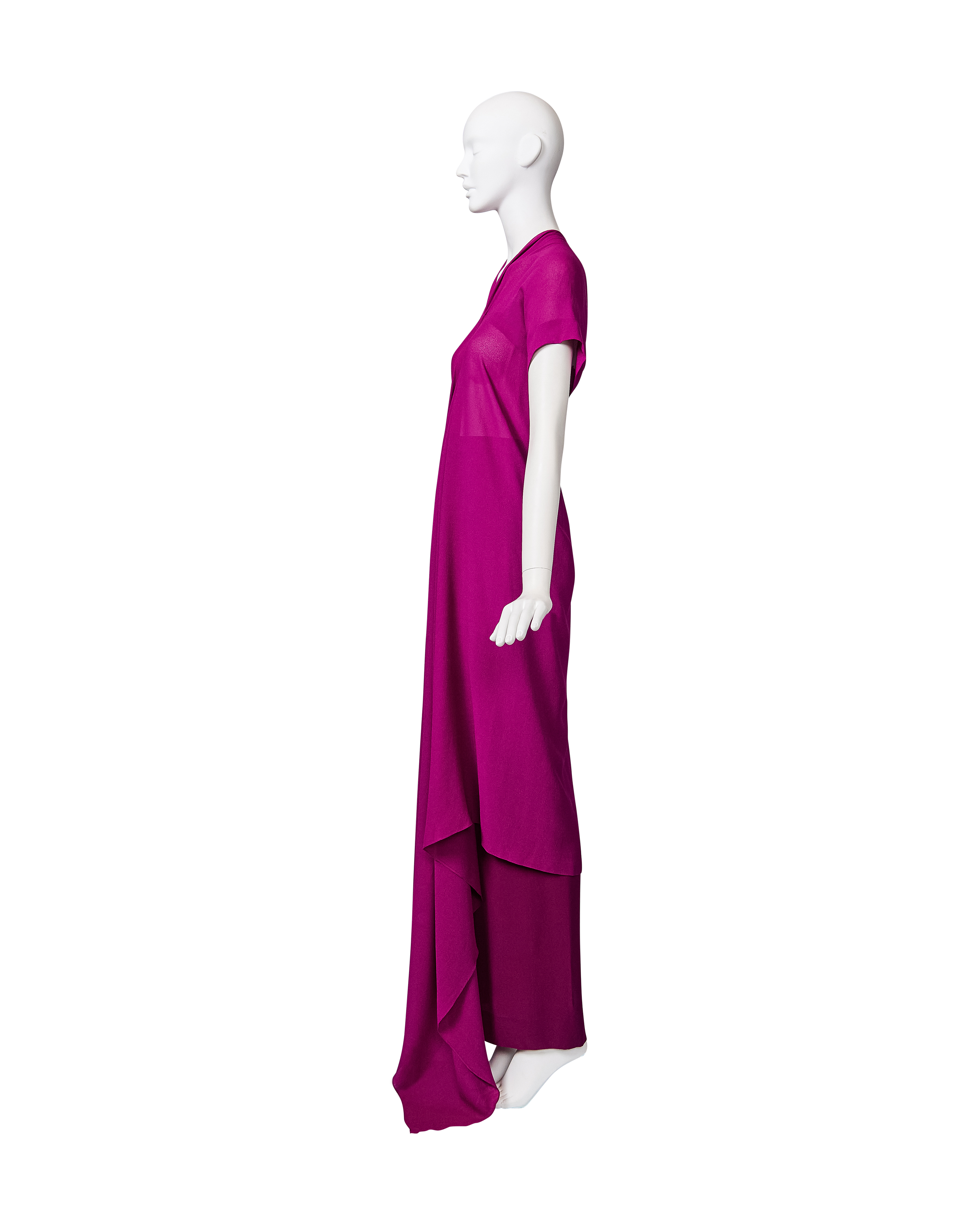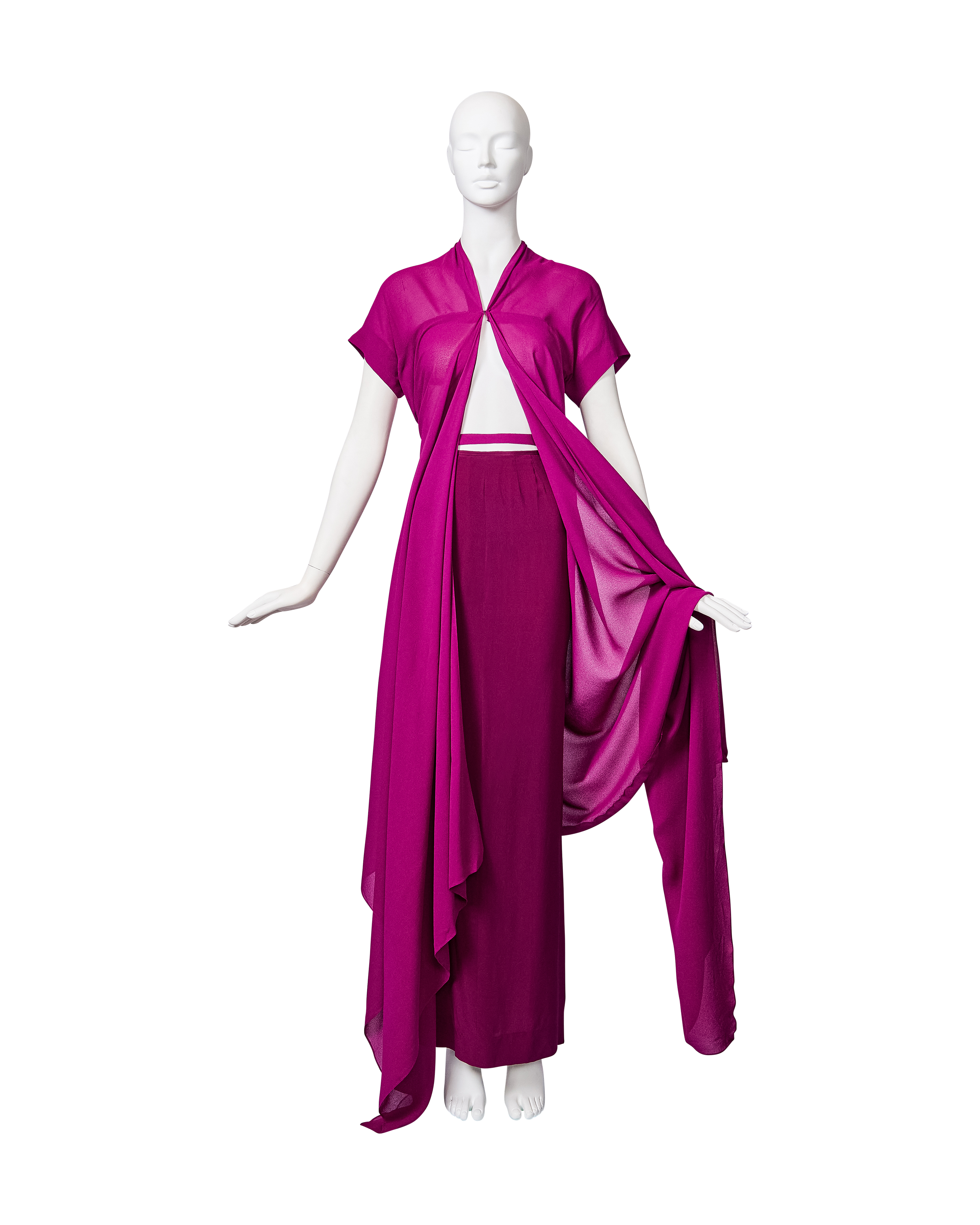 1970's Madame Grès magenta crepe draped top / dress and skirt ensemble. Two-piece ensemble - first piece is a short sleeve fuchsia/magenta purple semi-sheer v-neck wrap top / dress with center front drape in silk crepe. Features built-in waistbelt and single hook-and-eye closure at bust, creating semi-open long pointed front drape when worn. Second piece is maxi skirt of crepe de chine material with moderate back slit and darting at waist. Skirt is in slightly darker purple colorway, with center back zip closure. Set is overall in very good vintage condition with small spot at back right of dress (faintly visible when worn); has been sent to couture cleaner and arrives ready to wear.