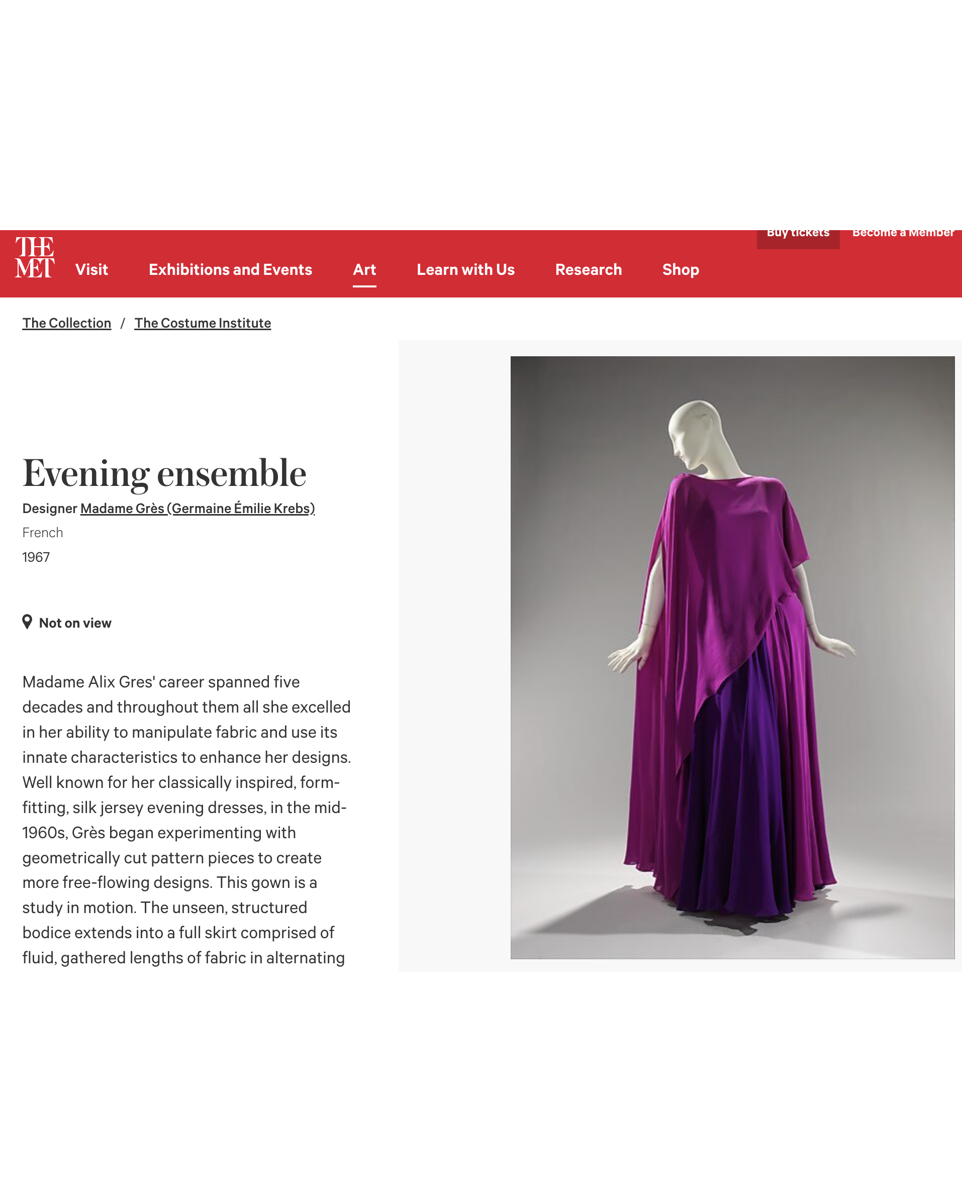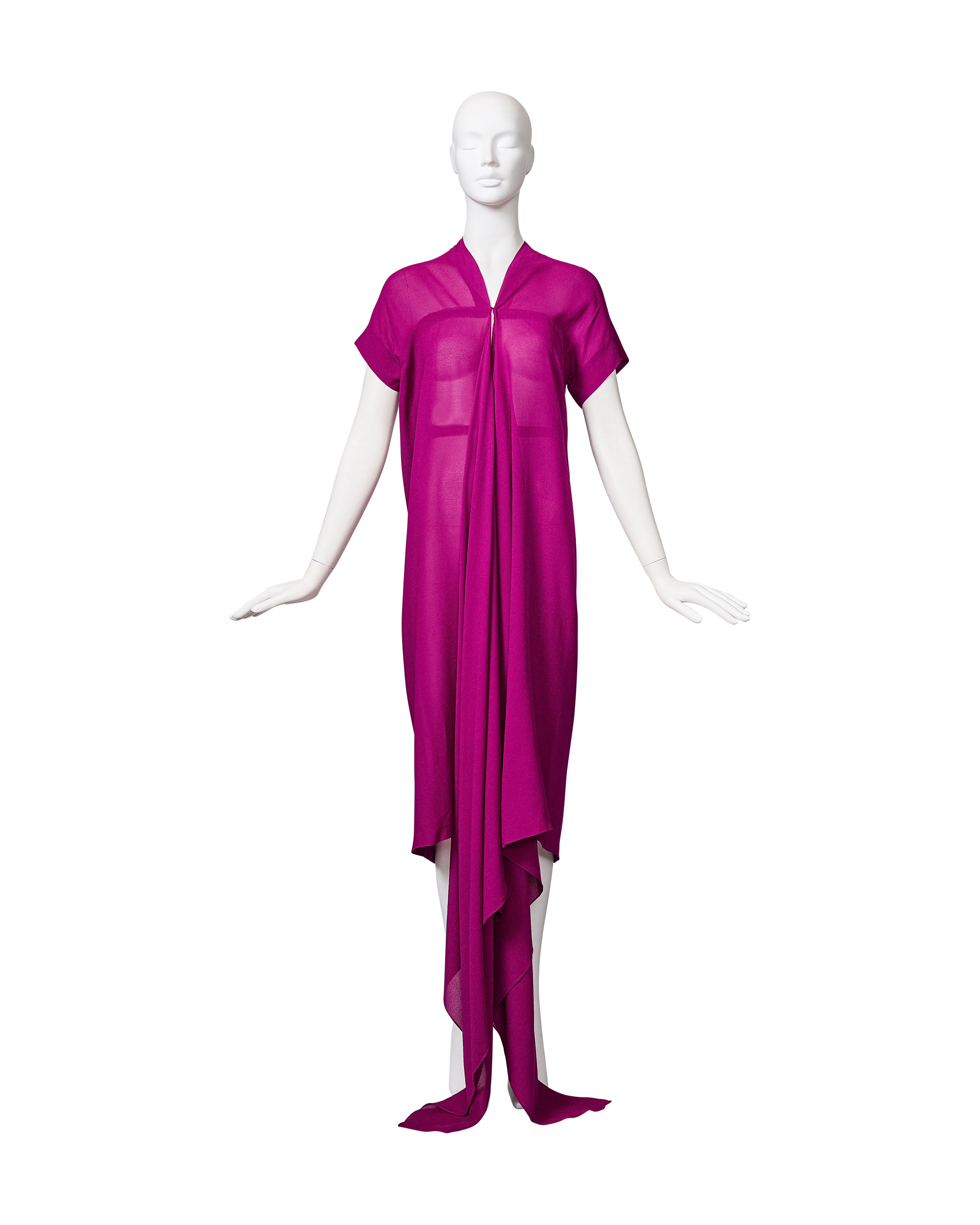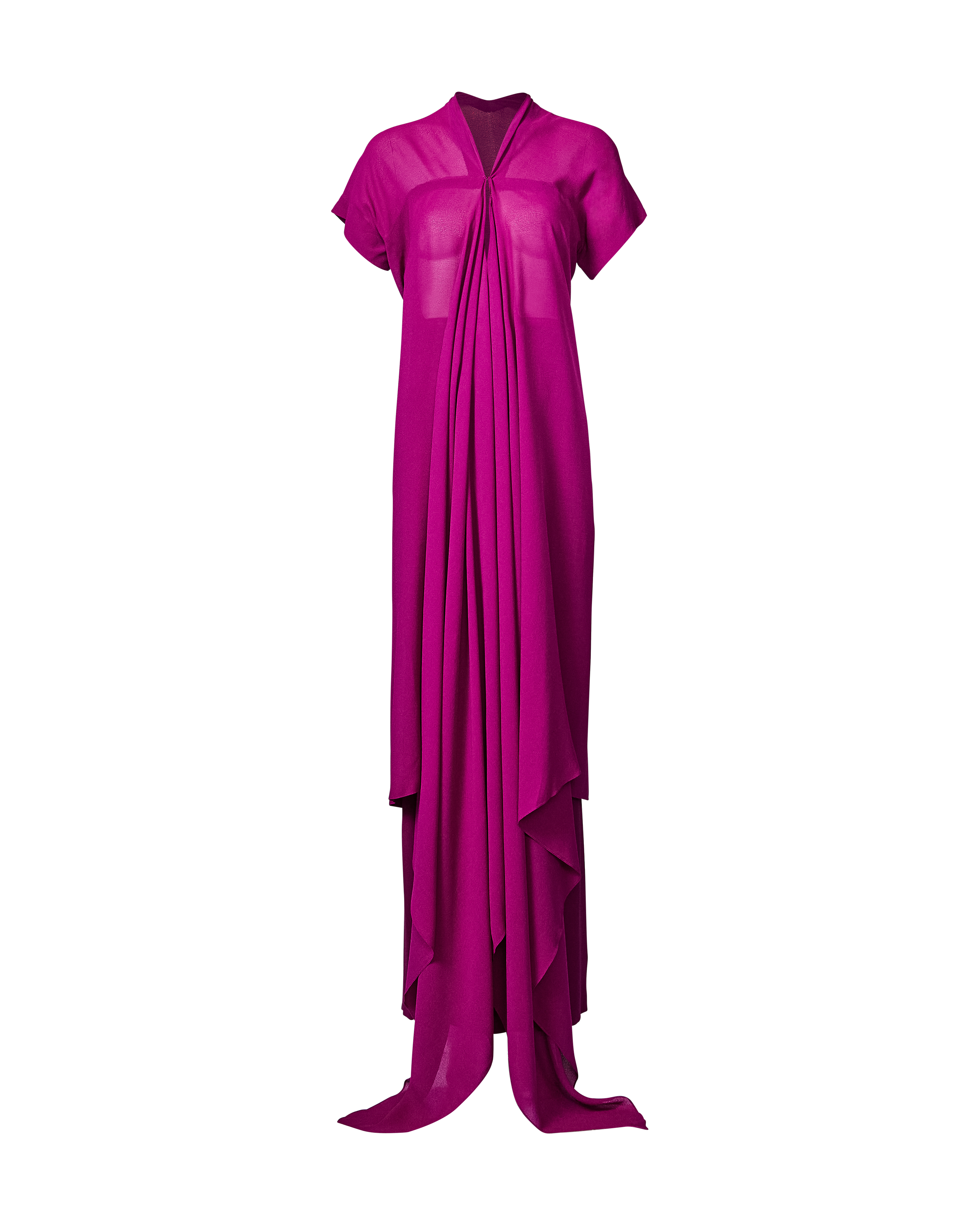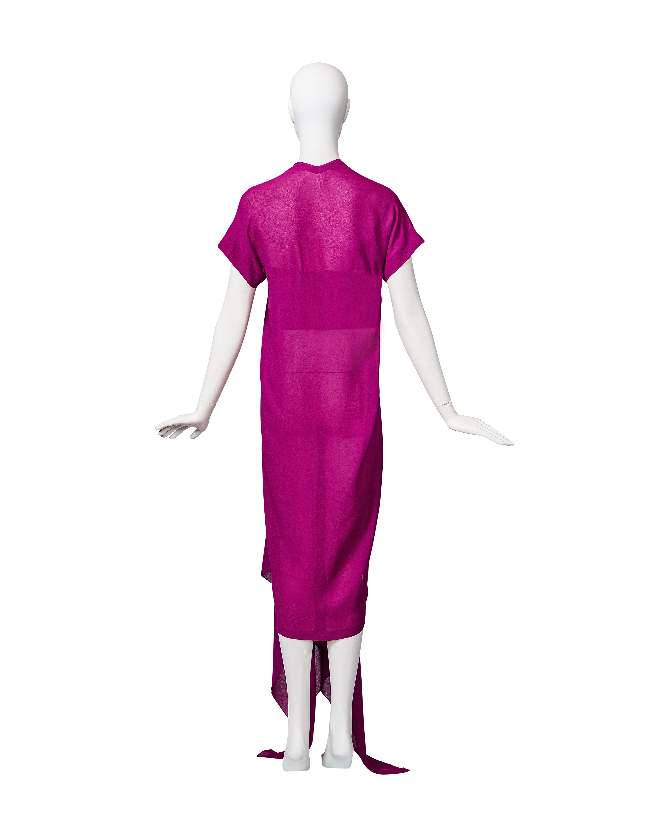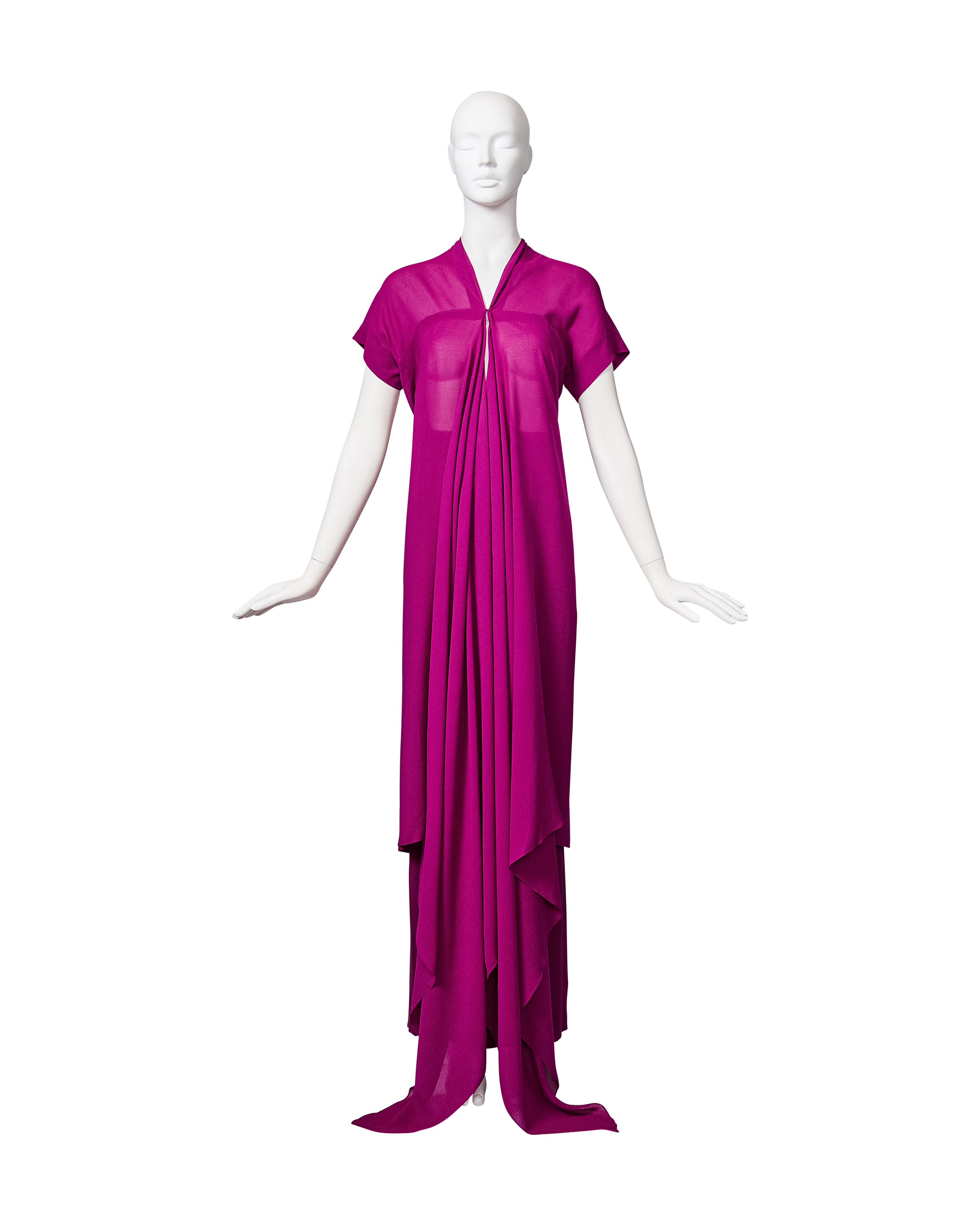 1970's Madame Grès magenta crepe draped top / dress and skirt ensemble. Two-piece ensemble - first piece is a short sleeve fuchsia/magenta purple semi-sheer v-neck wrap top / dress with center front drape in silk crepe. Features built-in waistbelt and single hook-and-eye closure at bust, creating semi-open long pointed front drape when worn. Second piece is maxi skirt of crepe de chine material with moderate back slit and darting at waist. Skirt is in slightly darker purple colorway, with center back zip closure. Set is overall in very good vintage condition with small spot at back right of dress (faintly visible when worn); has been sent to couture cleaner and arrives ready to wear.