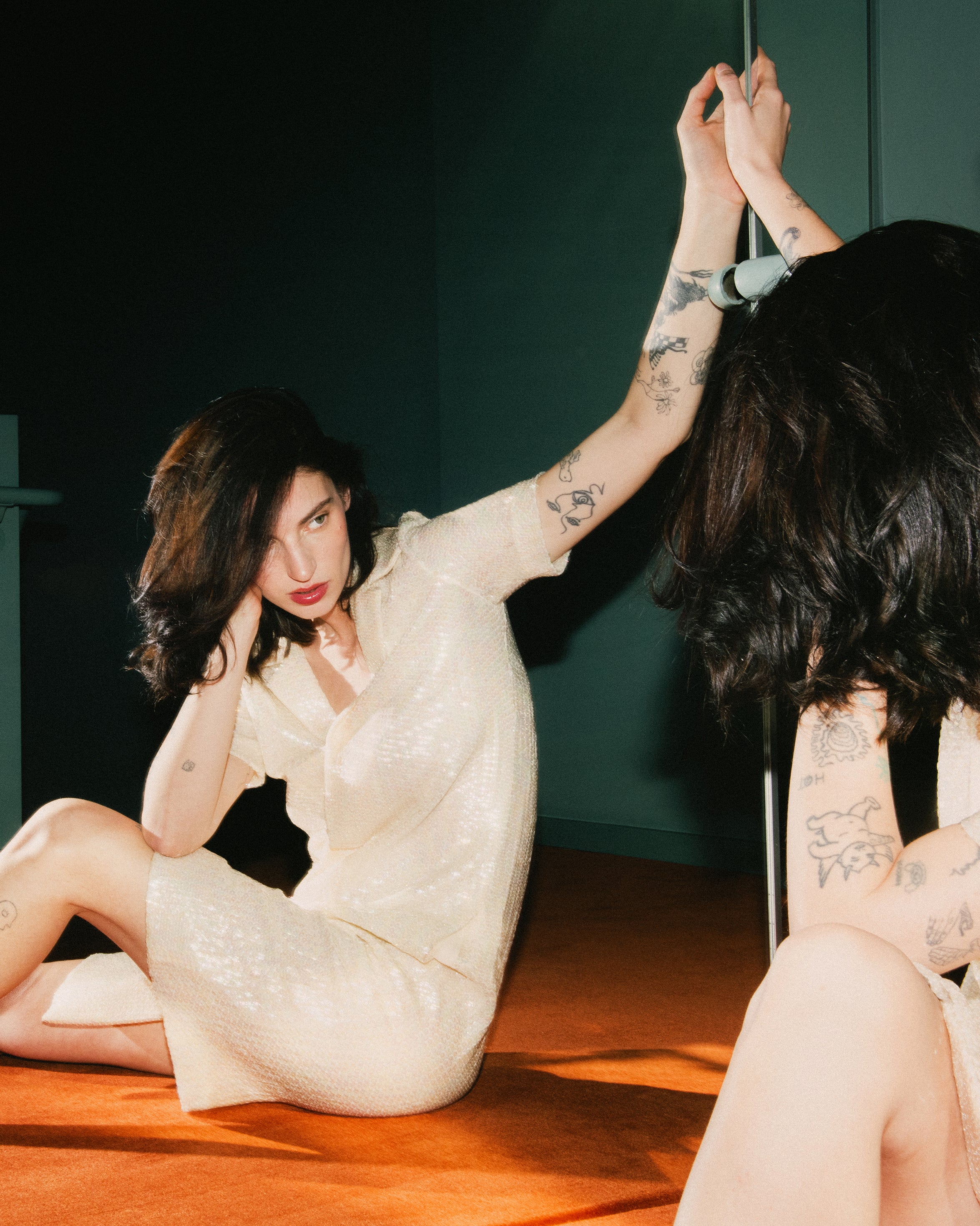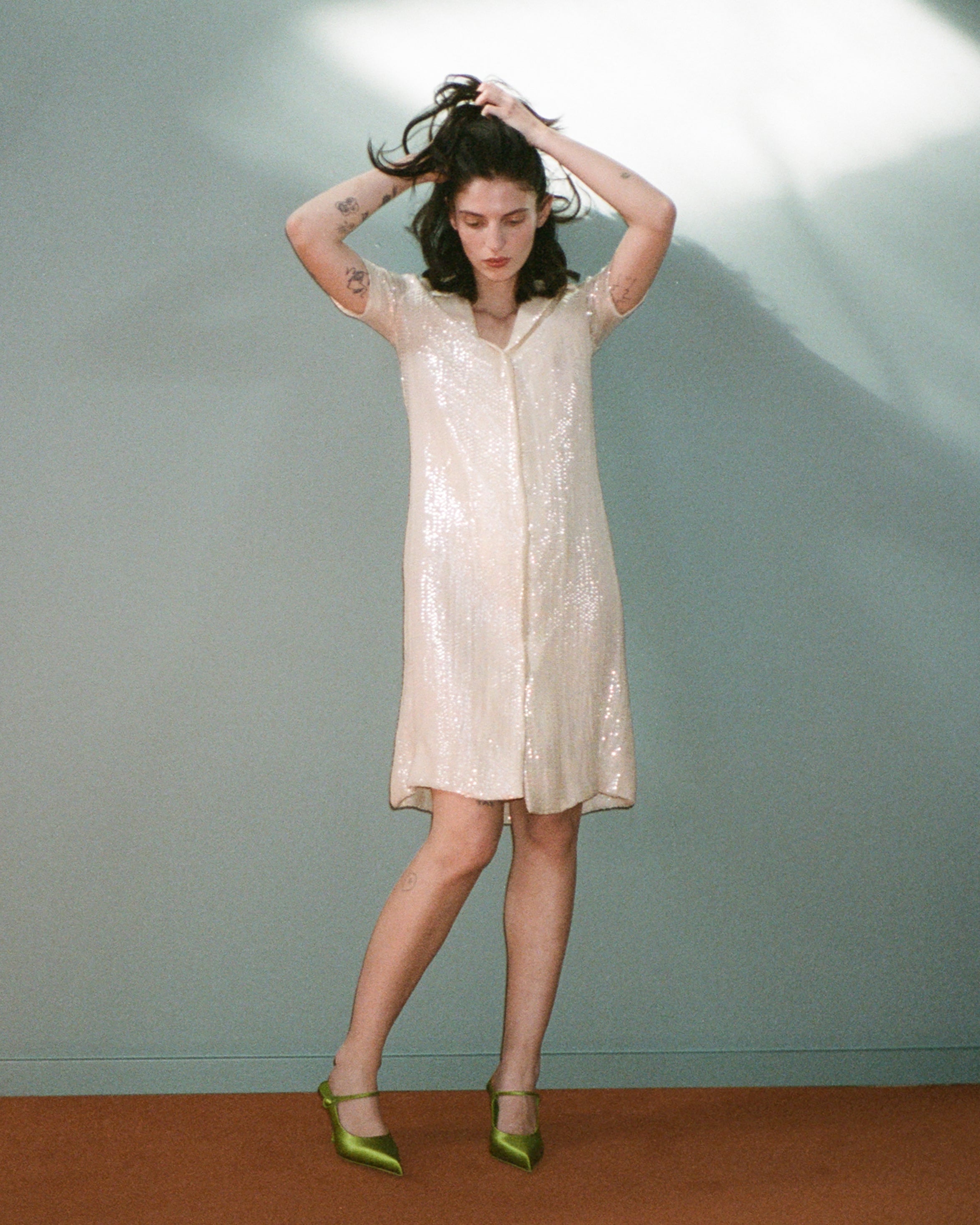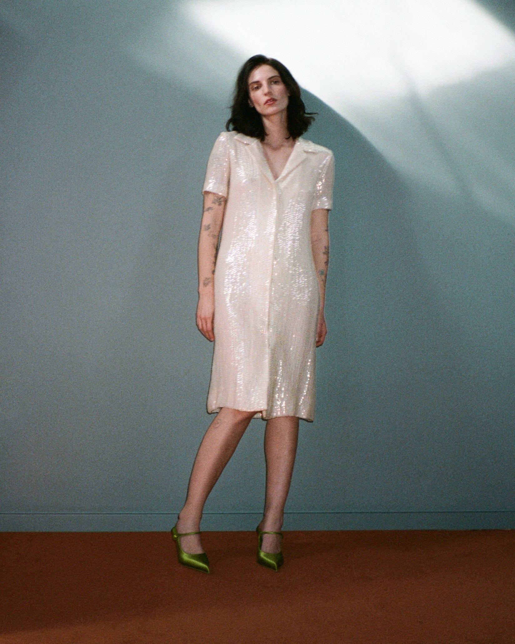 1973 Ecru Fully Sequined Collared Knee Length Dress