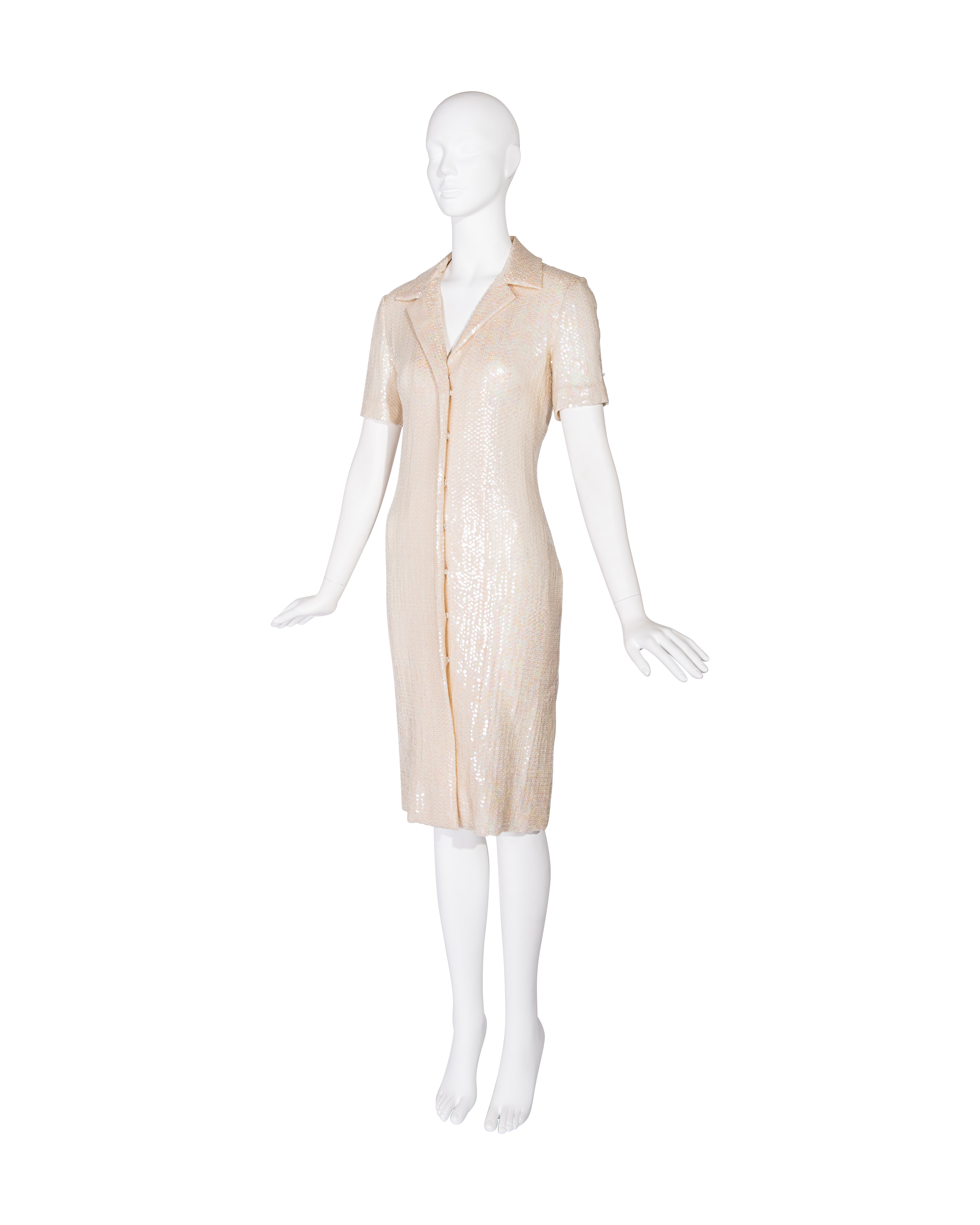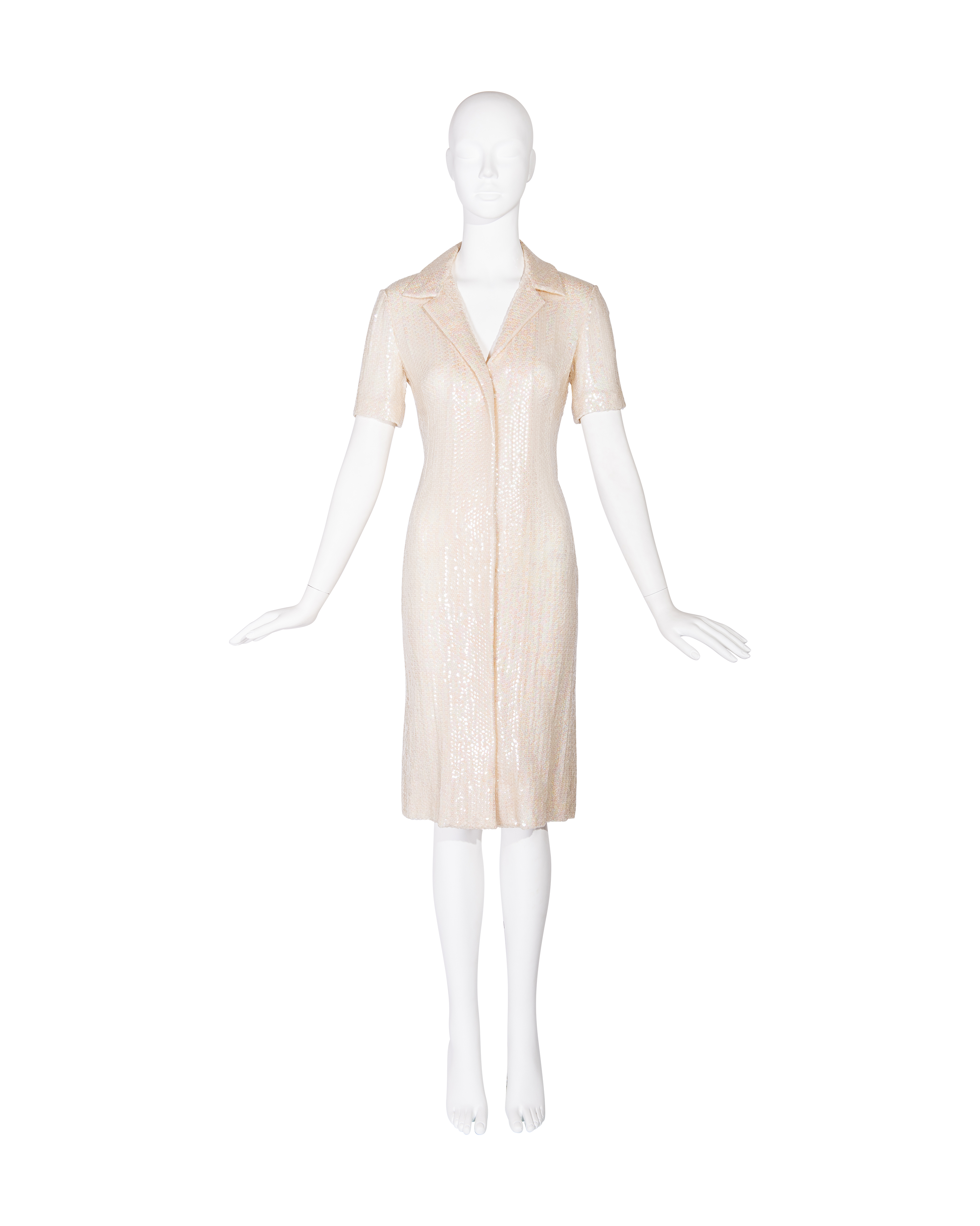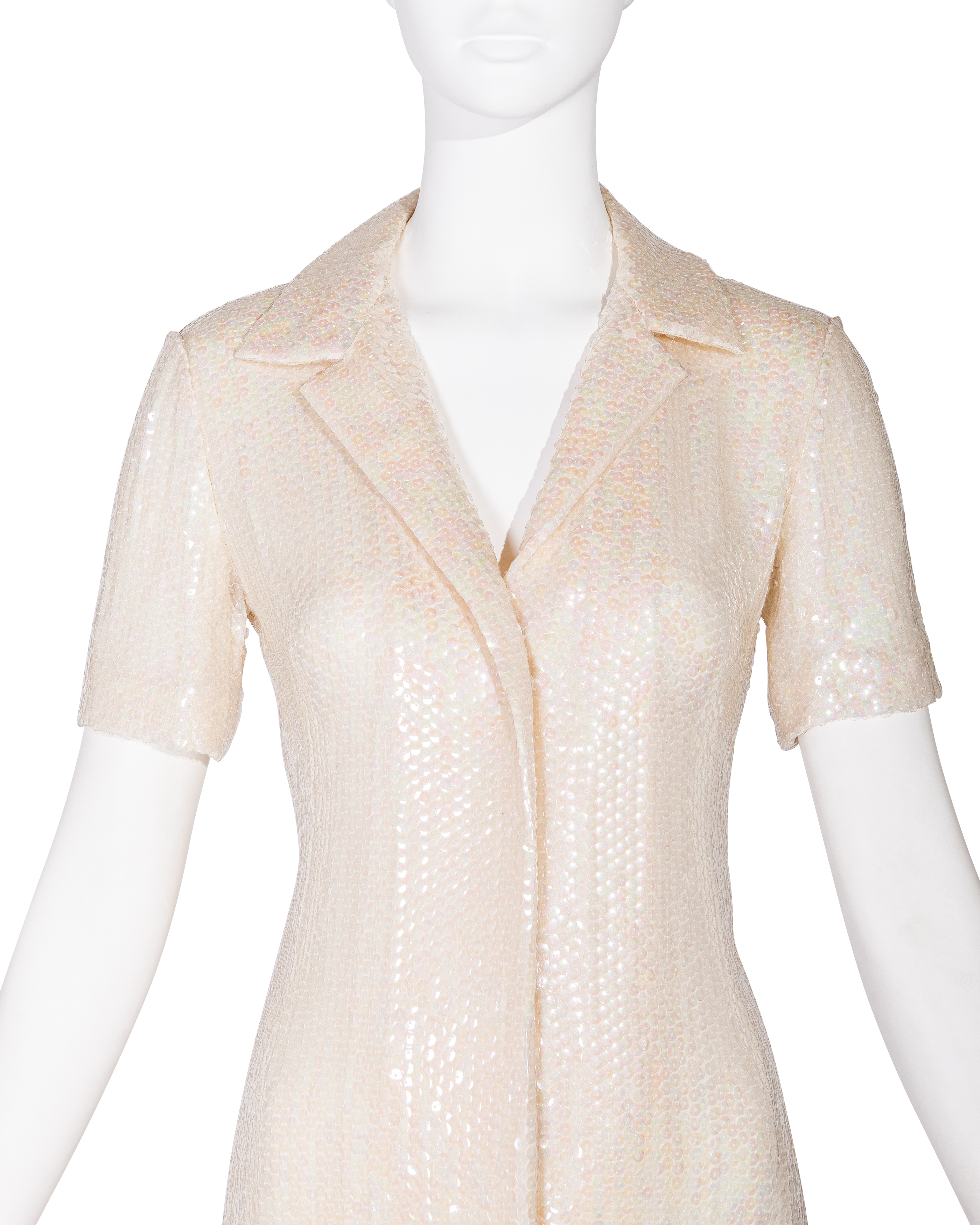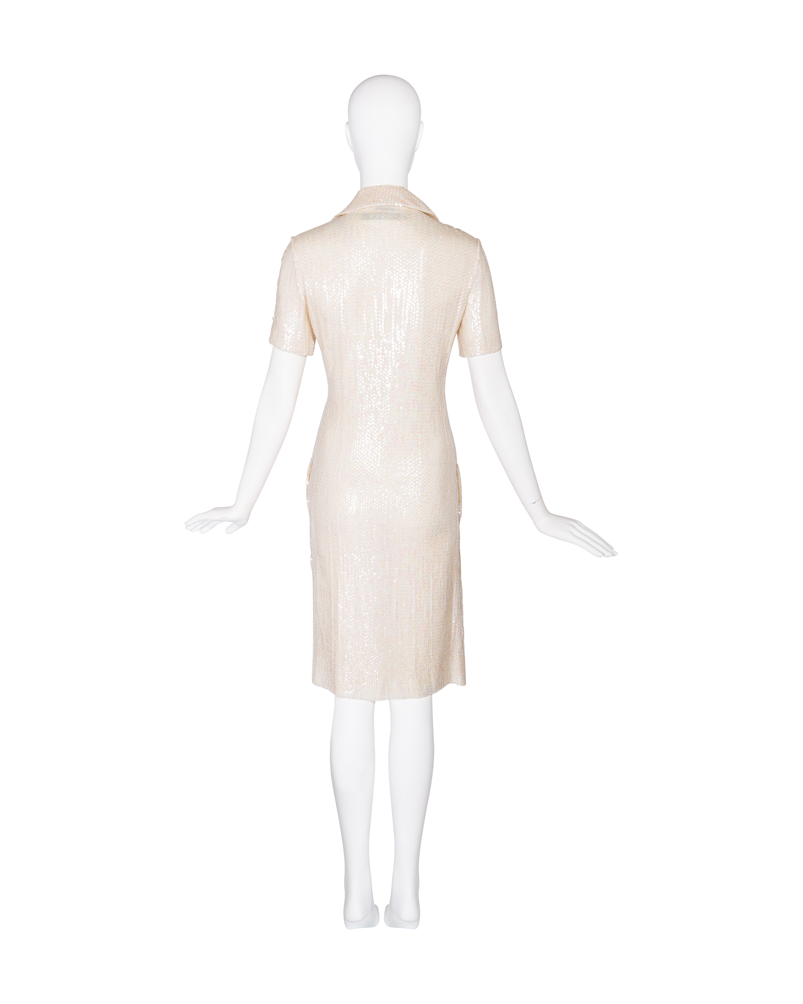 1973 Halston ecru fully sequined collared knee length dress. Short sleeve collared ecru dress that is completely hand-embellished throughout with iridescent white sequins. Concealed interior snap closures and hook-and-eye closure at bust. Fully lined with organza lining. Functional side slit pockets. Additional fabric allotment on interior of hemline. In very good vintage condition with minor missing embellishments throughout.