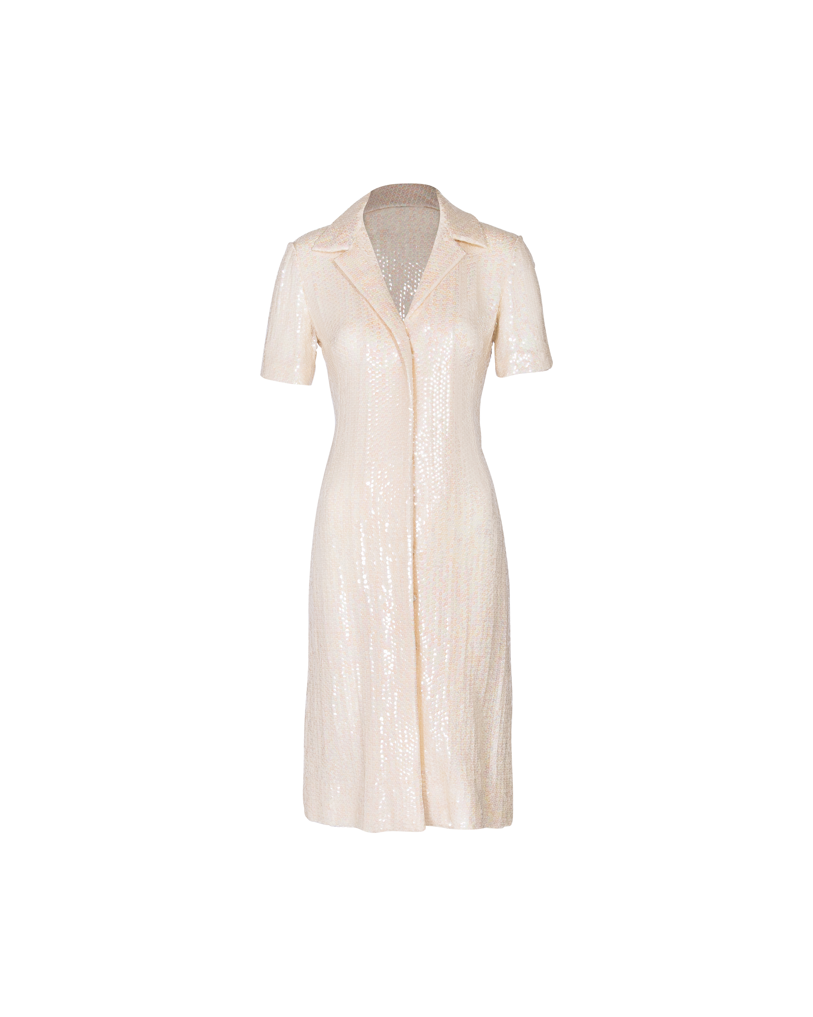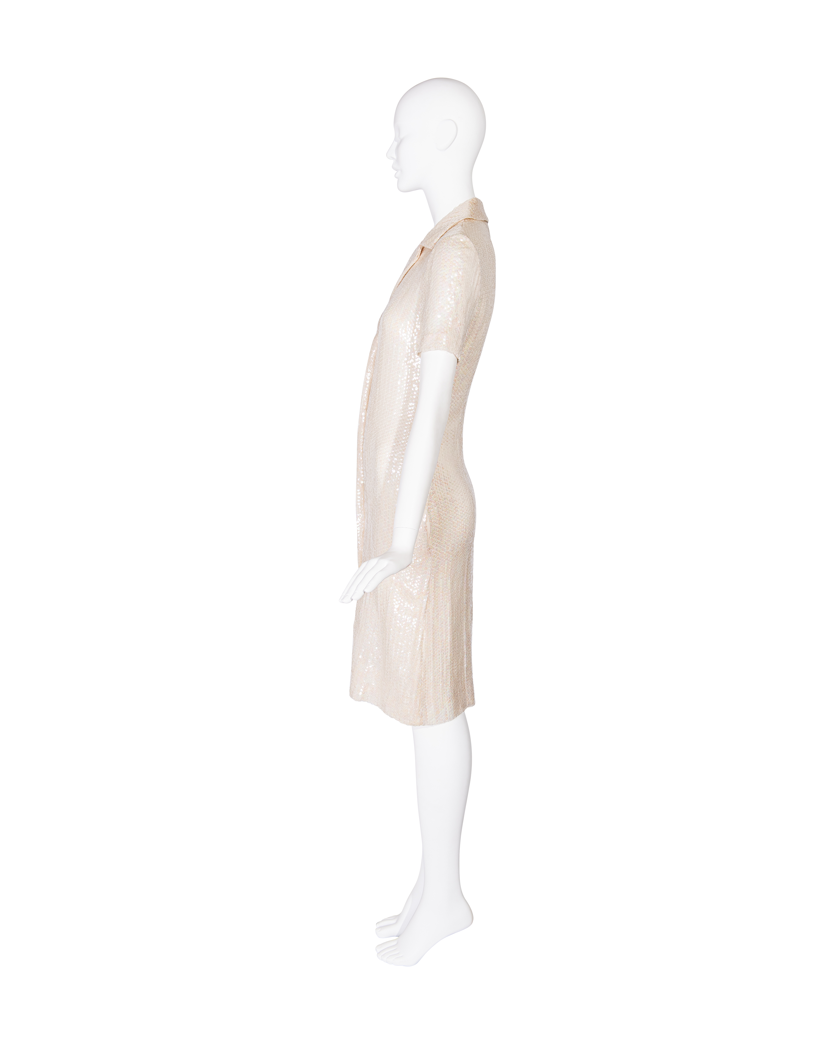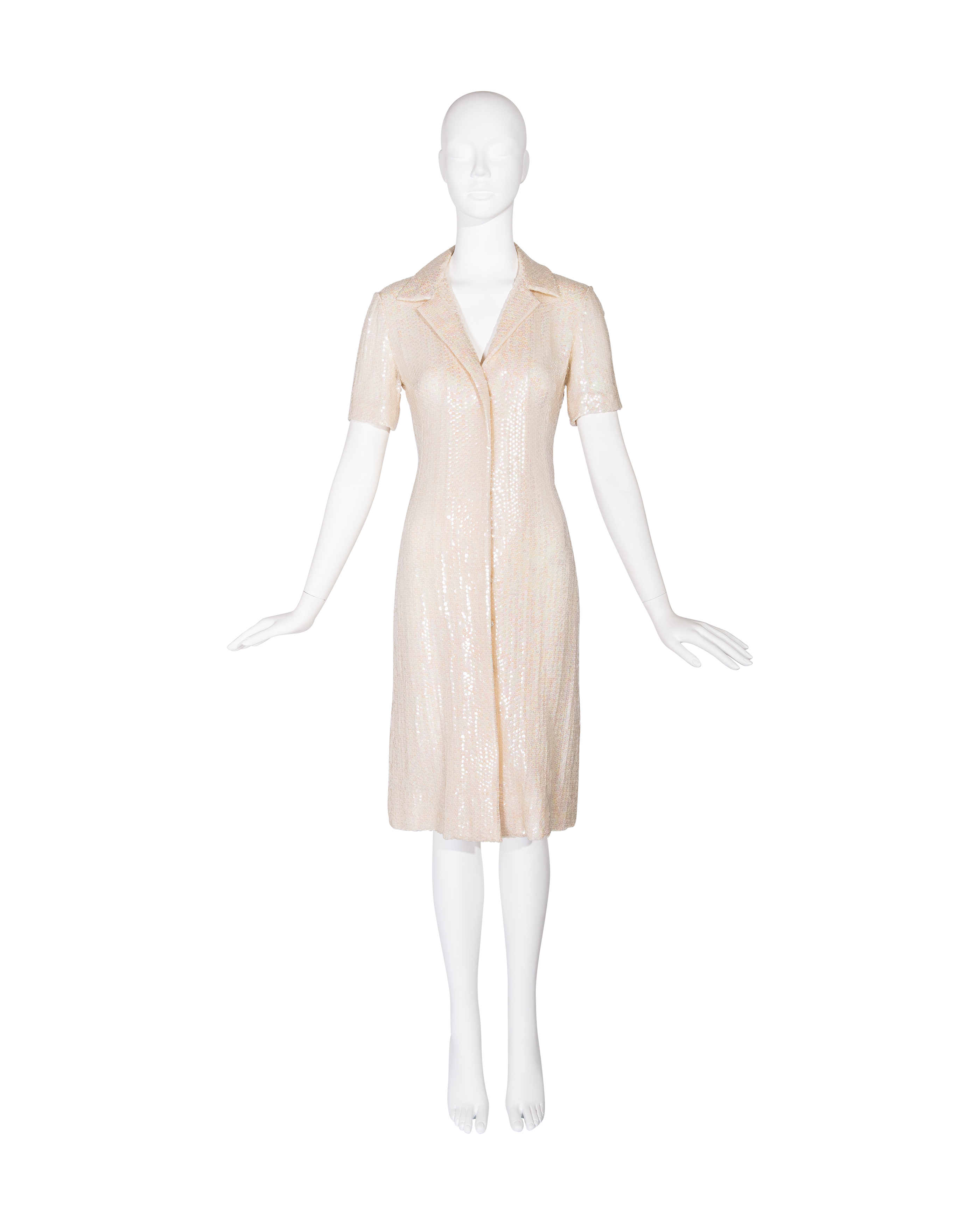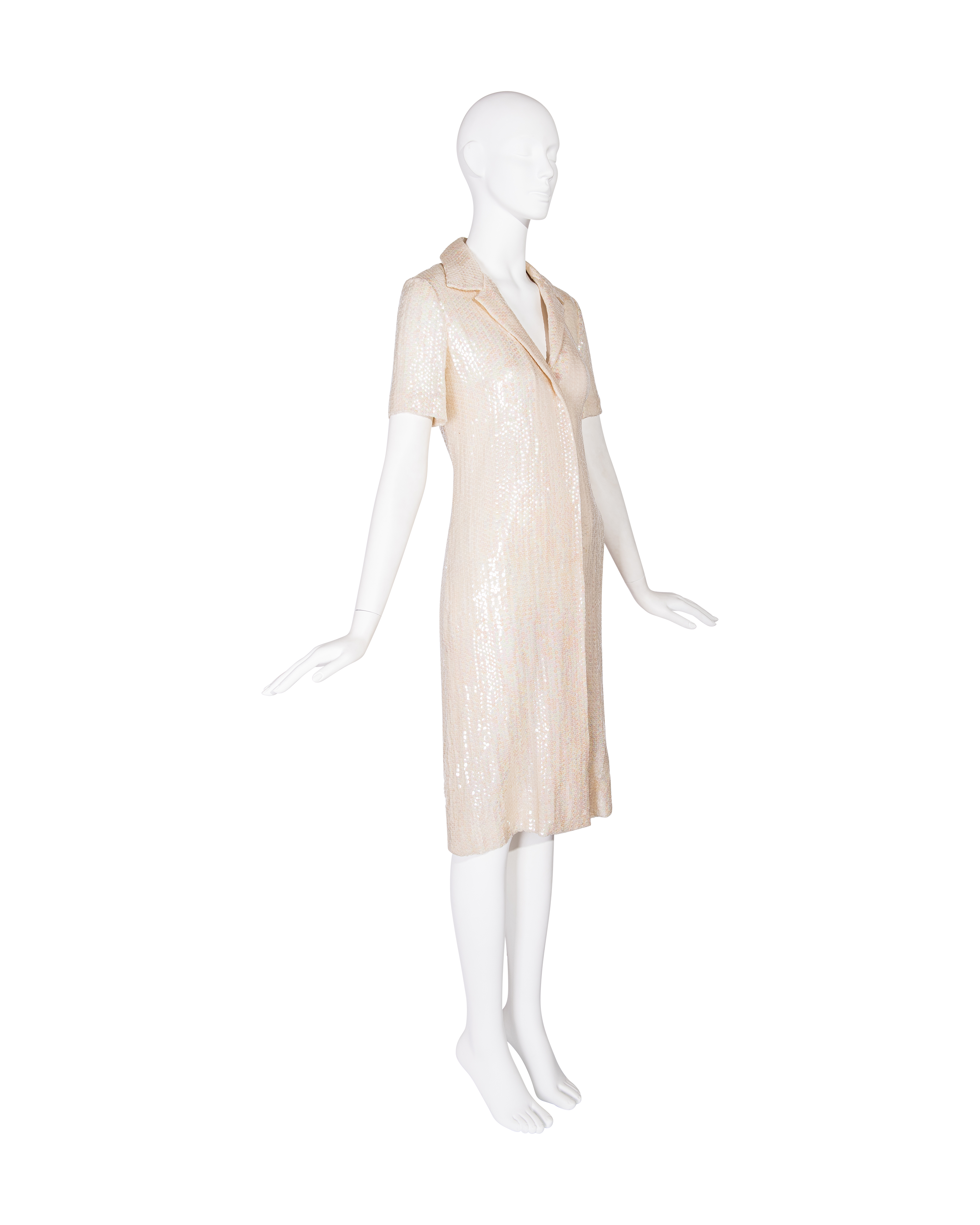 1973 Halston ecru fully sequined collared knee length dress. Short sleeve collared ecru dress that is completely hand-embellished throughout with iridescent white sequins. Concealed interior snap closures and hook-and-eye closure at bust. Fully lined with organza lining. Functional side slit pockets. Additional fabric allotment on interior of hemline. In very good vintage condition with minor missing embellishments throughout.