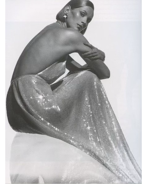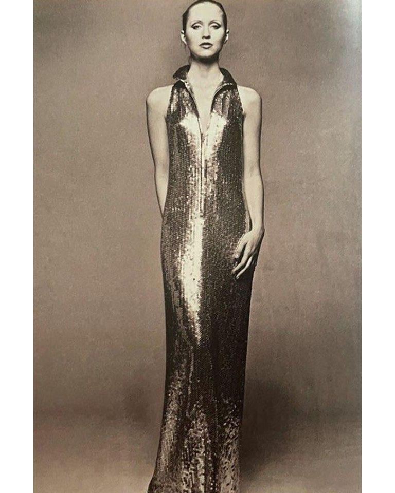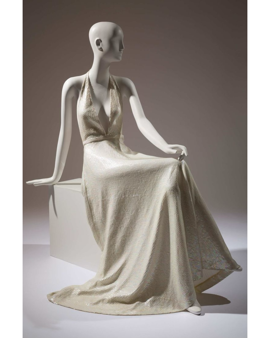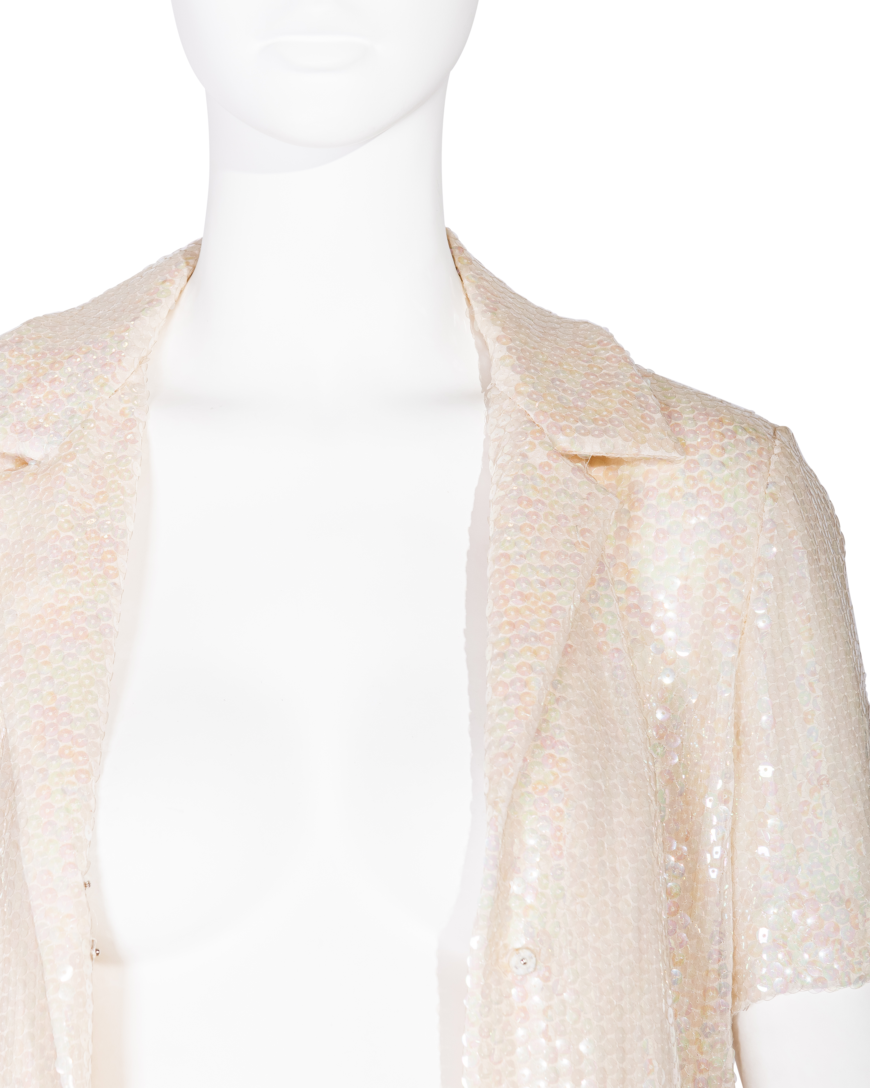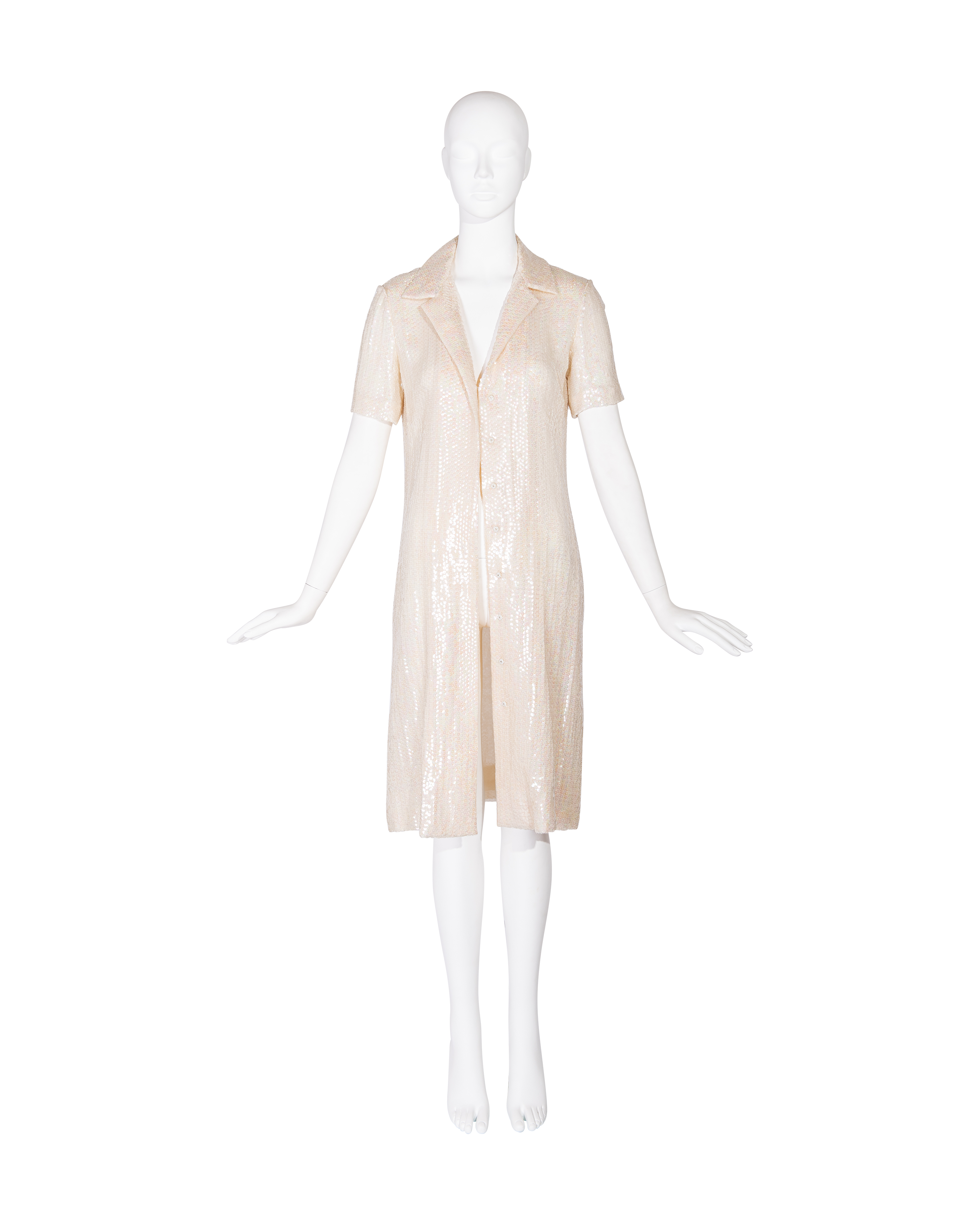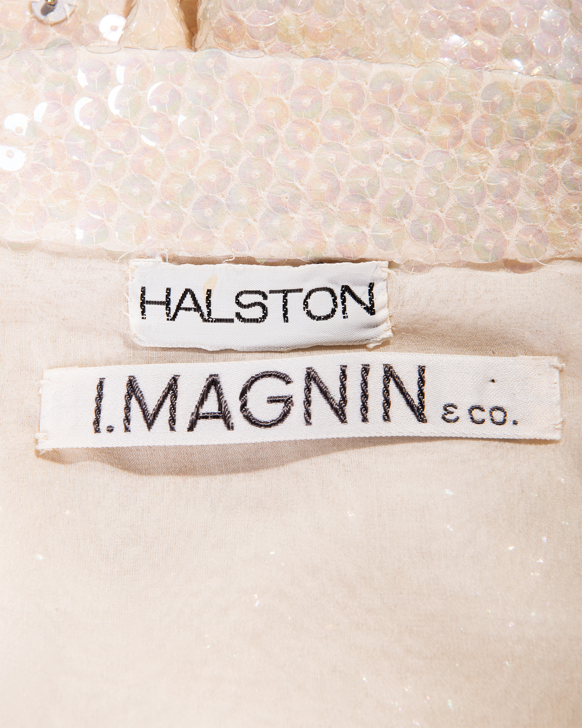 1973 Halston ecru fully sequined collared knee length dress. Short sleeve collared ecru dress that is completely hand-embellished throughout with iridescent white sequins. Concealed interior snap closures and hook-and-eye closure at bust. Fully lined with organza lining. Functional side slit pockets. Additional fabric allotment on interior of hemline. In very good vintage condition with minor missing embellishments throughout.