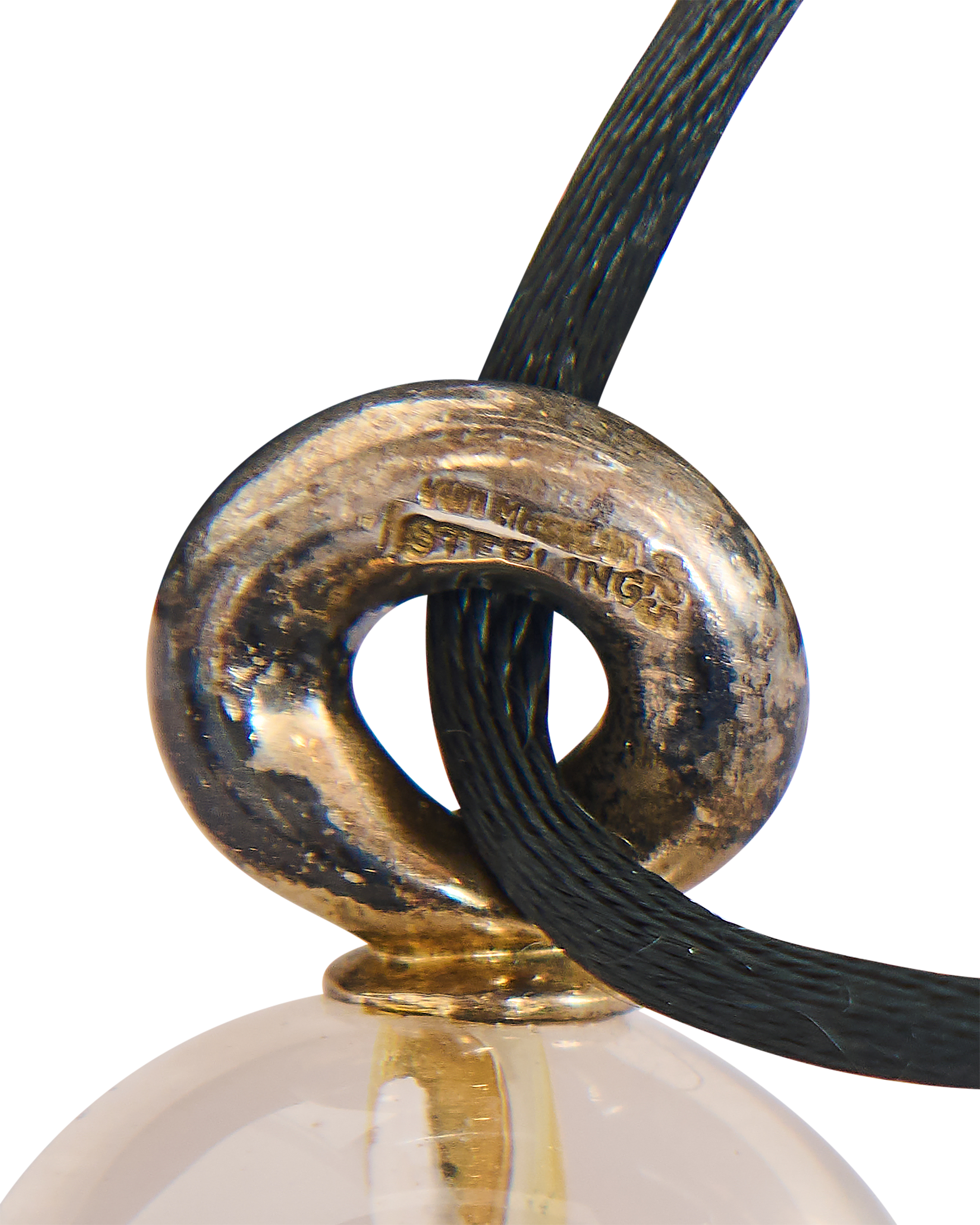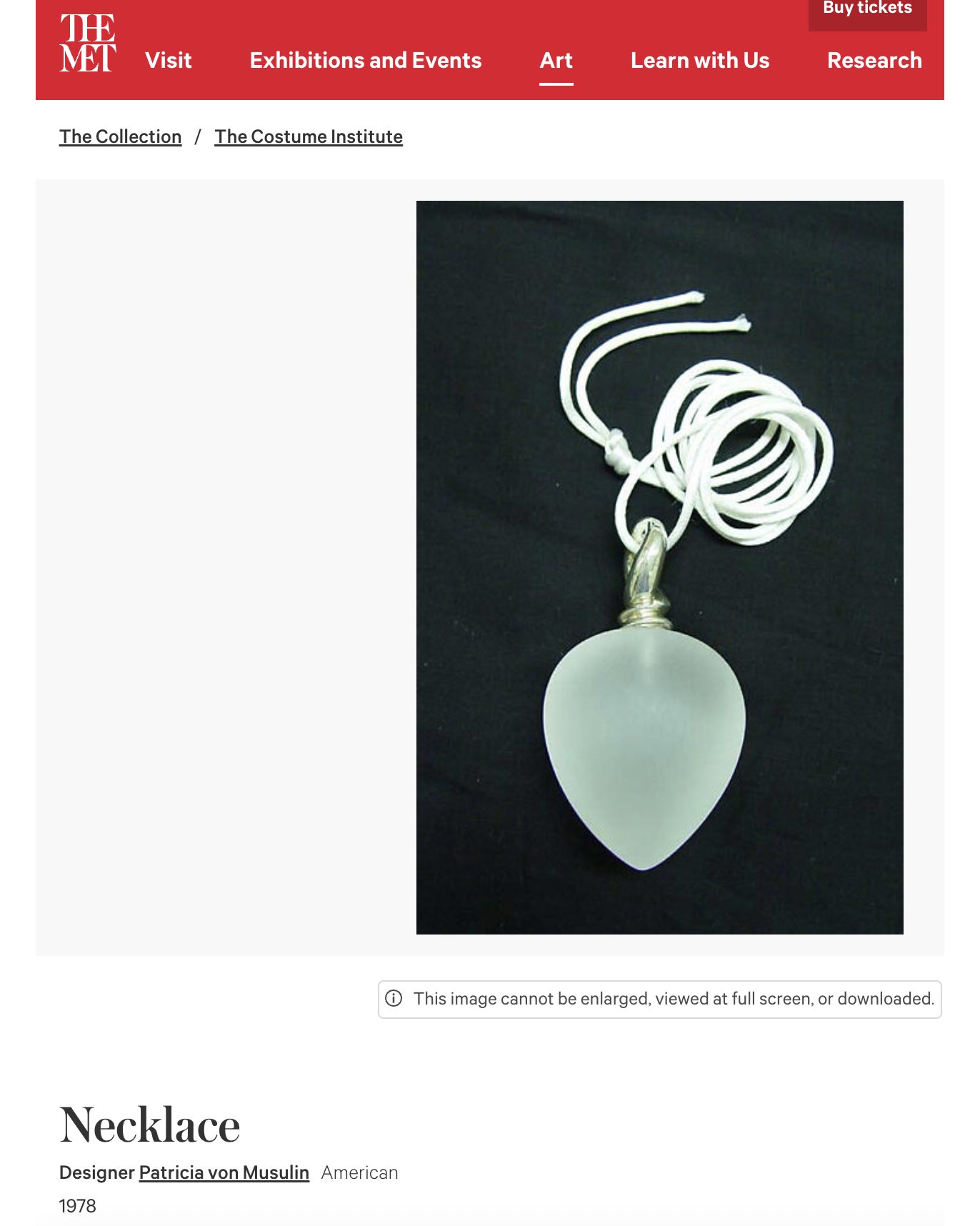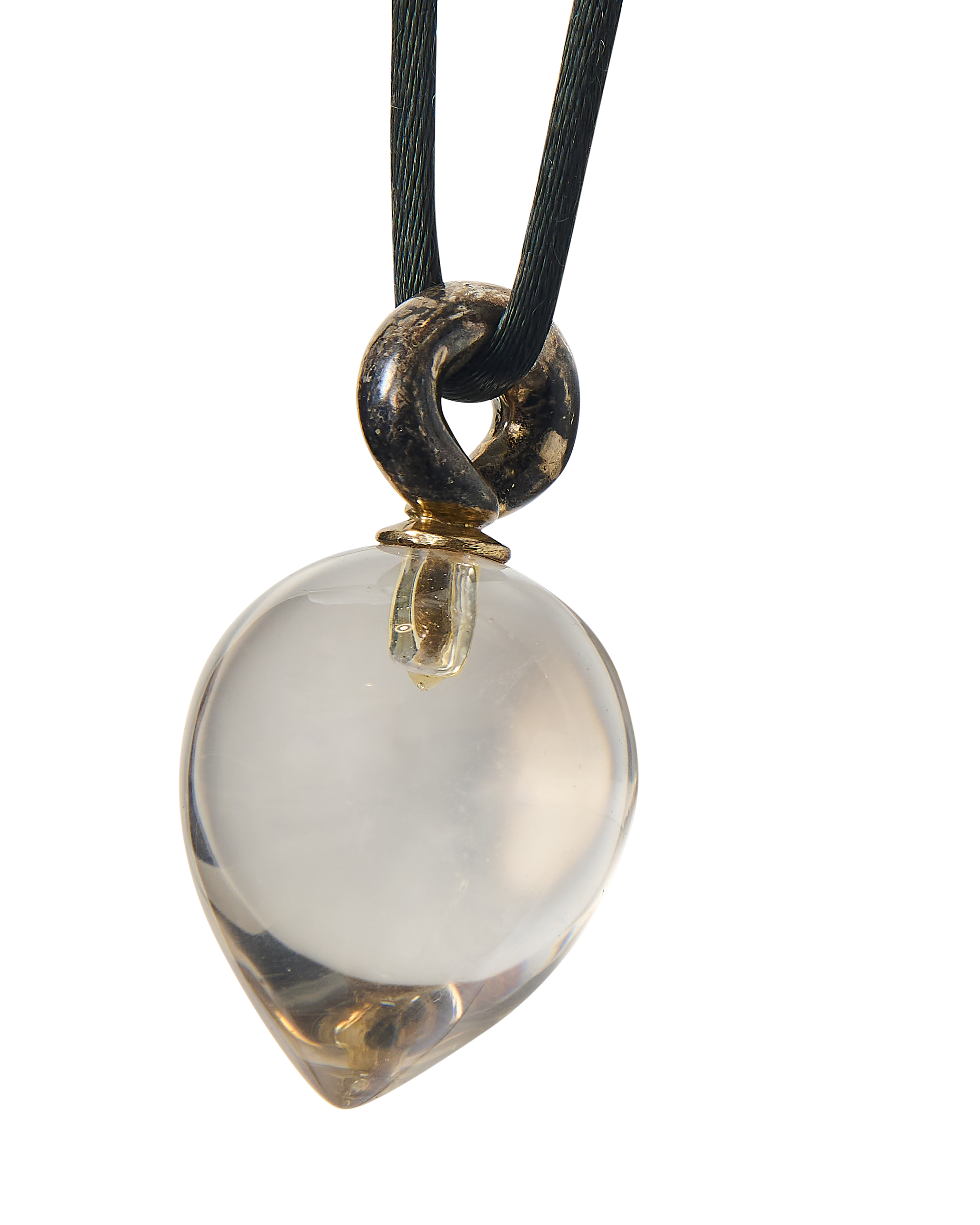 1978 Patricia Von Musulin (Signed) lucite and sterling silver drop pendant necklace. Large teardrop shaped clear lucite pendant necklace with silver-tone base on black cord (cord can be swapped as desired for different styling effect). As seen in the Met Museum on white cord. In very good vintage condition with wear / oxidization at silver.