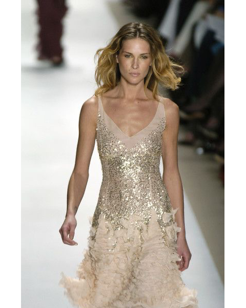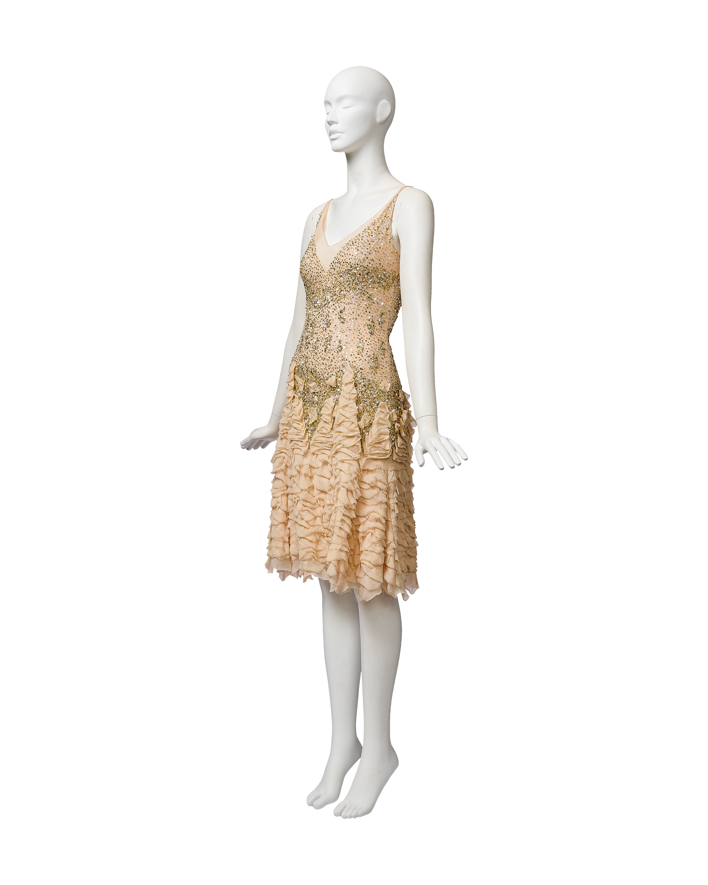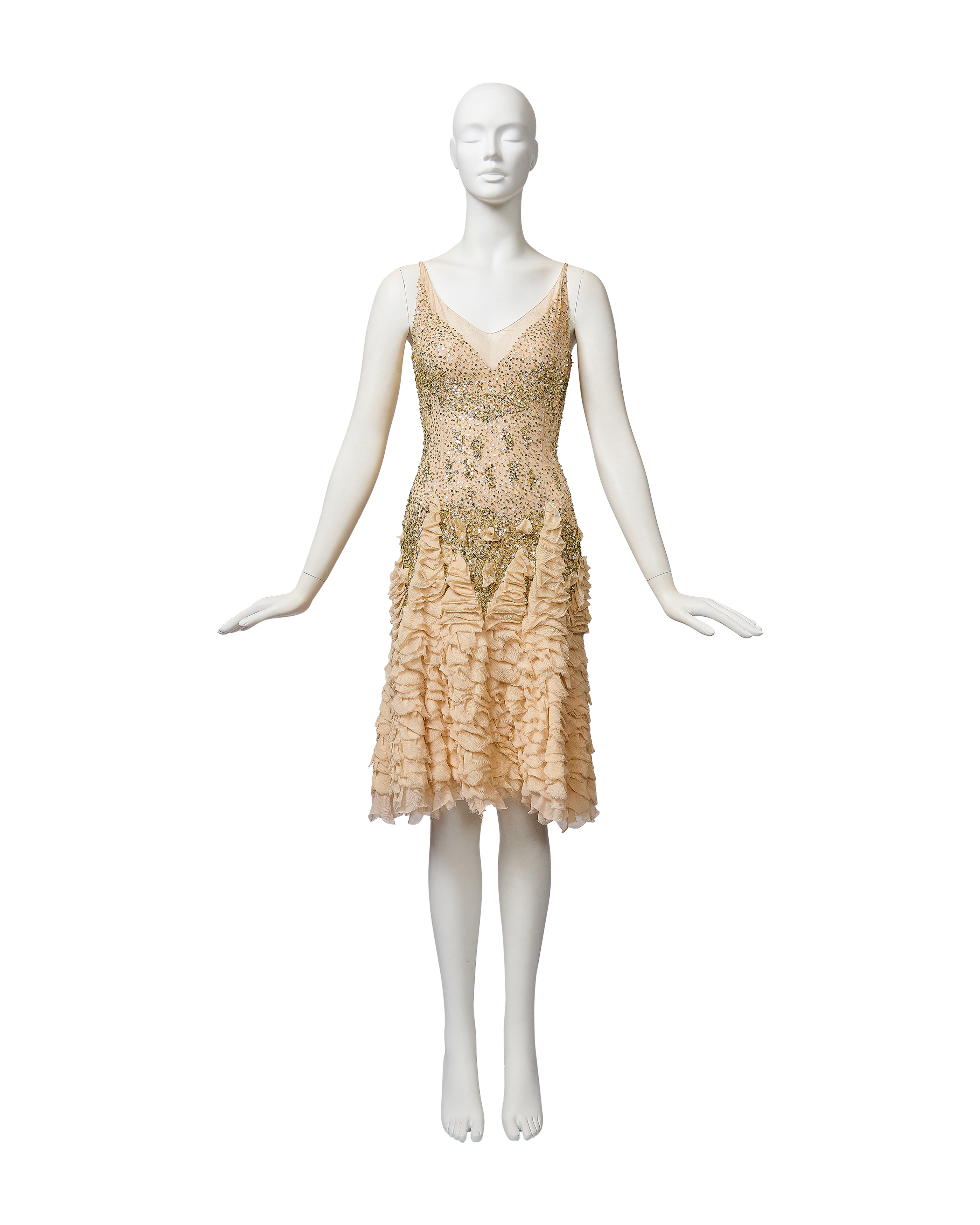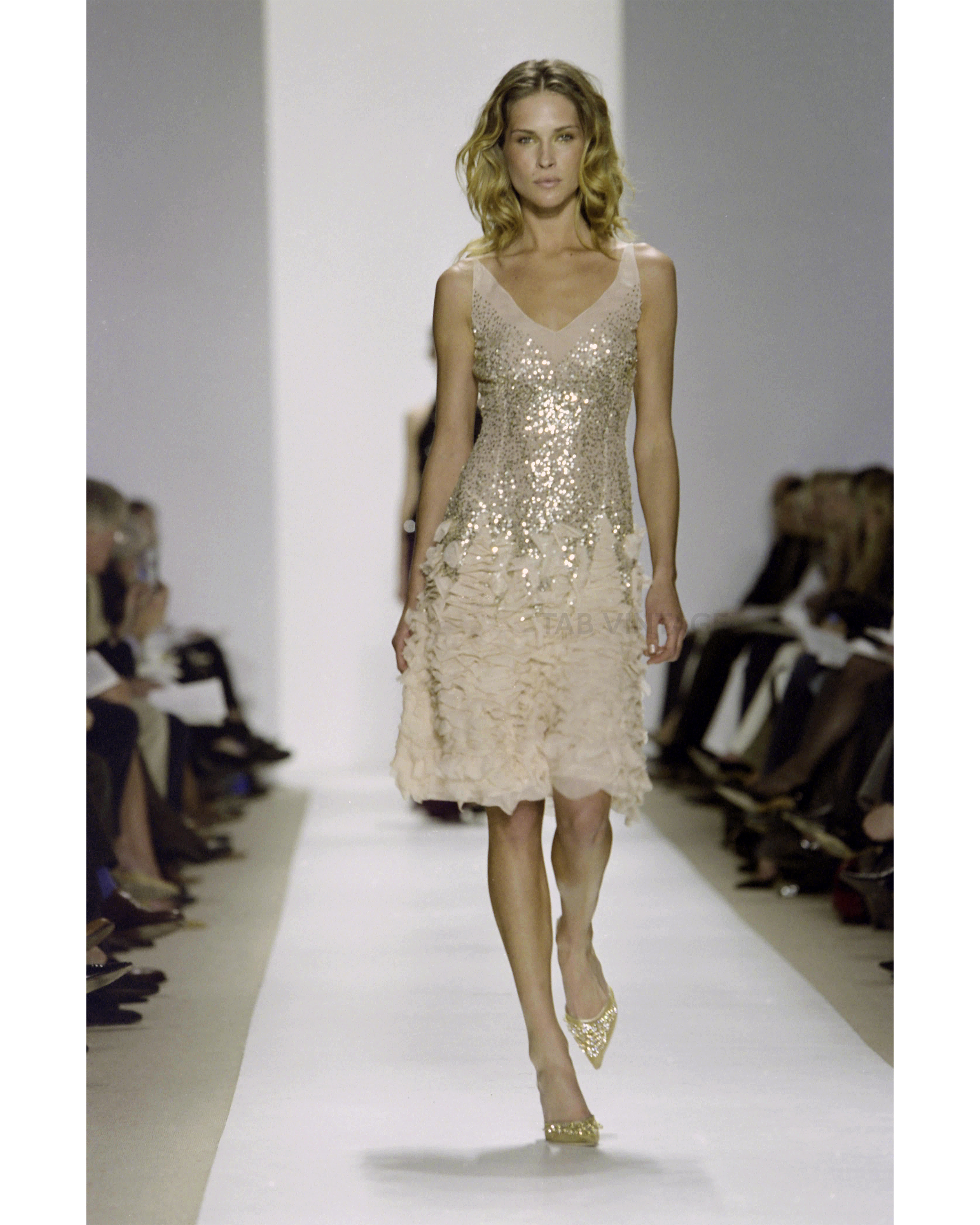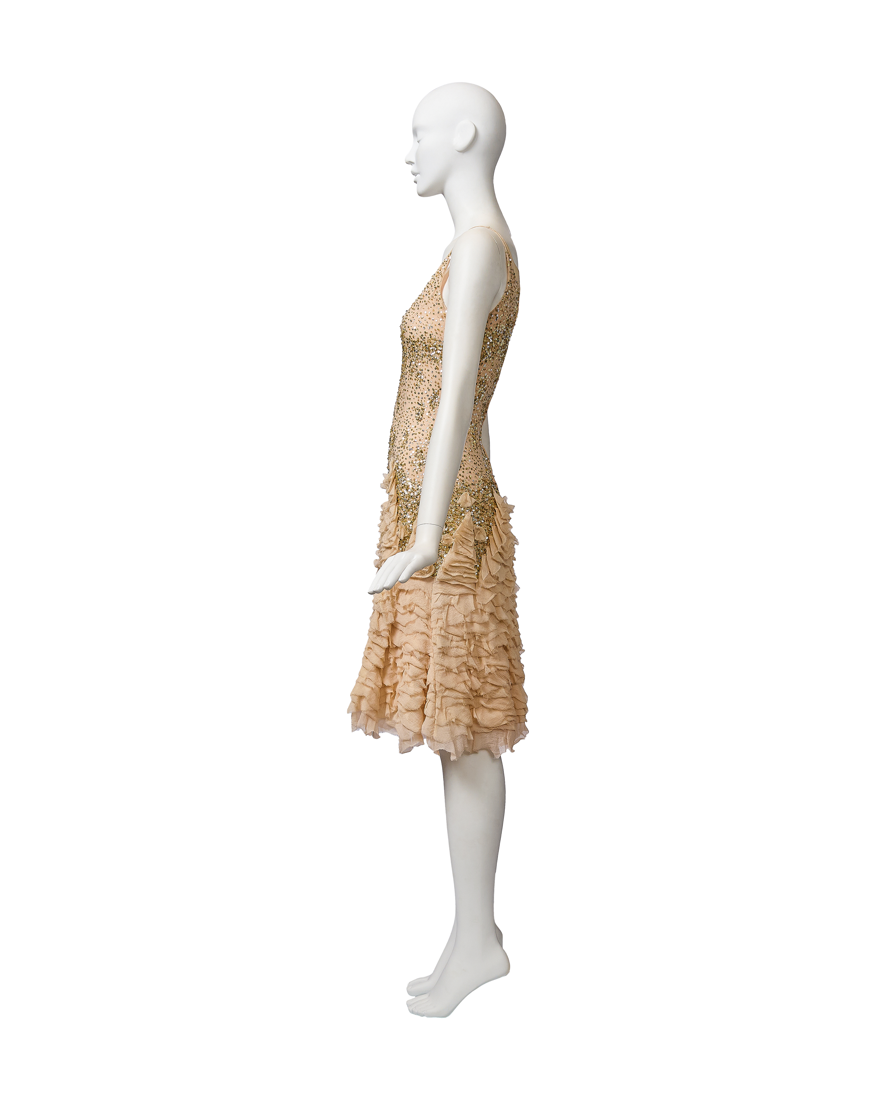 A/W 2004 Oscar de la Renta embellished cream / beige / soft pink above-knee length dress. Sleeveless dress with semi-sheer mesh upper paneling, with layered ruffle detailing from waist through hemline and sequin embellishments throughout. Center back zip closure. As seen on the runway (Look #38). In very good vintage condition with light wear throughout (minor wear at straps and slight missing sequins).