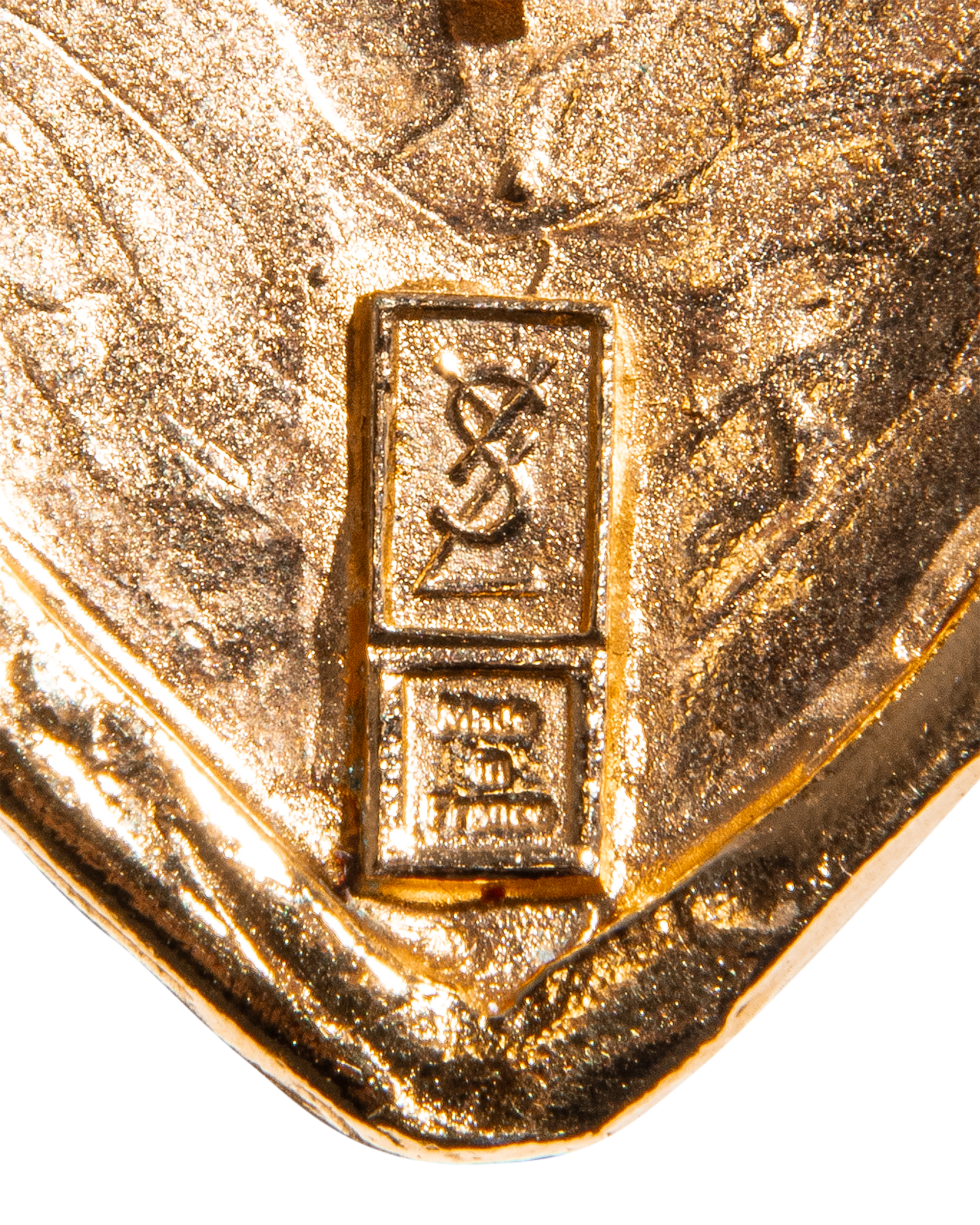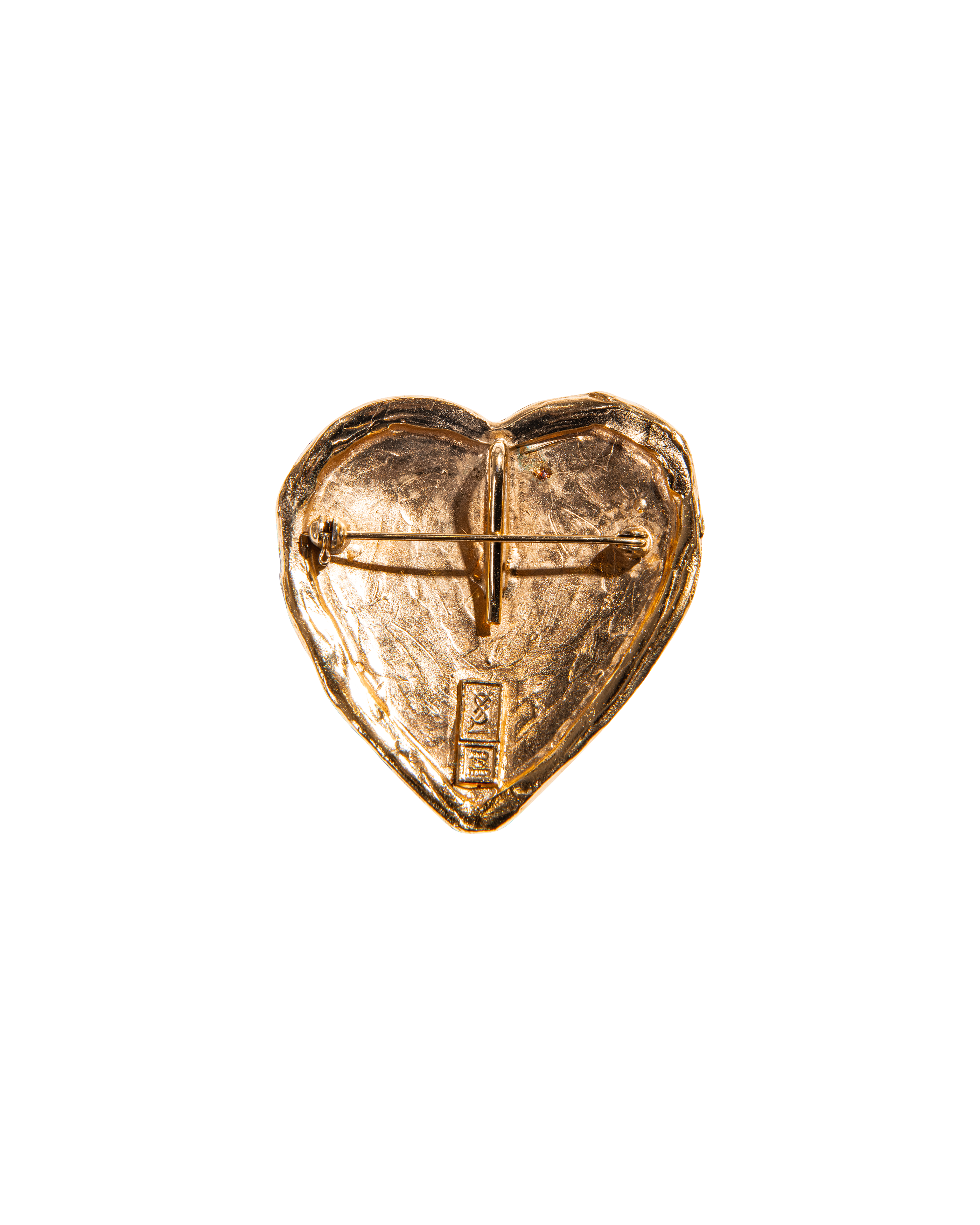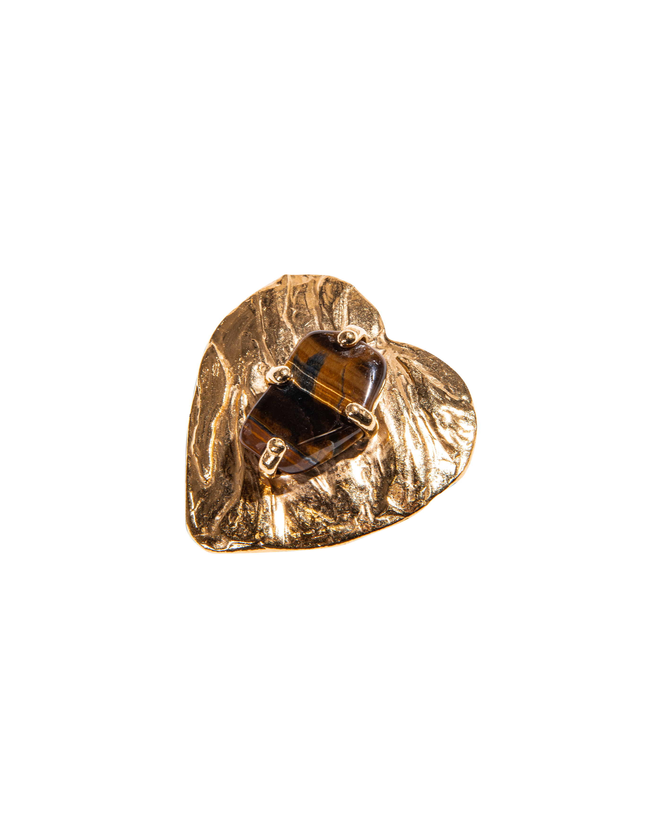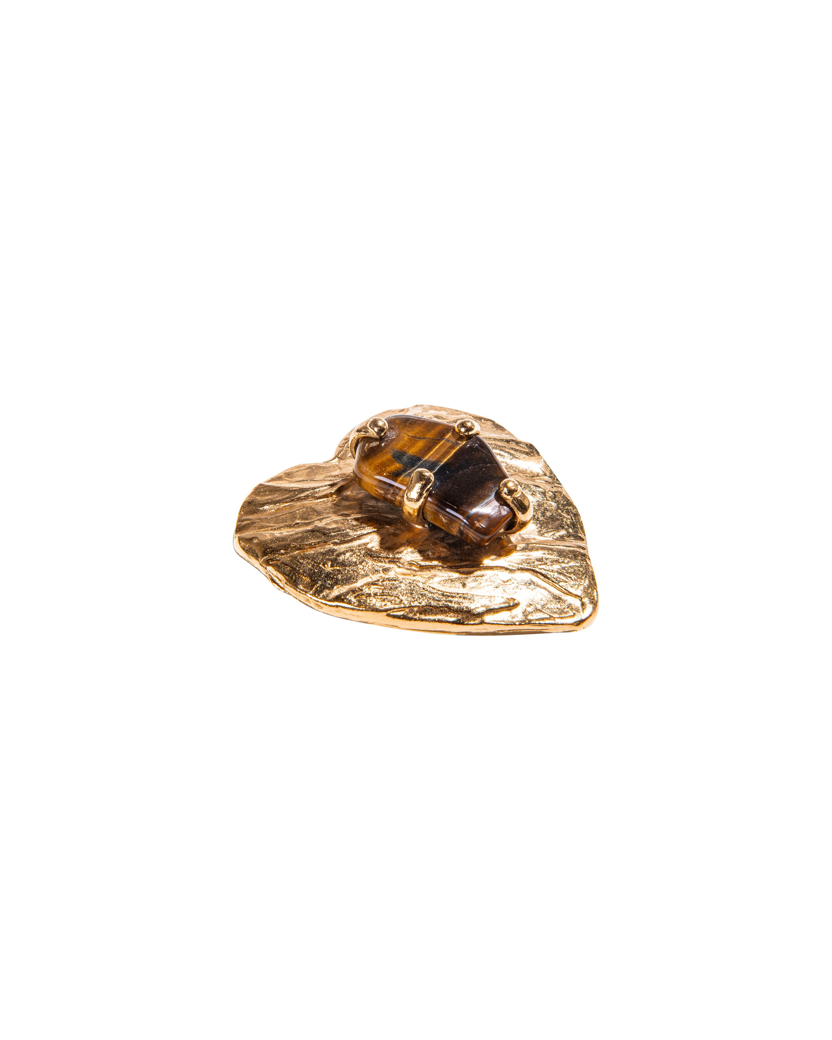 1990's Yves Saint Laurent by jeweler Robert Goossens hammered gold heart tigers eye brooch, featuring embedded deep brown stone. Heart-shaped hammered gold-tone piece with back loop that allows for varied styling as pendant or brooch. Features deep brown and lighter mustard brown gemstone attached with four gold 'closures' at all sides. In very good vintage condition with light wear throughout.