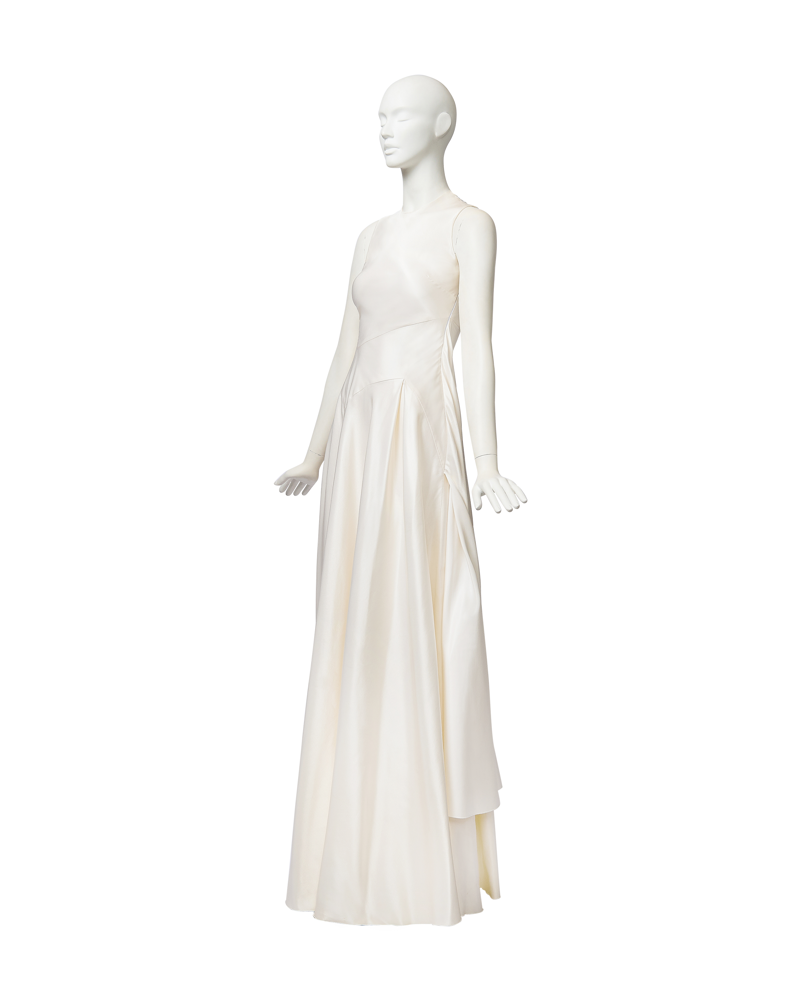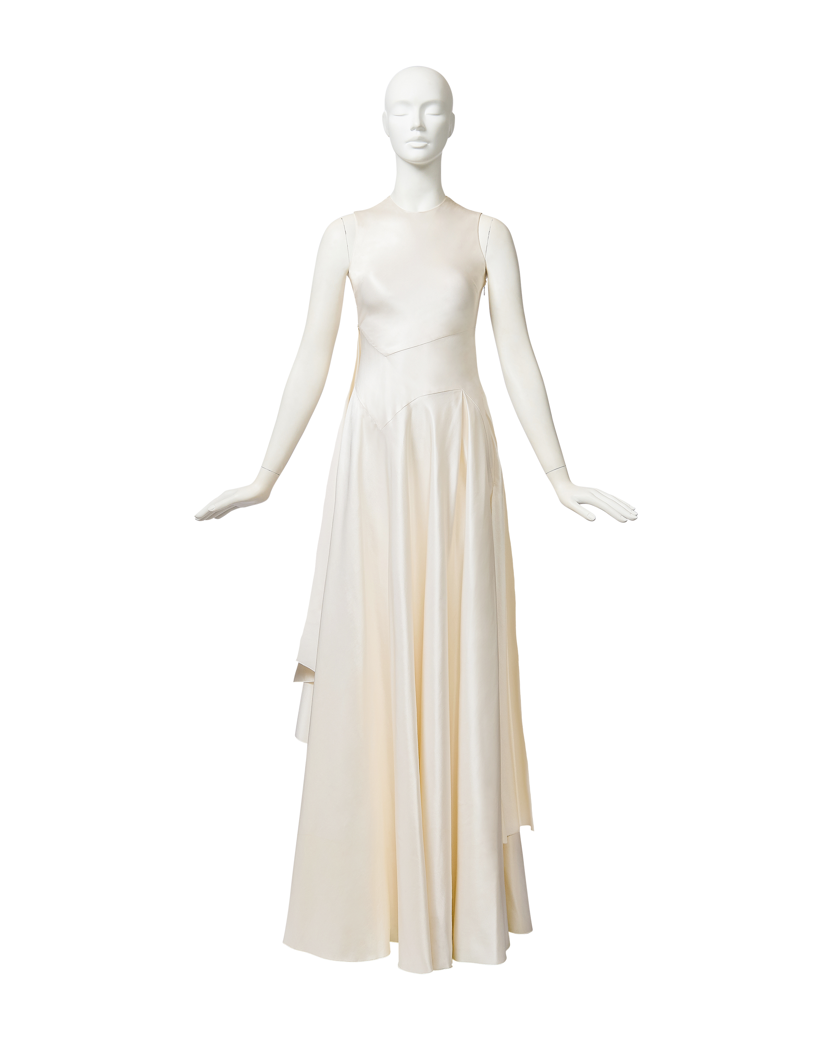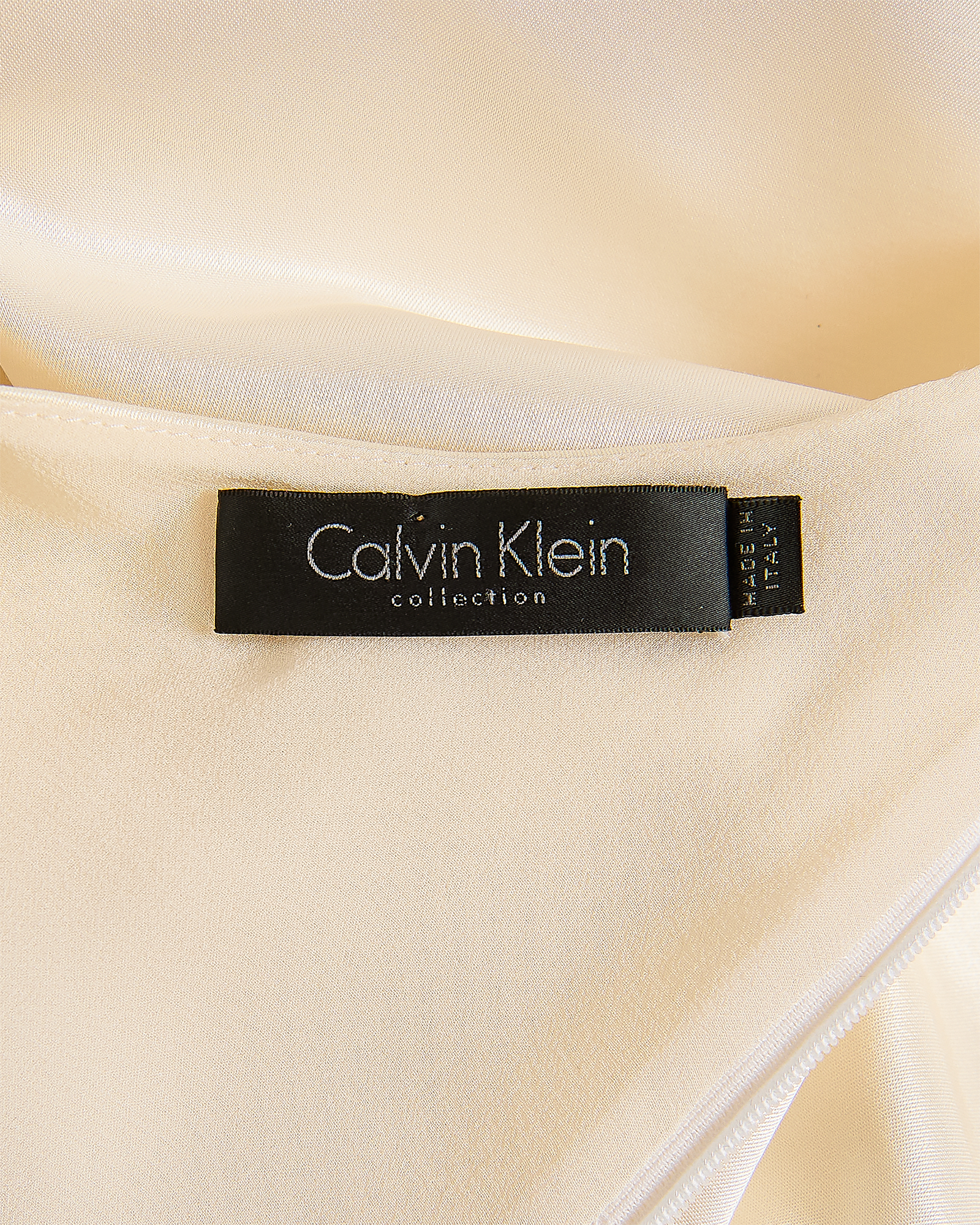 c. 2010 Calvin Klein Collection Black Label ivory sleeveless gown. Fitted ivory / off-white dress with asymmetrical overlay paneling. Concealed asymmetrical back zip closure with two hook-and-eye closures at shoulder, and concealed side zip closure. Fabric Contents: 65% Silk and 35% Cotton blend with 100% Silk lining. In good vintage condition with slight spotting throughout hemline (faintly visible when worn). Has been taken to the couture cleaner and arrives ready-to-wear.