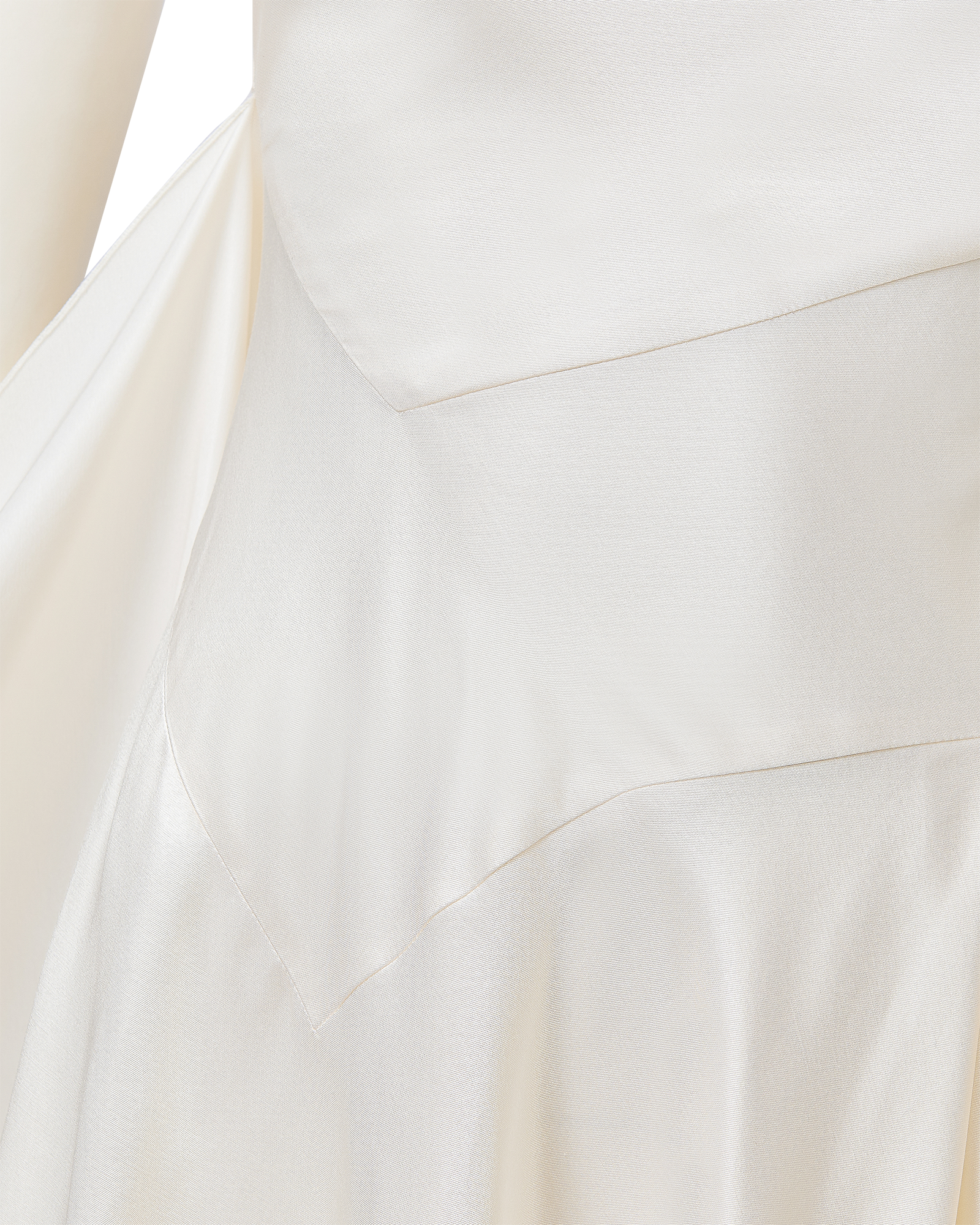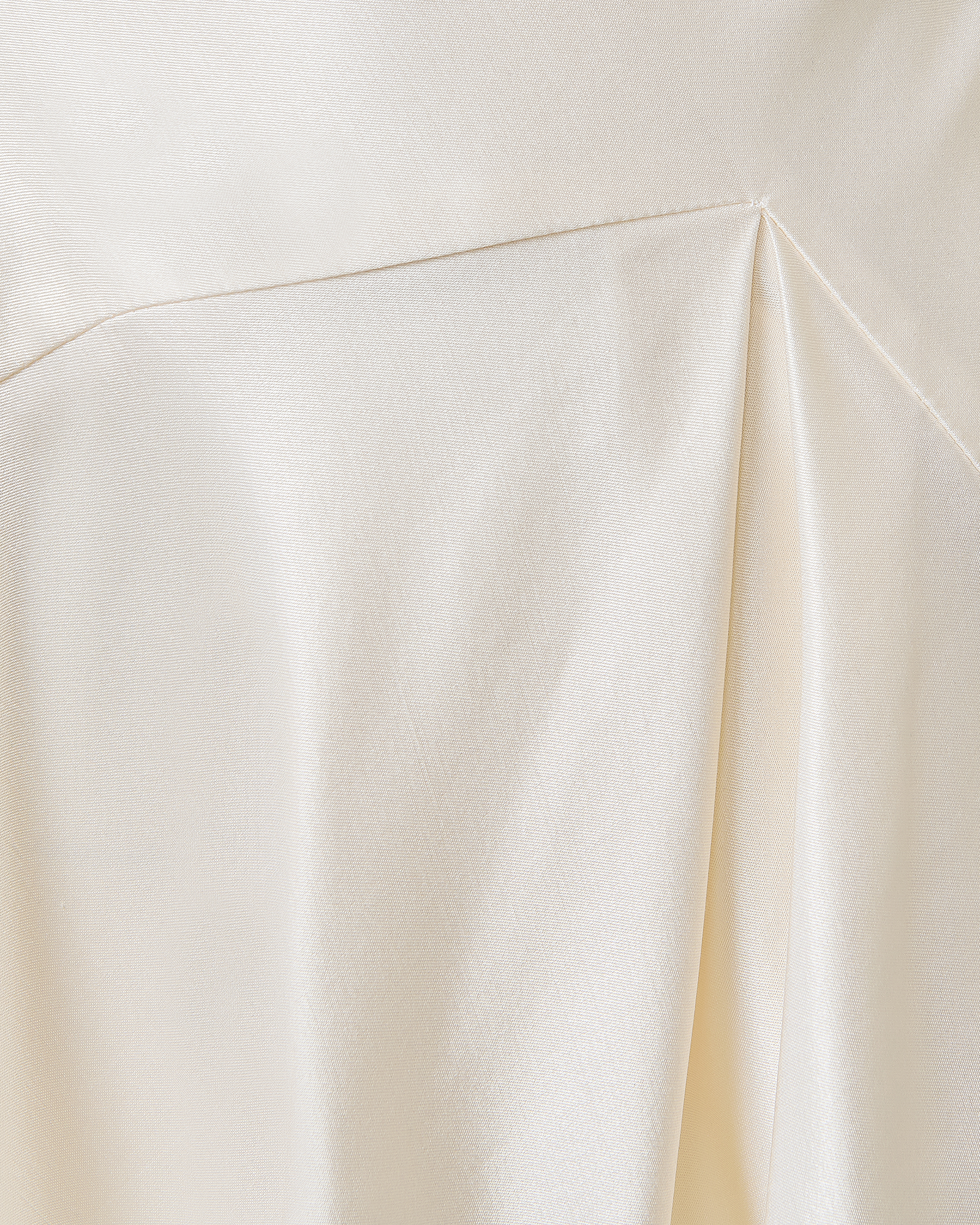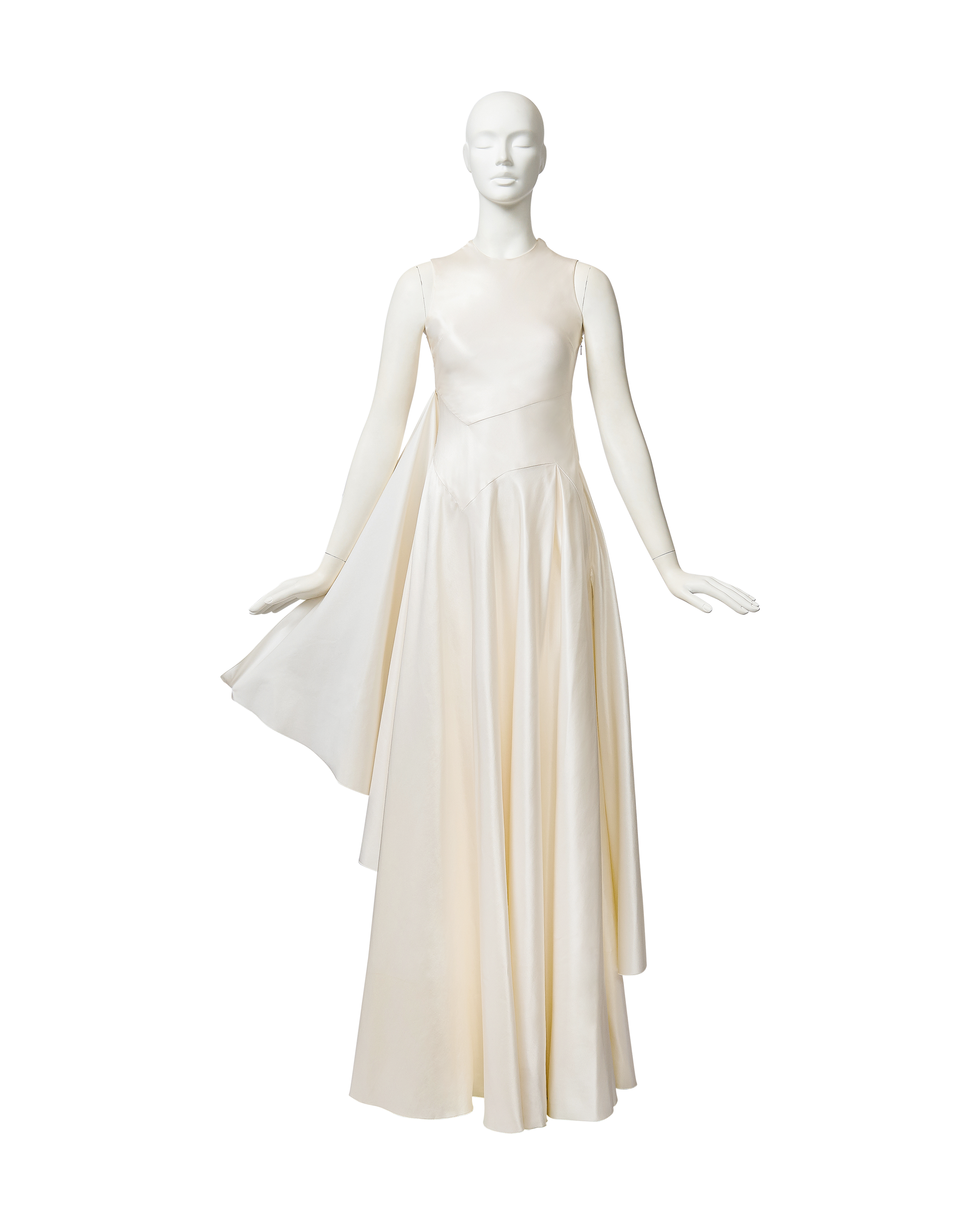 c. 2010 Calvin Klein Collection Black Label ivory sleeveless gown. Fitted ivory / off-white dress with asymmetrical overlay paneling. Concealed asymmetrical back zip closure with two hook-and-eye closures at shoulder, and concealed side zip closure. Fabric Contents: 65% Silk and 35% Cotton blend with 100% Silk lining. In good vintage condition with slight spotting throughout hemline (faintly visible when worn). Has been taken to the couture cleaner and arrives ready-to-wear.