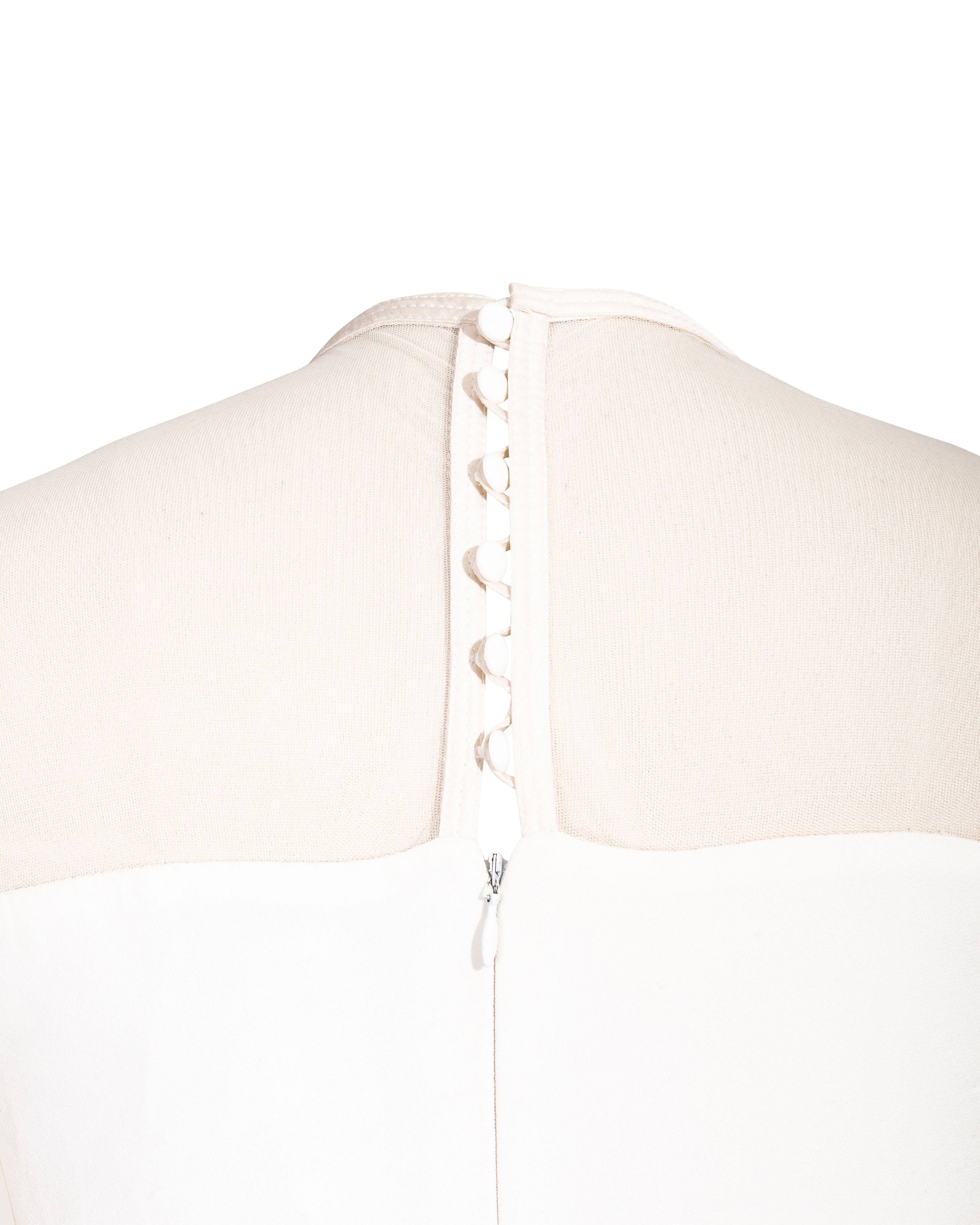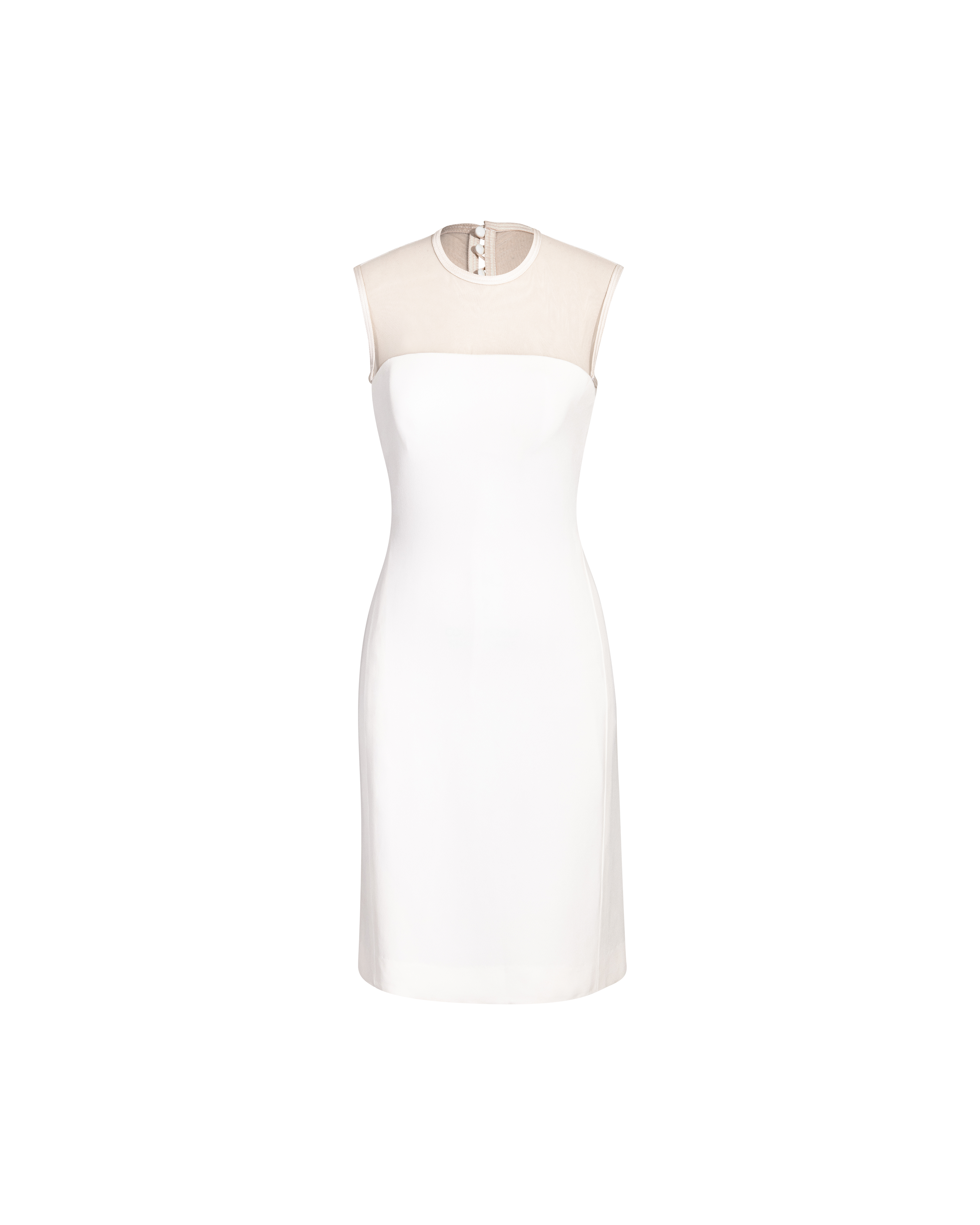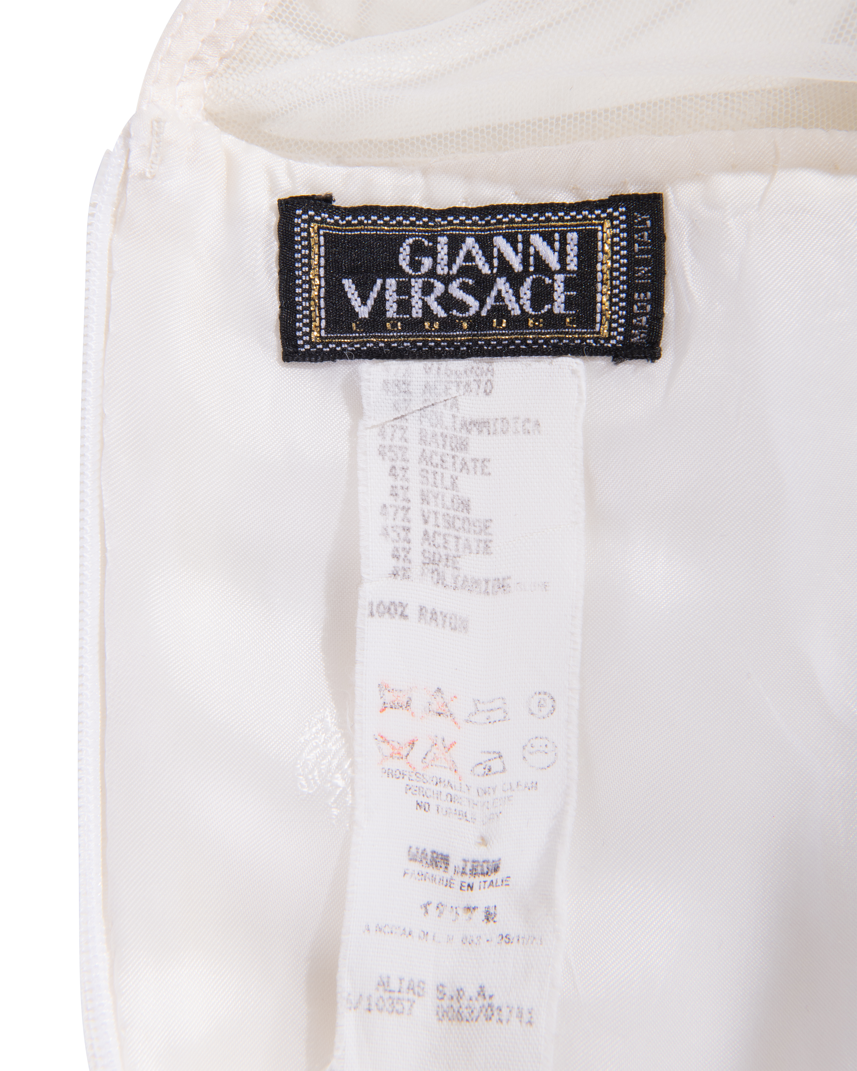 S/S 1996 Gianni Versace white mesh mini dress. Sleeveless mini dress with mesh scoop neck upper and sides, and 'strapless' bustier sheath dress. Lined with signature Medusa head white lining. Built-in bra cups (removable as desired). Back zip and oversized plastic back button and loop closures. Fabric Contents: 47% Rayon; 45% Acetate; 4% Silk and 4% Nylon with 100% Rayon lining. Similar featured on runway. In very good vintage condition with minor runs and snags throughout (not noticeable when worn).