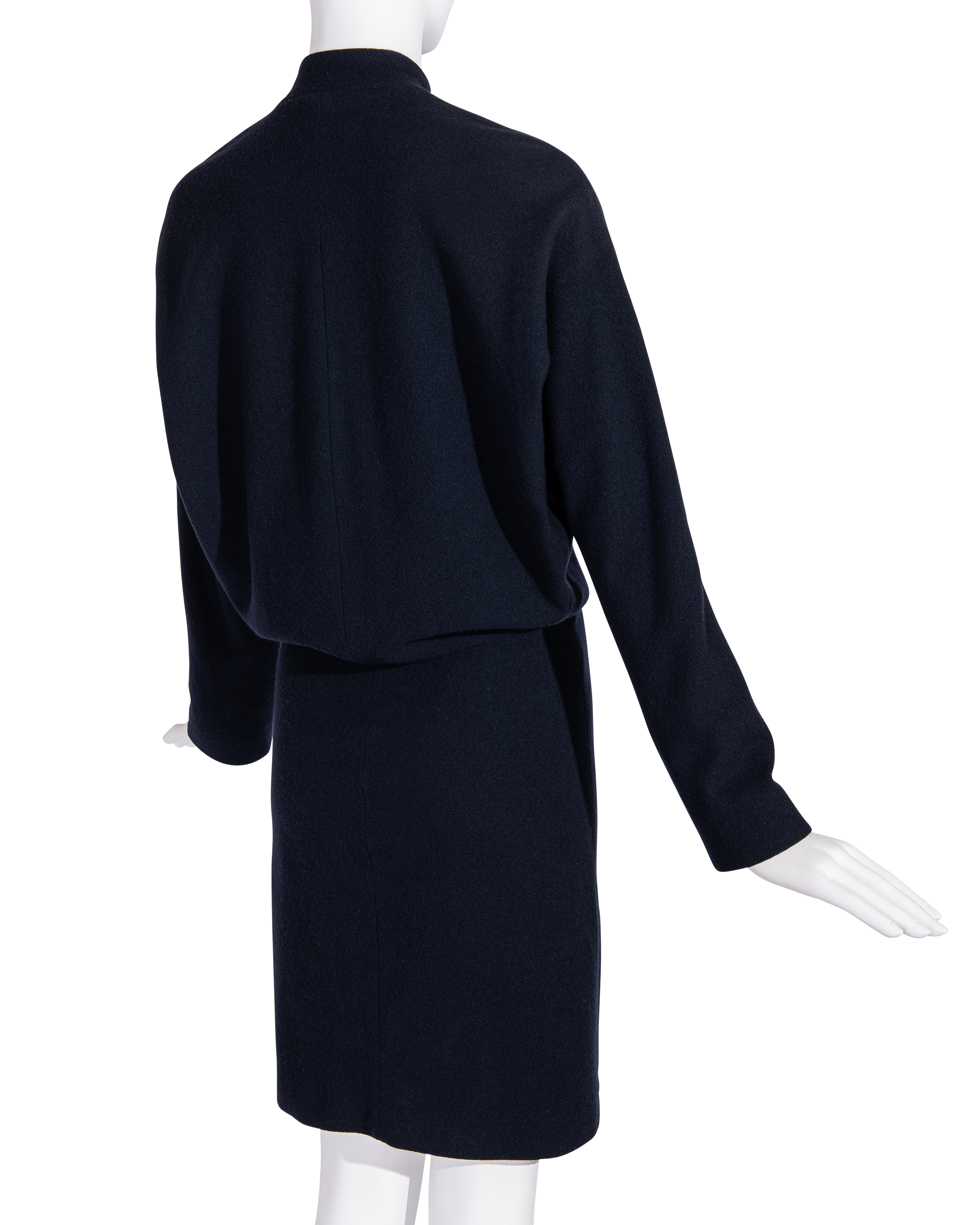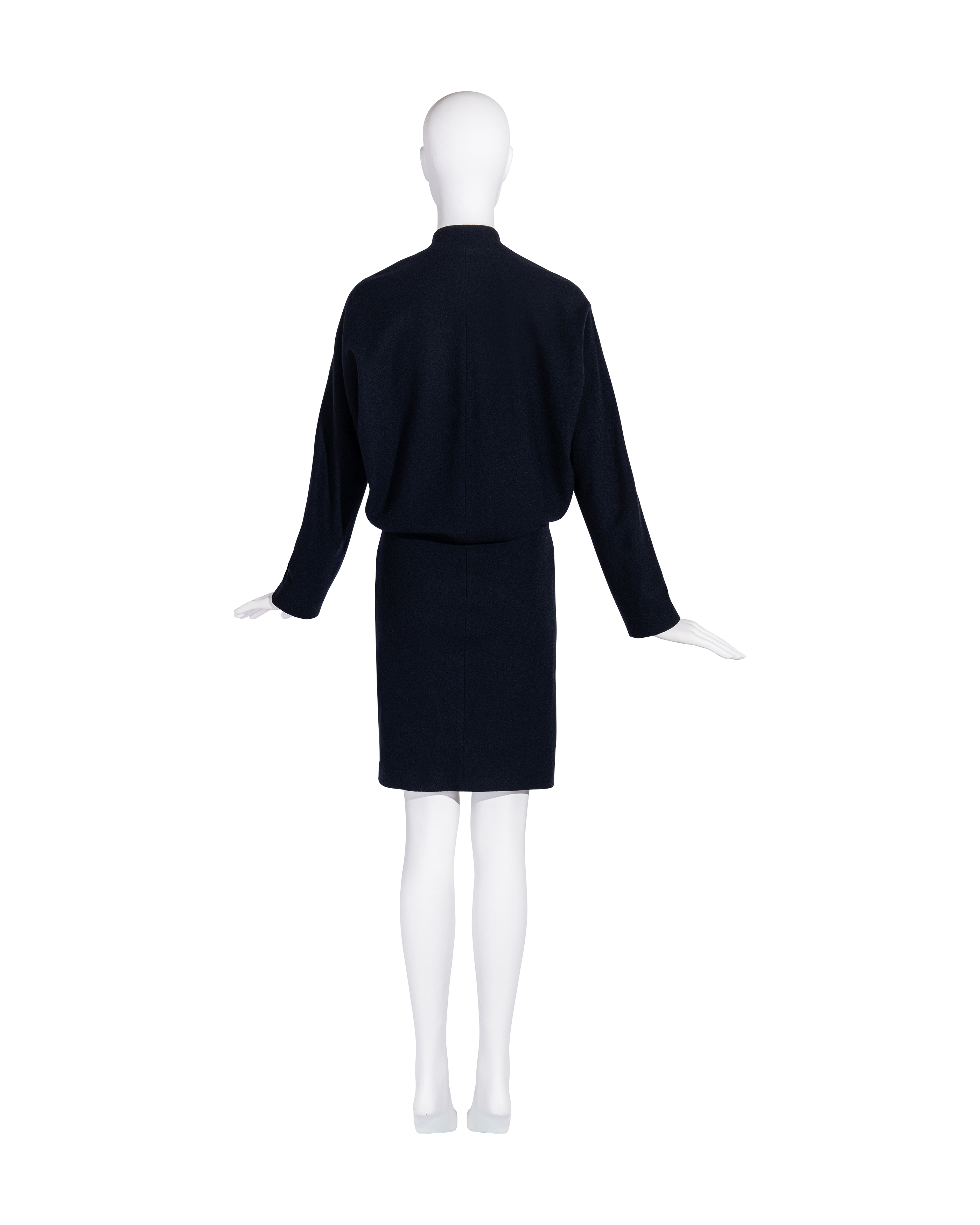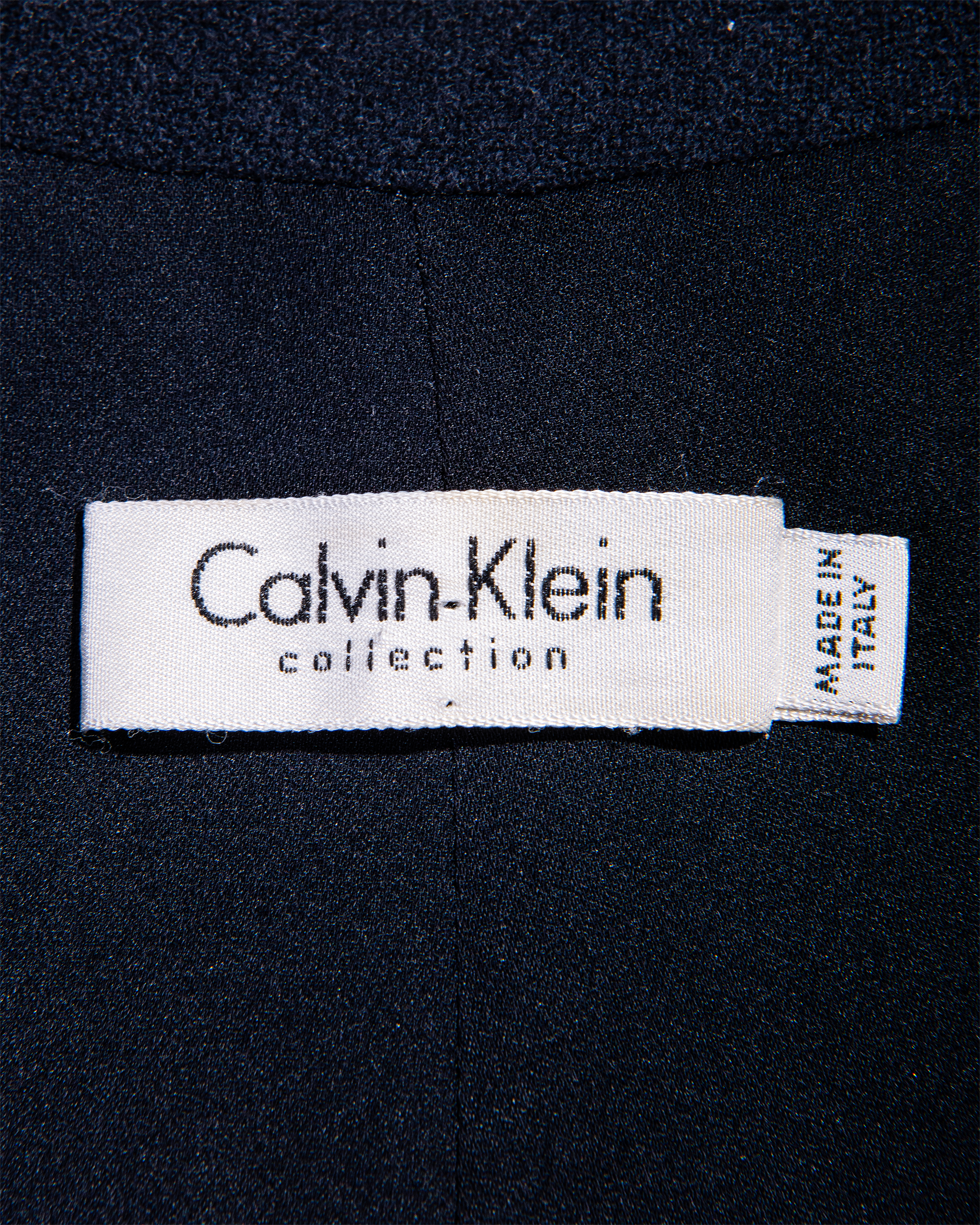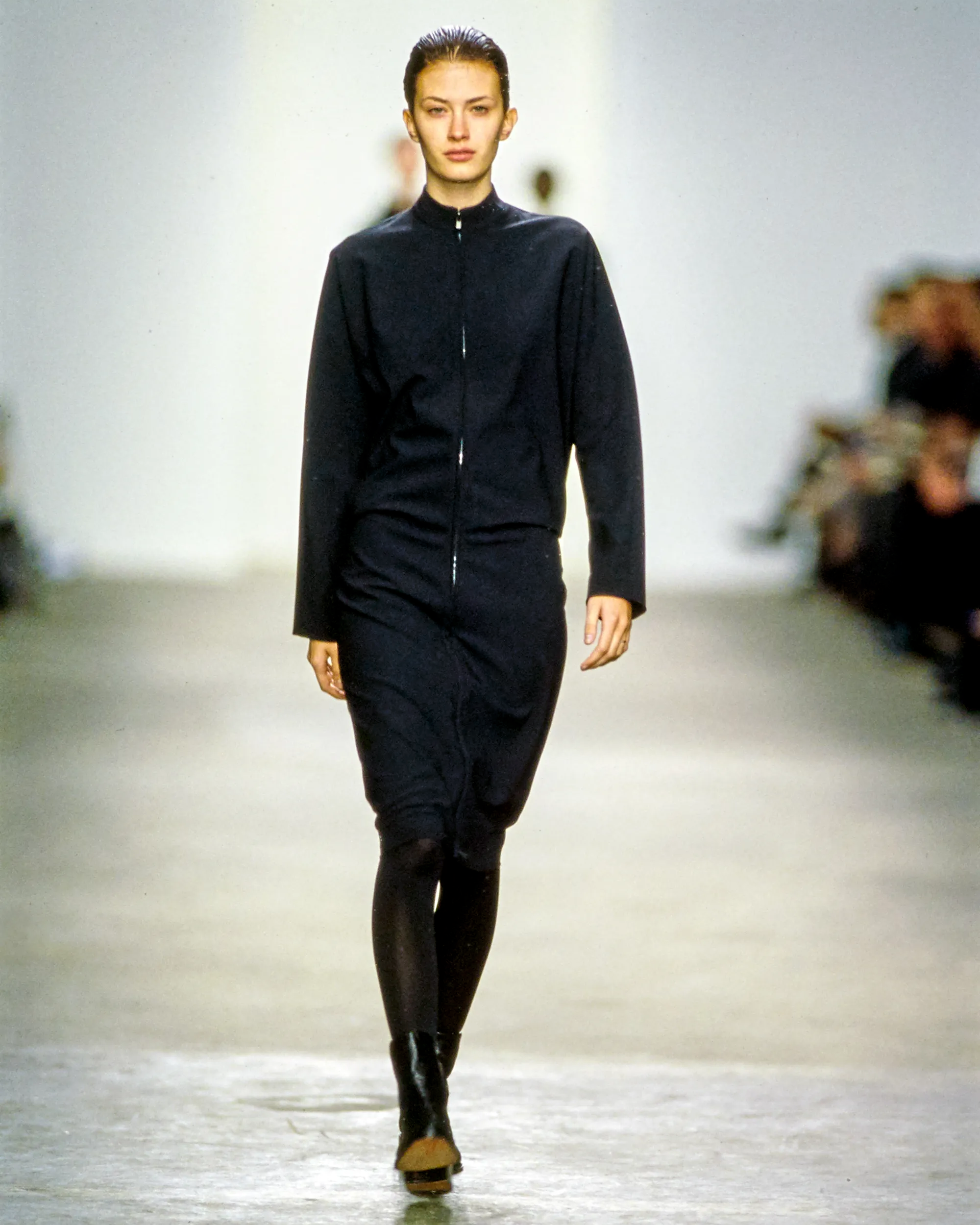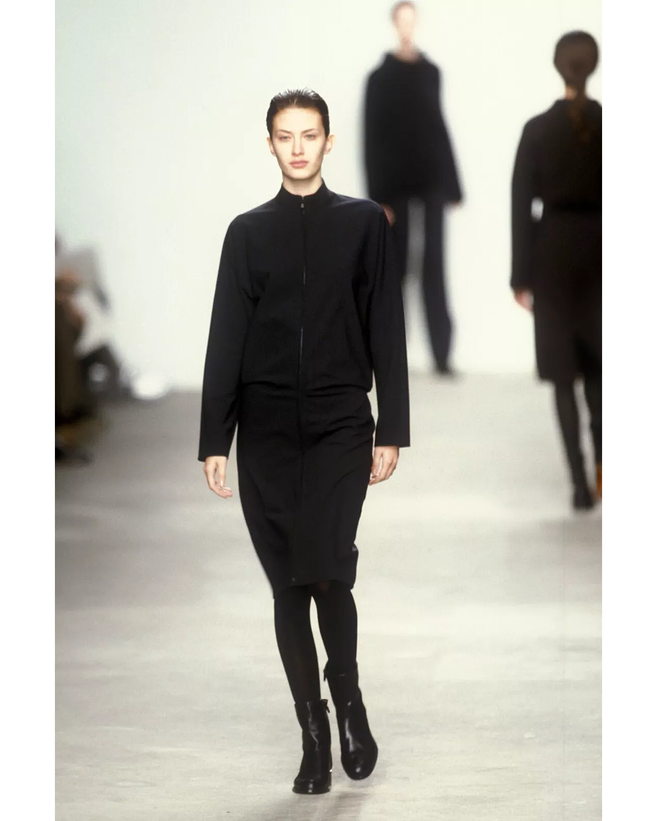 A/W 1998 Calvin Klein Collection deep navy / black zipper stretch wool dress. Above-knee long sleeve cool black / deep navy dress with gunmetal front zip closure (from hemline to mock neck - unzips fully as desired). Features beetle back draping with fitted back waist, and subtle batwing construction at sleeve. Fabric Contents: 94% Wool, 2% Nylon and 4% Spandex blend with 100% Silk lining. As seen on the runway (Look #8) on Rhea Durham. In very good vintage condition with light wear throughout - very small wear spot at front (unnoticeable when worn).