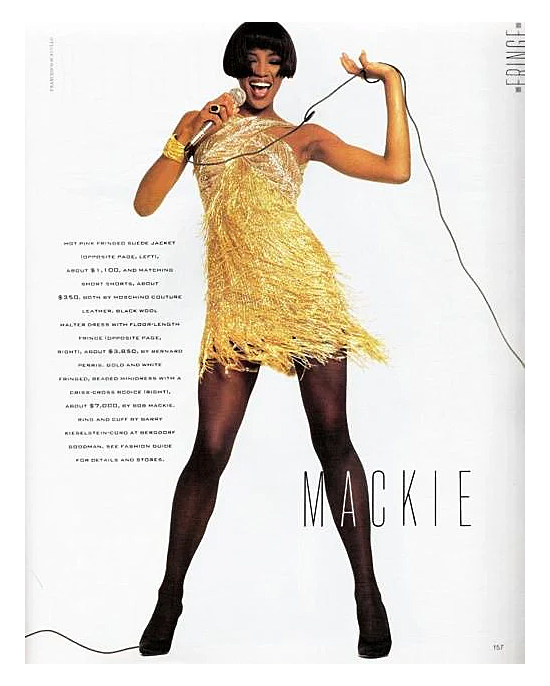 A/W 1990 Bob Mackie embellished gold fringe mini dress. Sleeveless fitted mini sheath dress with gold-tone beaded fringe, and leaf pattern white and gold embroidered bust. Semi-sheer tan mesh upper with black interior bra cups (non-original; removable as desired). Semi-open back with concealed back zip closure. As seen on Naomi Campbell in Vogue Magazine. In excellent vintage condition with no flaws to note.