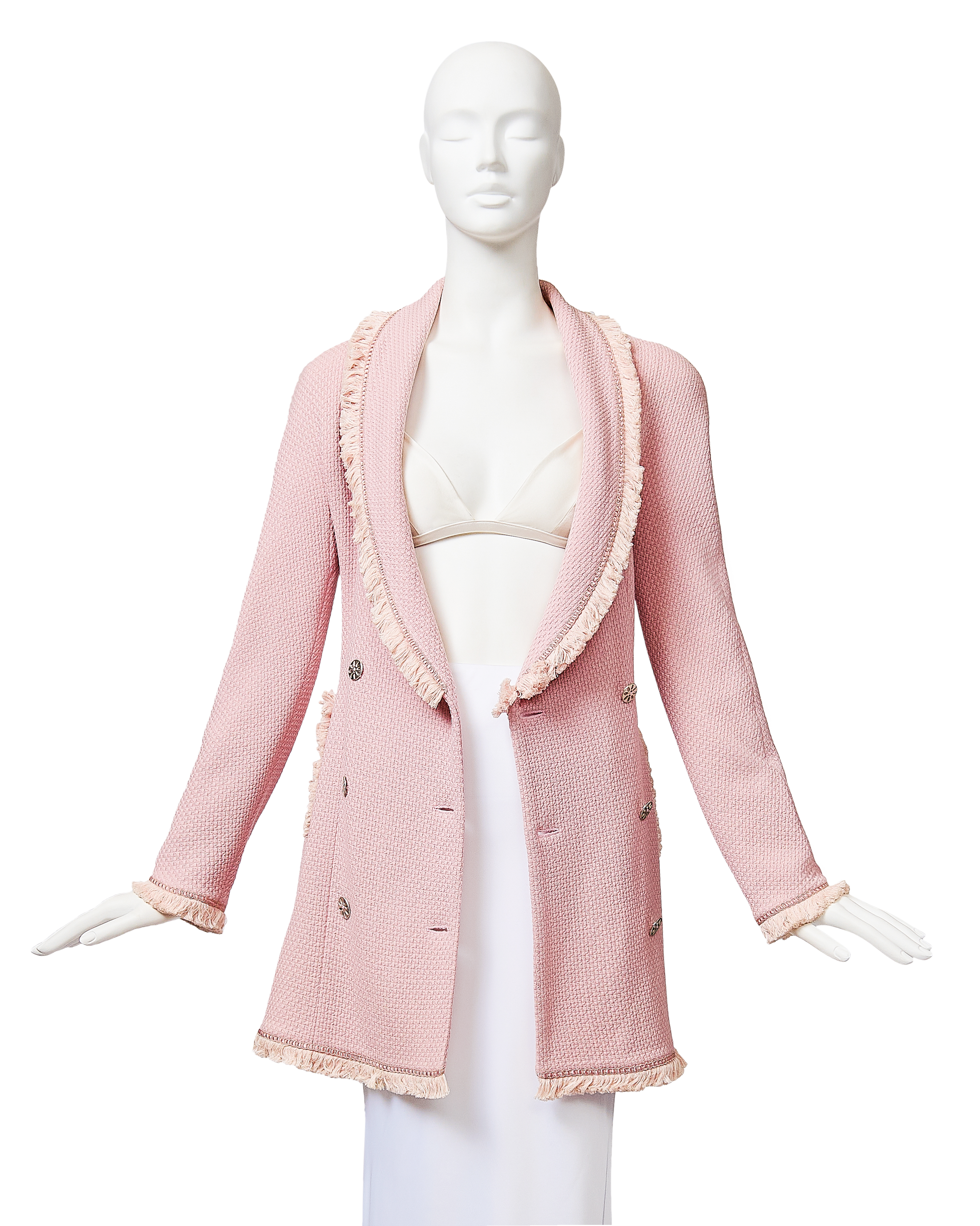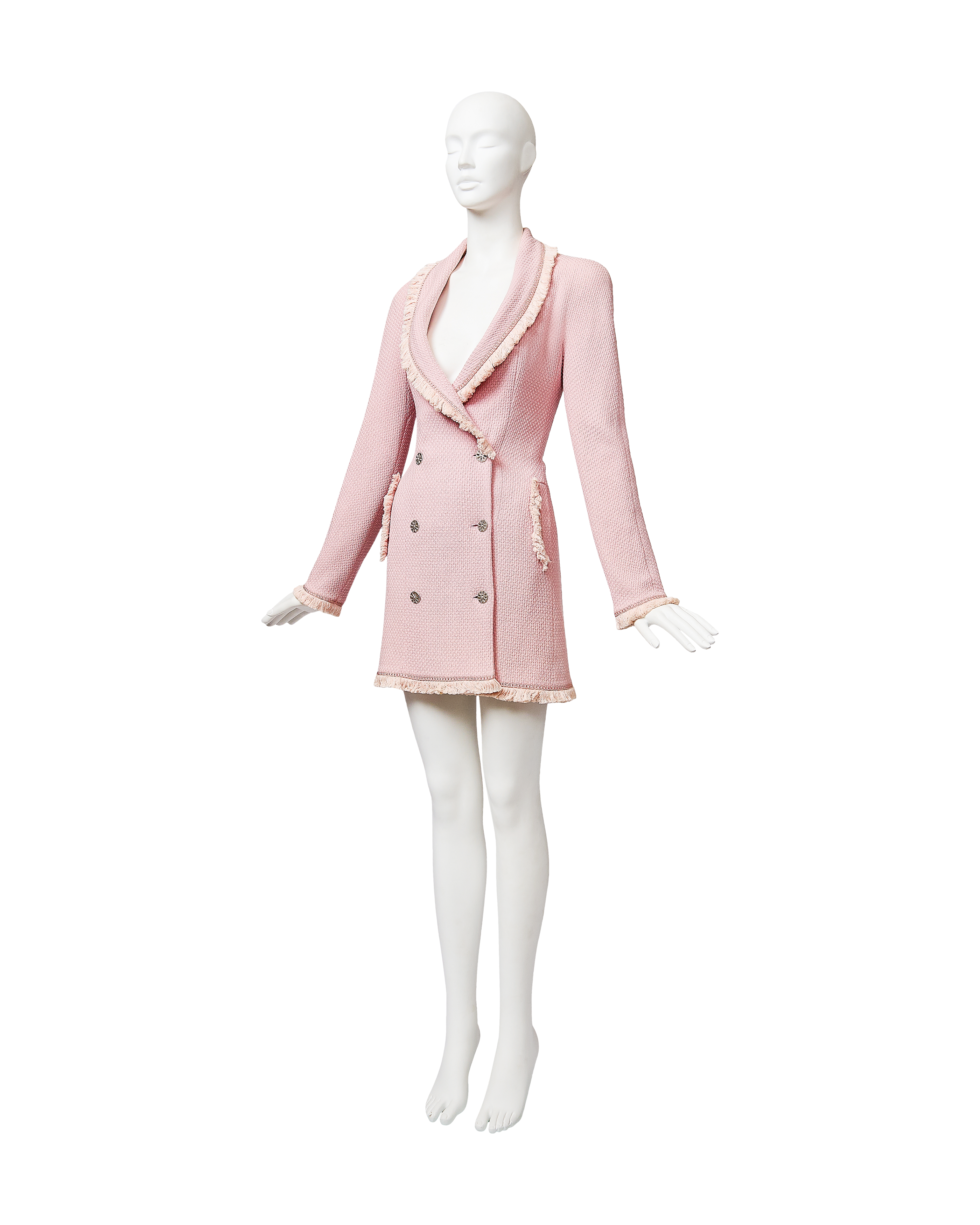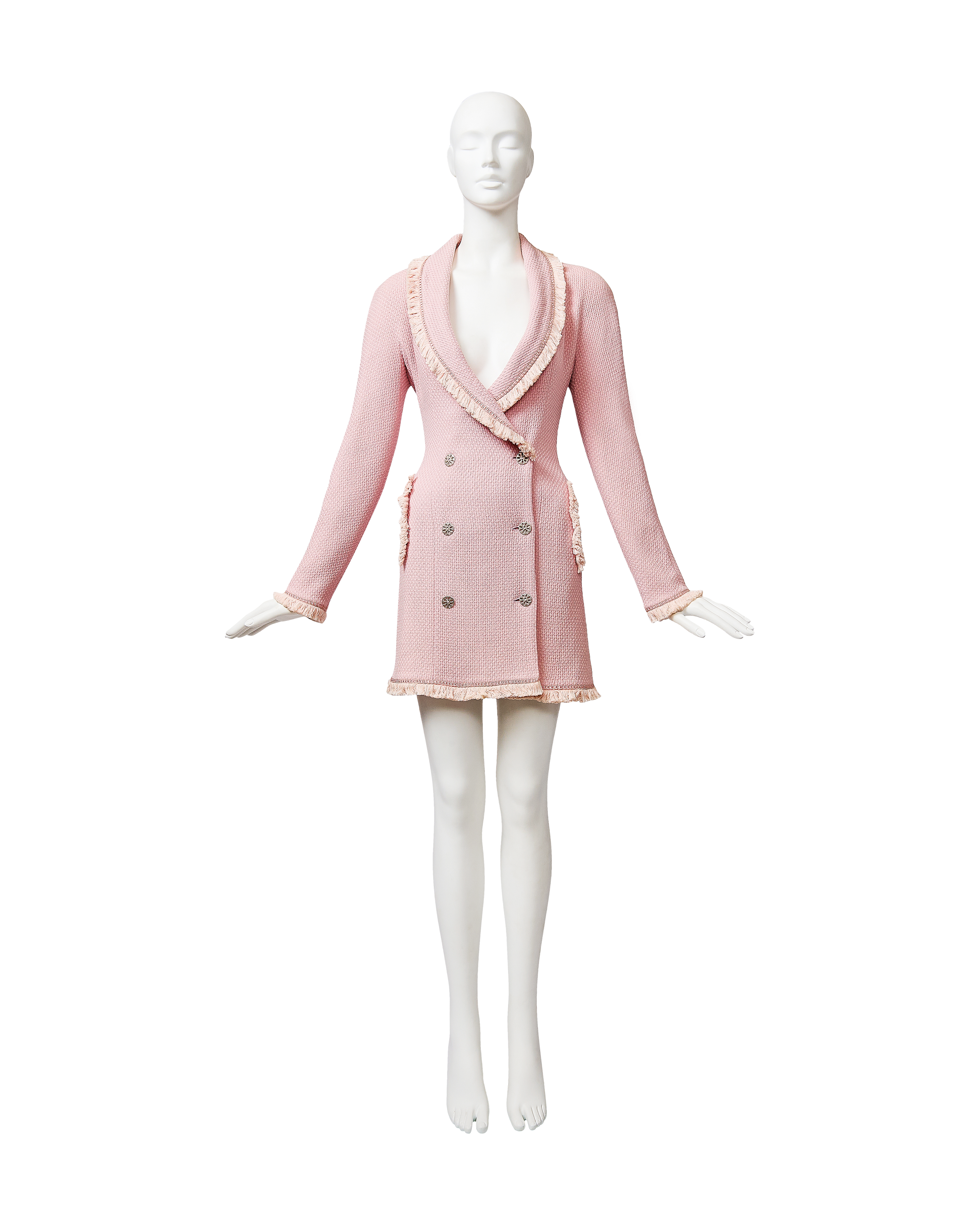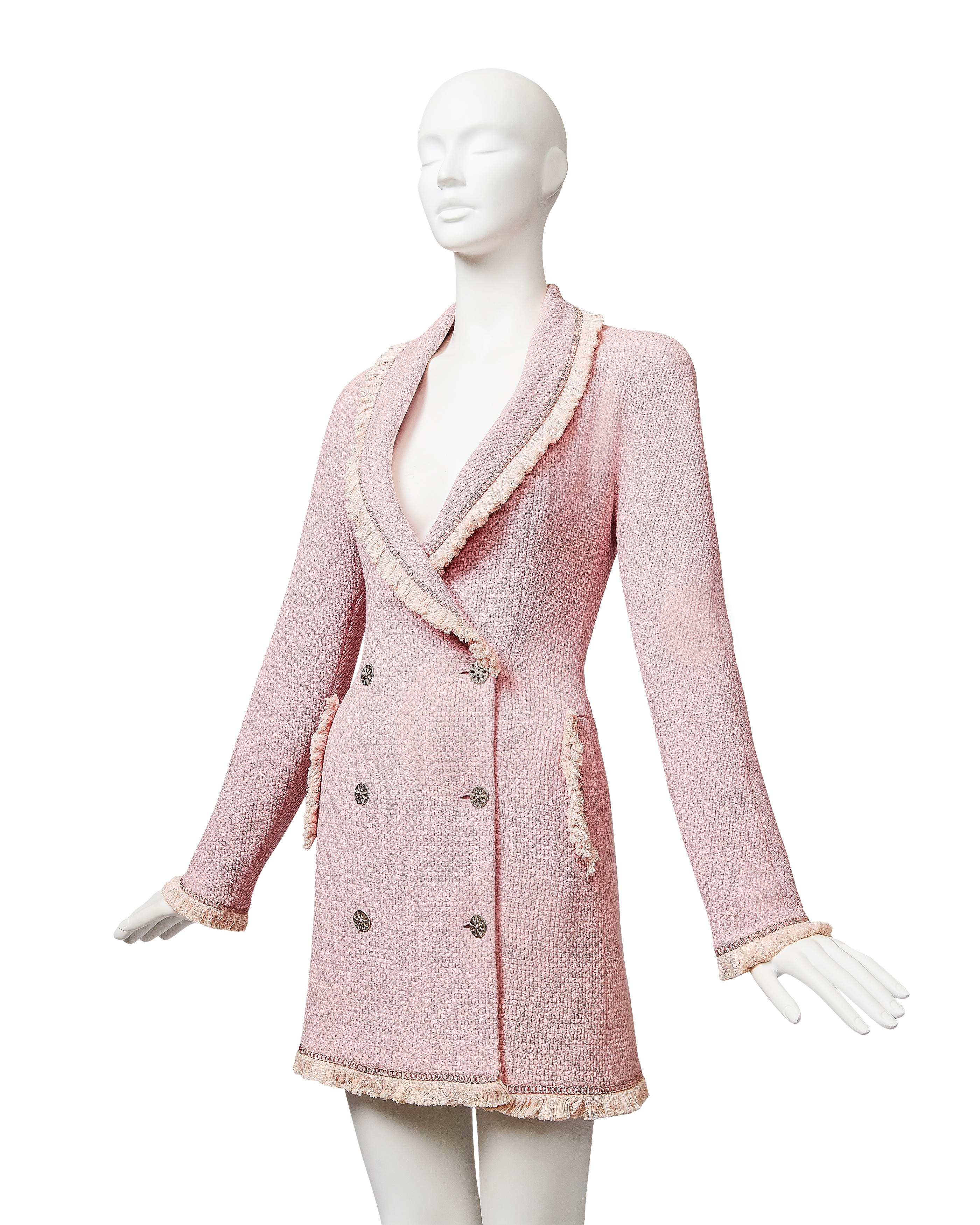 A/W 1997 Christian Dior by John Galliano pink double-breasted blazer dress. Long sleeve shawl collared fitted double-breasted blazer coat dress. Contrasting lighter pink fringe trim at collar, pockets, wrist and hemline. Silver-tone floral motif button closures and two interior pink button closures, with slight shoulder pads. Fabric Contents: 100% Wool (boucle) with 100% Silk lining. As seen on the runway from John Galliano's first year at Christian Dior. In very good vintage condition with extremely faint spot at interior (unnoticeable when worn); has been taken to couture cleaner and arrives ready to wear.