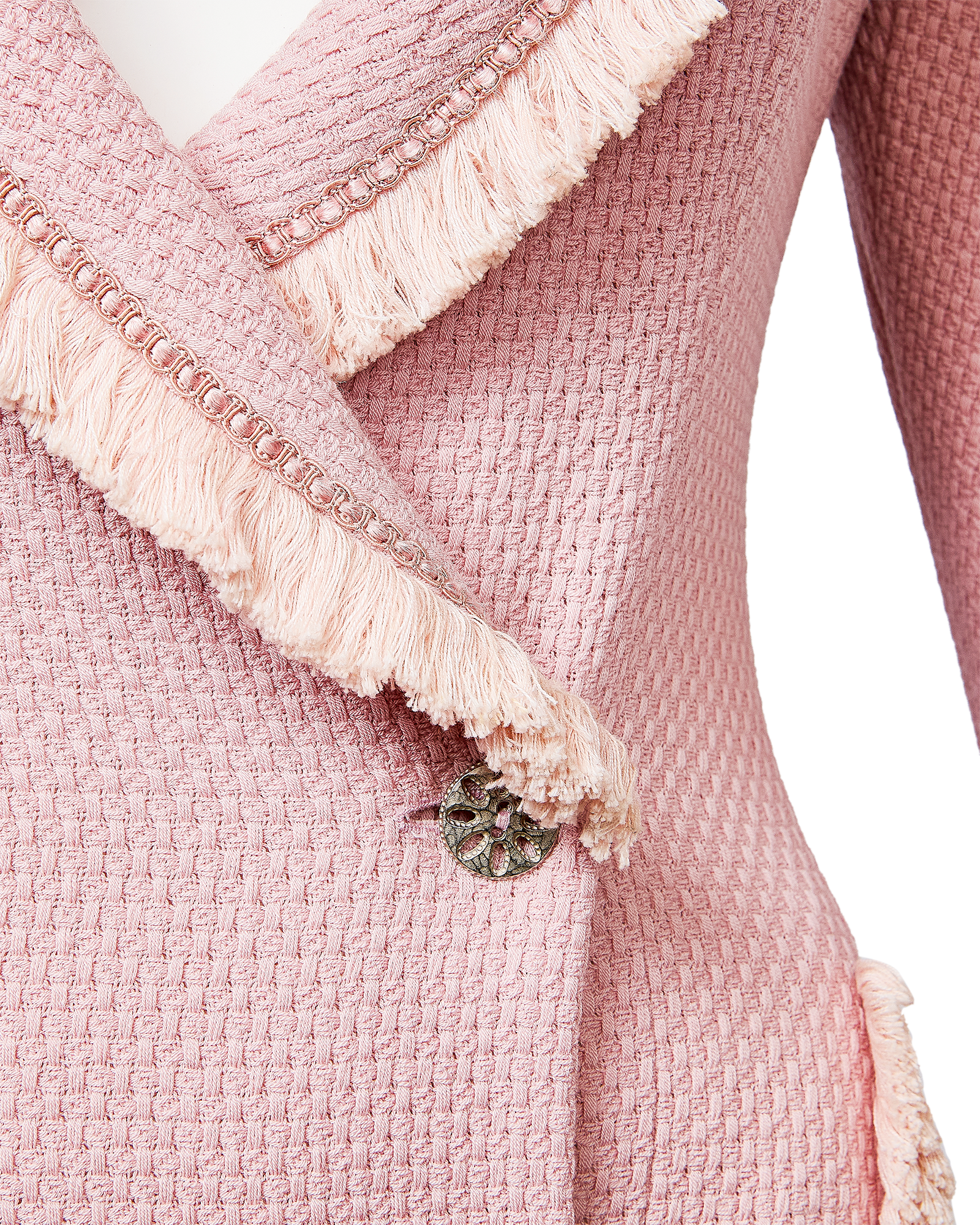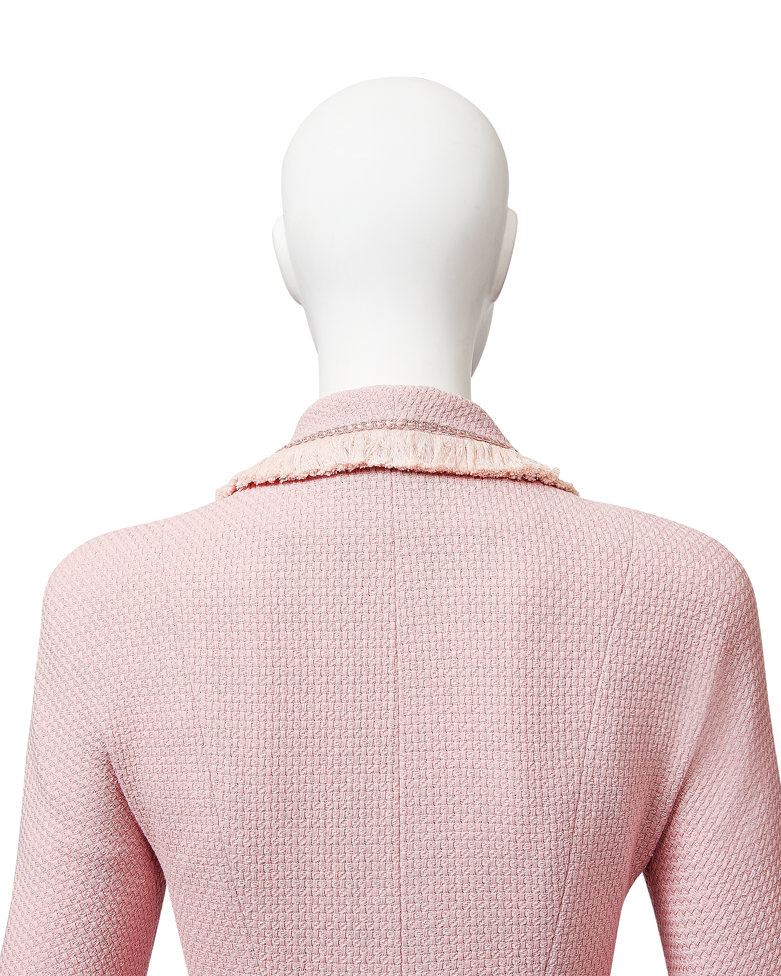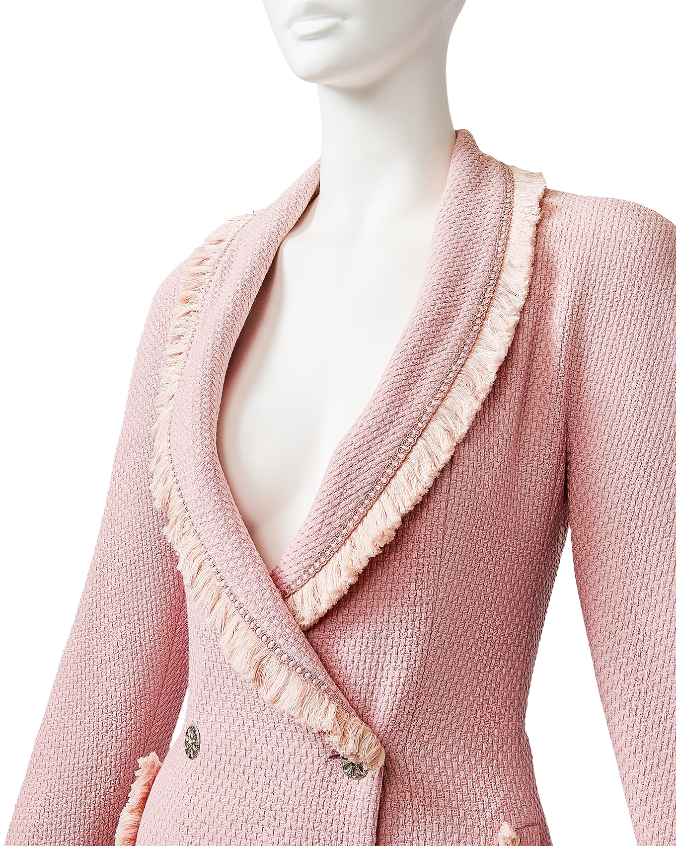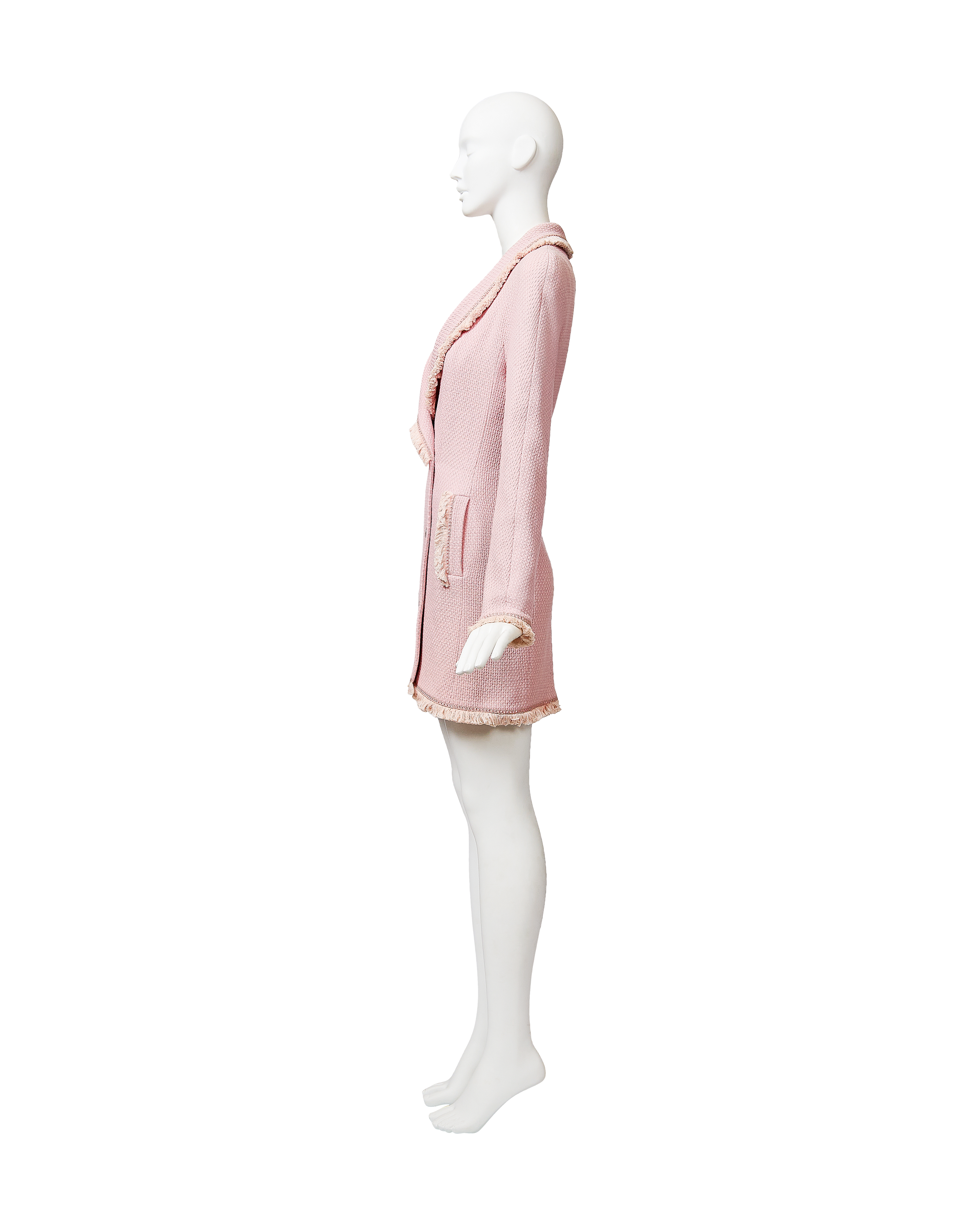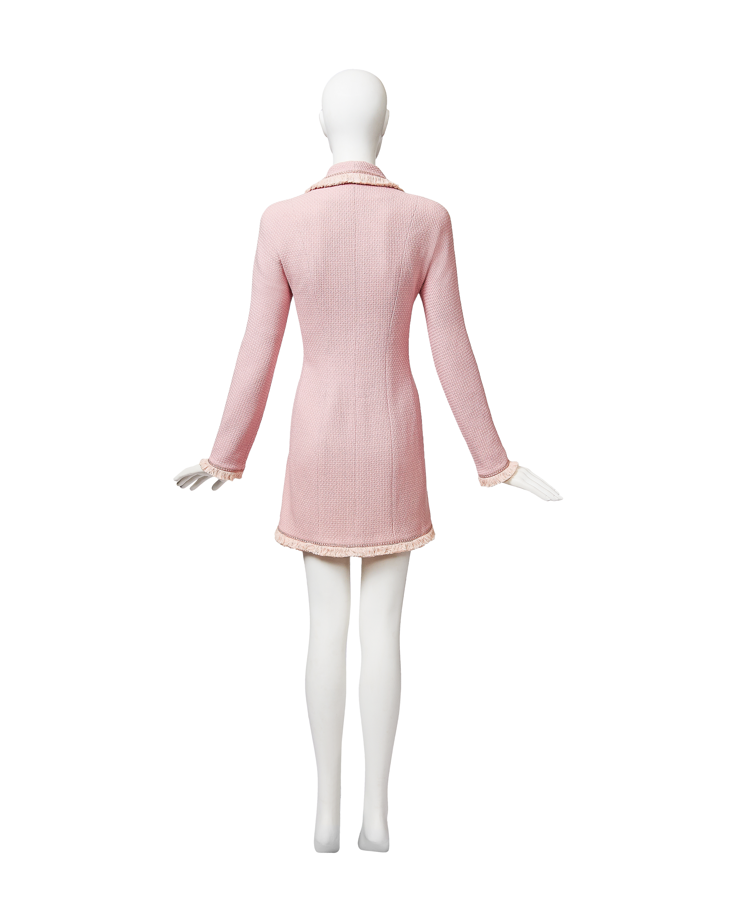 A/W 1997 Christian Dior by John Galliano pink double-breasted blazer dress. Long sleeve shawl collared fitted double-breasted blazer coat dress. Contrasting lighter pink fringe trim at collar, pockets, wrist and hemline. Silver-tone floral motif button closures and two interior pink button closures, with slight shoulder pads. Fabric Contents: 100% Wool (boucle) with 100% Silk lining. As seen on the runway from John Galliano's first year at Christian Dior. In very good vintage condition with extremely faint spot at interior (unnoticeable when worn); has been taken to couture cleaner and arrives ready to wear.