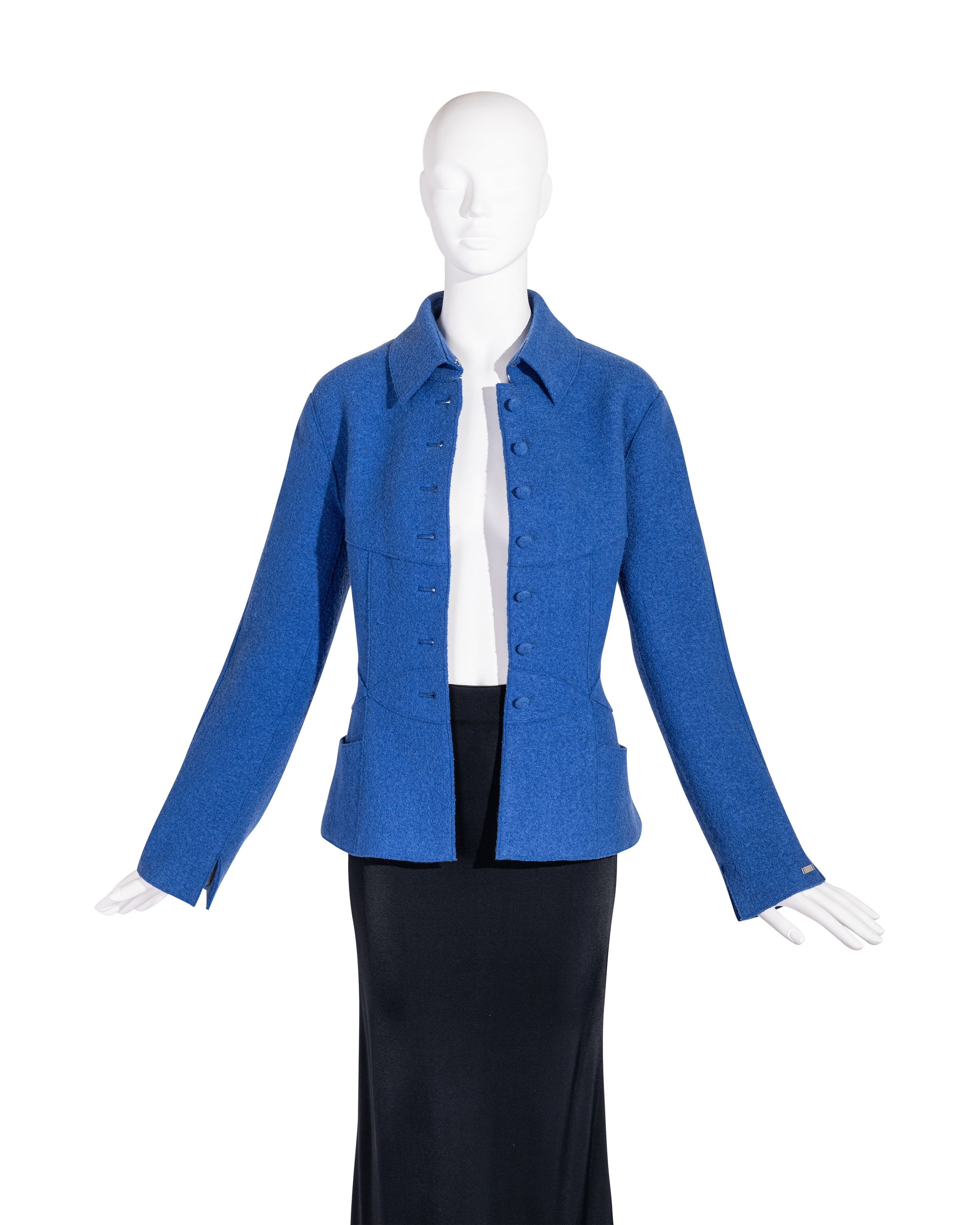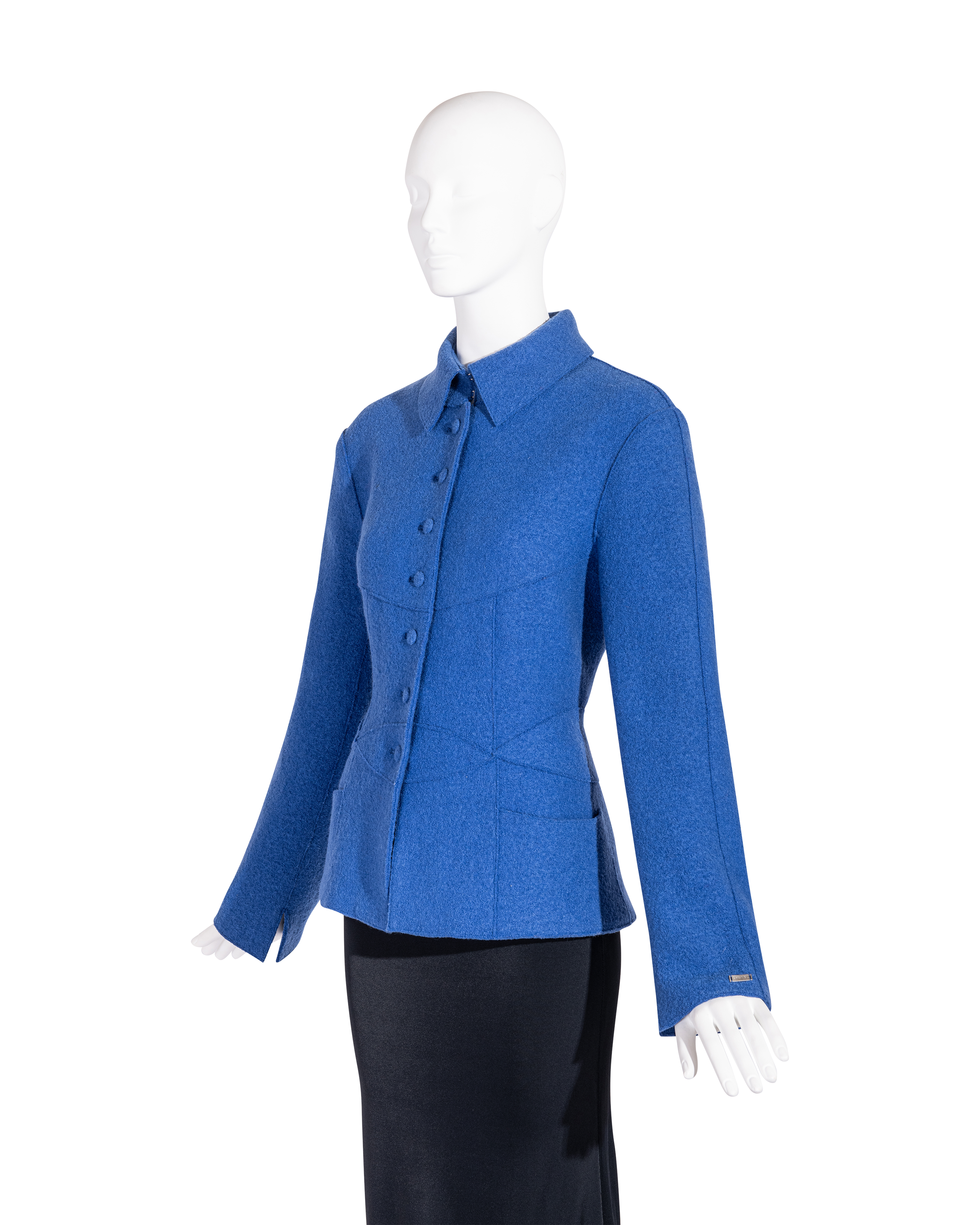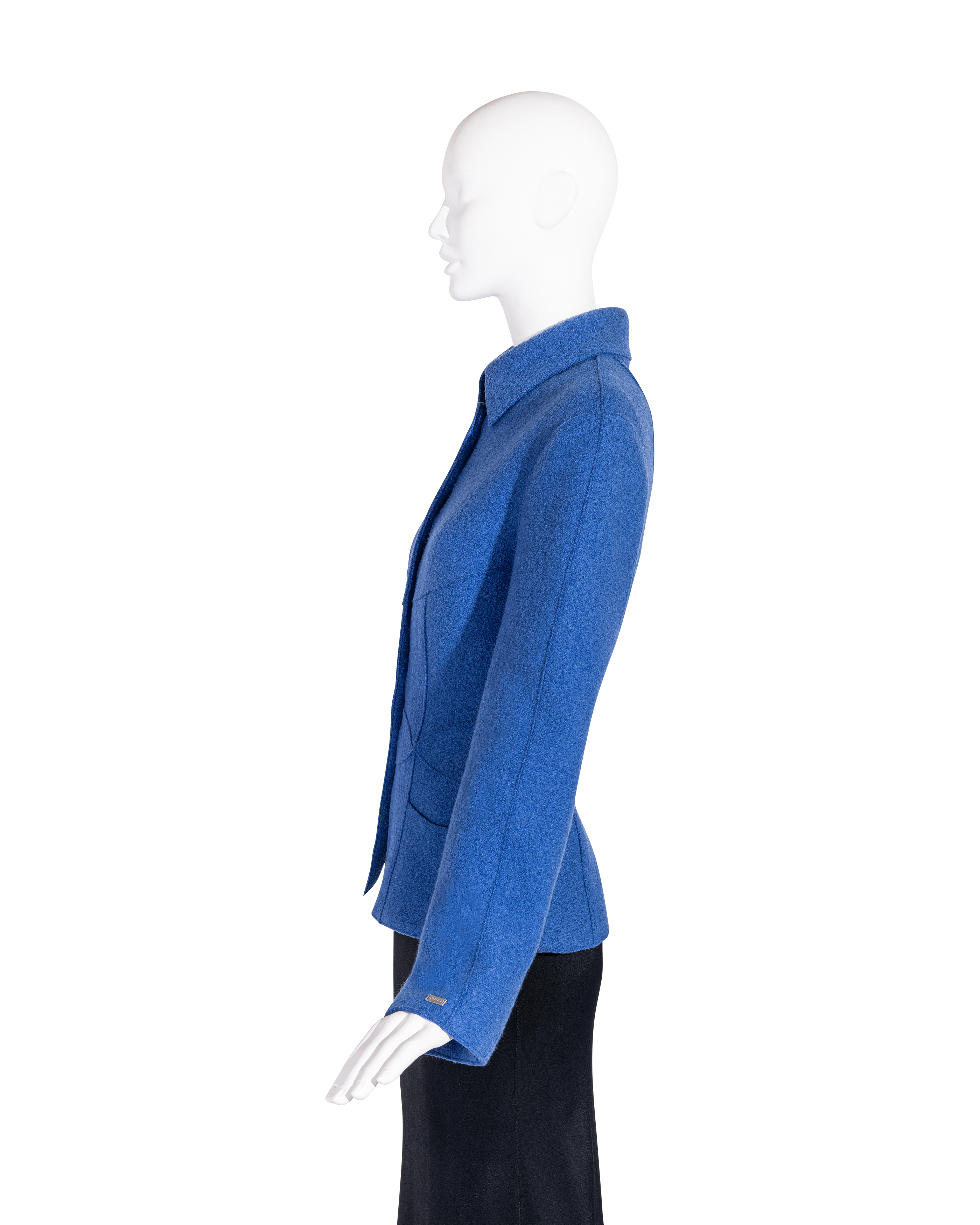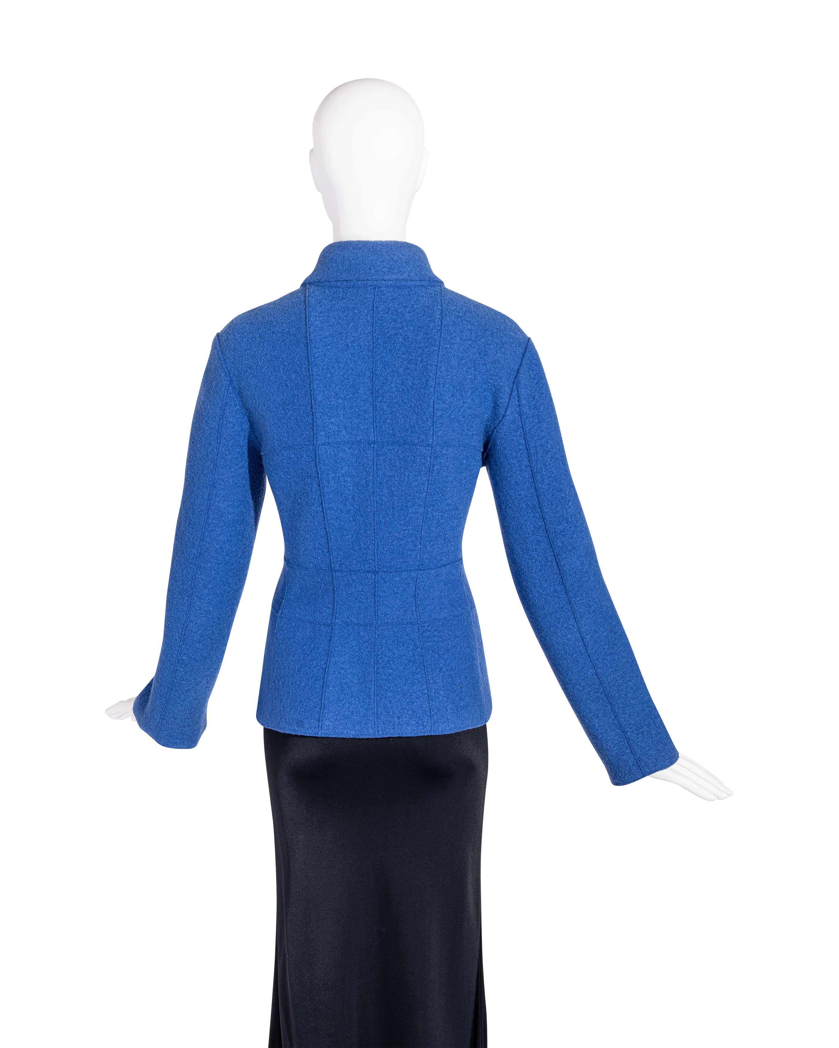 A/W 1999 Chanel by Karl Lagerfeld cerulean blue wool collared jacket. Long sleeve pointed collar jacket with front button closures, featuring raised geometric seaming throughout (lattice pattern at front waist). Small 'Chanel' detail at wrist and silver-tone chain detail on interior. Fabric Contents: 100% Wool with 90% Silk and 10% Spandex lining. As seen on the runway (Look #12), and magenta colorway featured in the ad campaign. In very good vintage condition with light wear and pilling throughout, with small balding at back; otherwise new and comes with original brand tag.