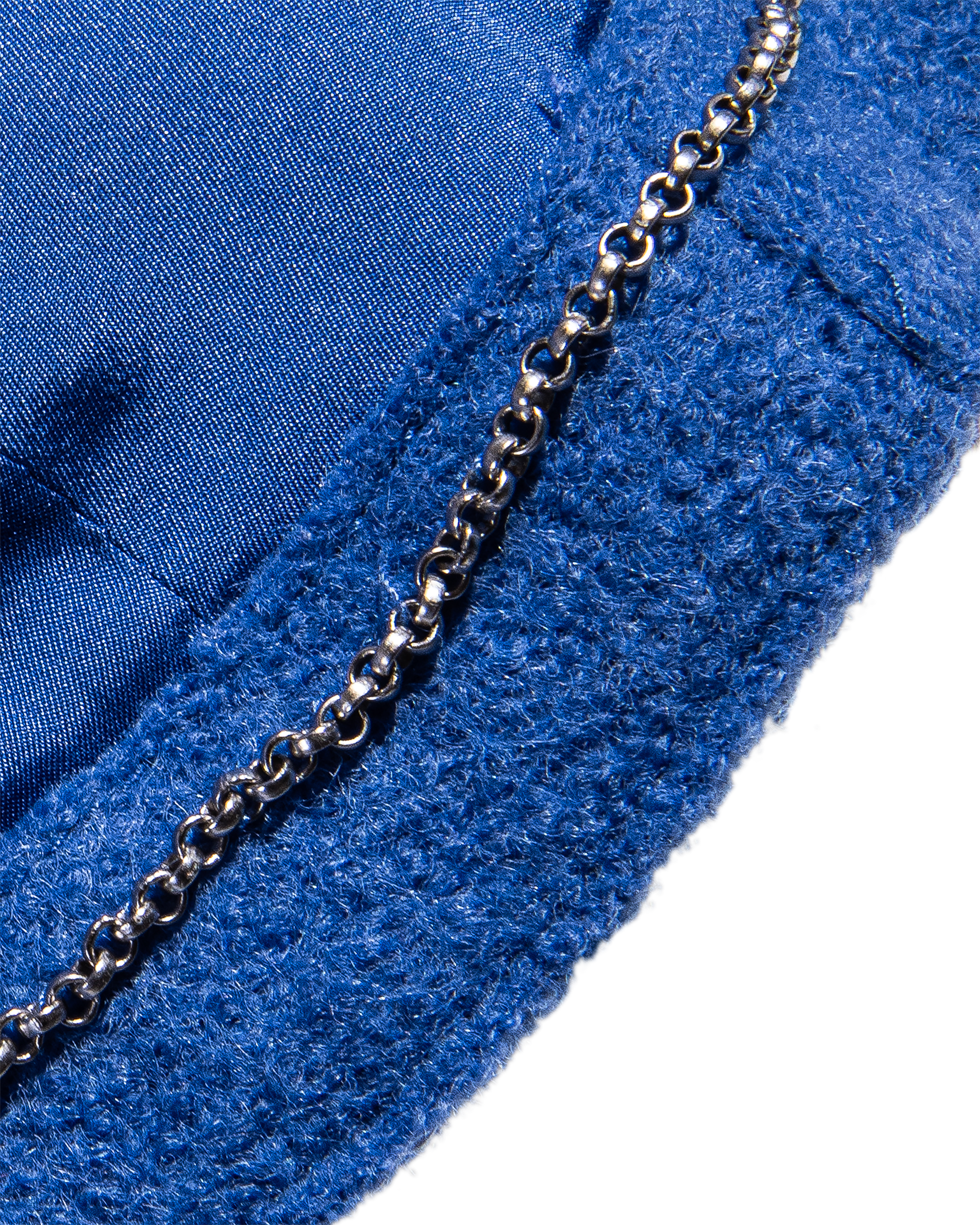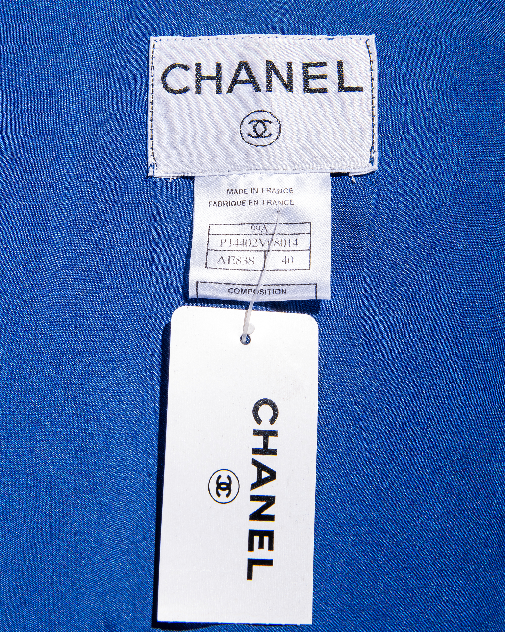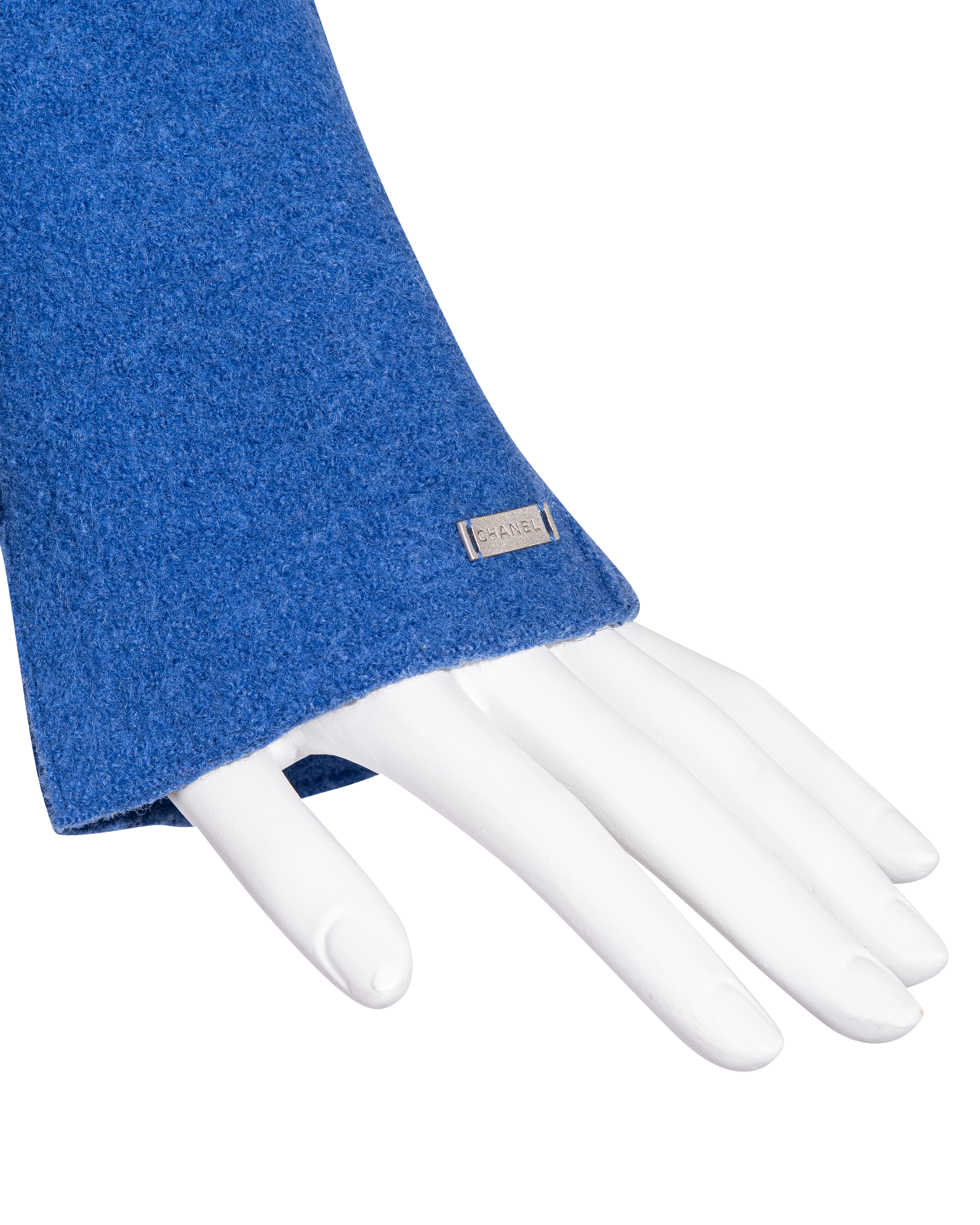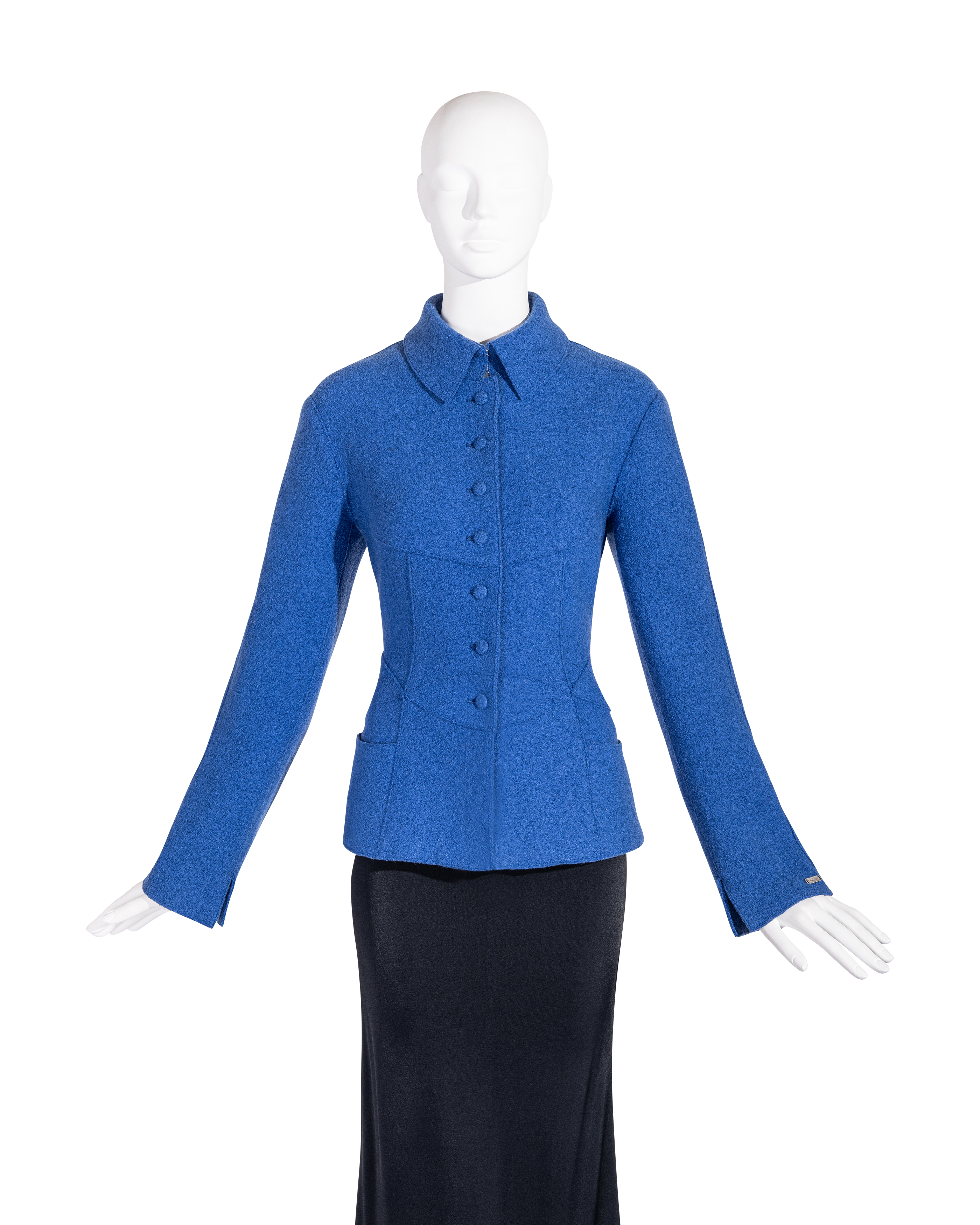 A/W 1999 Chanel by Karl Lagerfeld cerulean blue wool collared jacket. Long sleeve pointed collar jacket with front button closures, featuring raised geometric seaming throughout (lattice pattern at front waist). Small 'Chanel' detail at wrist and silver-tone chain detail on interior. Fabric Contents: 100% Wool with 90% Silk and 10% Spandex lining. As seen on the runway (Look #12), and magenta colorway featured in the ad campaign. In very good vintage condition with light wear and pilling throughout, with small balding at back; otherwise new and comes with original brand tag.