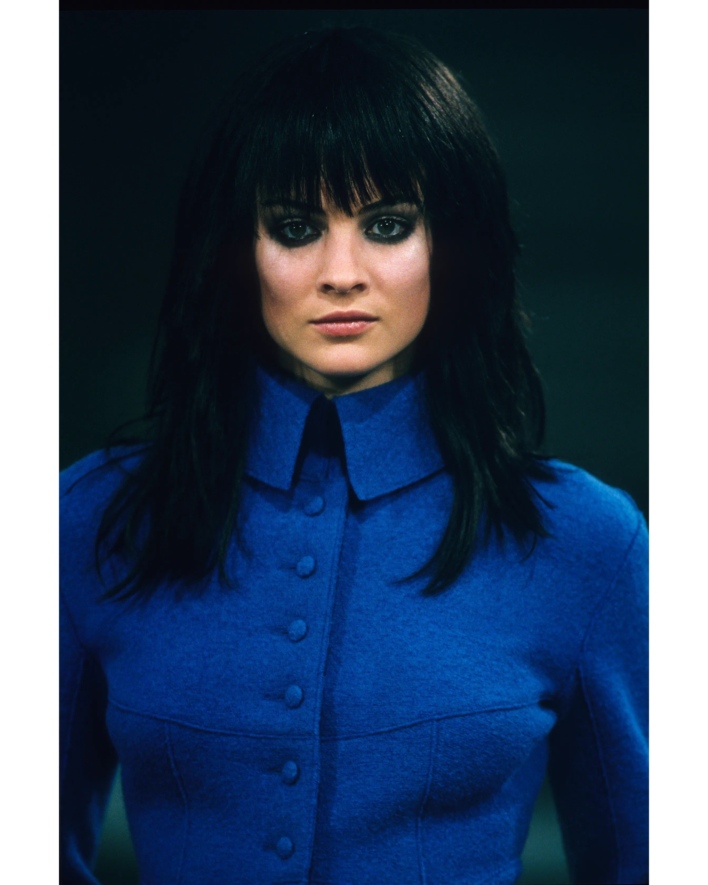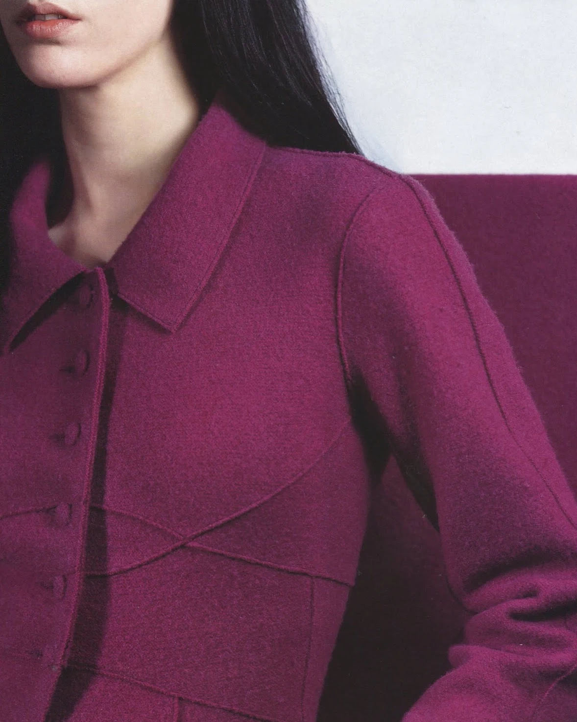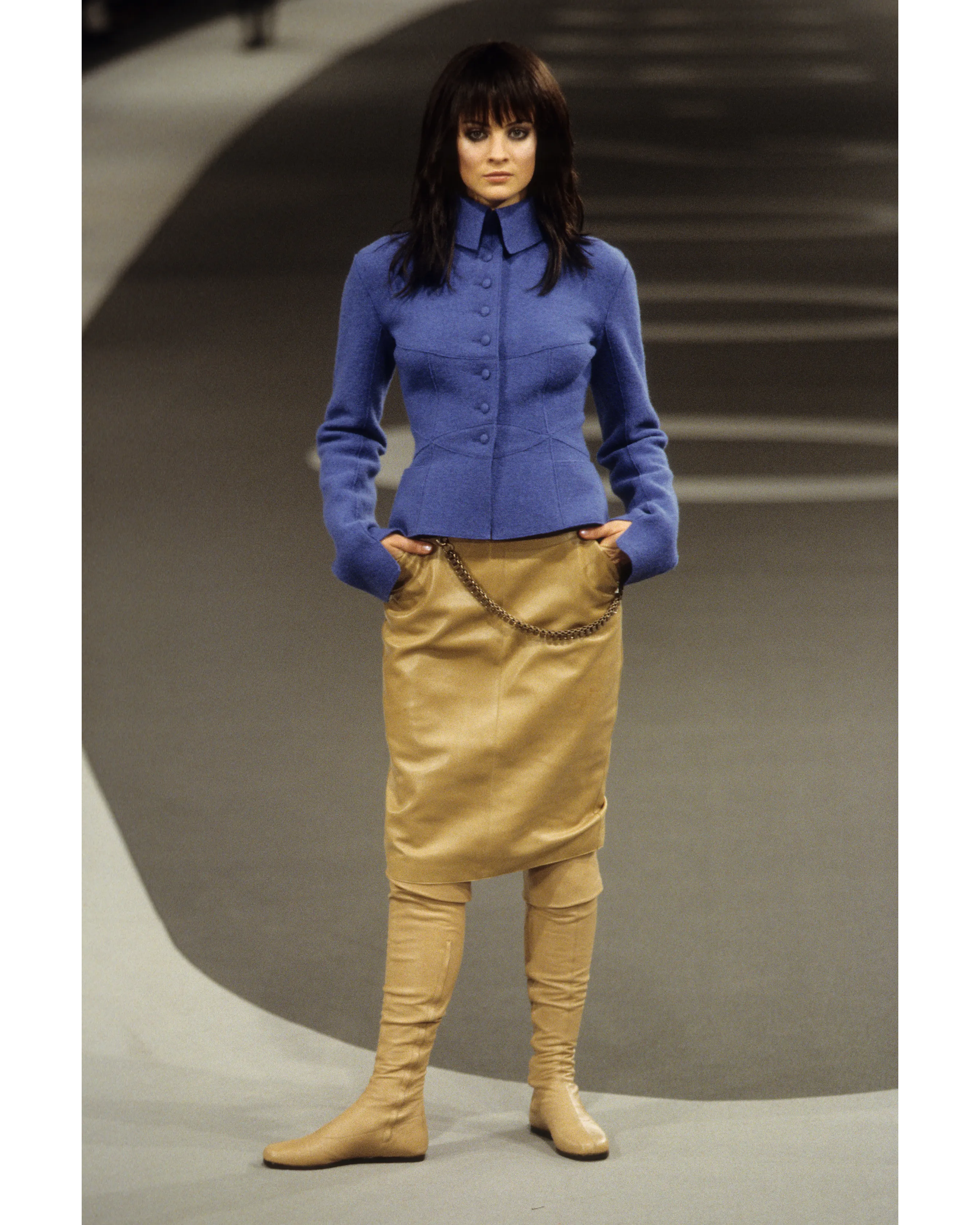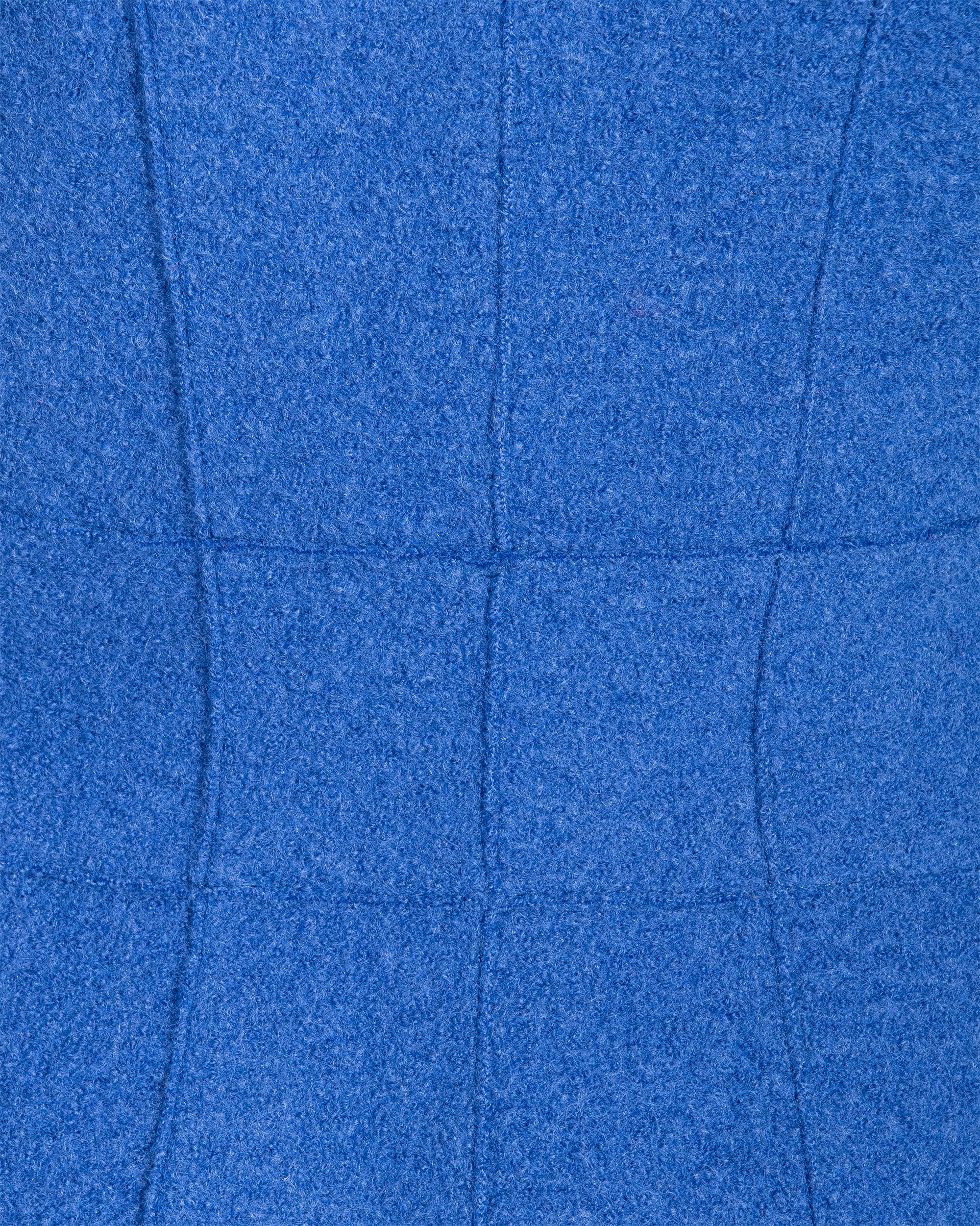 A/W 1999 Chanel by Karl Lagerfeld cerulean blue wool collared jacket. Long sleeve pointed collar jacket with front button closures, featuring raised geometric seaming throughout (lattice pattern at front waist). Small 'Chanel' detail at wrist and silver-tone chain detail on interior. Fabric Contents: 100% Wool with 90% Silk and 10% Spandex lining. As seen on the runway (Look #12), and magenta colorway featured in the ad campaign. In very good vintage condition with light wear and pilling throughout, with small balding at back; otherwise new and comes with original brand tag.