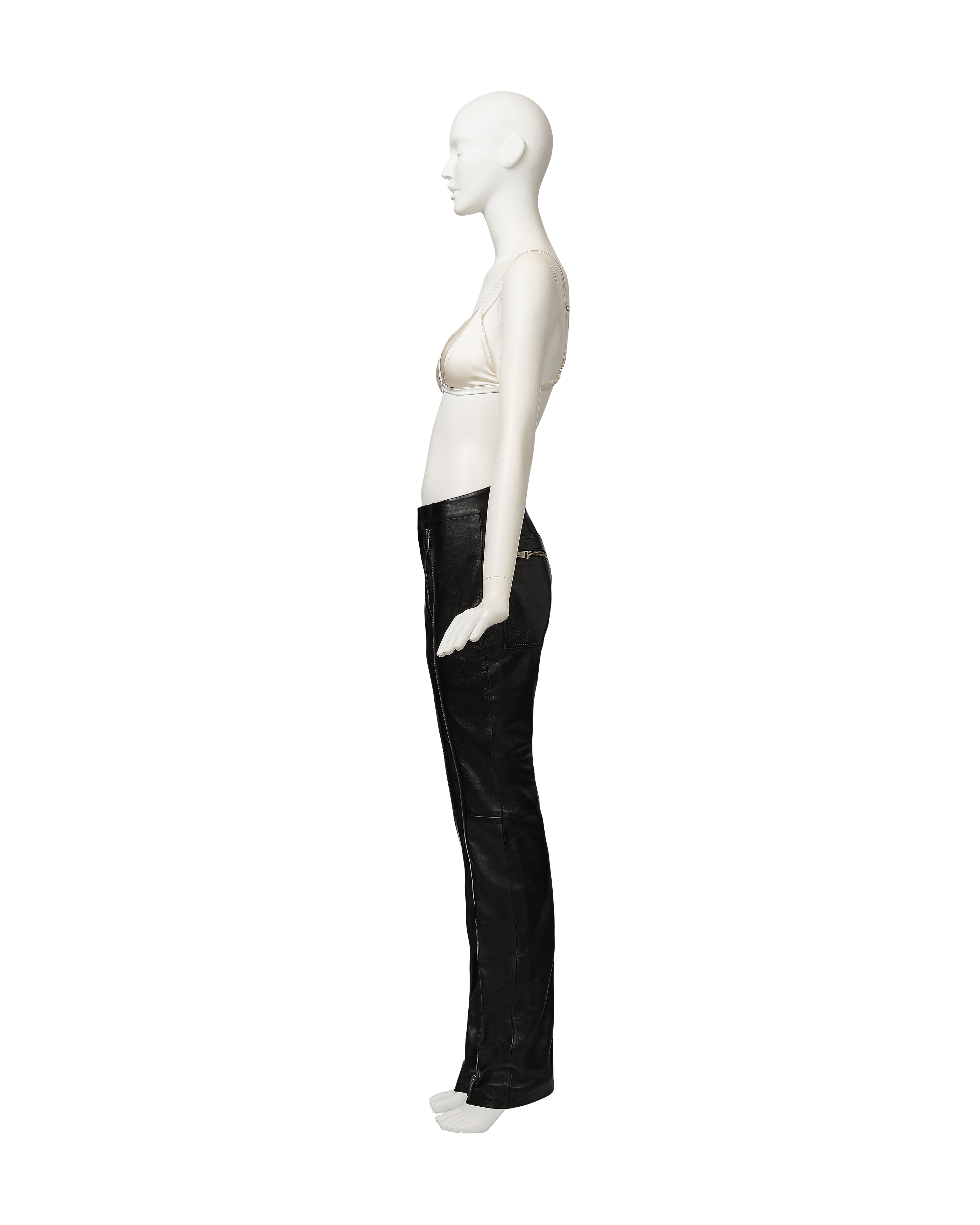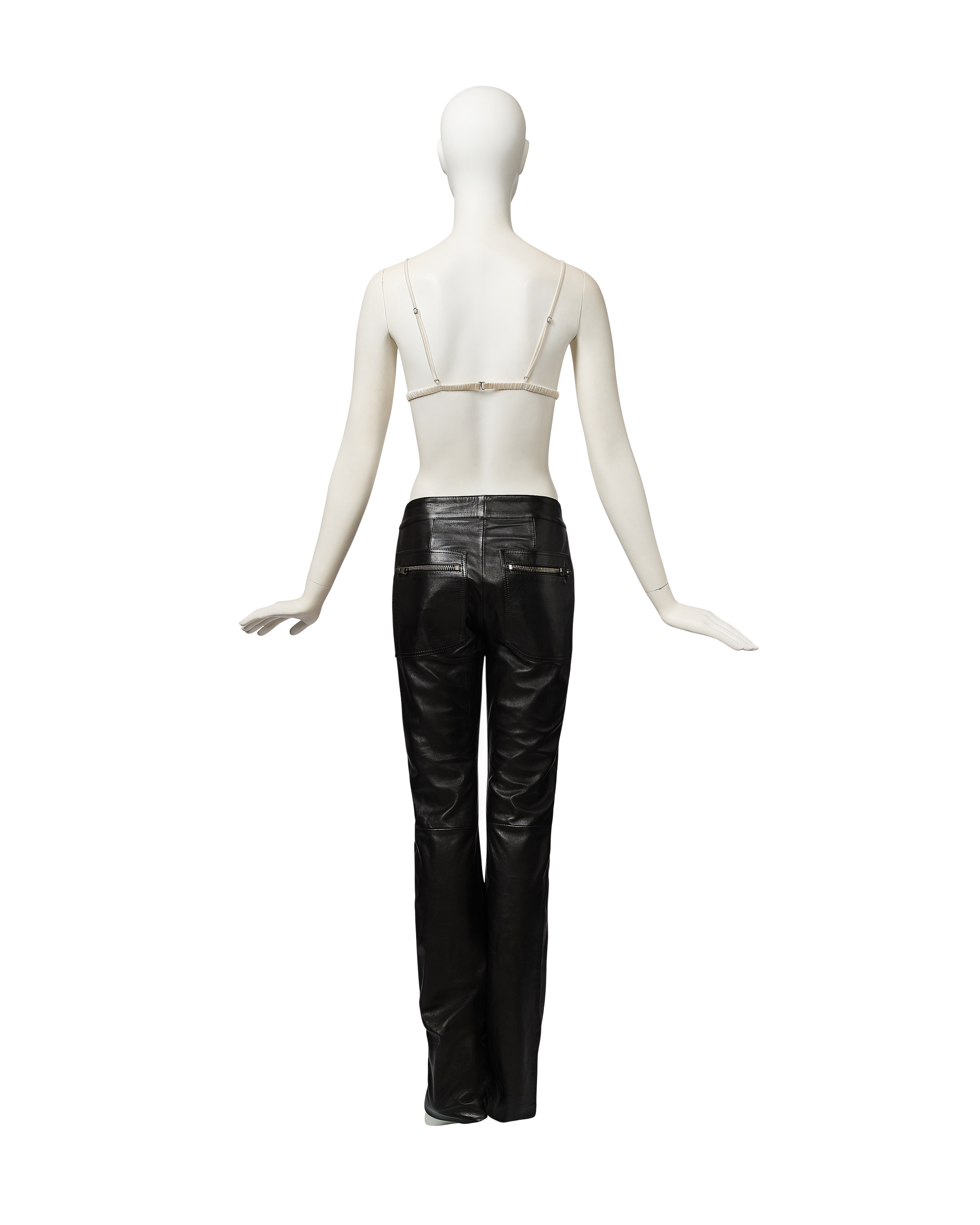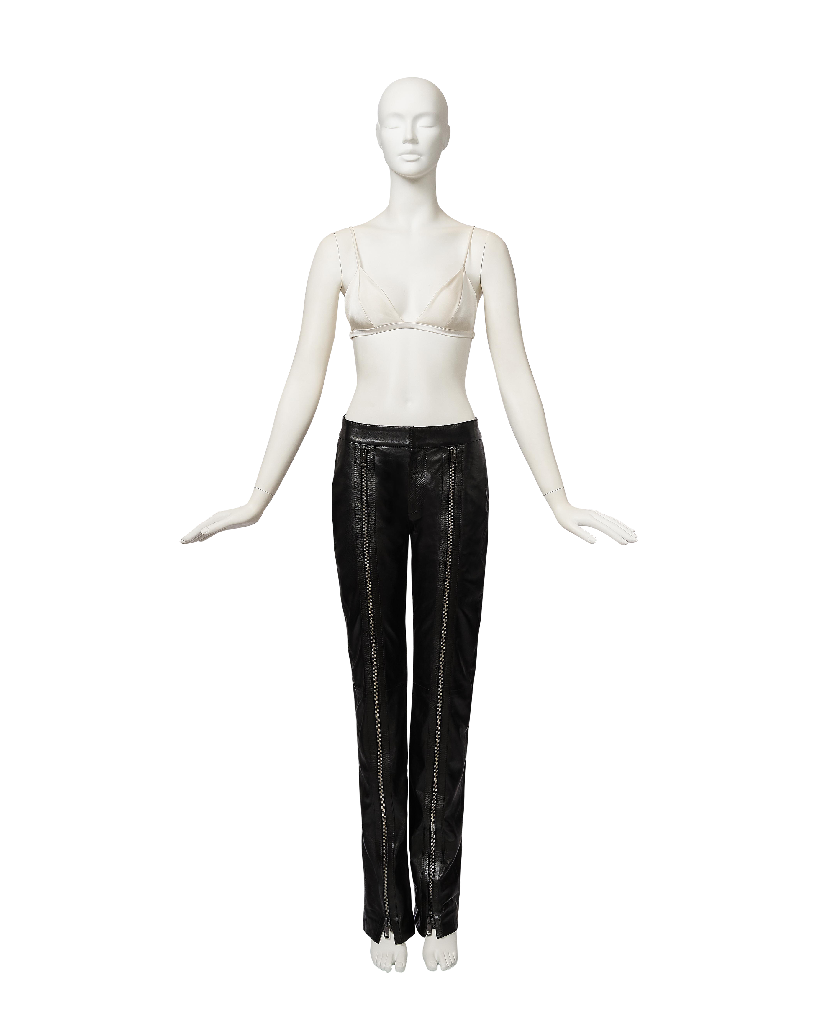 A/W 2001 Gucci by Tom Ford black leather zipper trousers. Mid-rise pants with stamped 'Gucci' gunmetal silver-tone zipper details from hemline to waist, and at flap pockets at back. Fabric Contents: 100% Leather with 100% Cupro lining. Concealed front zip closure. Silhouette as seen on the runway (Looks #2, 3, 4, and 13) in crepe variation. In excellent vintage condition with extremely light wear throughout. Bra top utilized for e-commerce purposes only; not included with purchase.
