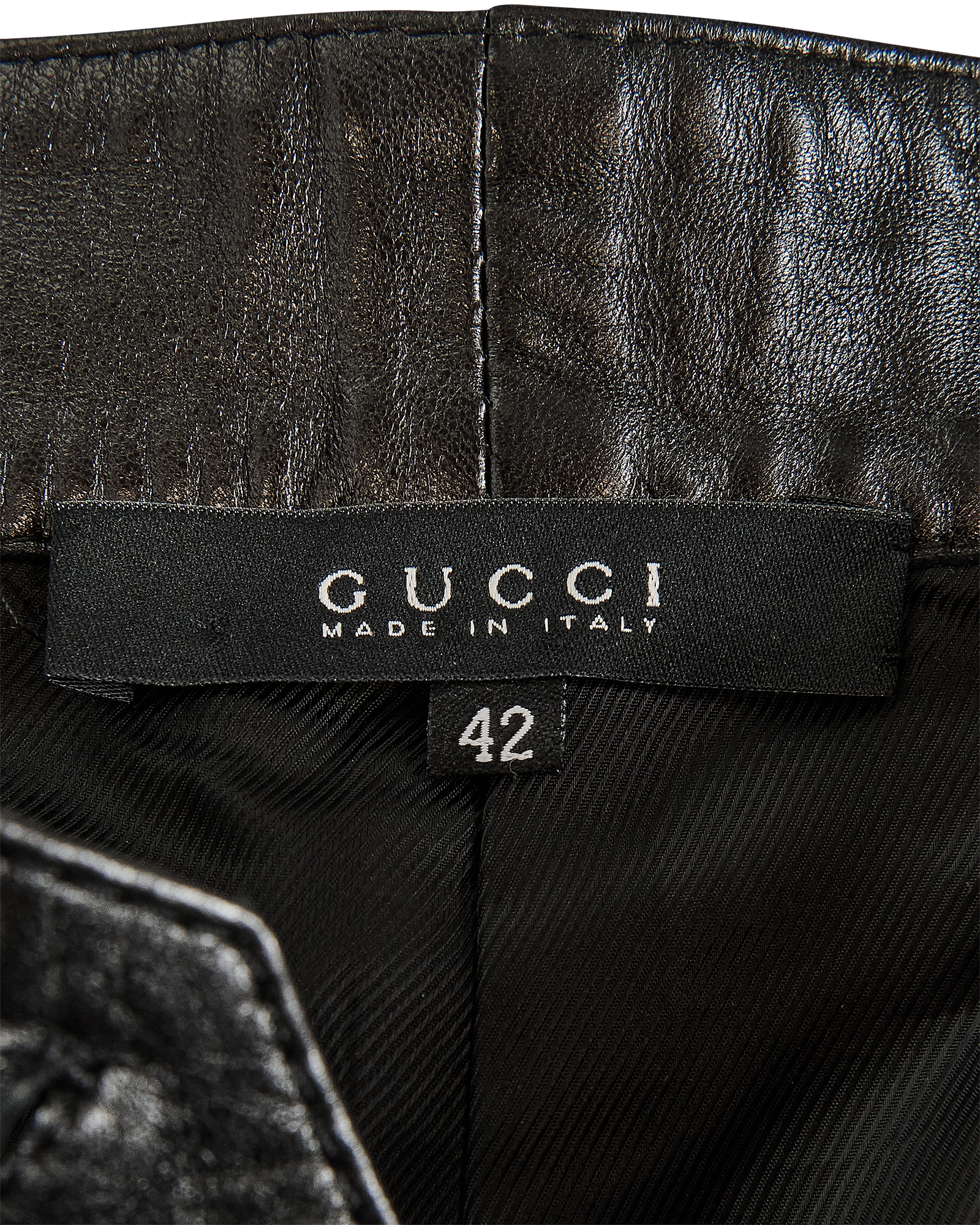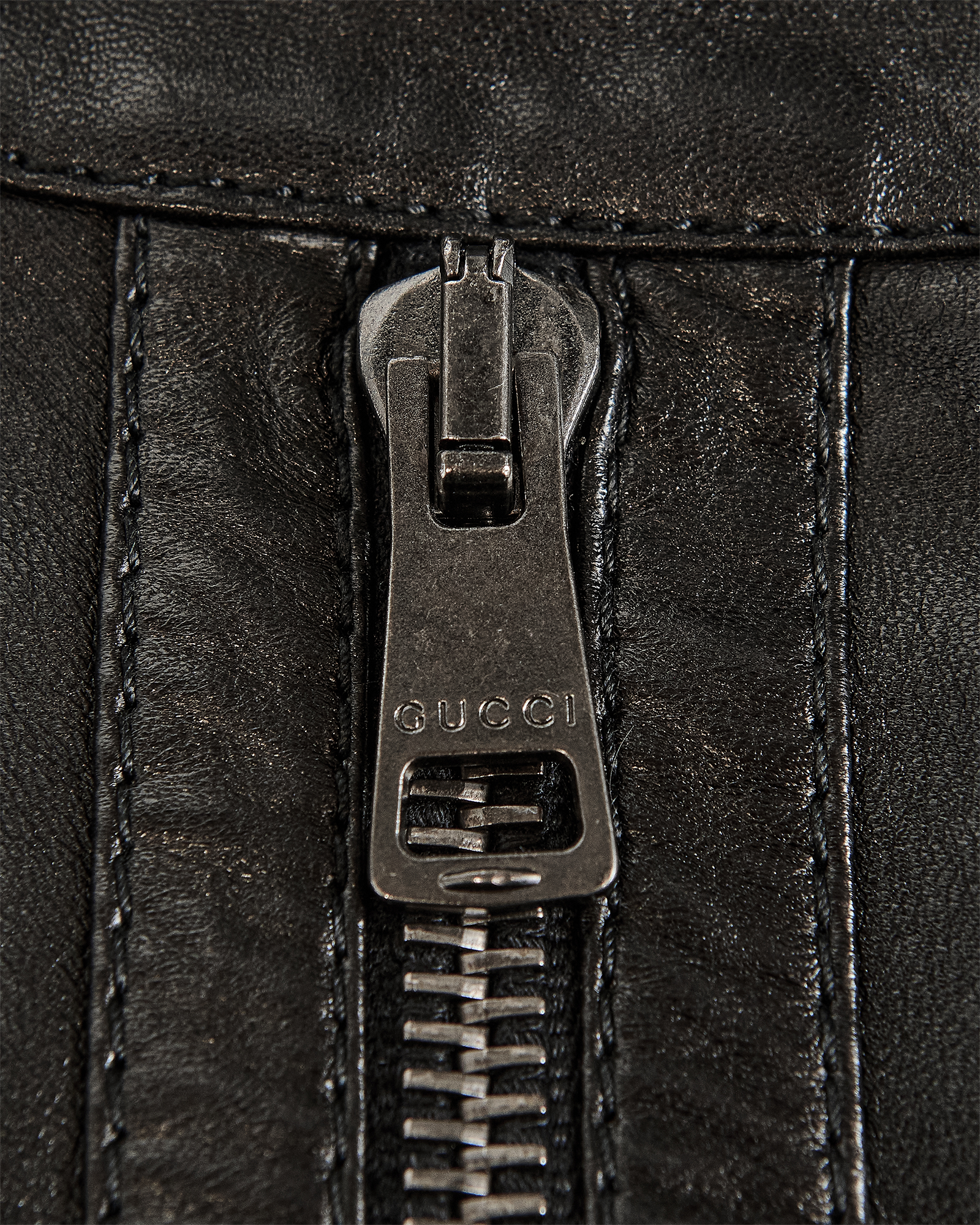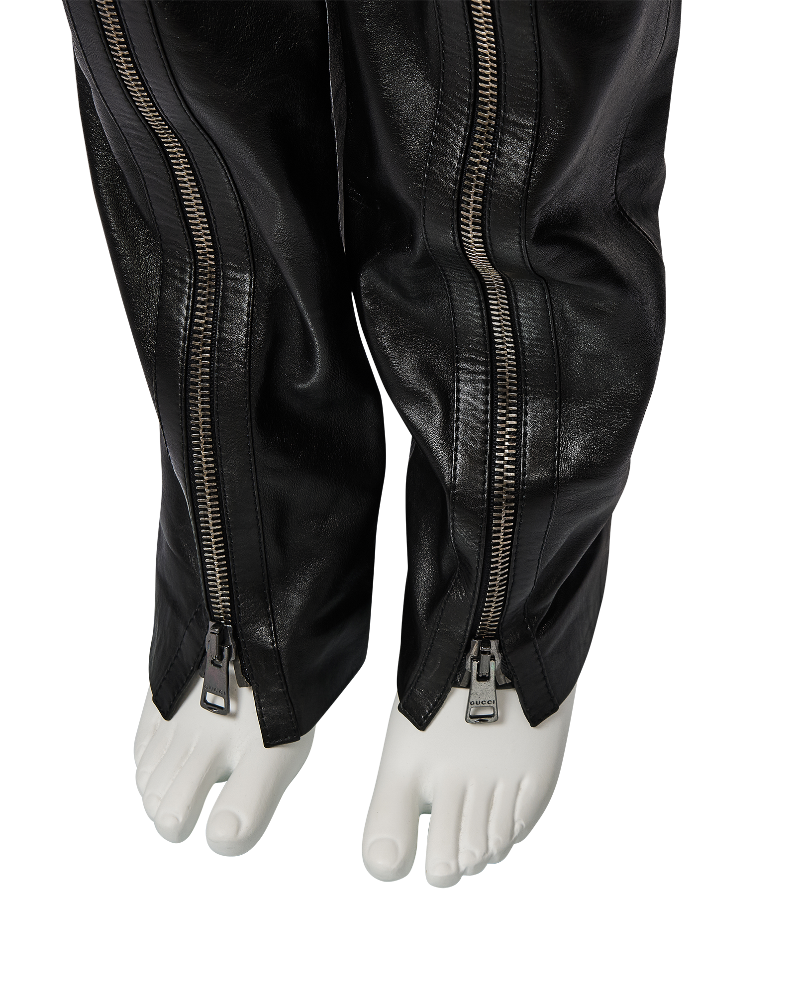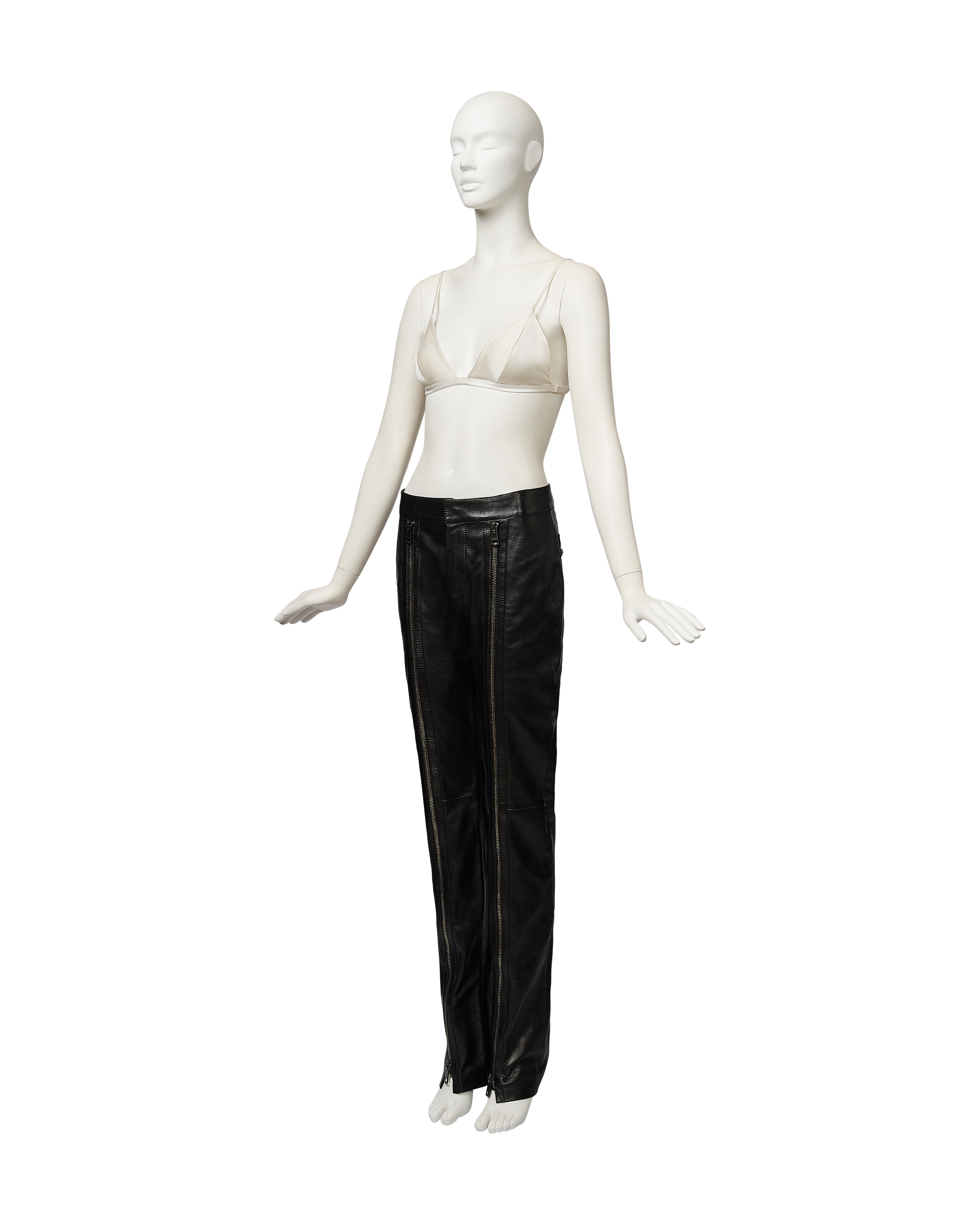 A/W 2001 Gucci by Tom Ford black leather zipper trousers. Mid-rise pants with stamped 'Gucci' gunmetal silver-tone zipper details from hemline to waist, and at flap pockets at back. Fabric Contents: 100% Leather with 100% Cupro lining. Concealed front zip closure. Silhouette as seen on the runway (Looks #2, 3, 4, and 13) in crepe variation. In excellent vintage condition with extremely light wear throughout. Bra top utilized for e-commerce purposes only; not included with purchase.