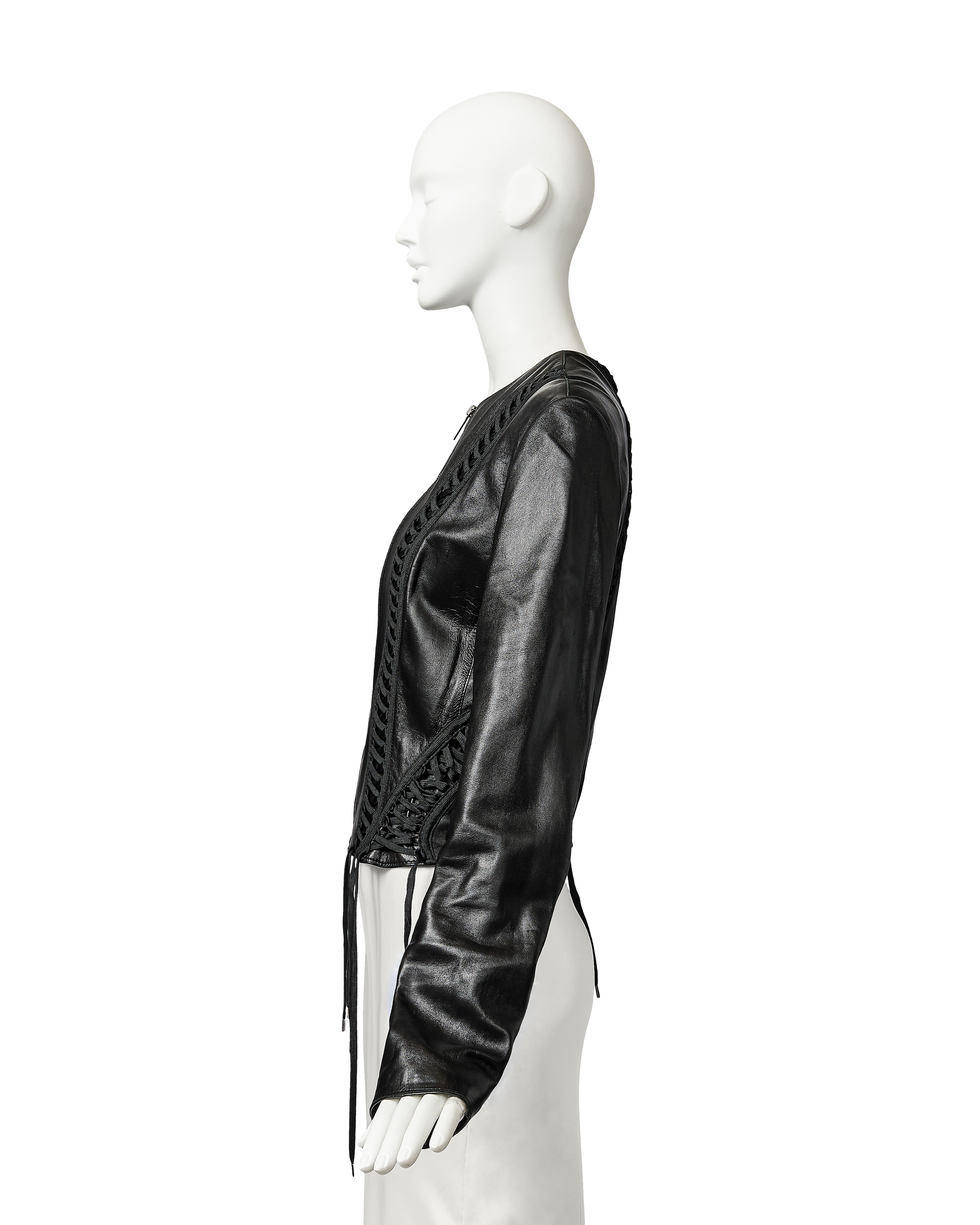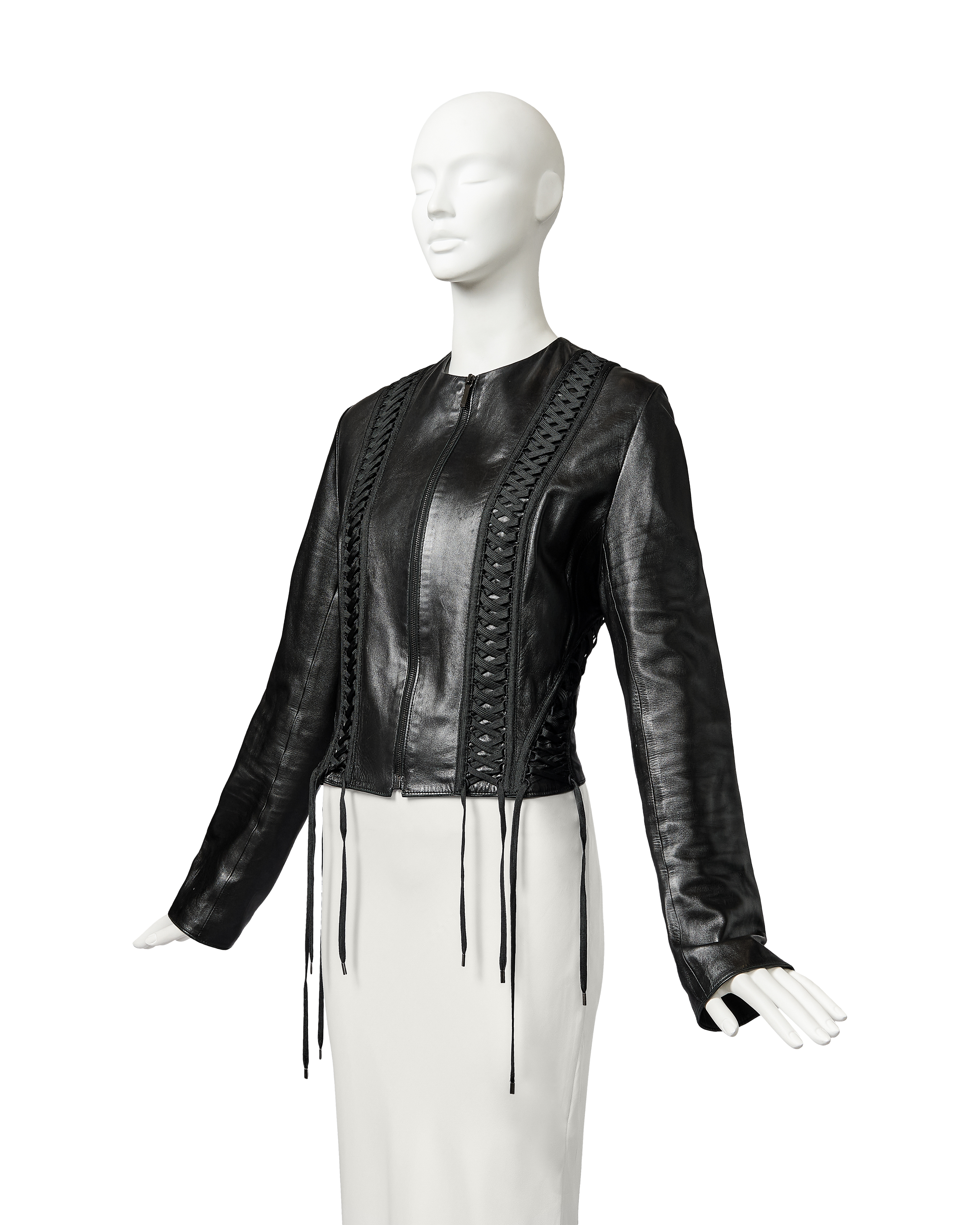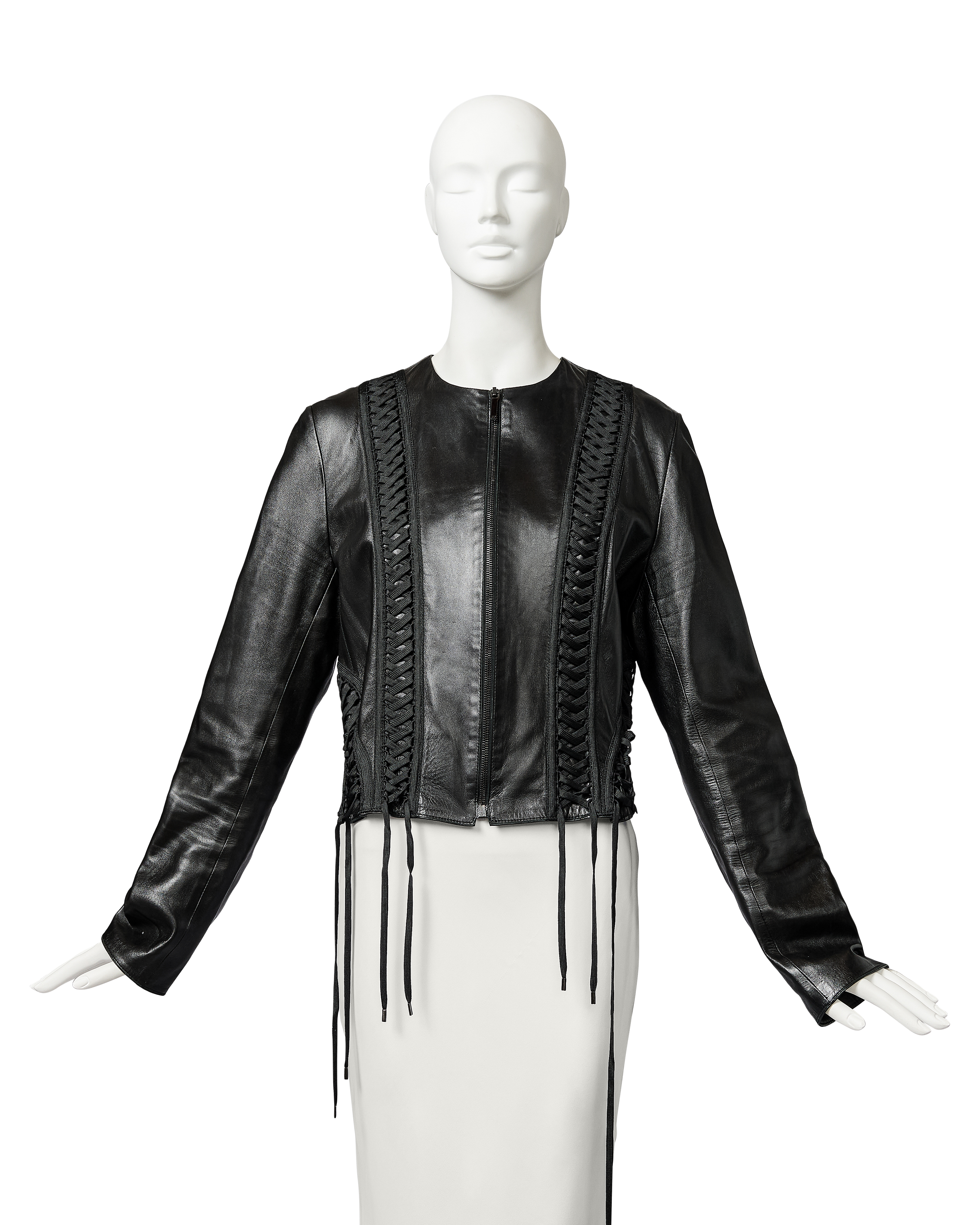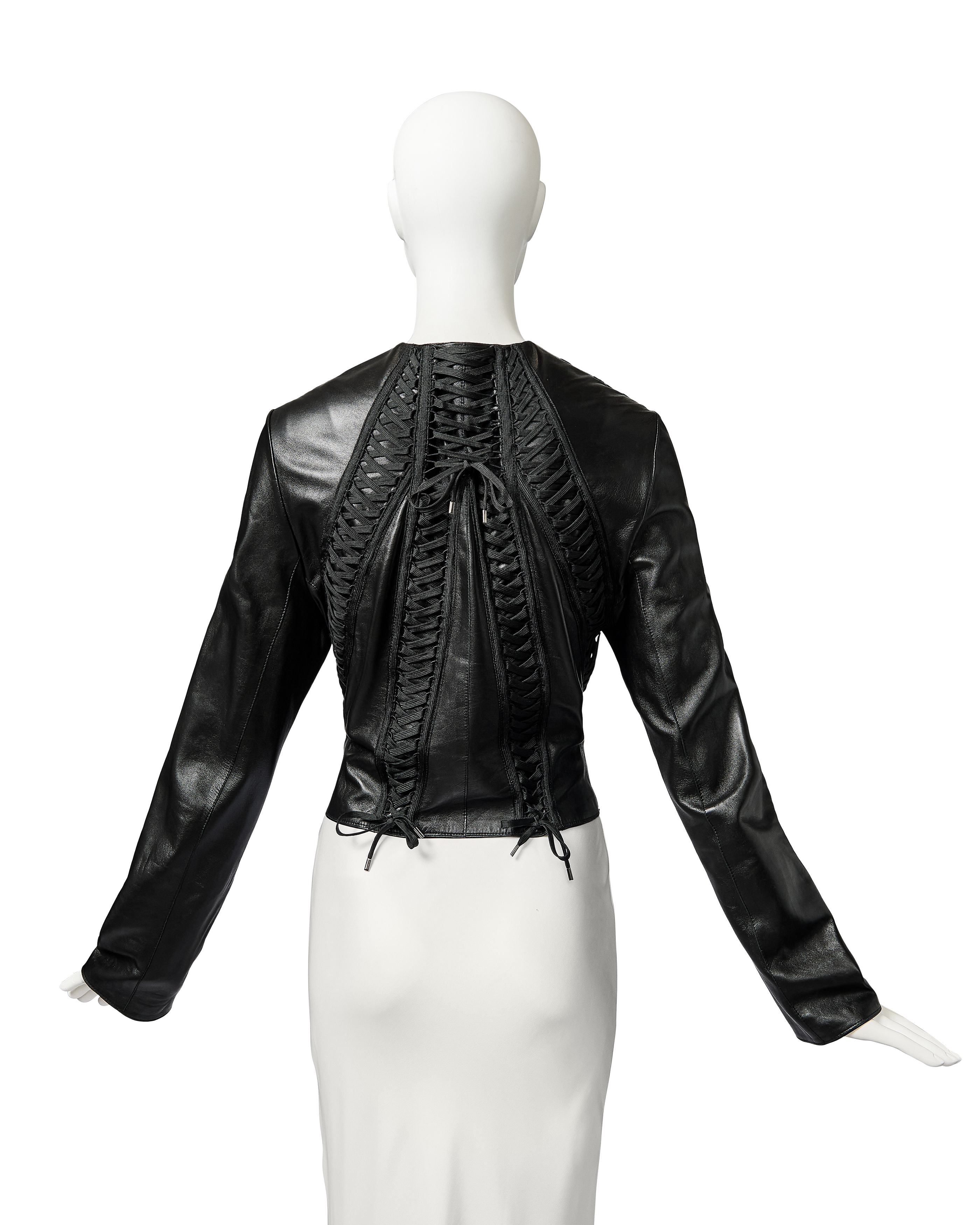 A/W 2002 Christian Dior by John Galliano black leather lace-up jacket. Collarless black zip-front jacket with intricate shoelace lace-up detailing throughout front and back. Gunmetal-tone zipper with 'CD' stamped logo zipper pull. Slightly cropped length. Fabric Contents: 100% Lambskin Leather. Rare jacket as seen in the ad campaign on Gisele Bundchen, and similar featured on the runway (Look #8) in yellow-green colorway. In excellent vintage condition with no flaws to note. White skirt photographed for e-commerce purposes only (not included with purchase).