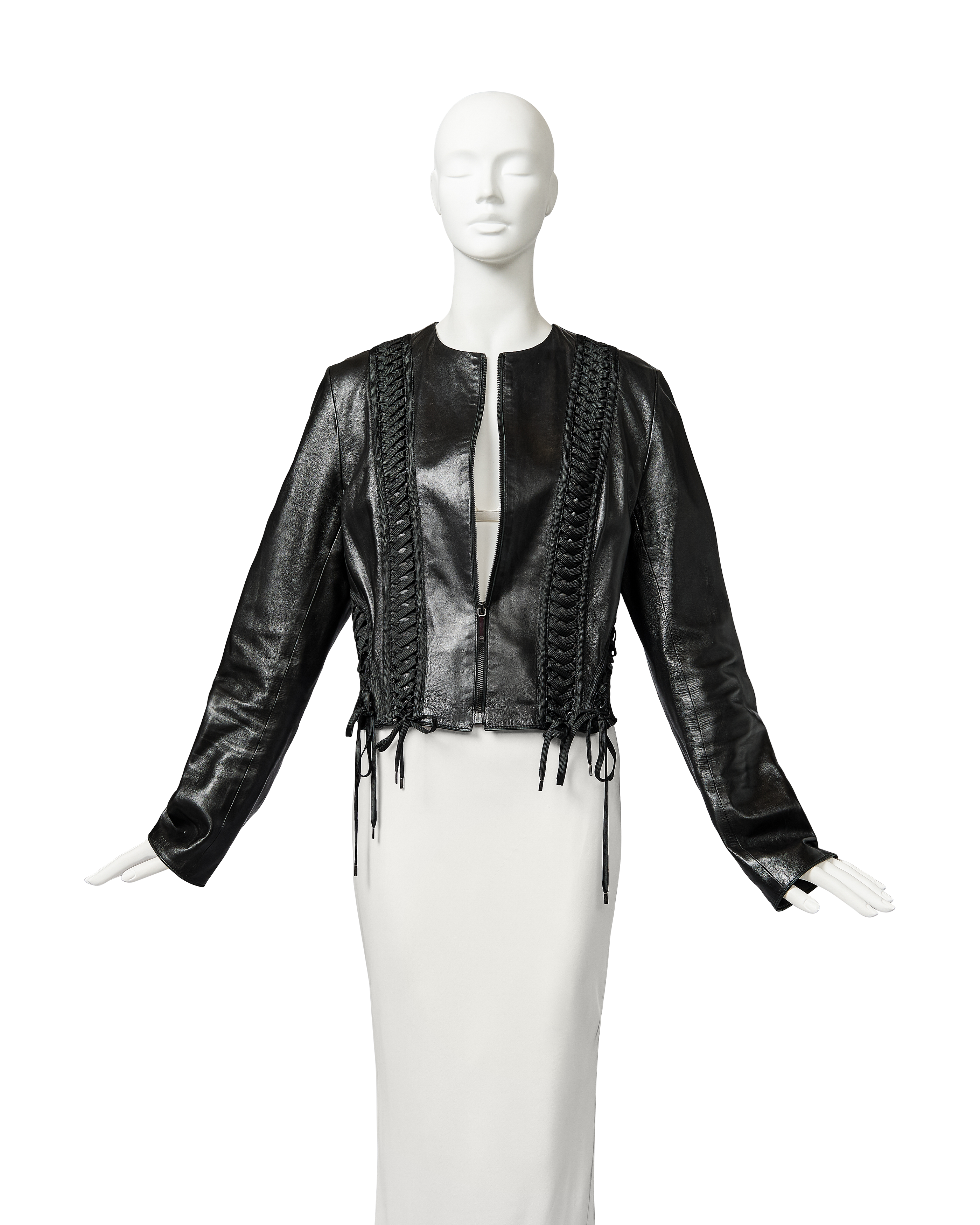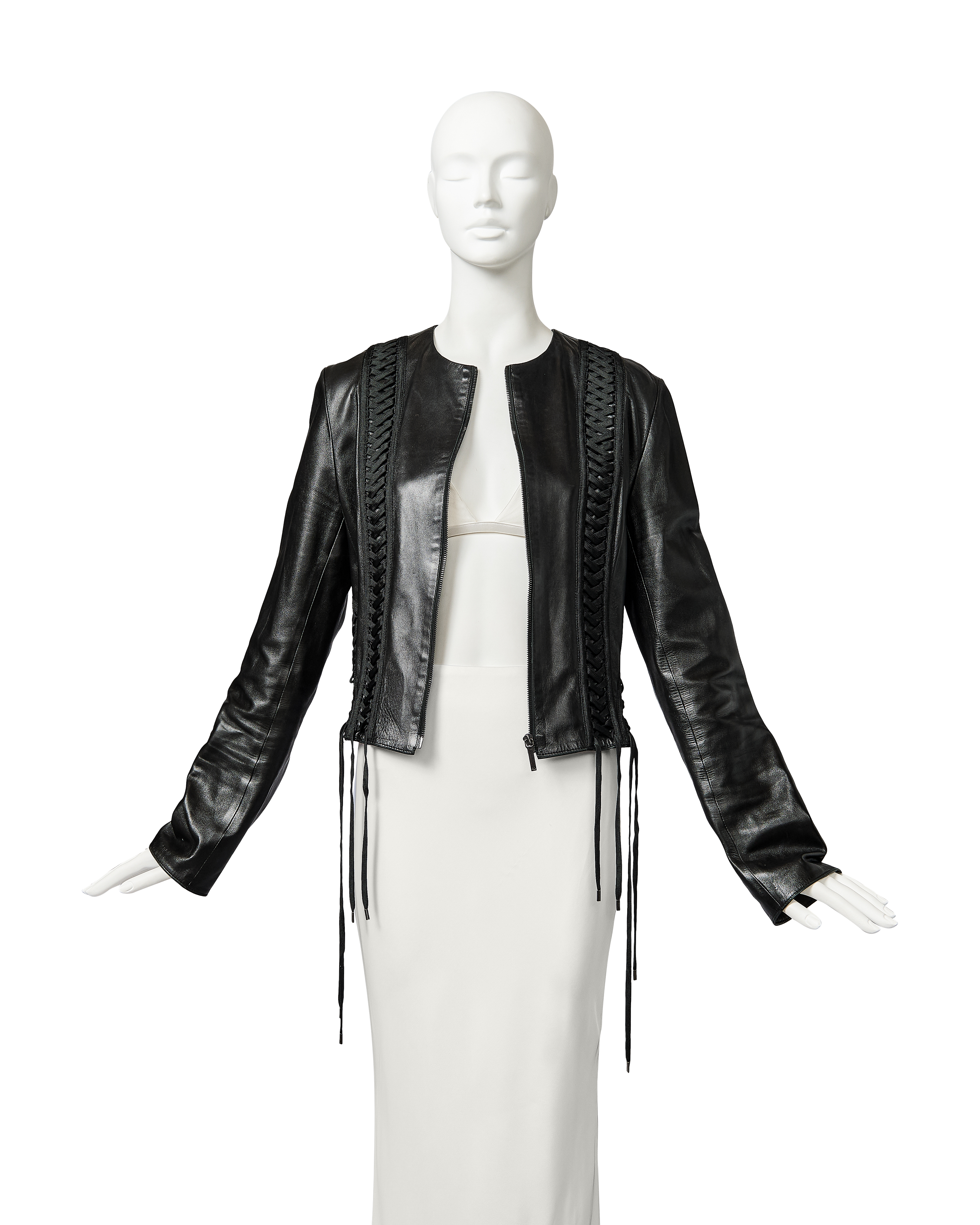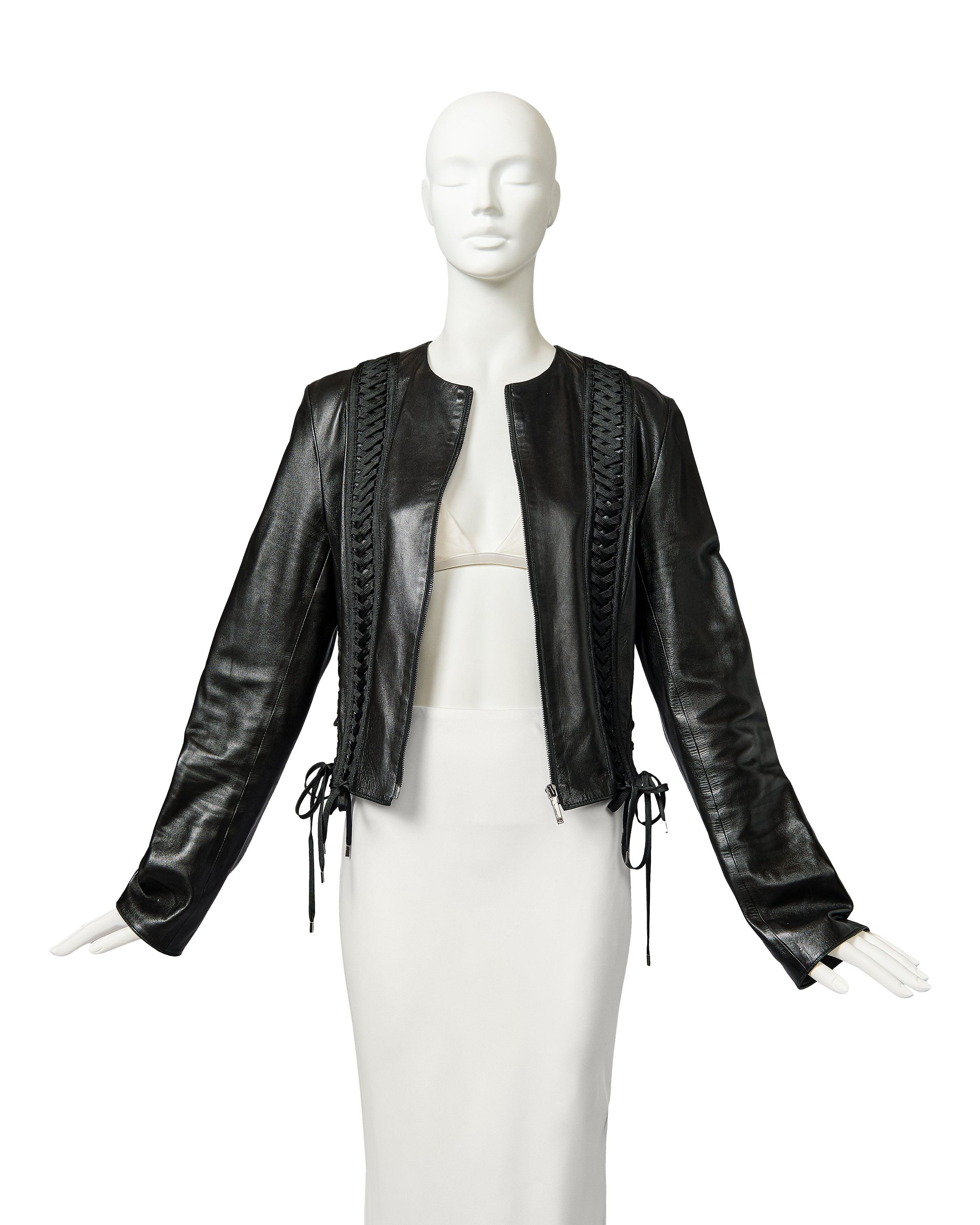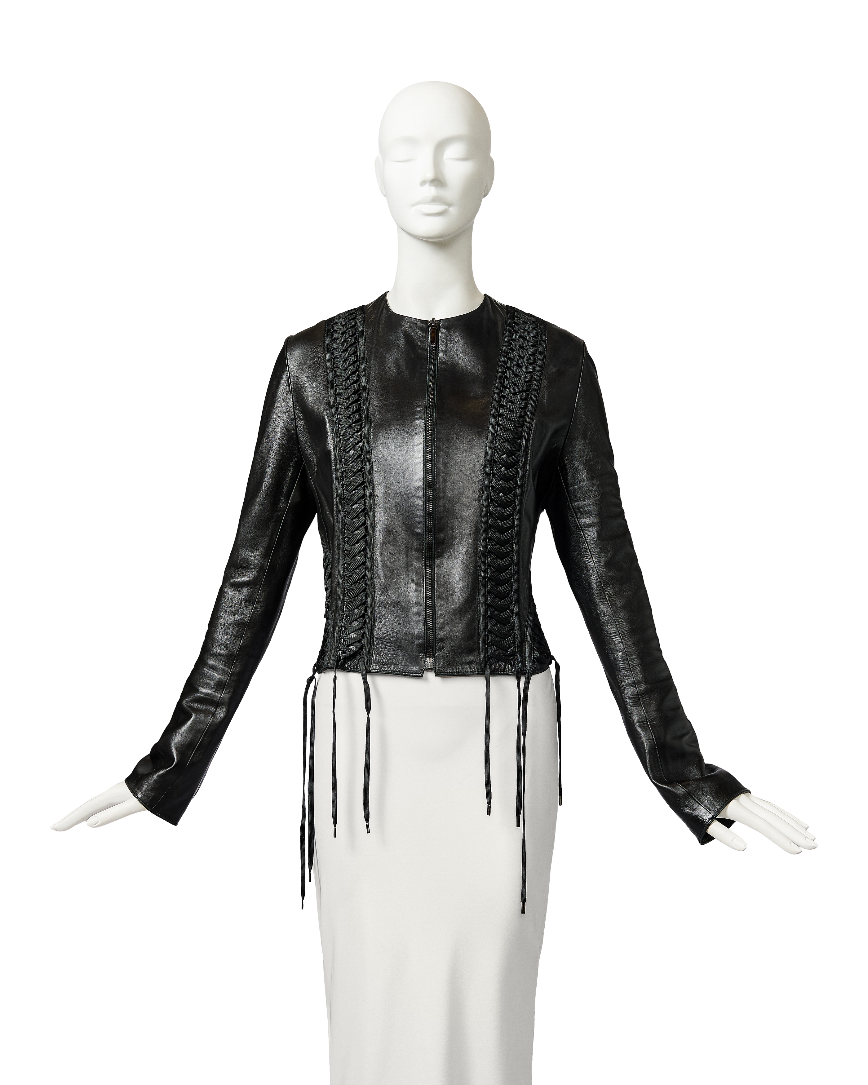 A/W 2002 Christian Dior by John Galliano black leather lace-up jacket. Collarless black zip-front jacket with intricate shoelace lace-up detailing throughout front and back. Gunmetal-tone zipper with 'CD' stamped logo zipper pull. Slightly cropped length. Fabric Contents: 100% Lambskin Leather. Rare jacket as seen in the ad campaign on Gisele Bundchen, and similar featured on the runway (Look #8) in yellow-green colorway. In excellent vintage condition with no flaws to note. White skirt photographed for e-commerce purposes only (not included with purchase).