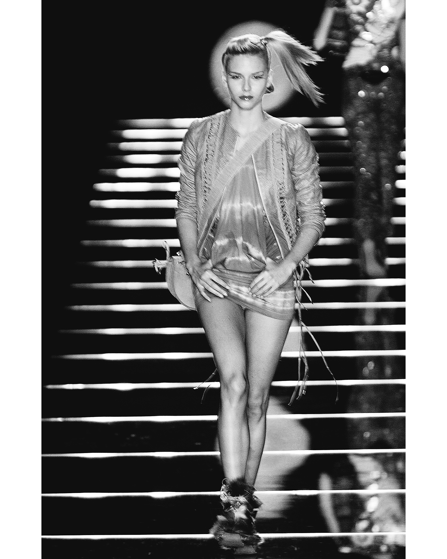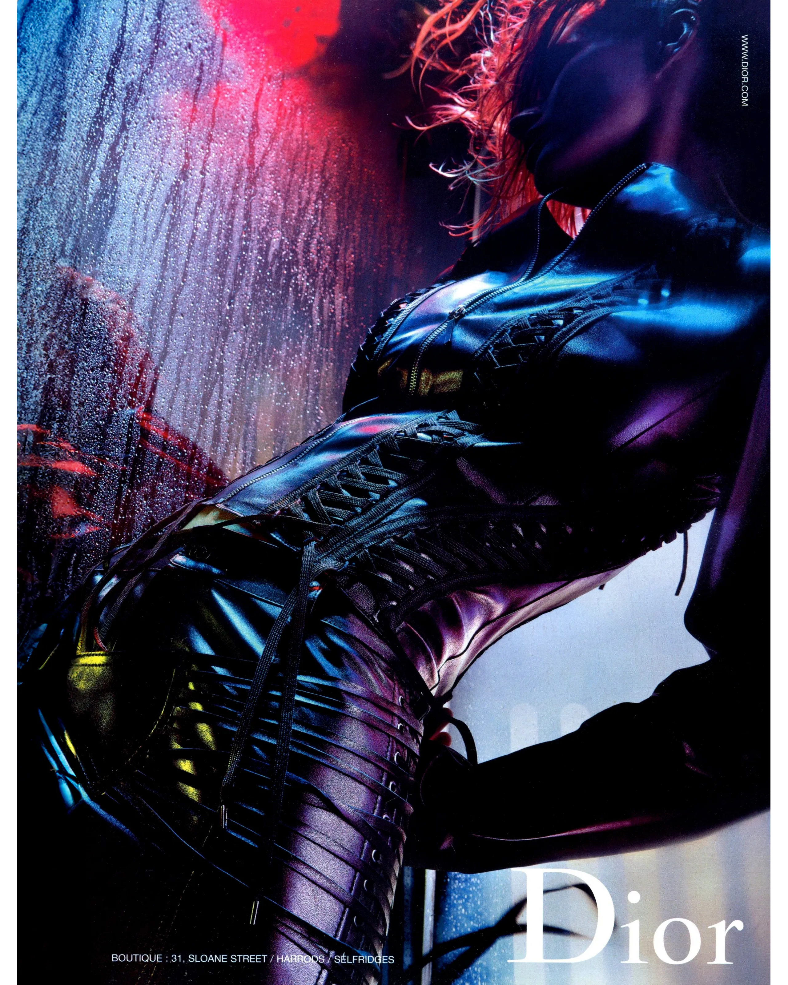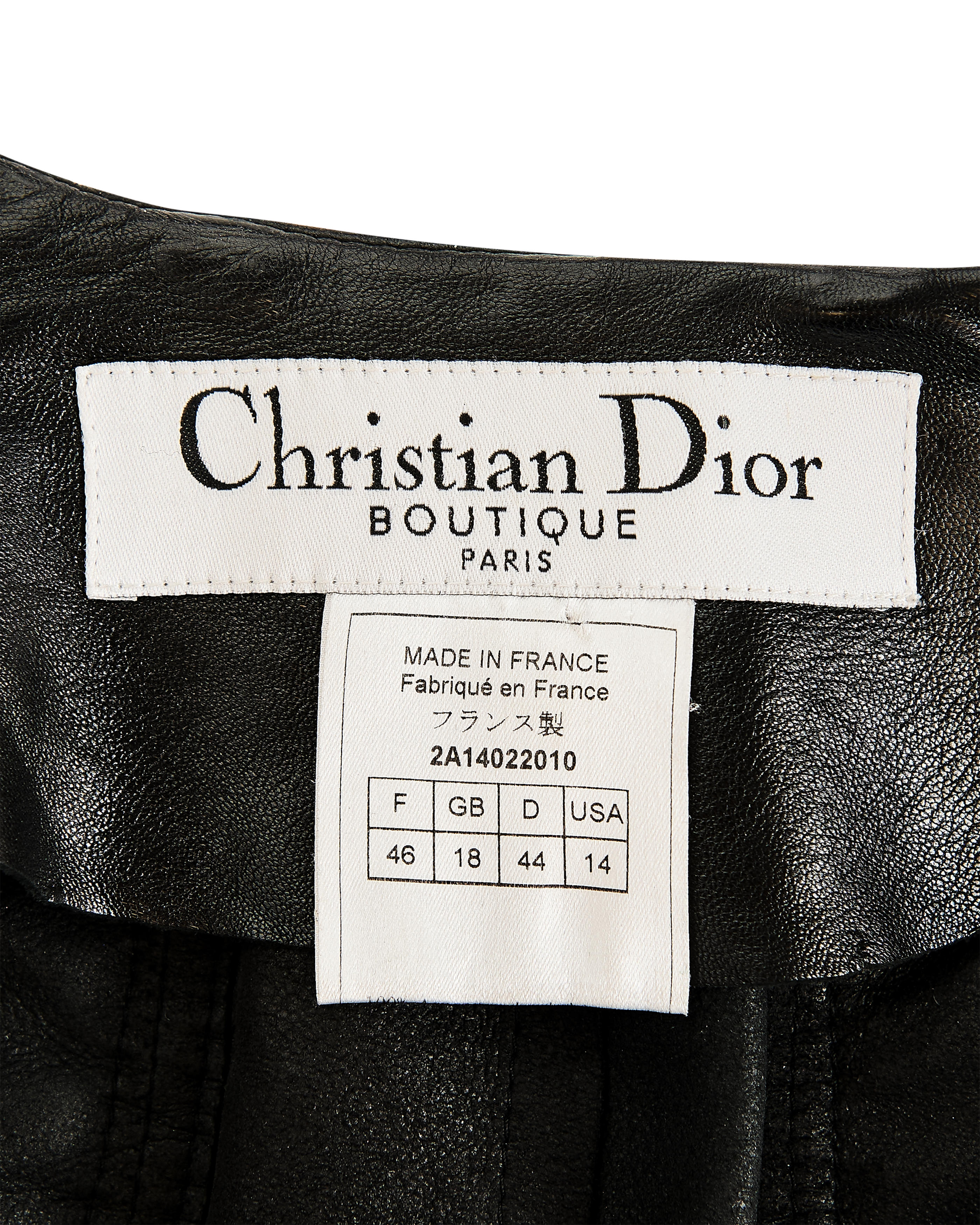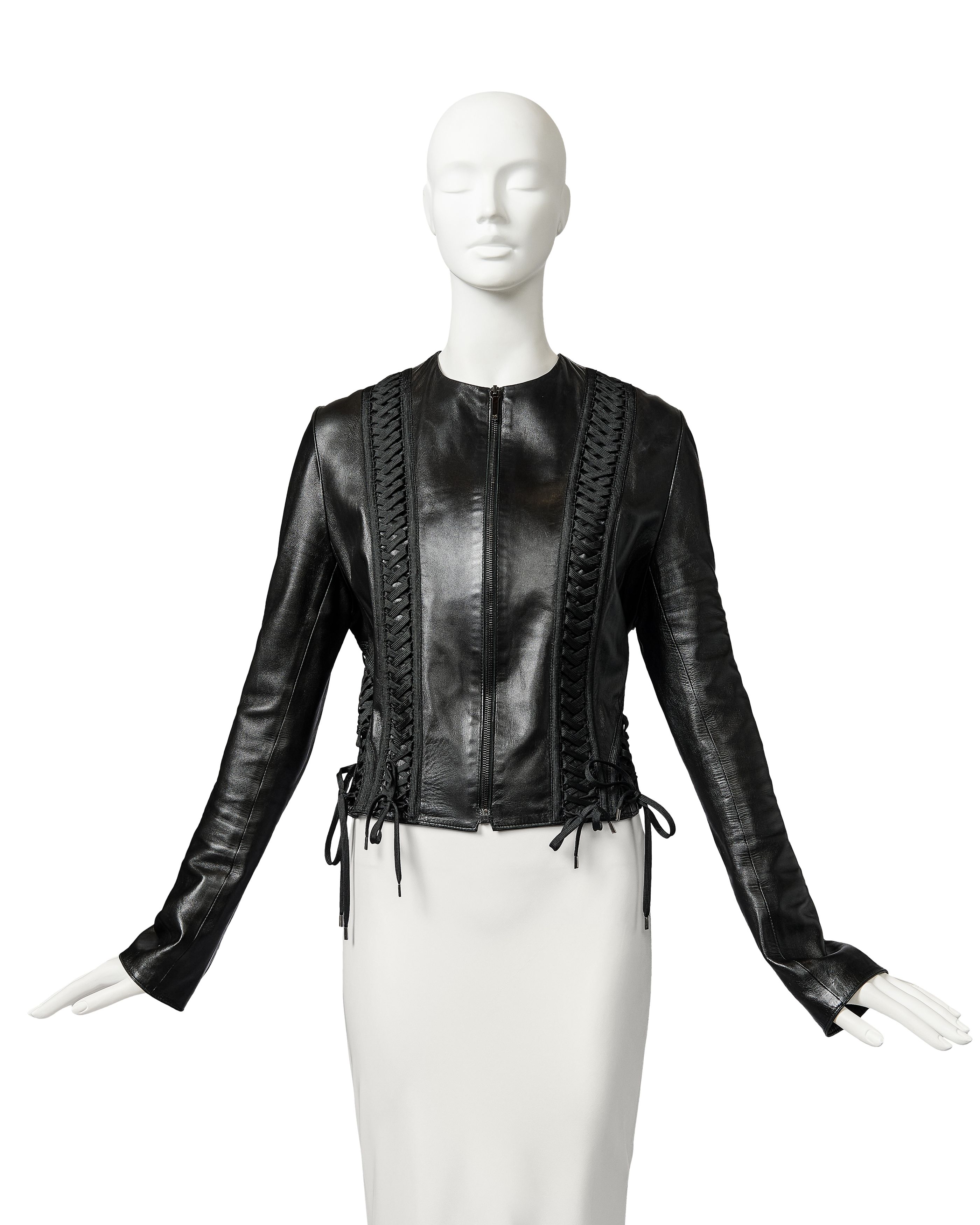 A/W 2002 Christian Dior by John Galliano black leather lace-up jacket. Collarless black zip-front jacket with intricate shoelace lace-up detailing throughout front and back. Gunmetal-tone zipper with 'CD' stamped logo zipper pull. Slightly cropped length. Fabric Contents: 100% Lambskin Leather. Rare jacket as seen in the ad campaign on Gisele Bundchen, and similar featured on the runway (Look #8) in yellow-green colorway. In excellent vintage condition with no flaws to note. White skirt photographed for e-commerce purposes only (not included with purchase).