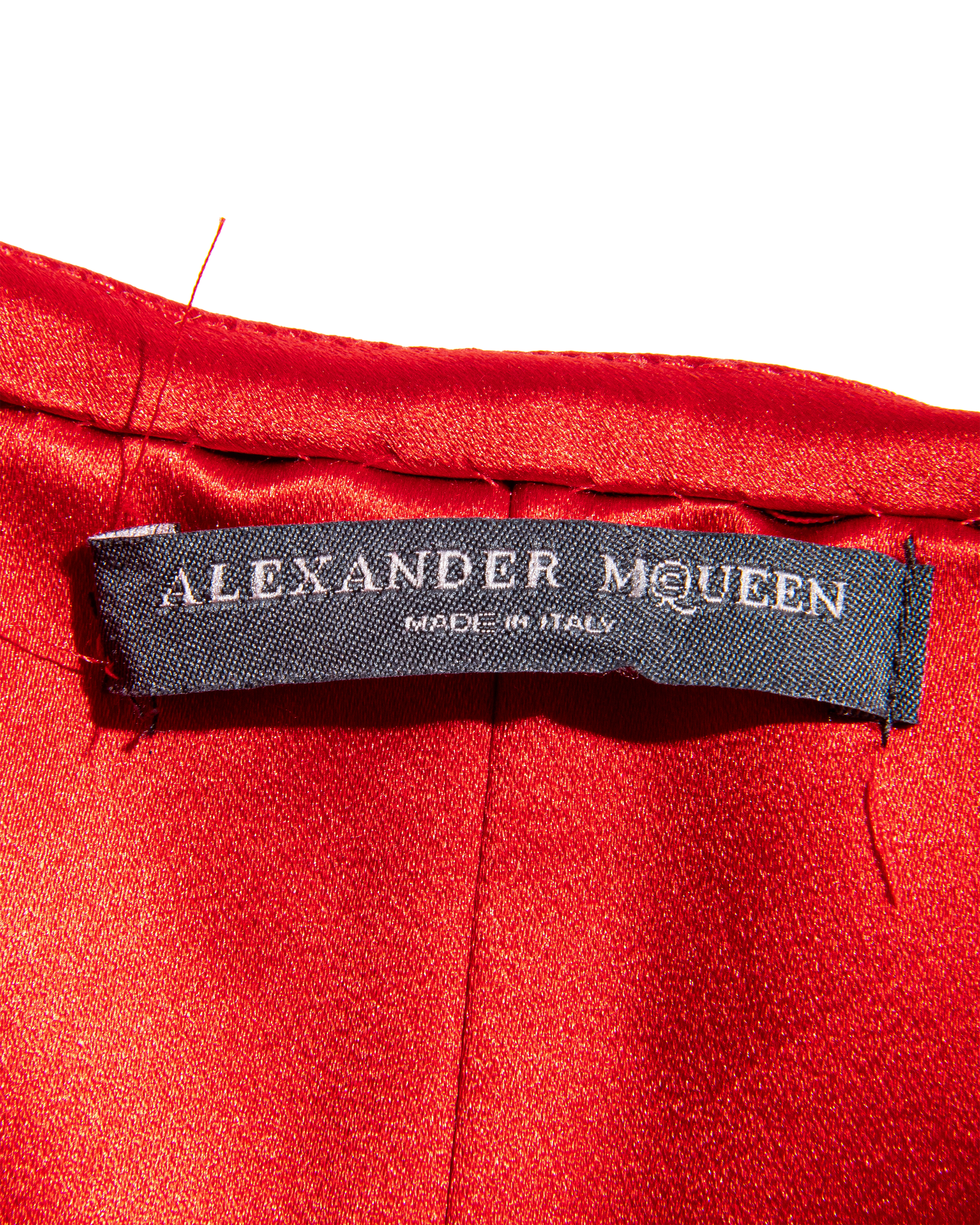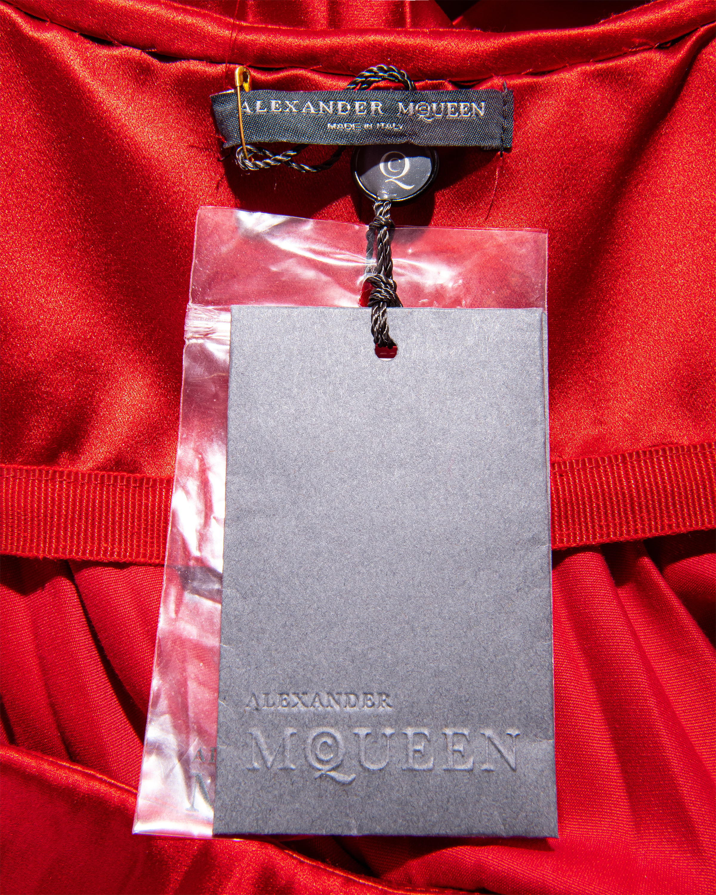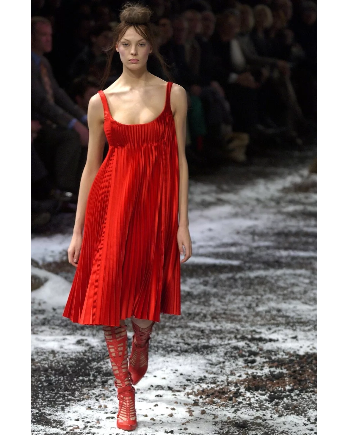 A/W 2003 Alexander McQueen red pleated midi dress with empire waist. Sleeveless scoop neck midi dress with knife pleated construction throughout. Concealed side zip closure and built-in silk corset at bust. Fabric Contents: 60% Wool and 40% Cotton blend. As seen on the runway (Look #46) and worn by Isabella Blow. In very good vintage condition with original tags attached, with light wear throughout pleating; has been taken to couture cleaner and arrives ready to wear.
