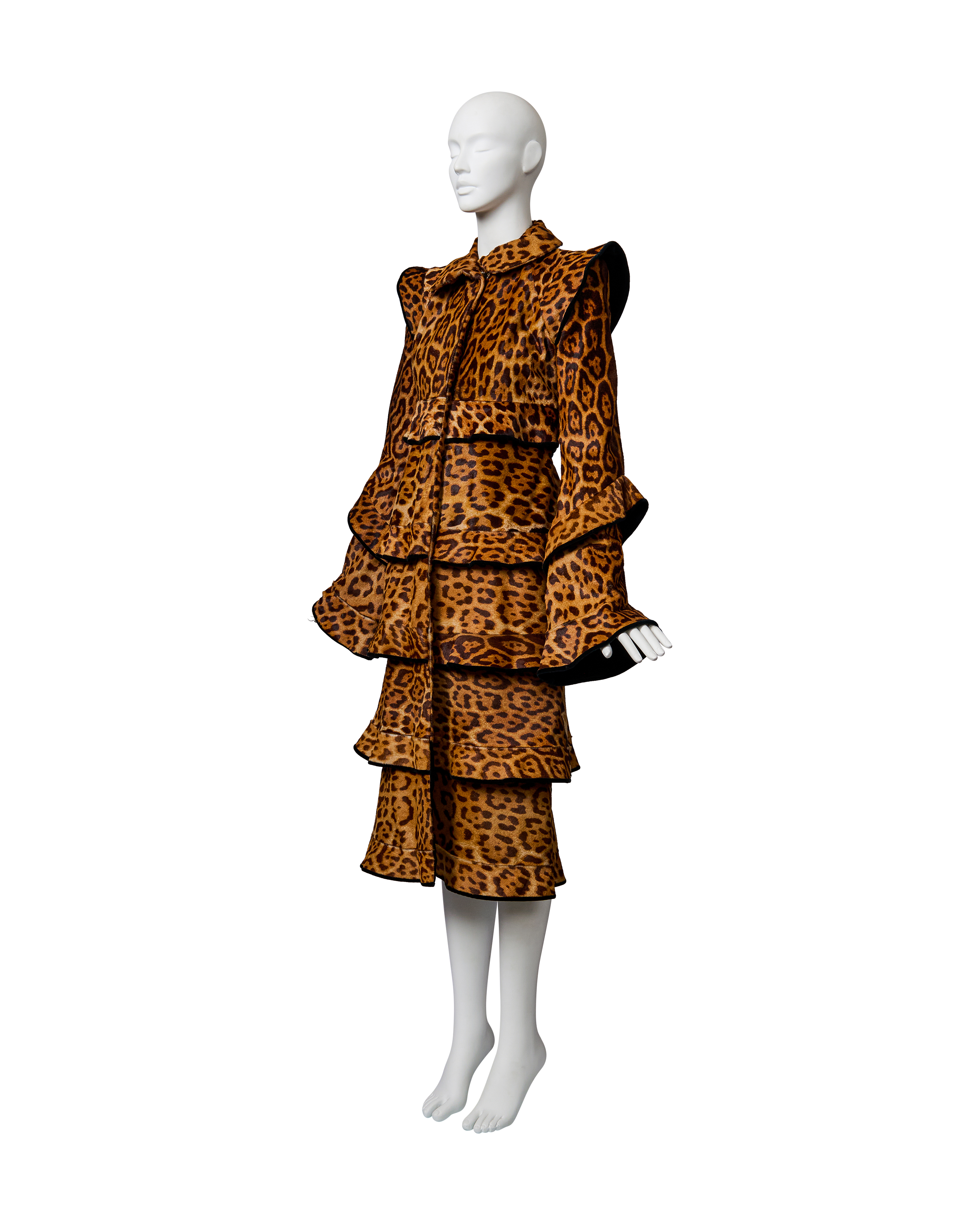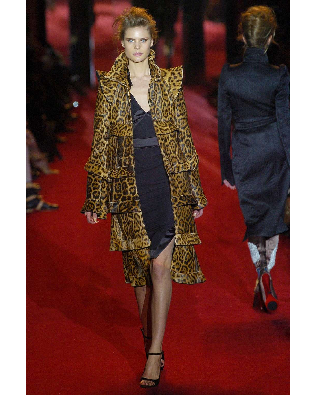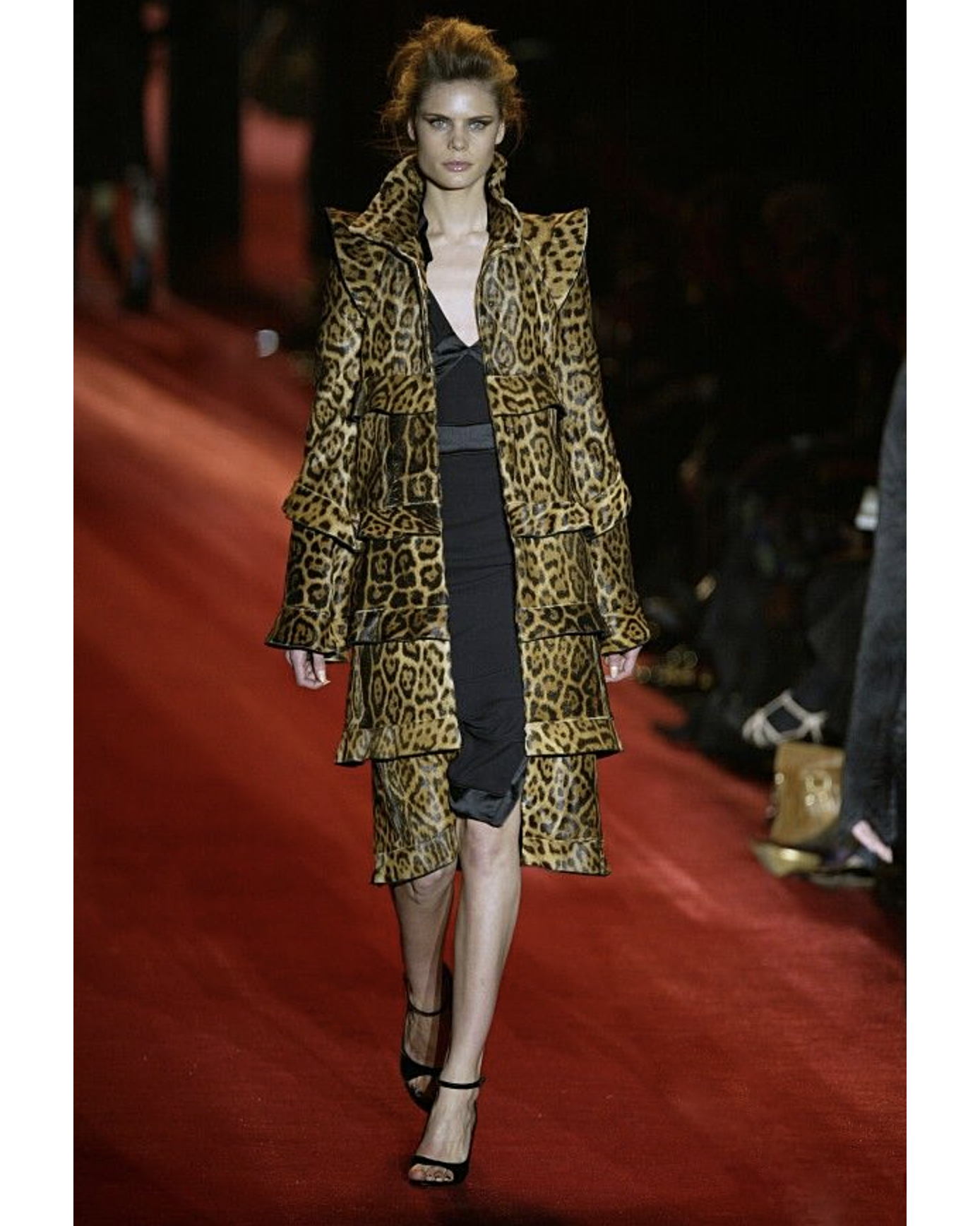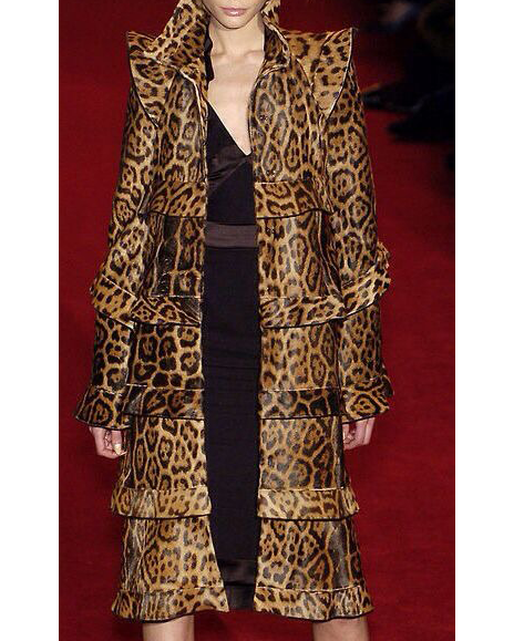 A/W 2004 Yves Saint Laurent Rive Gauche by Tom Ford leopard print leather coat. Long sleeve midi length collared coat with raised ruffle paneling throughout arms and tiered construction throughout, featuring contrasting black trim. Pointed shoulder detailing with slight padding at shoulders creates unique silhouette when worn. Black hook-and-eye front closures. Fabric Contents: 100% Leather with 100% Silk lining (fully lined with black lining). As seen on the runway as Look #19 of the collection. In very good vintage condition with light wear throughout.
