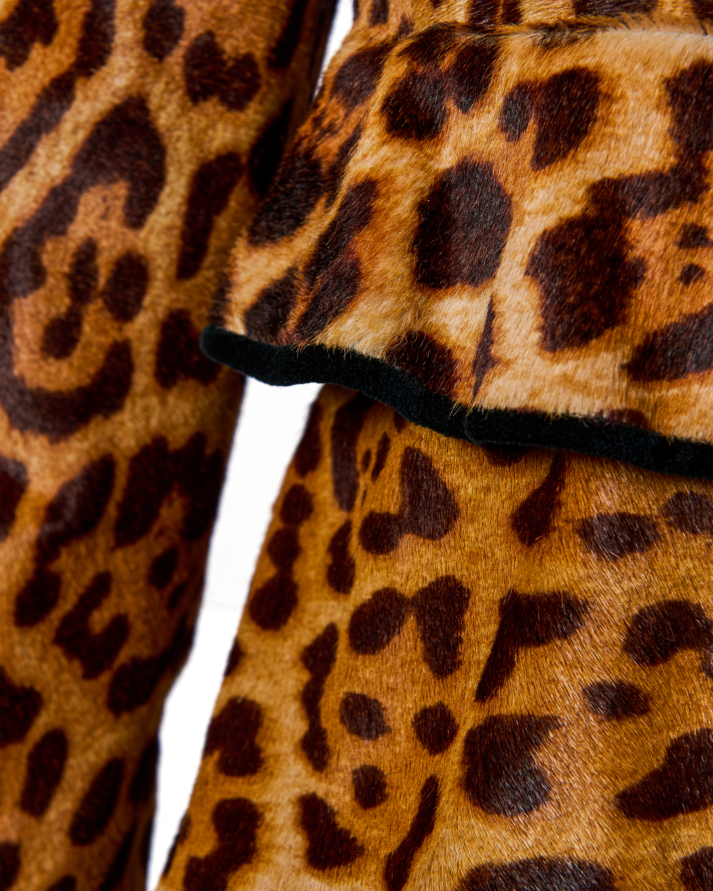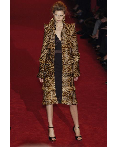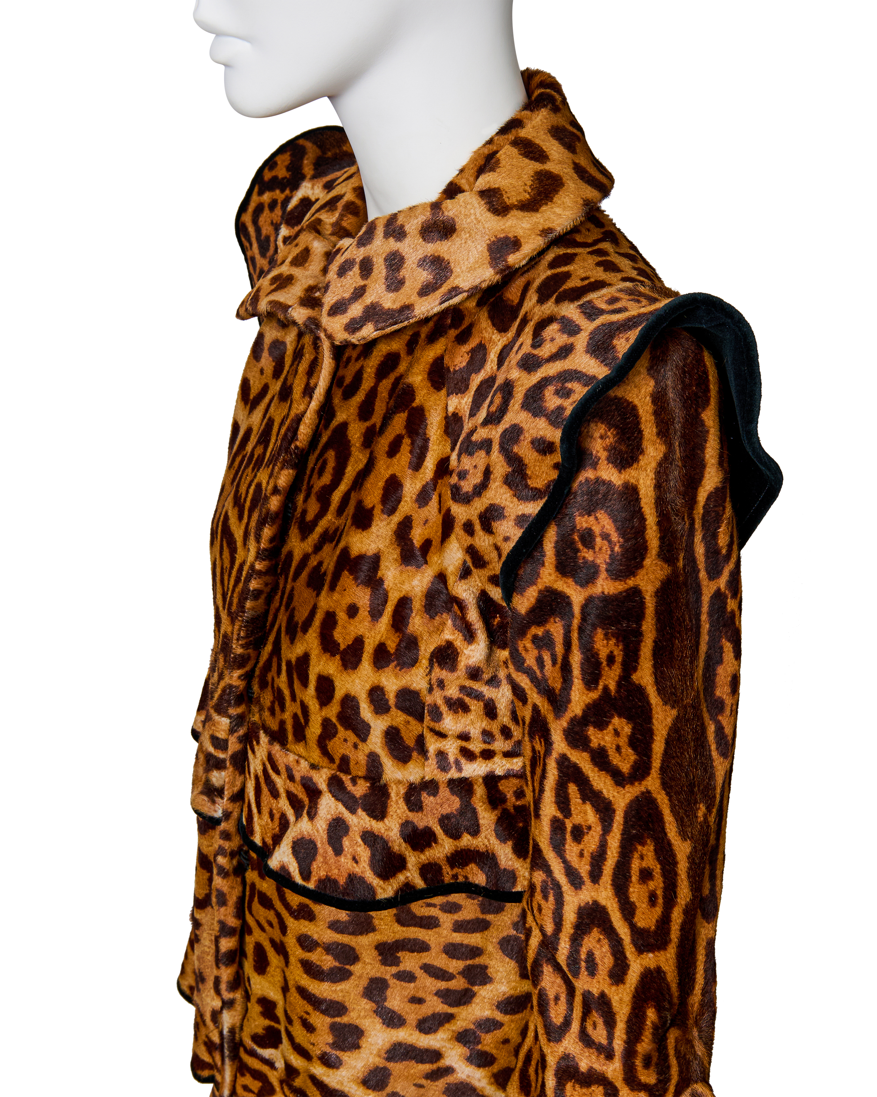 A/W 2004 Yves Saint Laurent Rive Gauche by Tom Ford leopard print leather coat. Long sleeve midi length collared coat with raised ruffle paneling throughout arms and tiered construction throughout, featuring contrasting black trim. Pointed shoulder detailing with slight padding at shoulders creates unique silhouette when worn. Black hook-and-eye front closures. Fabric Contents: 100% Leather with 100% Silk lining (fully lined with black lining). As seen on the runway as Look #19 of the collection. In very good vintage condition with light wear throughout.