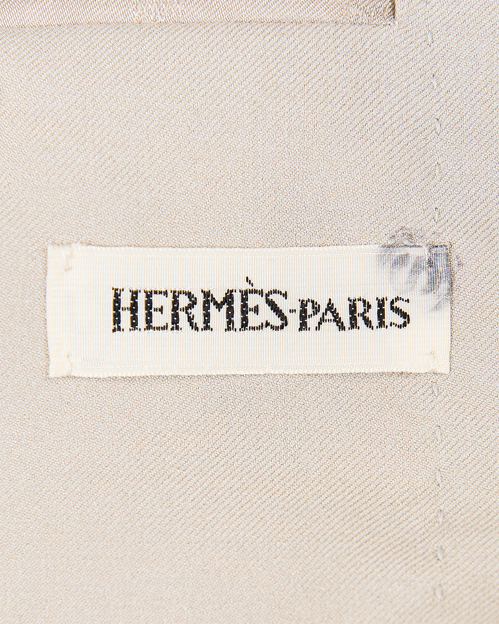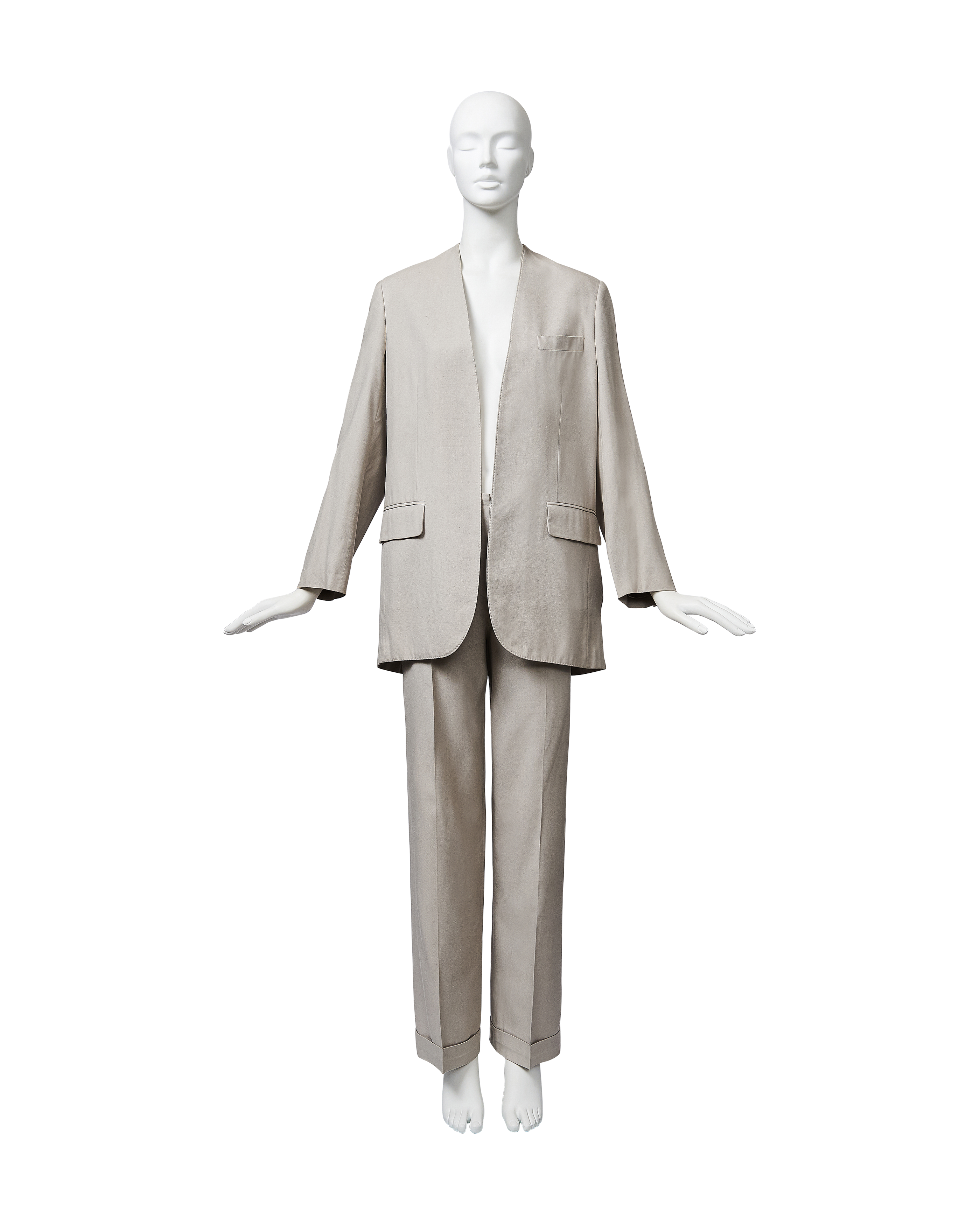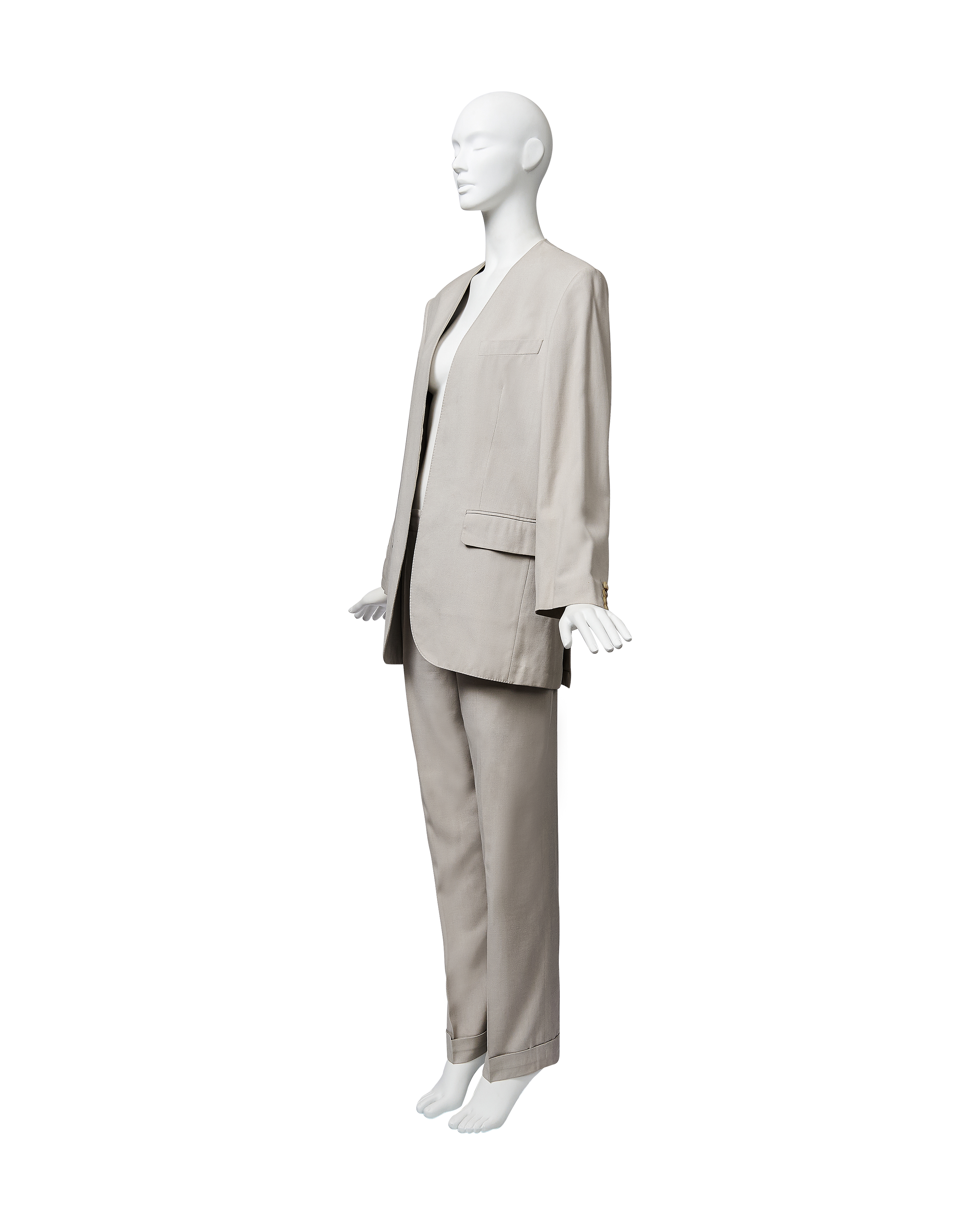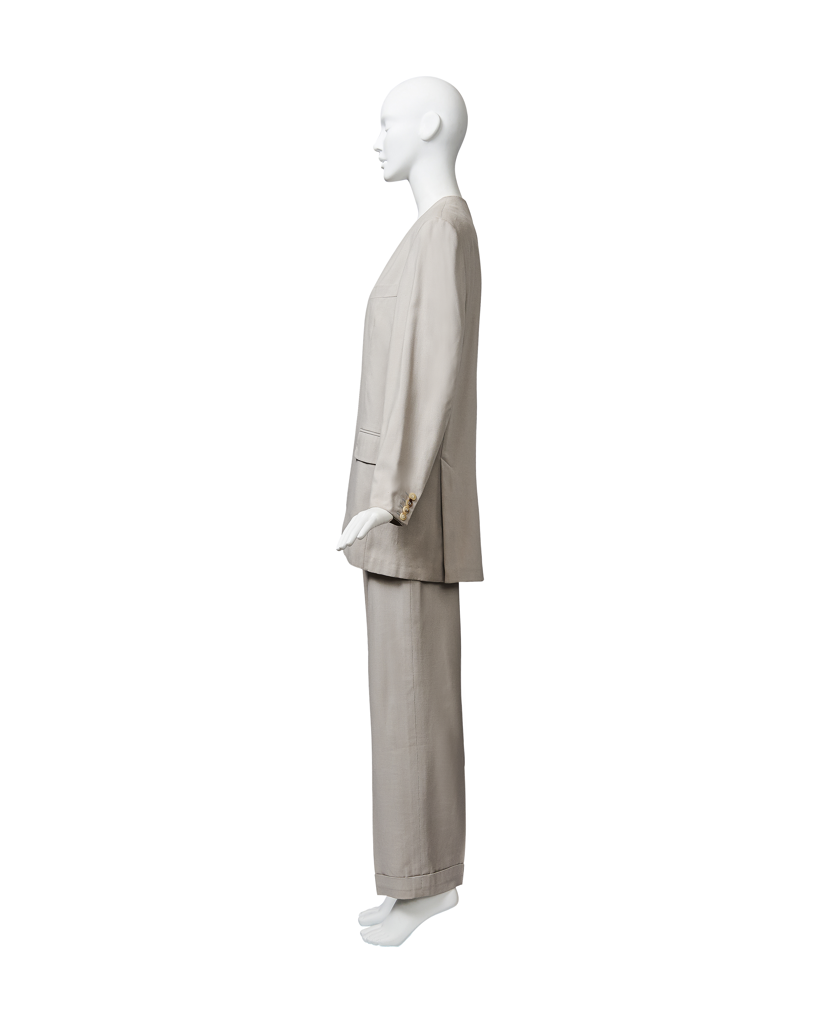 c. 2001 Hermès by Martin Margiela warm gray pant suit set. Long sleeve collarless v-neck oversized jacket with functional flap pockets pairs with mid-rise trouser. Four light tortoiseshell button closures at wrist. Trousers feature front belt loops, functional side slit pockets, and concealed front zip closure; cuffed hemline and center press add chic detailing when worn. Fabric Contents: 100% Silk. Very similar to opening look as seen on the S/S 2001 runway. In excellent vintage condition with pin-sized spot at left side sleeve (unnoticeable when worn).
