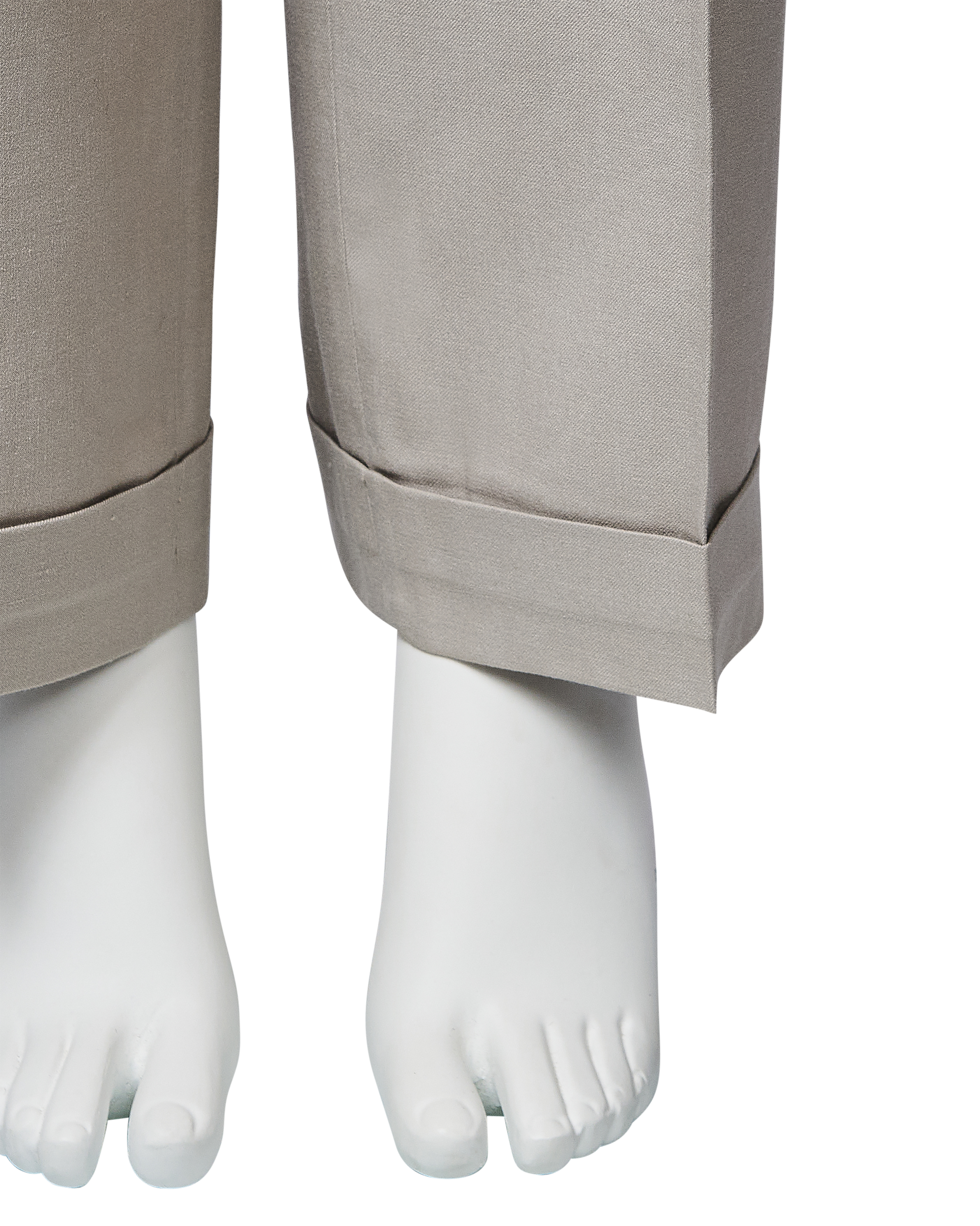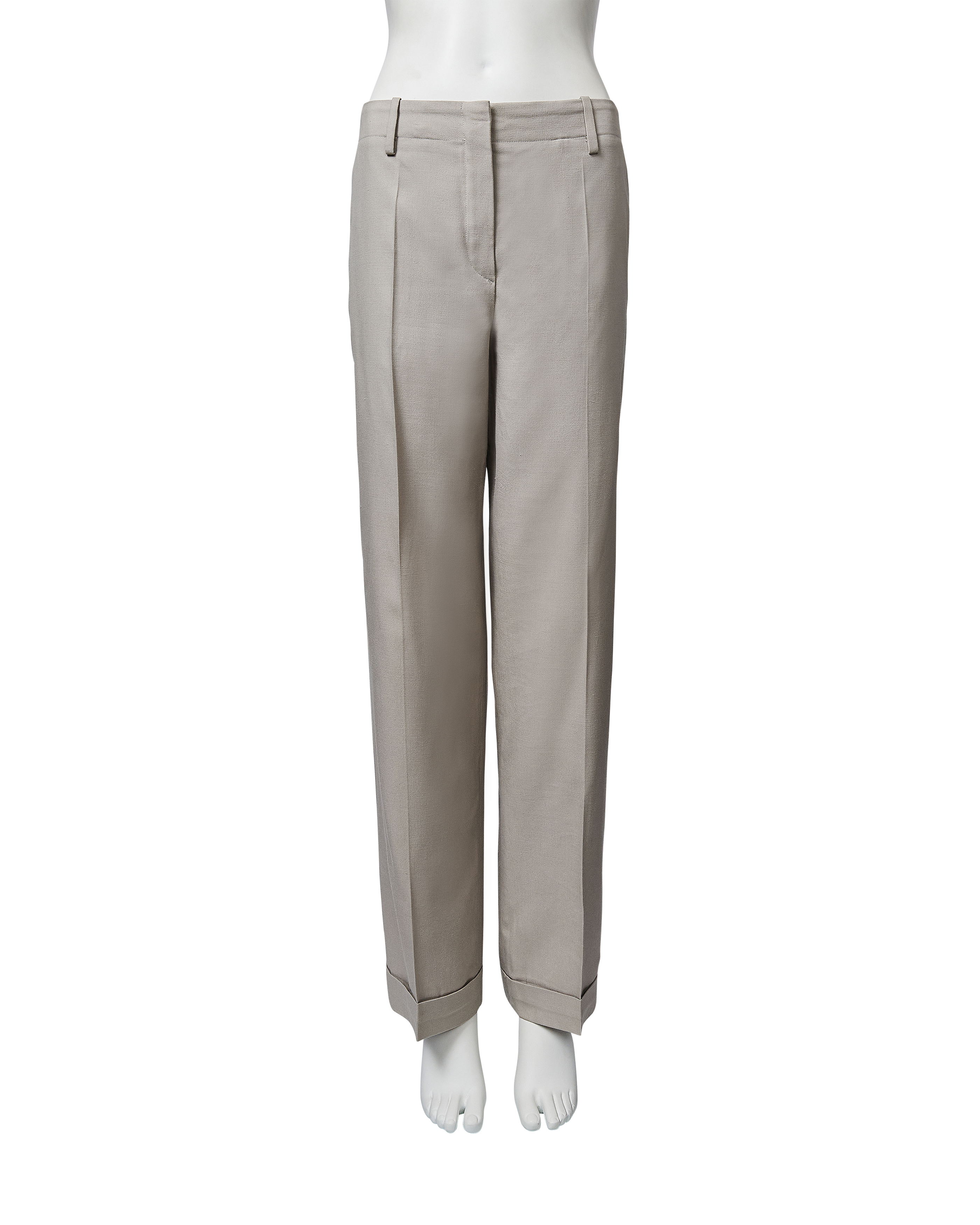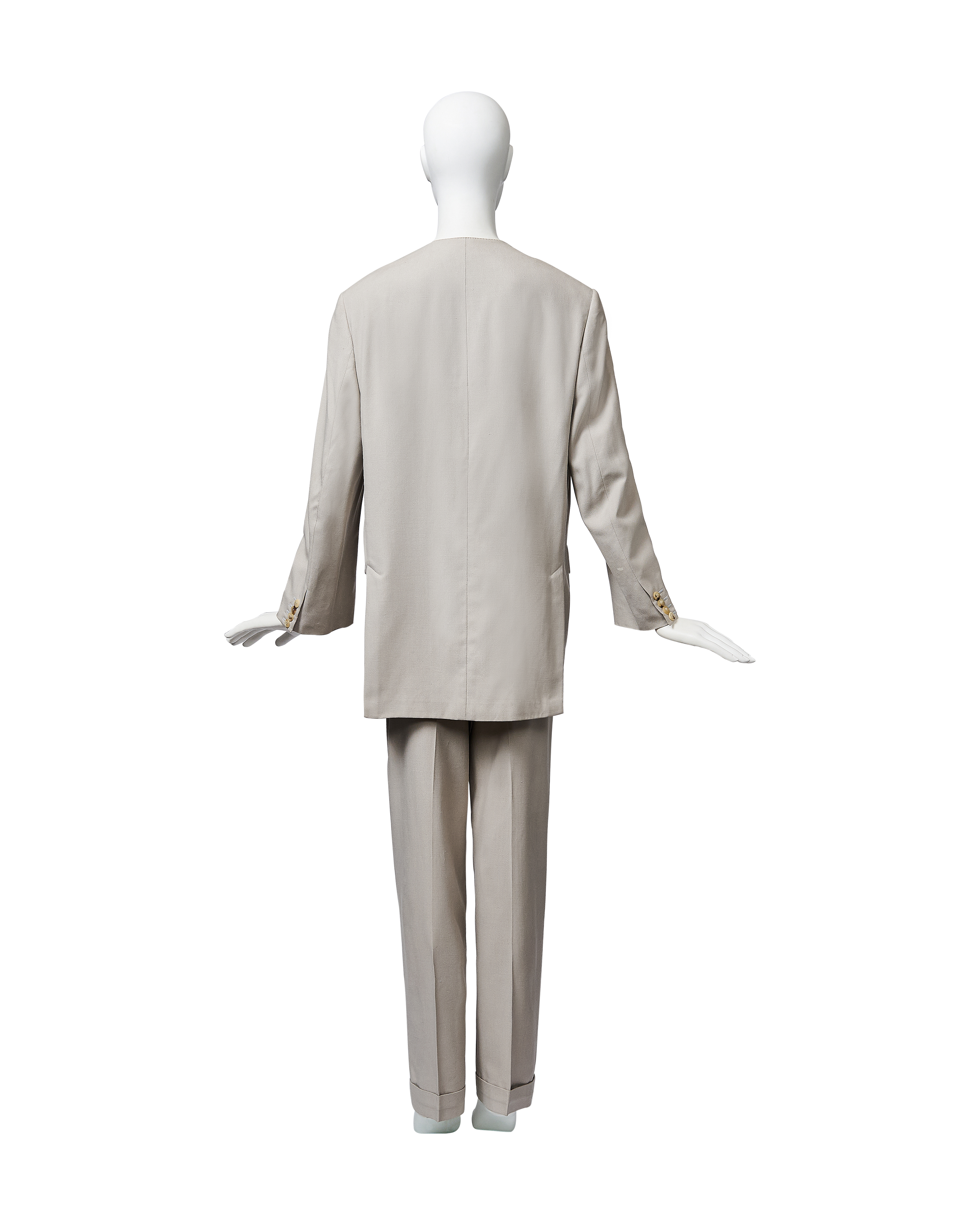 c. 2001 Hermès by Martin Margiela warm gray pant suit set. Long sleeve collarless v-neck oversized jacket with functional flap pockets pairs with mid-rise trouser. Four light tortoiseshell button closures at wrist. Trousers feature front belt loops, functional side slit pockets, and concealed front zip closure; cuffed hemline and center press add chic detailing when worn. Fabric Contents: 100% Silk. Very similar to opening look as seen on the S/S 2001 runway. In excellent vintage condition with pin-sized spot at left side sleeve (unnoticeable when worn).
