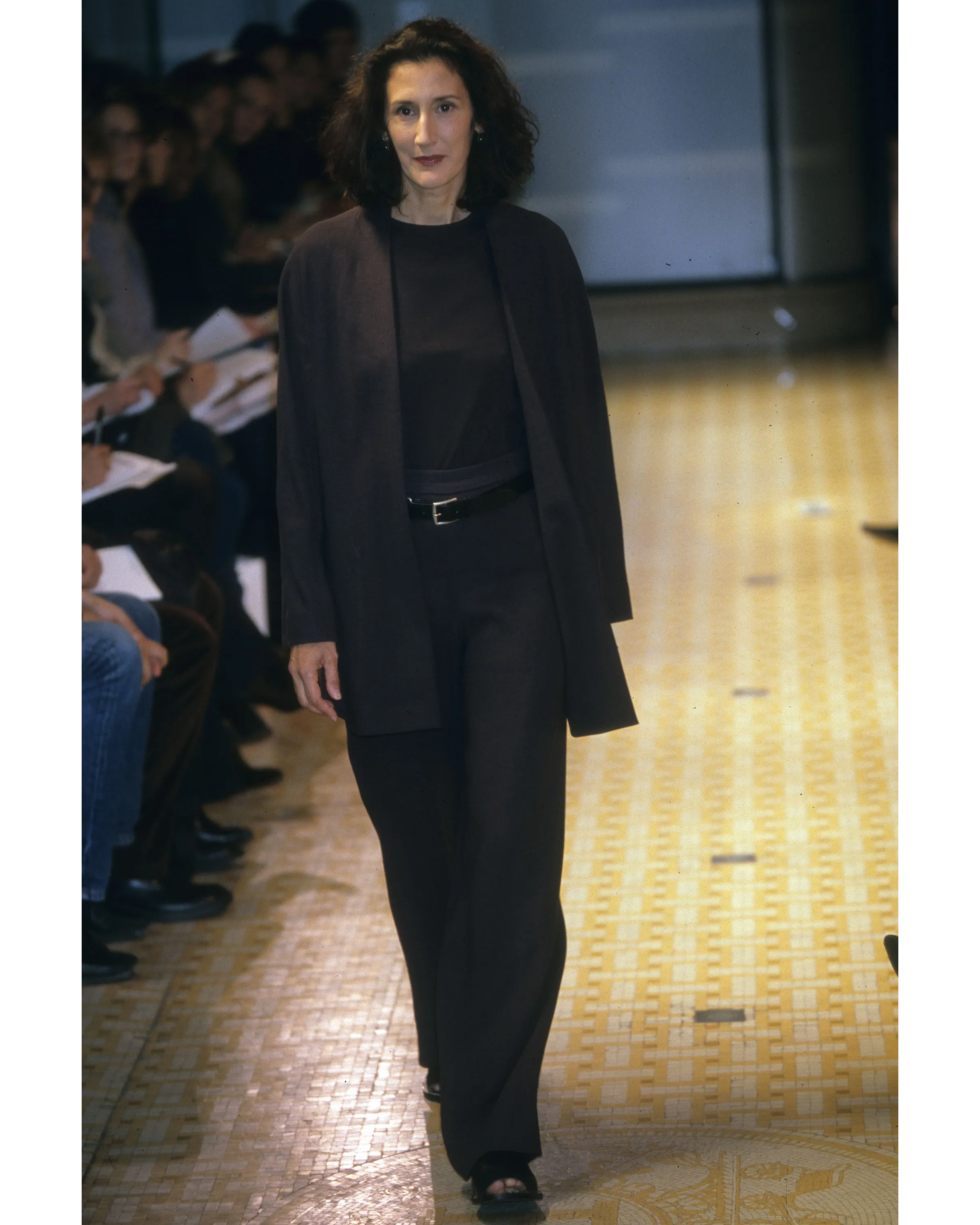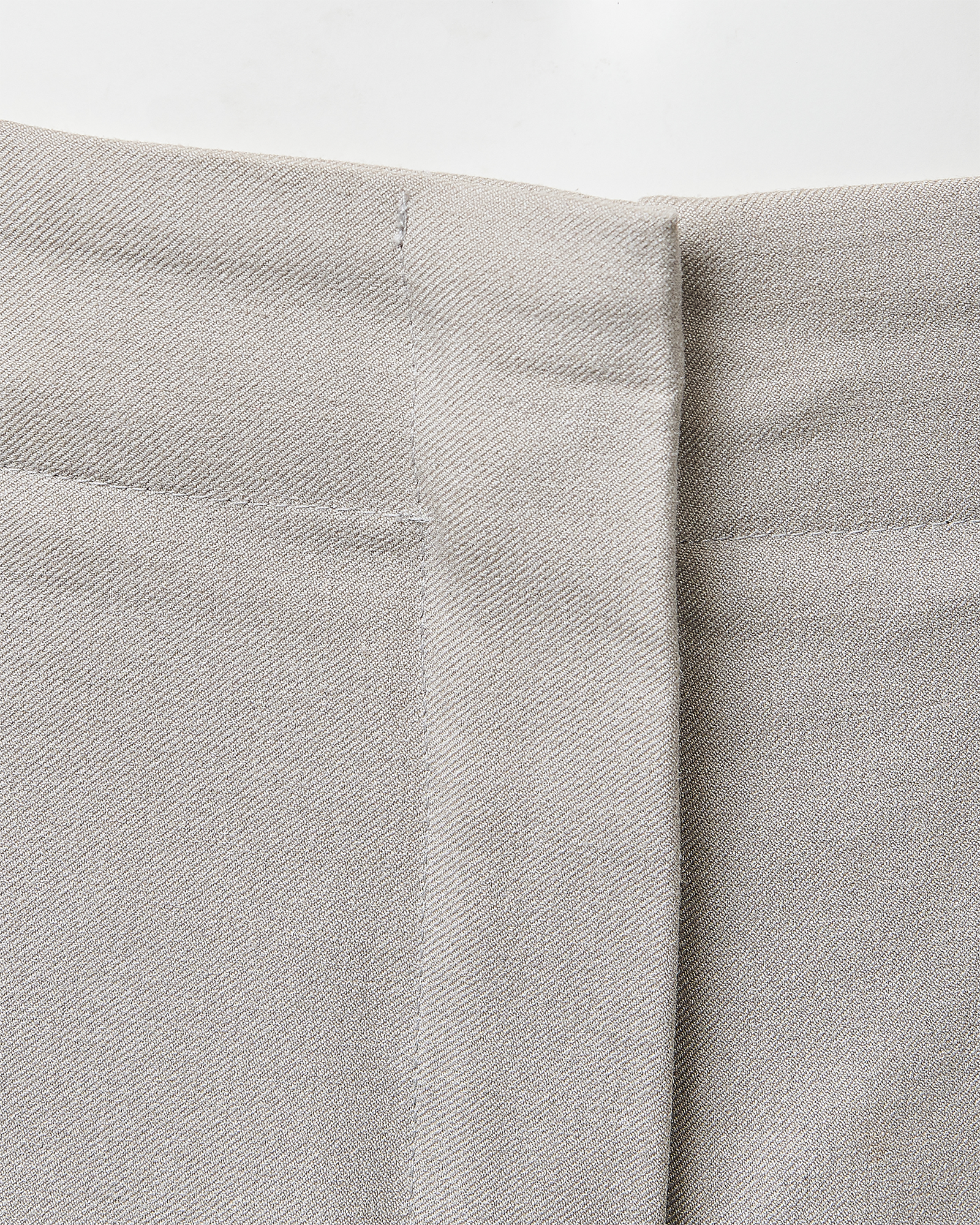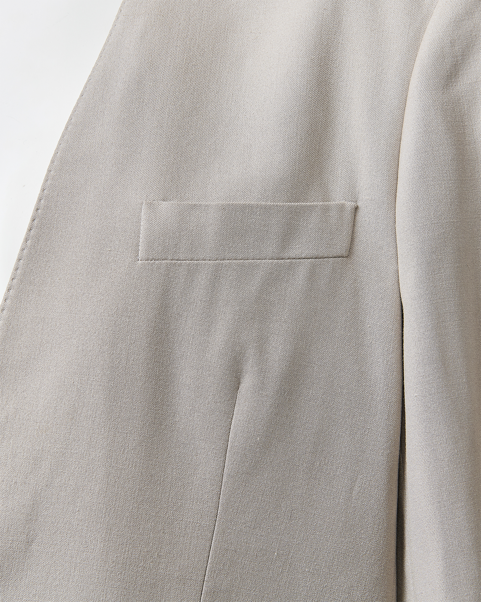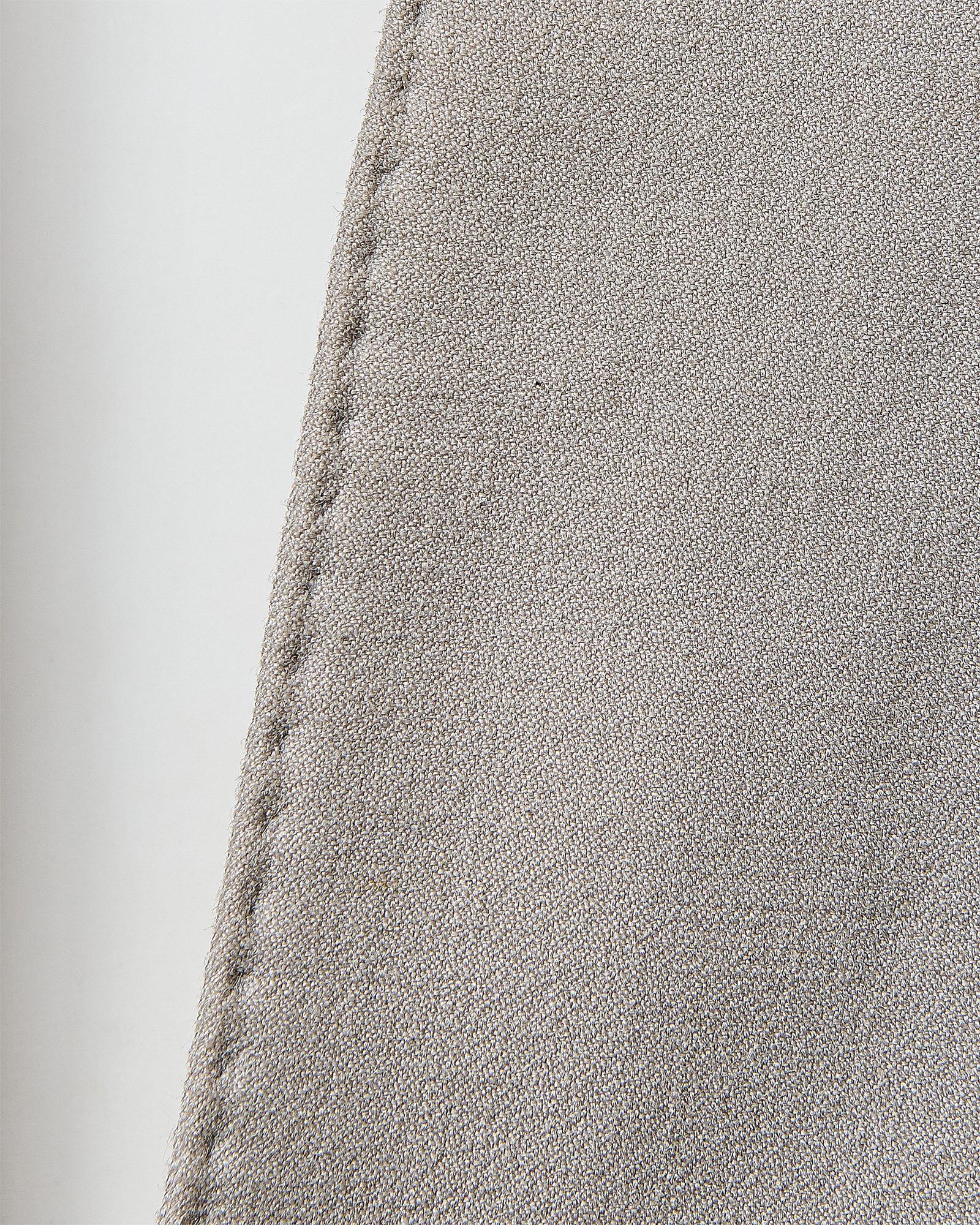 c. 2001 Hermès by Martin Margiela warm gray pant suit set. Long sleeve collarless v-neck oversized jacket with functional flap pockets pairs with mid-rise trouser. Four light tortoiseshell button closures at wrist. Trousers feature front belt loops, functional side slit pockets, and concealed front zip closure; cuffed hemline and center press add chic detailing when worn. Fabric Contents: 100% Silk. Very similar to opening look as seen on the S/S 2001 runway. In excellent vintage condition with pin-sized spot at left side sleeve (unnoticeable when worn).